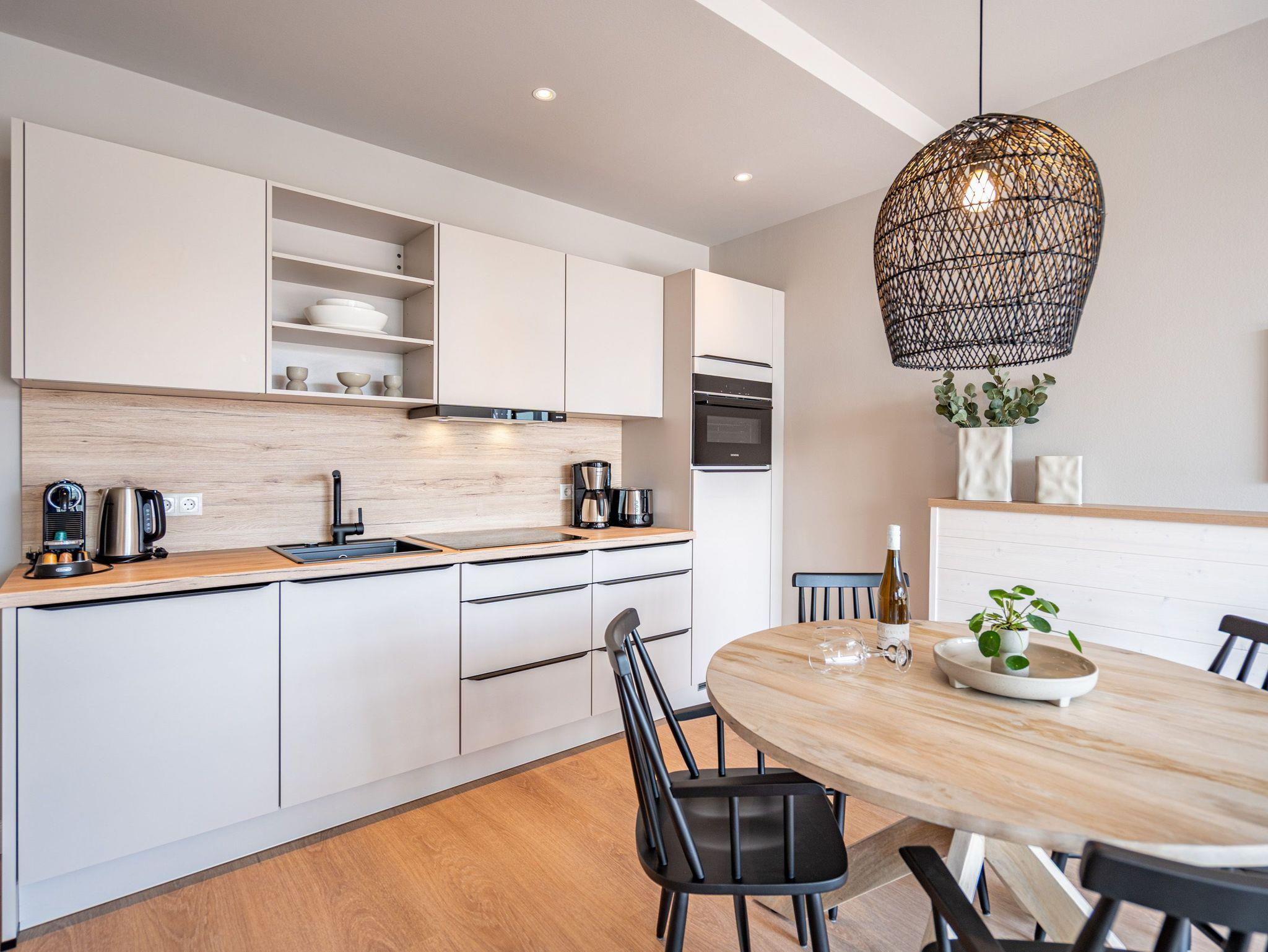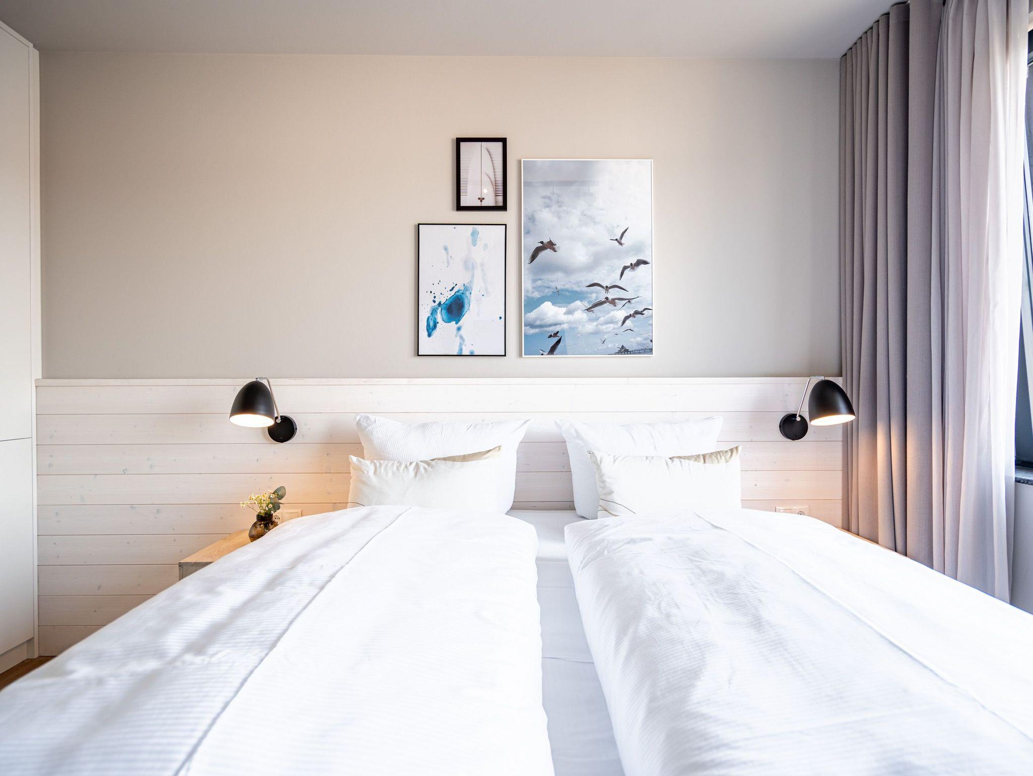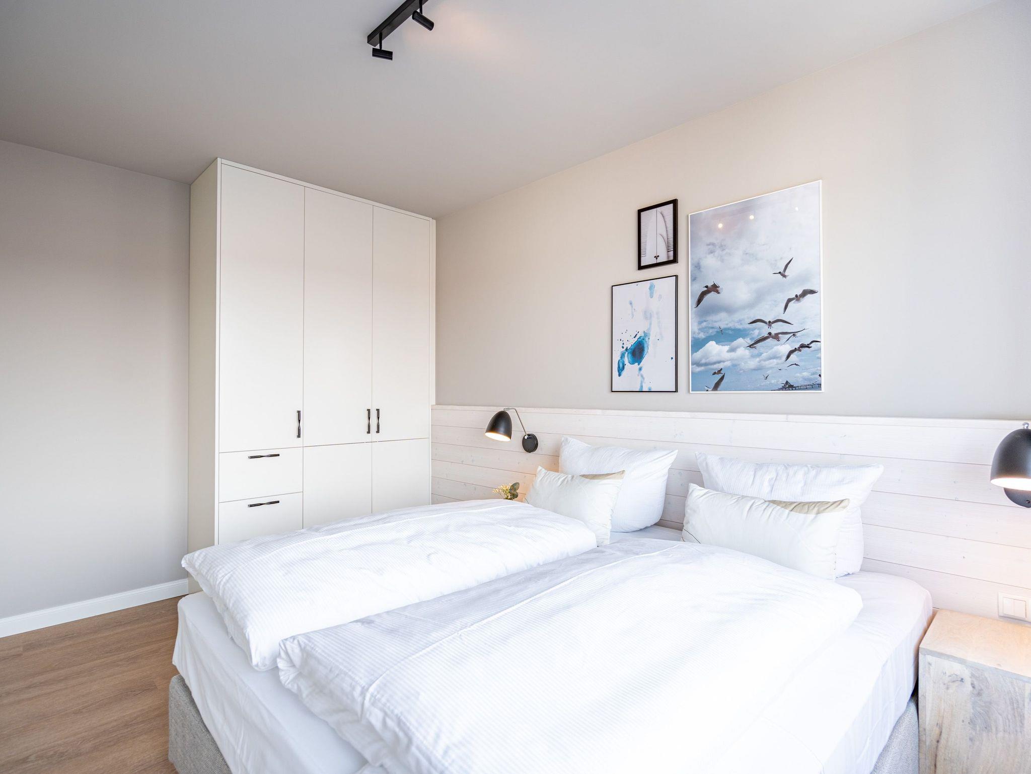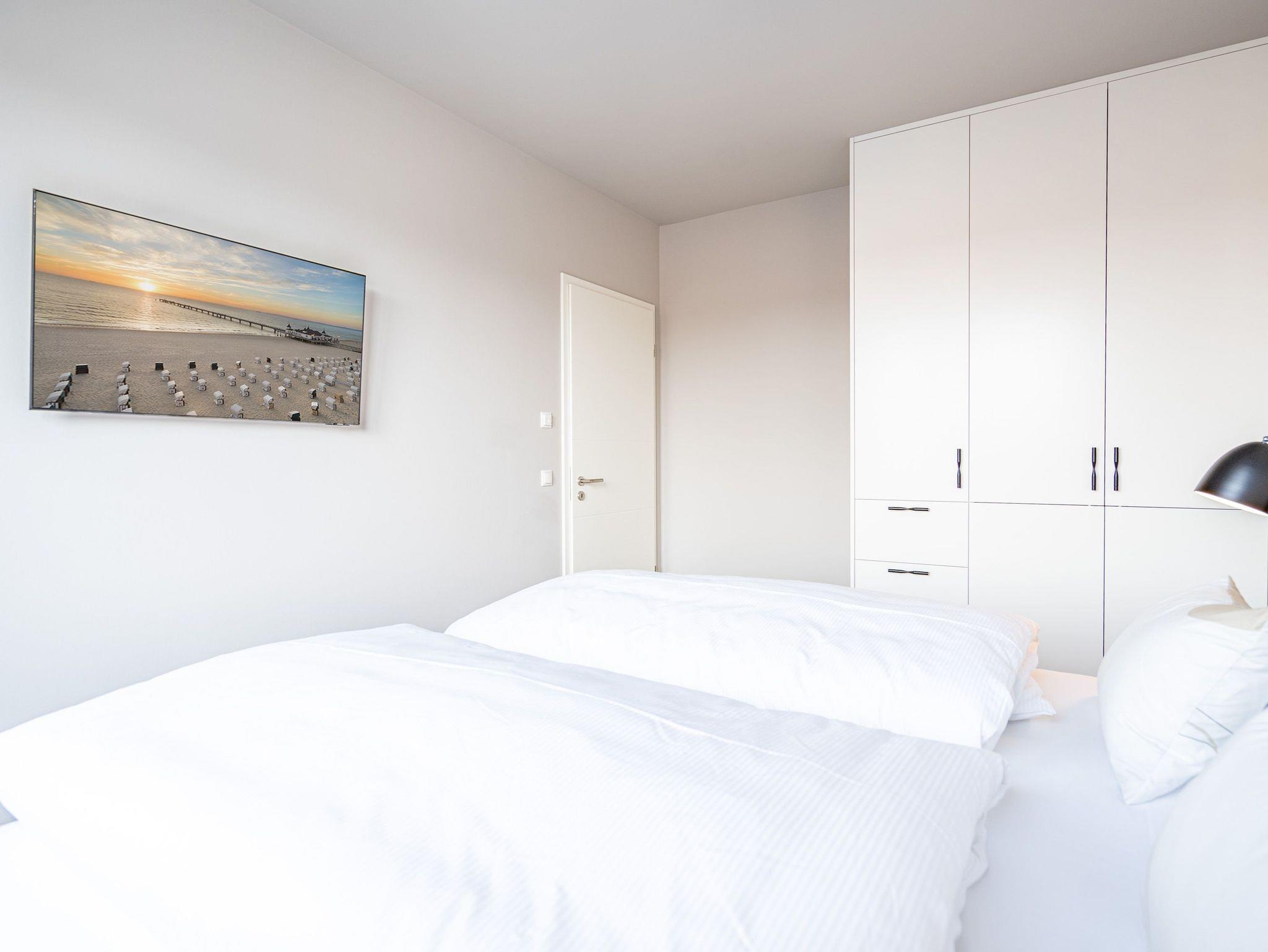 Ein herrlicher Blick auf die Ostsee und die Ahlbecker Seebrücke erwartet Sie in der stilvollen 3-Raum-Wohnung B 3.4 (Haus B) in der 3. Etage der Strandterrasse direkt an der Ahlbecker Promenade. 88 großzügige und mit viel Liebe eingerichtete Quadratmeter sind ein ideales Urlaubsparadies für 4 Personen und ein Kleinkind im Kinderreisebett. Runterkommen, abschalten und rundum wohlfühlen ? das schicke Designkonzept dieses Appartements macht es leicht, den Stress und die Arbeit zu vergessen. Ja, manchmal sogar die Zeit. Wenn beispielsweise man am schönen Esstisch ins Plaudern kommt oder auf dem Sofa oder dem Sessel entspannt. Ein Elektrokamin (ohne Wärmeabgabe) sorgt für eine heimelige Atmosphäre, während der große Flat-TV (50) das Kinogefühl weckt. Das Zubereiten der Mahlzeiten wird in der offenen Küche ein Kinderspiel, denn sie ist mit allen nötigen Elektrogeräten aufs Beste ausgestattet. Zum Inventar zählen ein Backofen, ein 4-Platten-Induktionsherd, ein Geschirrspüler, Toaster, Kaffeemaschine und eine Nespresso-Kapselmaschine. Treten Sie hinaus auf den Ost-Balkon und genießen Sie die frische Ostseebrise. Kommen Sie ins Träumen beim Blick auf das endlose Blau bis zum Horizont. Hier werden die Momente zu unvergesslichen Erlebnissen. Die Wohnung besitzt zwei Schlafzimmer. Eines davon hat ebenfalls einen Zugang zum Balkon. Beide Zimmer sind gleichermaßen mit einem komfortablen Boxspringdoppelbett (1,80m x 2,00m), einem Kleiderschrank und einem Flat-TV (43 Zoll) ausgestattet. Auch zwei Bäder mit Dusche, Waschtisch und WC gibt es in der Wohnung. Für absolute Entspannung in kuschlig warmer Umgebung sorgt eine Infrarotsaunakabine in einem Badezimmer. Ihr Auto können Sie bequem in der Tiefgarage abstellen. Ihrem Aufenthalt in einem charmanten Urlaubszuhause mit Meerblick steht also nichts mehr im Weg.