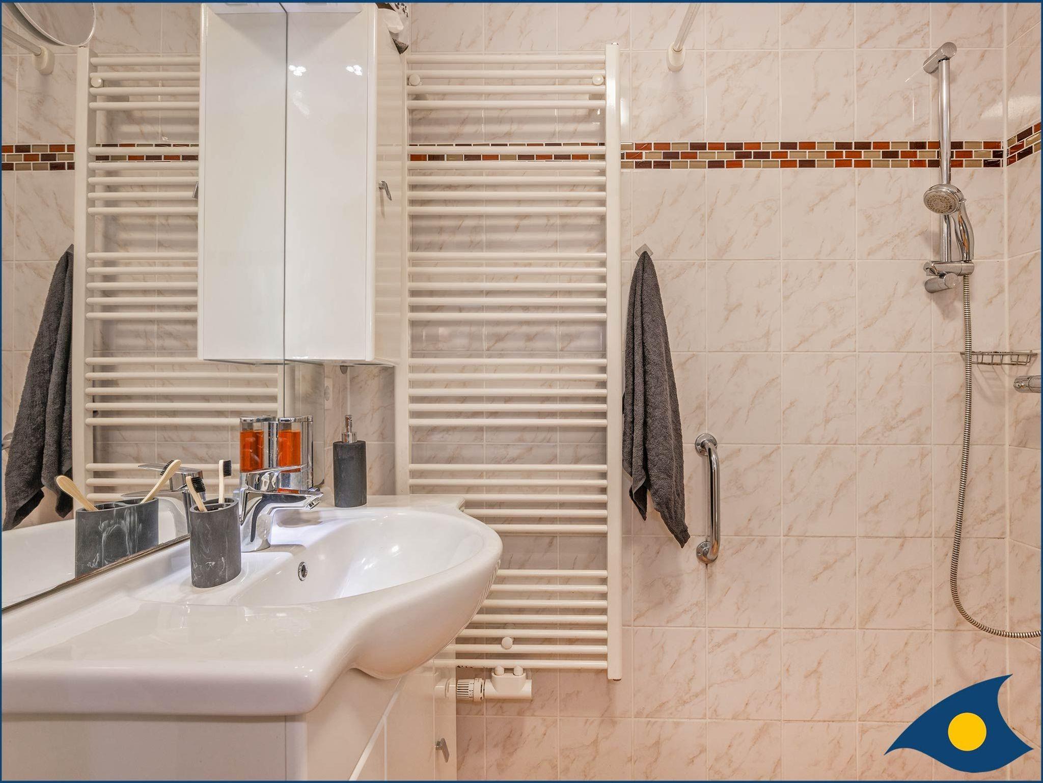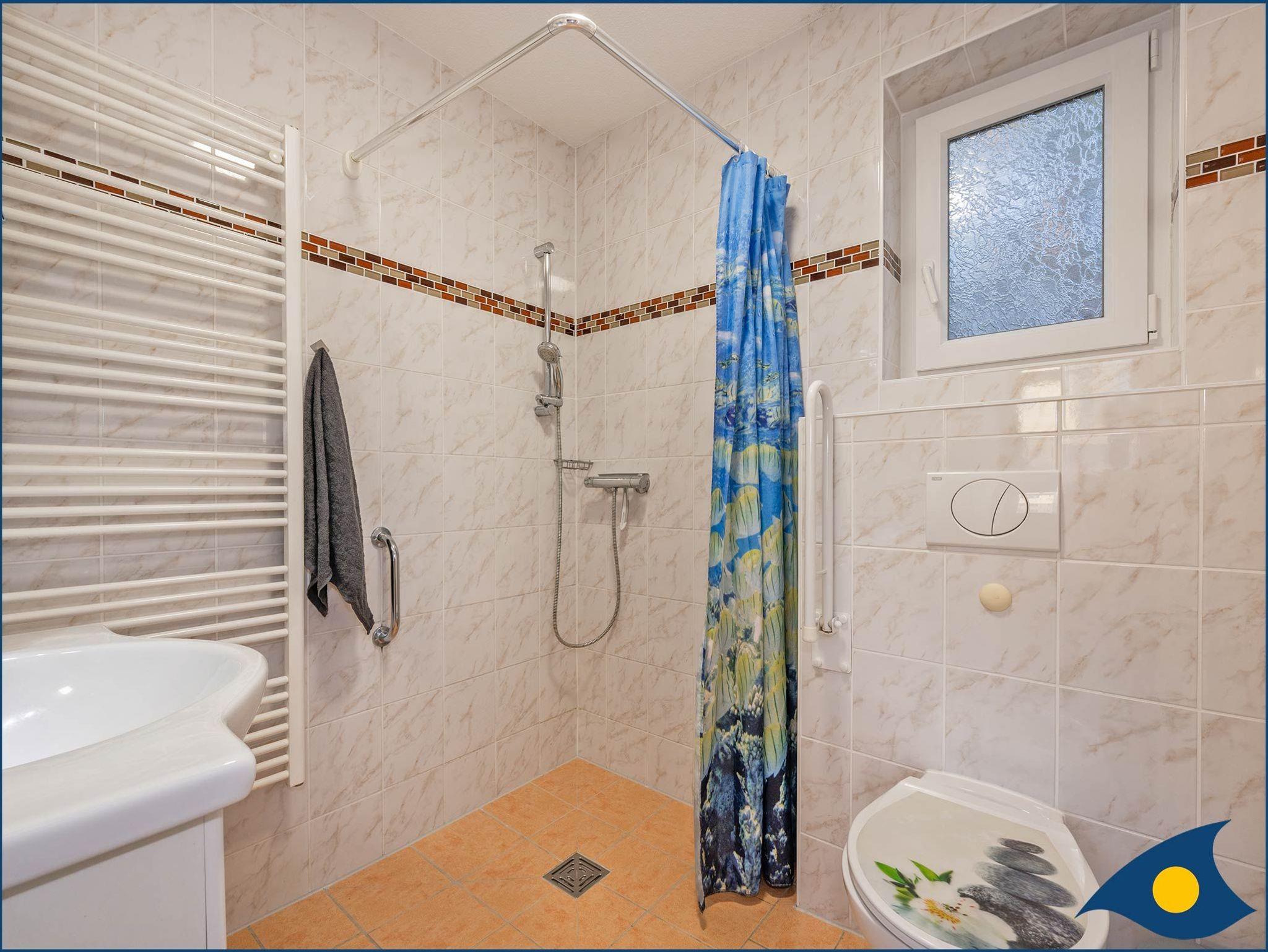 Das Badezimmer verfügt über eine ebenerdige Dusche und eignet sich somit auch für Rollstuhlfahrer.