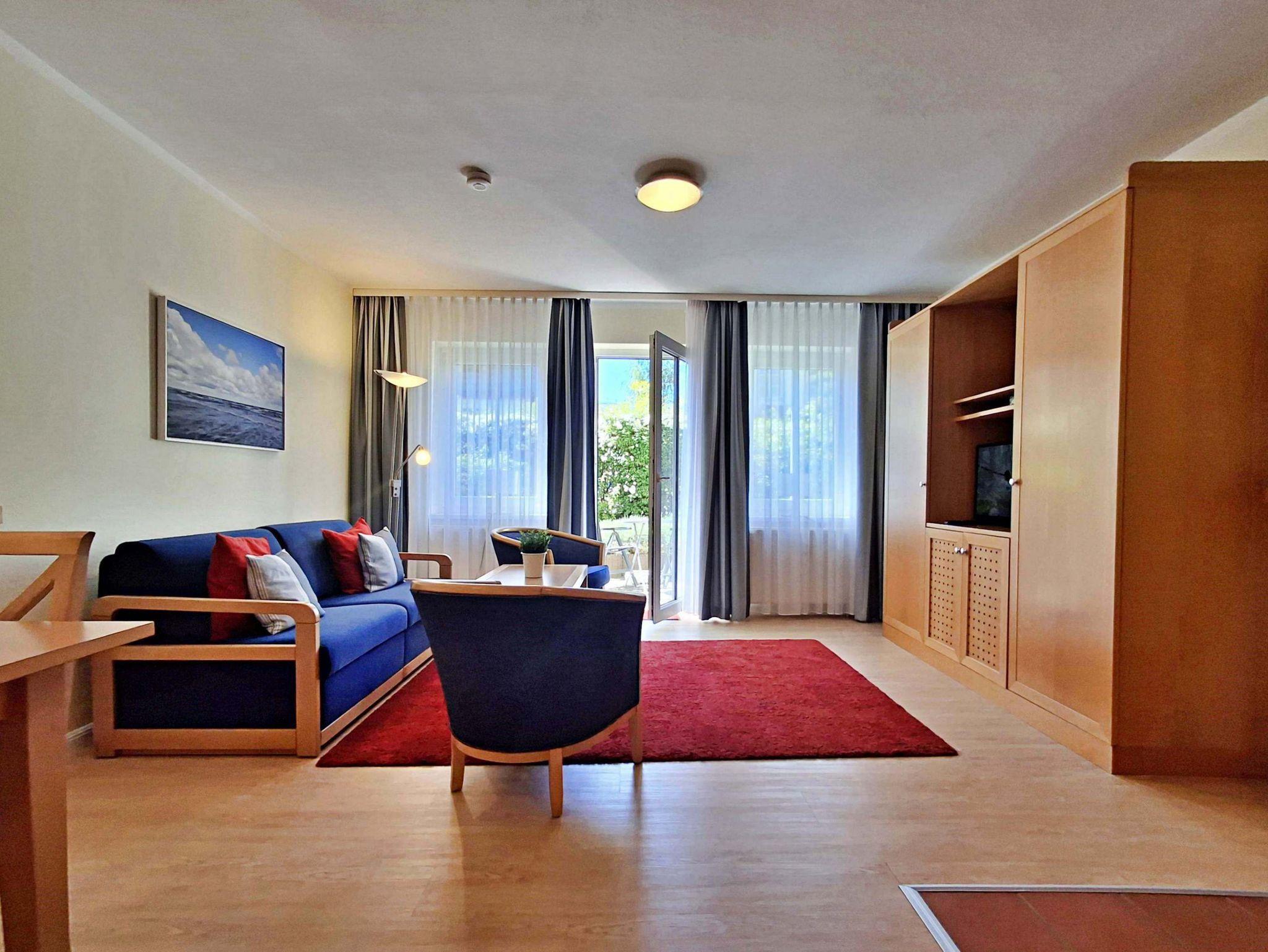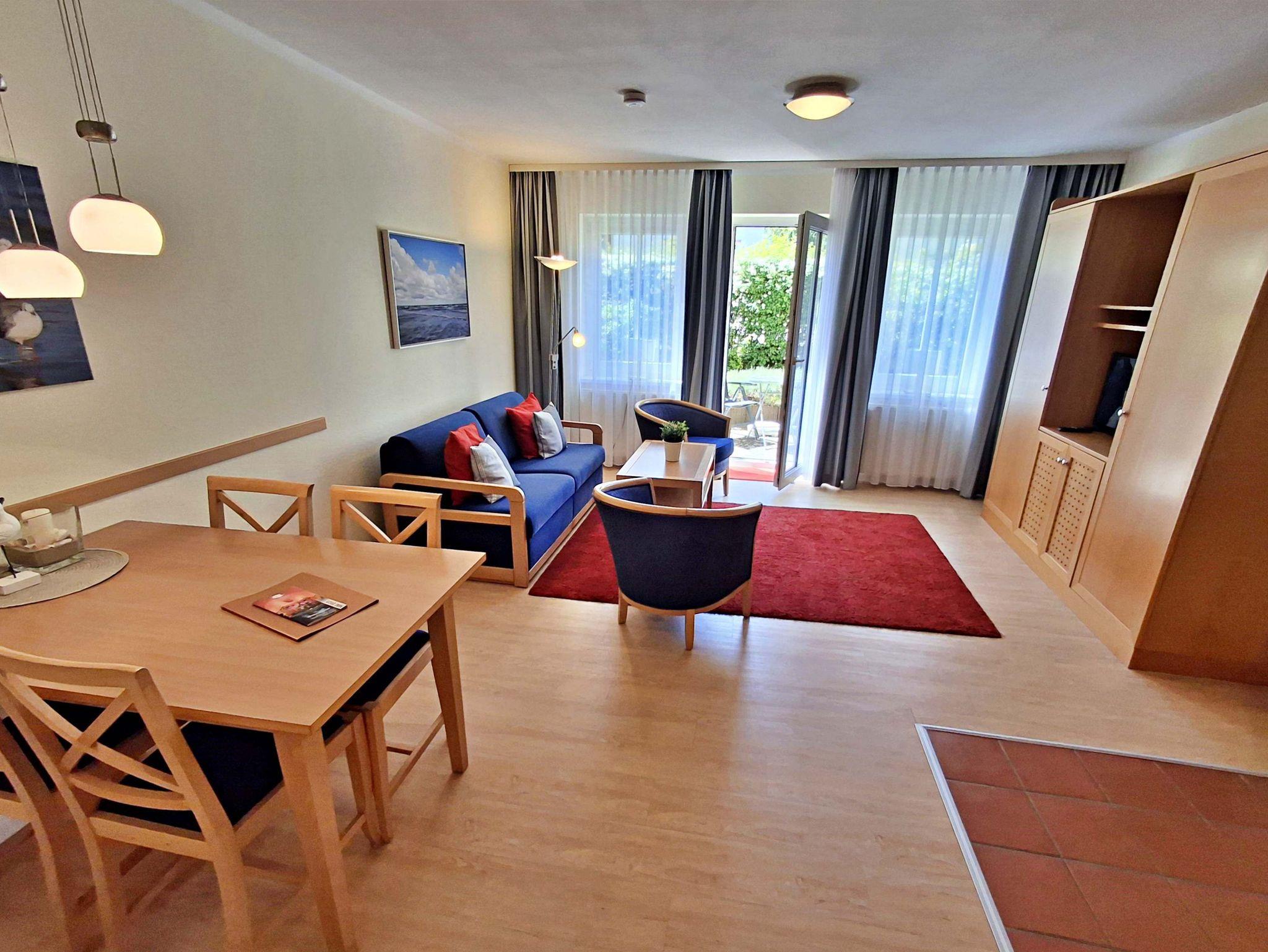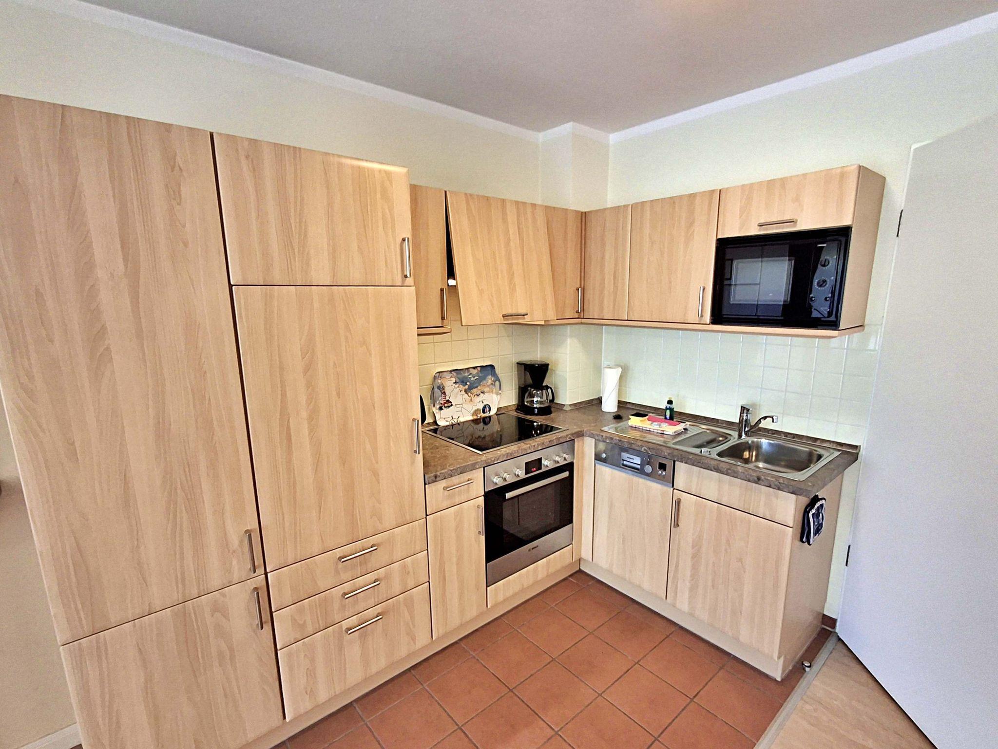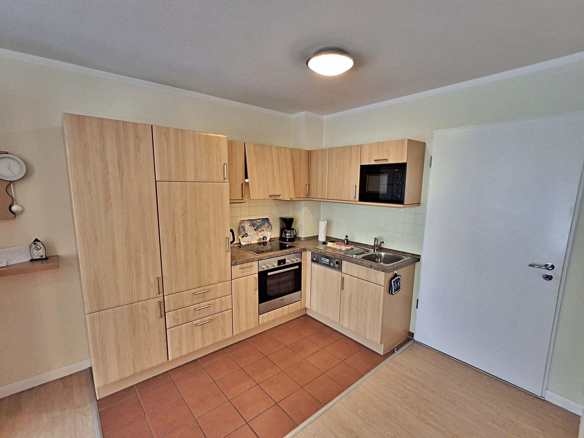 Die komfortable Wohnung für bis zu 4 Personen (68 qm) erstreckt sich über zwei Etagen (EG und 1.OG). Dies trennt in angenehmer Weise Wohn- und Schlafbereich. Die Wohnung hat sowohl im EG als auch im OG einen Zugang vom Treppenhaus. Im Erdgeschoss befinden sich das Wohnzimmer mit gemütlicher Couch, welche auch zum Schlafen geeignet ist, Sessel sowie ein Esstisch mit 4 Stühlen. Für die Unterhaltung sorgen ein internetfähiger Flachbild-TV und eine HiFi-Anlage. Die vollständige Küche mit Ceranherd, Backofen, Geschirrspülmaschine, Mikrowelle und Kühlschrank mit Gefrierfach lässt keine Wünsche offen. Vom Wohnzimmer besteht Zugang zur möblierten Terrasse. Das Bad ist mit begehbarer Dusche (niedriger Einstieg), WC, Haarfön und Kosmetikspiegel ausgestattet. Über eine Wendeltreppe gelangen Sie in das OG, wo sich auch das Schlafzimmer mit Doppelbett, eine Wohn- und Schlafcouch, ein zusätzlicher Flachbild-TV sowie ein Gäste-WC befindet. Sämtliche Räume sind mit einem modernen Design-Bodenbelag oder mit Fliesen ausgestattet. W-LAN steht kostenfrei zur Verfügung. Ein Kinderbett mit Wäsche sowie ein Hochstuhl können auf Anfrage gegen eine Gebühr von einmalig 50 € vom Verwalter zur Verfügung gestellt werden.