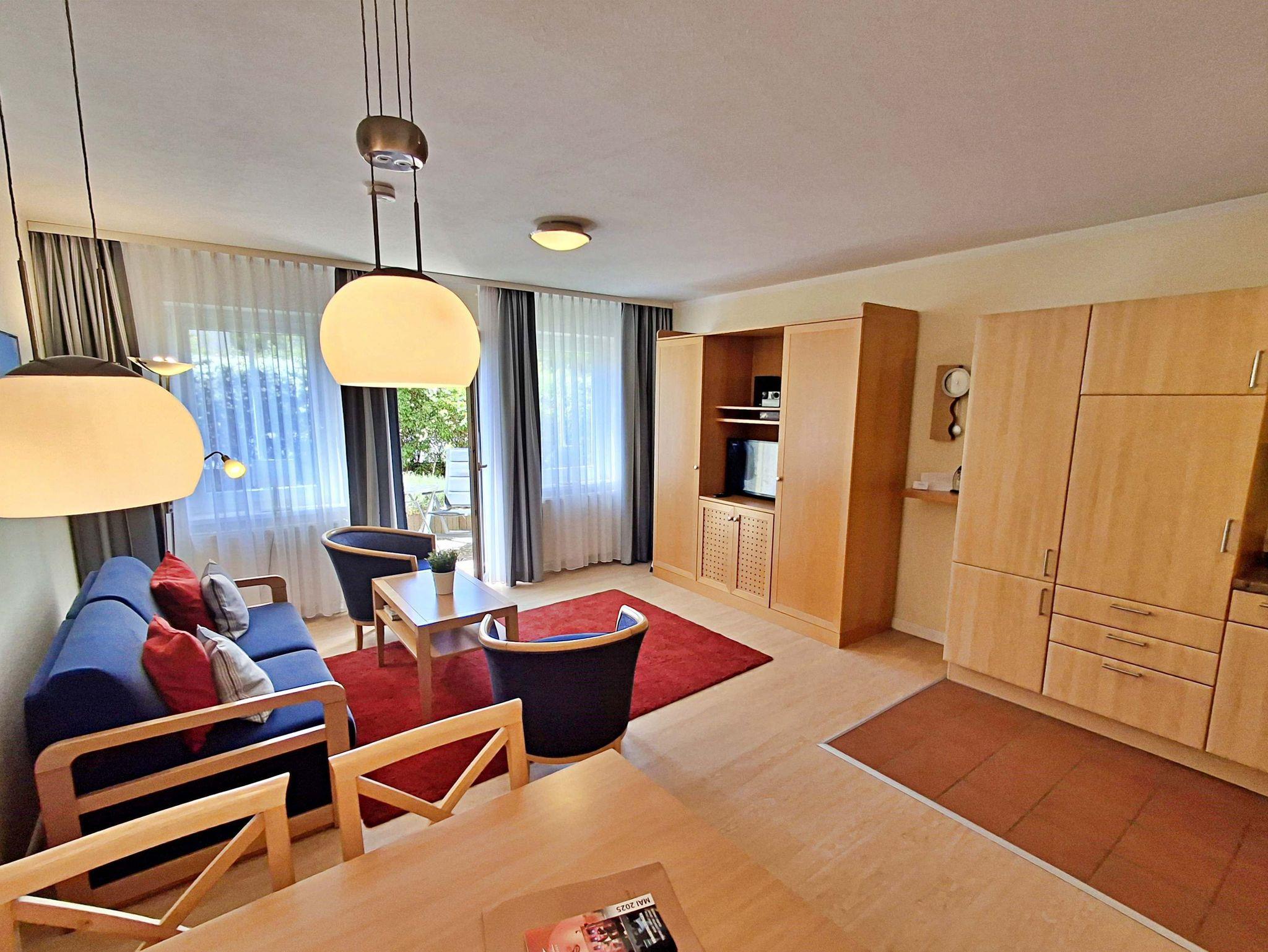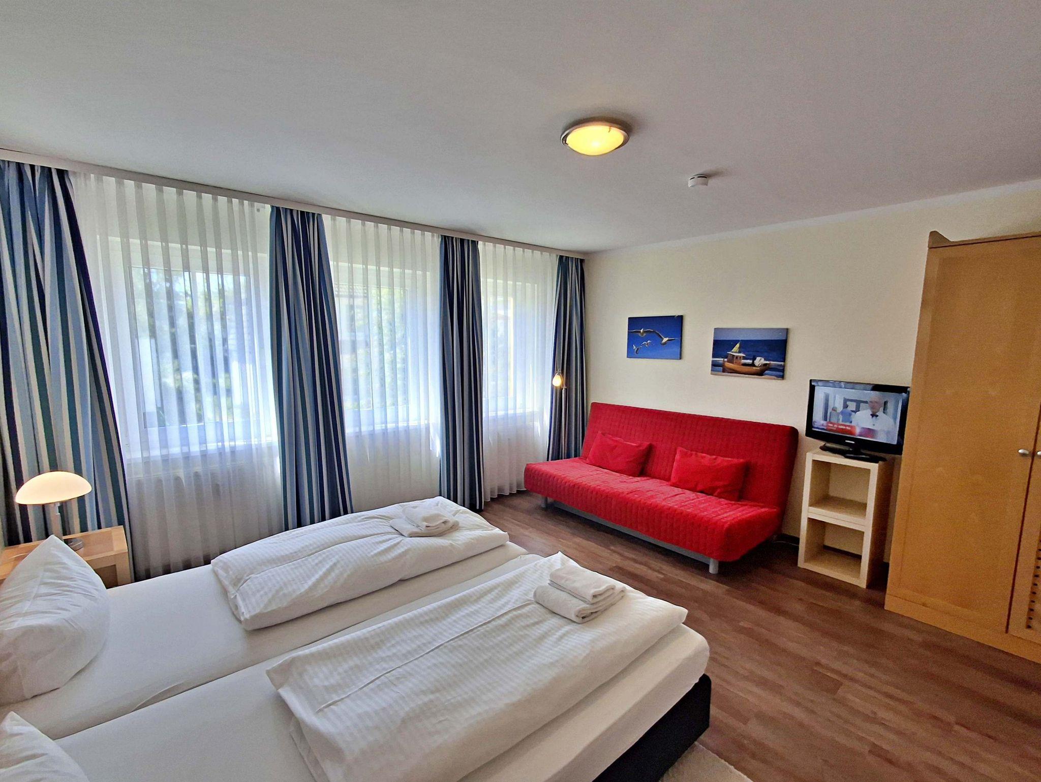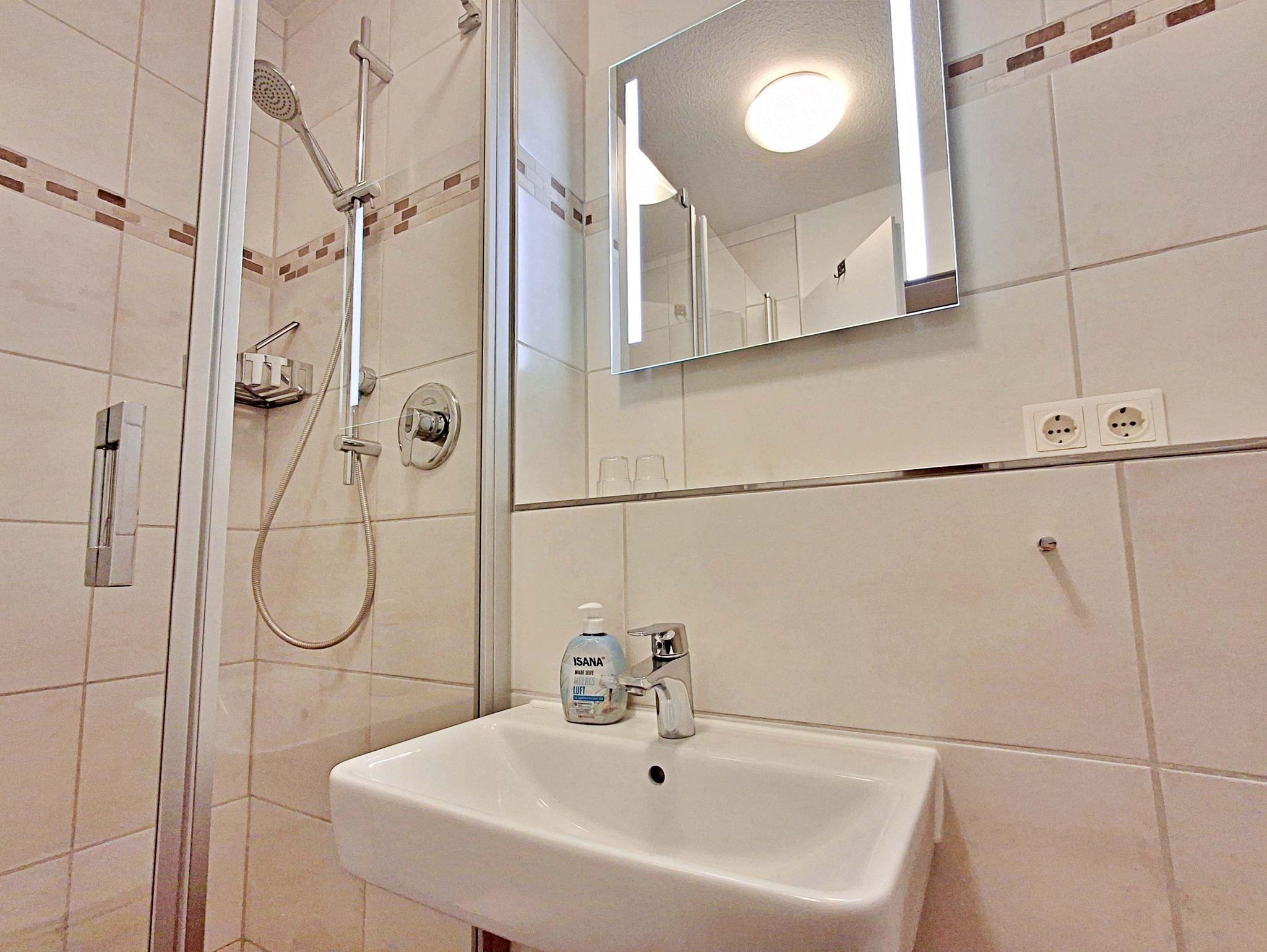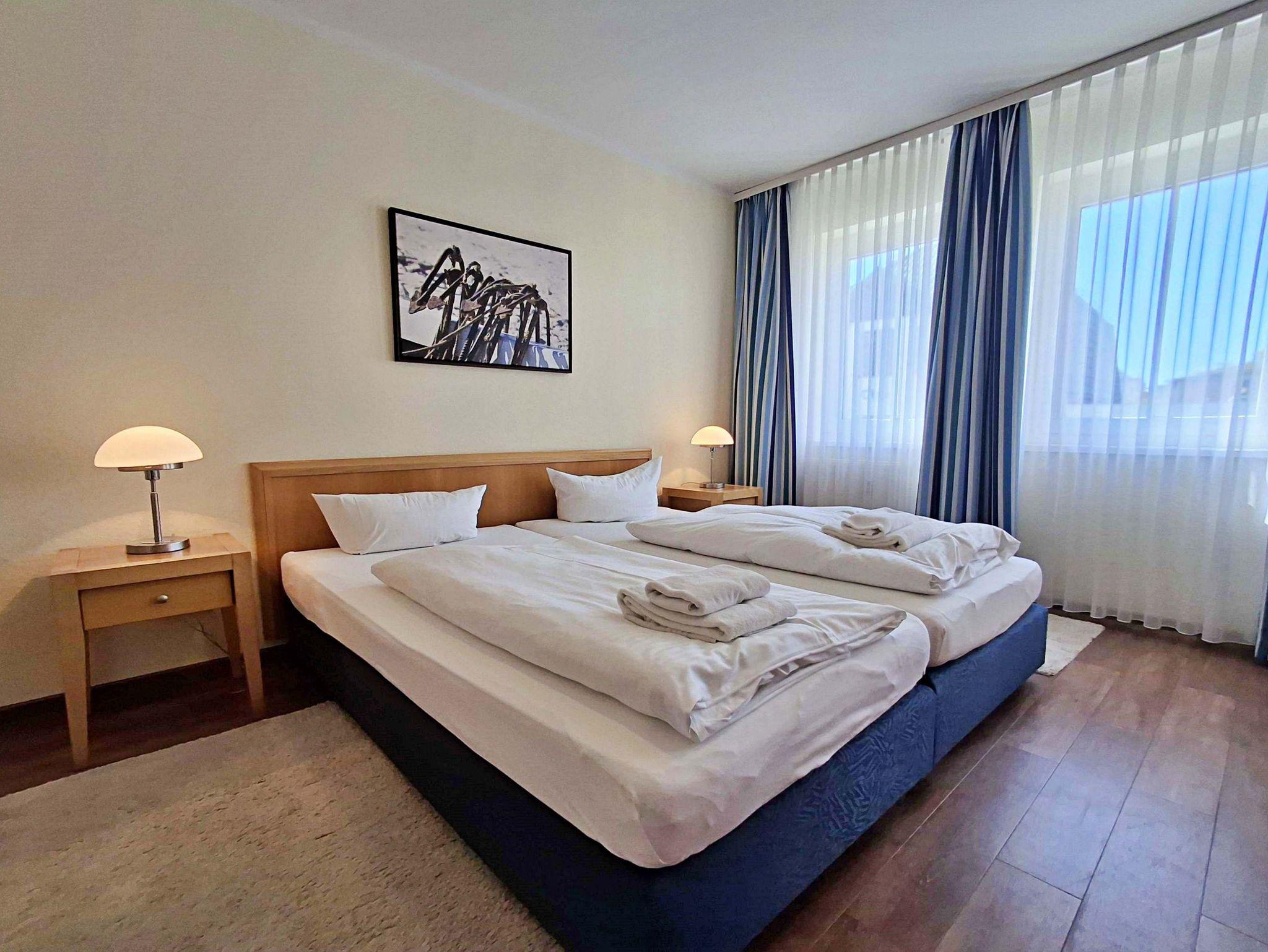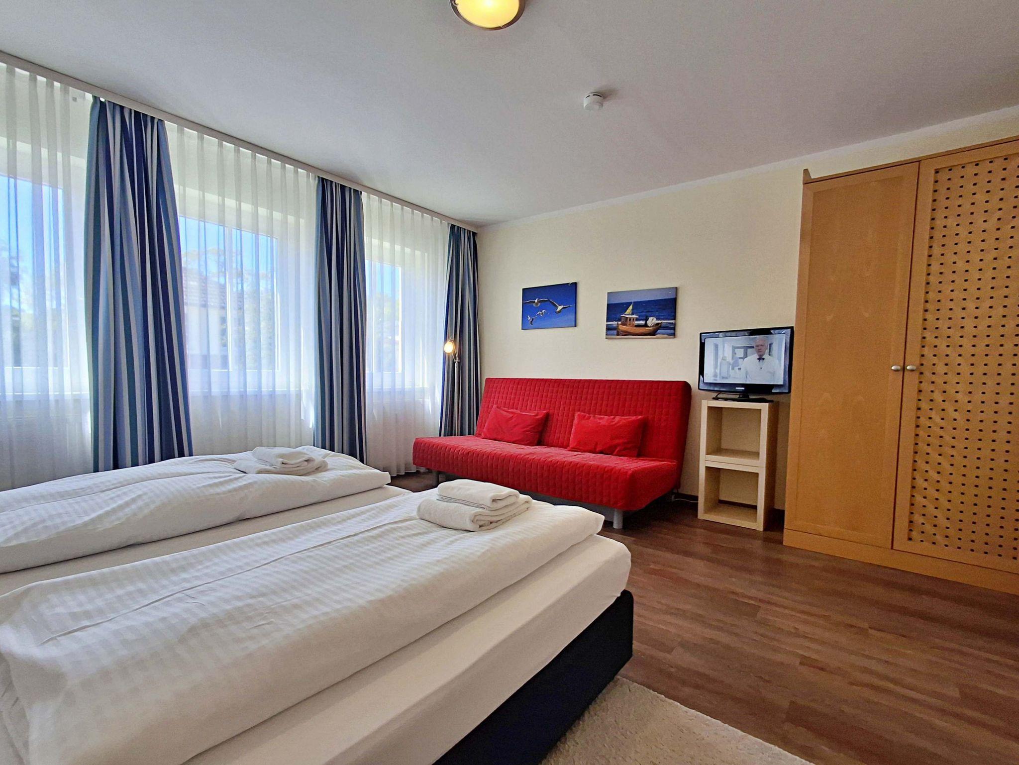 Die komfortable Wohnung für bis zu 4 Personen (68 qm) erstreckt sich über zwei Etagen (EG und 1.OG). Dies trennt in angenehmer Weise Wohn- und Schlafbereich. Die Wohnung hat sowohl im EG als auch im OG einen Zugang vom Treppenhaus. Im Erdgeschoss befinden sich das Wohnzimmer mit gemütlicher Couch, welche auch zum Schlafen geeignet ist, Sessel sowie ein Esstisch mit 4 Stühlen. Für die Unterhaltung sorgen ein internetfähiger Flachbild-TV und eine HiFi-Anlage. Die vollständige Küche mit Ceranherd, Backofen, Geschirrspülmaschine, Mikrowelle und Kühlschrank mit Gefrierfach lässt keine Wünsche offen. Vom Wohnzimmer besteht Zugang zur möblierten Terrasse. Das Bad ist mit begehbarer Dusche (niedriger Einstieg), WC, Haarfön und Kosmetikspiegel ausgestattet. Über eine Wendeltreppe gelangen Sie in das OG, wo sich auch das Schlafzimmer mit Doppelbett, eine Wohn- und Schlafcouch, ein zusätzlicher Flachbild-TV sowie ein Gäste-WC befindet. Sämtliche Räume sind mit einem modernen Design-Bodenbelag oder mit Fliesen ausgestattet. W-LAN steht kostenfrei zur Verfügung. Ein Kinderbett mit Wäsche sowie ein Hochstuhl können auf Anfrage gegen eine Gebühr von einmalig 50 € vom Verwalter zur Verfügung gestellt werden.