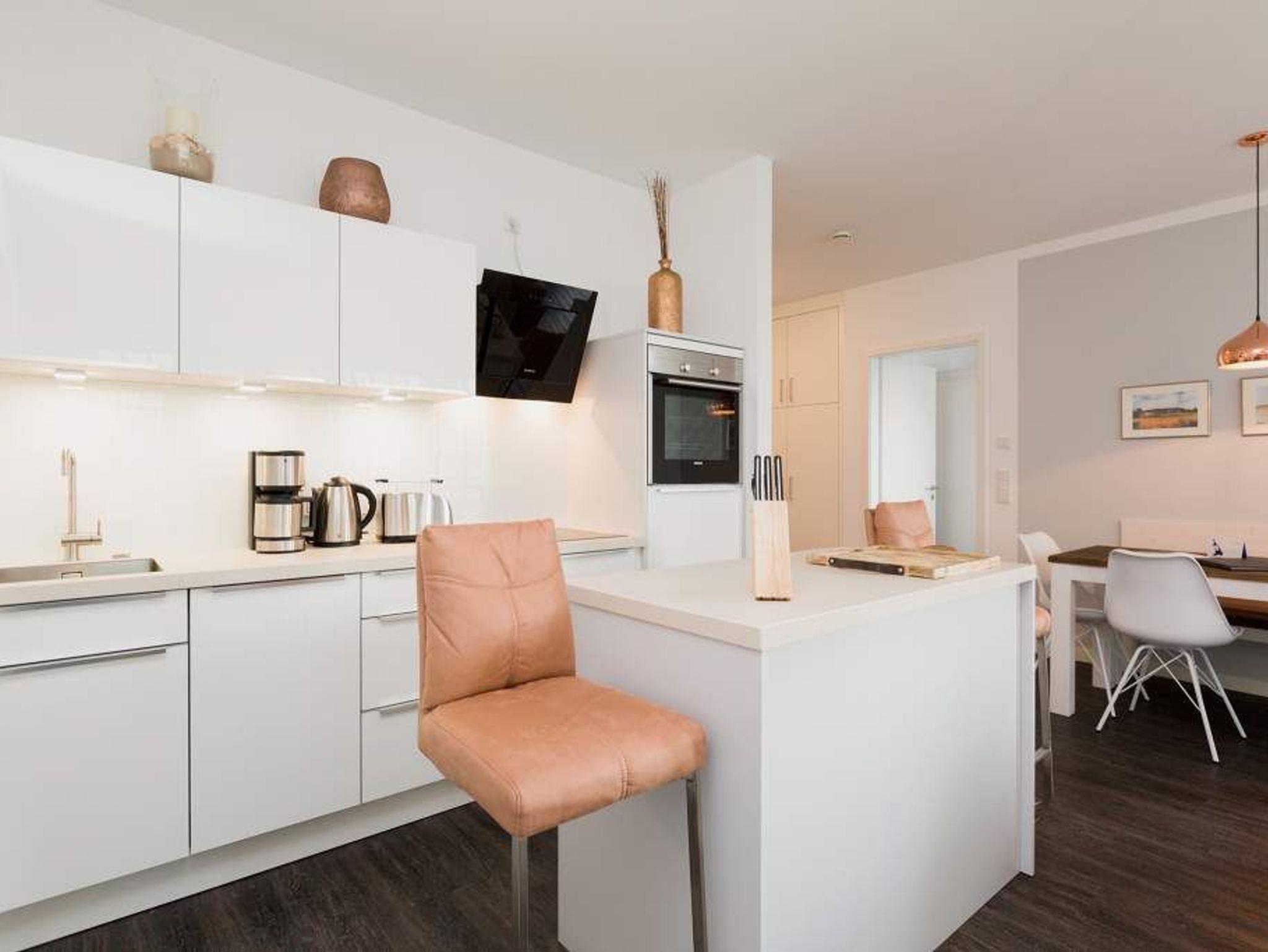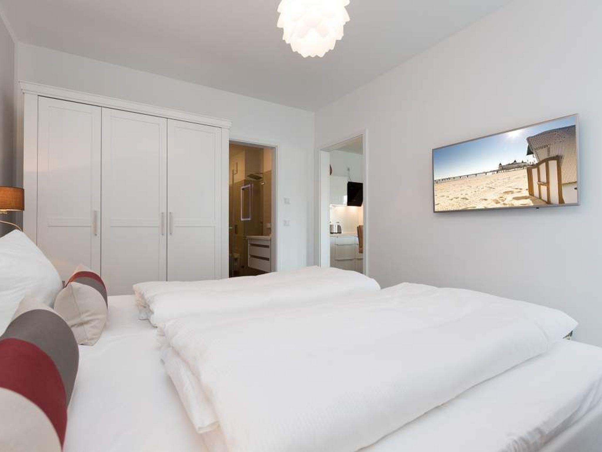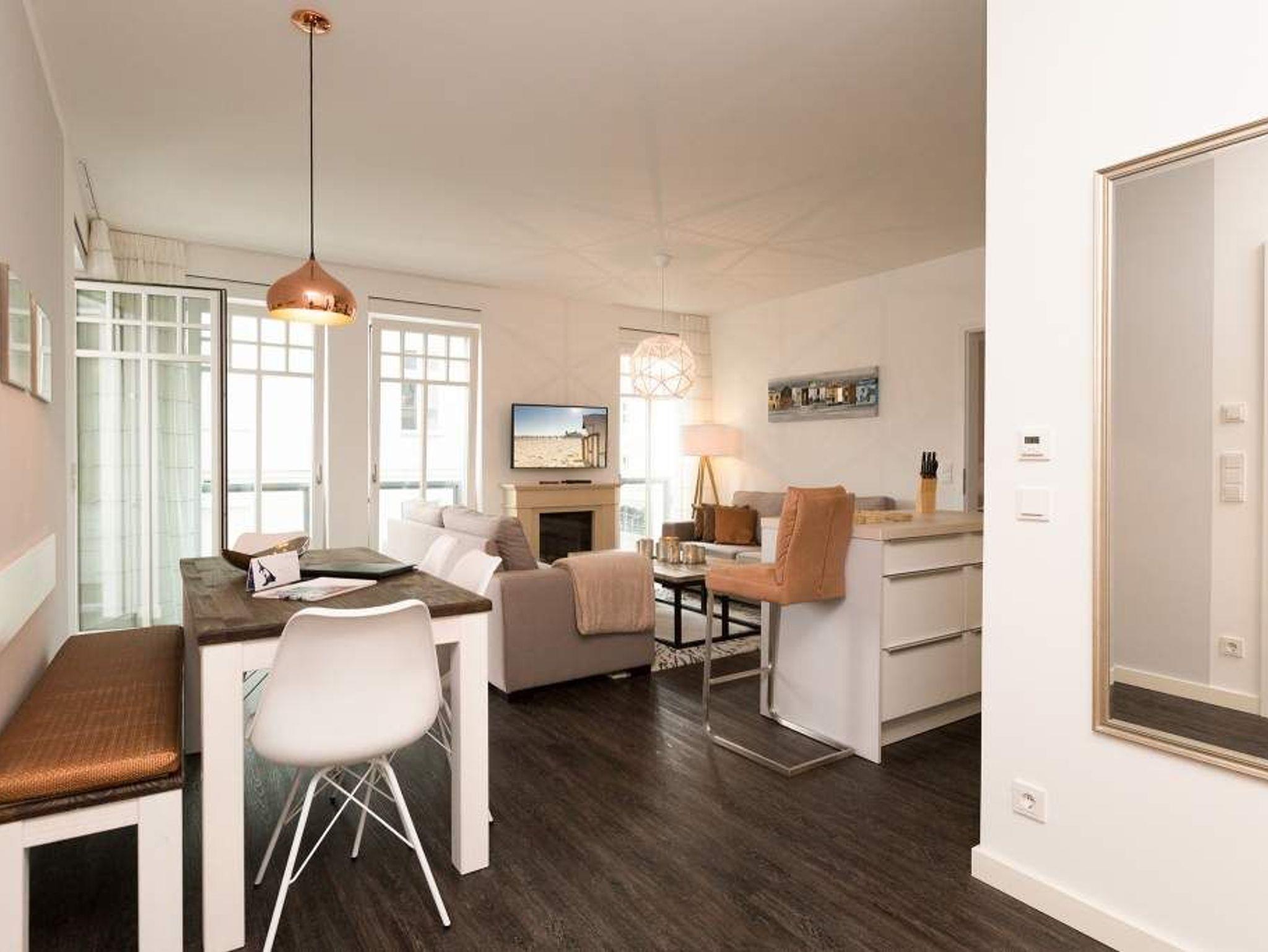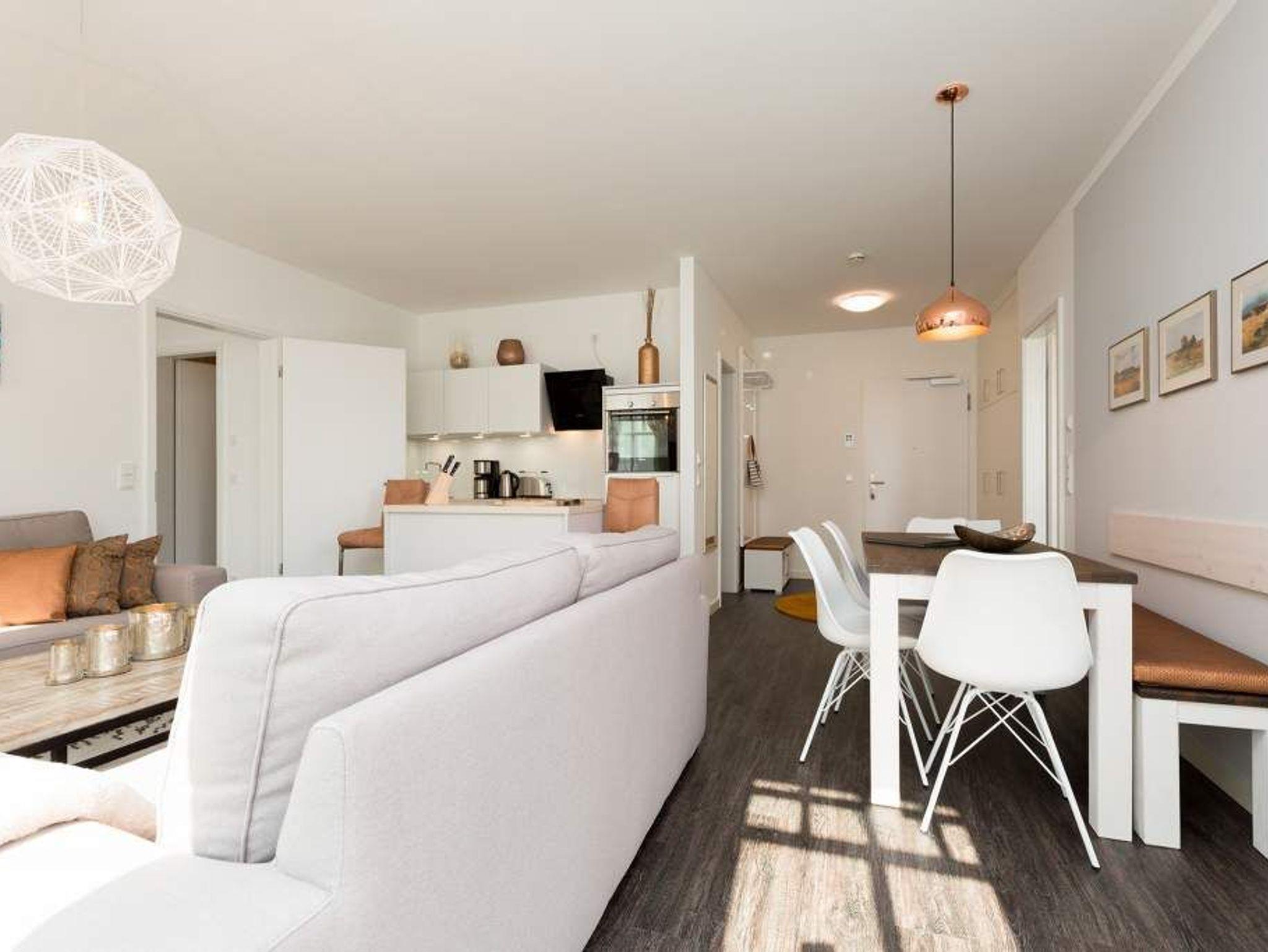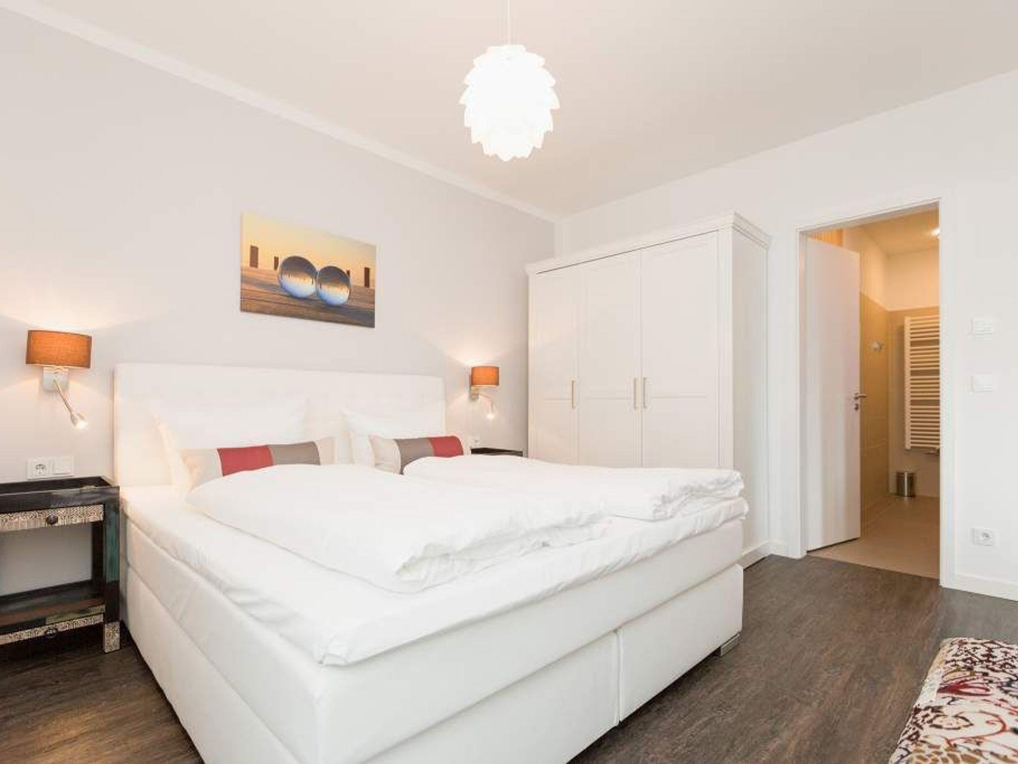 Schon beim Frühstück auf dem schönen Balkon legt sich das Morgenglitzern der Ostsee wie tausend Diamanten in Ihren Tag. Luxus pur. Und das direkt vor der Haustür. Lichtdurchflutet und hell sind die 73 Quadratmeter im ersten Obergeschoss der Villa Westend, machen Ihren Urlaub zu einer exklusiven Auszeit. Hier fühlt man sich angekommen. Ab der ersten Minute. In diesem 3-Zimmer-Appartement können sich vier Erwachsene eine wunderschöne Zeit machen. Dafür sorgt auch das luftige Wohn-Ess-Zimmer. Hier können Sie auf den beiden gemütlichen und kuscheligen Sofas mit Blick auf den großen Flat-TV oder den Elektrokamin einfach mal die Seele baumeln lassen. Denn was gibt es schöneres als dem Flammenspiel zuzuschauen. Der Essbereich wartet mit einem Echtholztisch und stylischen Vintage-Schalenstühlen nur darauf, Ihnen das Beisammensitzen so bequem wie möglich zu machen. Die offene Küche ist komplett ausgestattet. Hochwertige Geräte erleichtern Ihnen den Küchendienst. Ganz modern und angesagt ? die freistehende Arbeitsplatz-Insel mit Keramikplatte. Hier findet das gemütliche Beisammensein seinen Höhepunkt. In den beiden Schlafzimmern gibt es in den Kleiderschränken viel Fläche zur Aufbewahrung. Und die beiden Doppelboxspringbetten (1,80 m x 2,00 m) machen nicht nur beim Schlafen Spaß. Die Wohnung verfügt über zwei Bäder. Wobei das Masterbad ein kleines Highlight besitzt: Eine Panorama-Sauna. Ansonsten bieten beide Bäder je eine Tropen-Dusche, große Waschtische und Toiletten. Für eine exklusive Auszeit sind die Betten bezogen und Handtücher liegen bereit. In der Tiefgarage steht der Stellplatz Nr. 17 zur Verfügung.