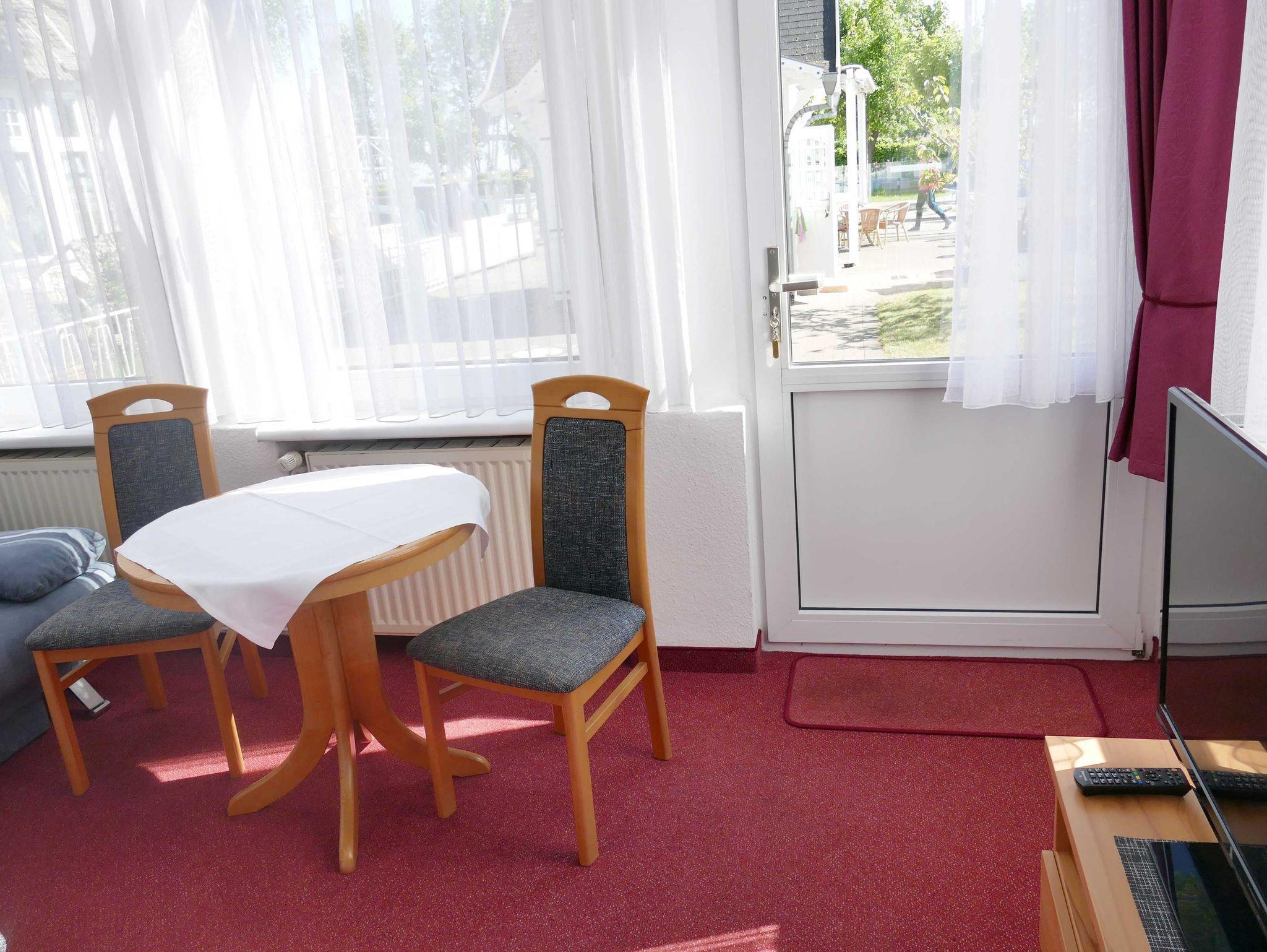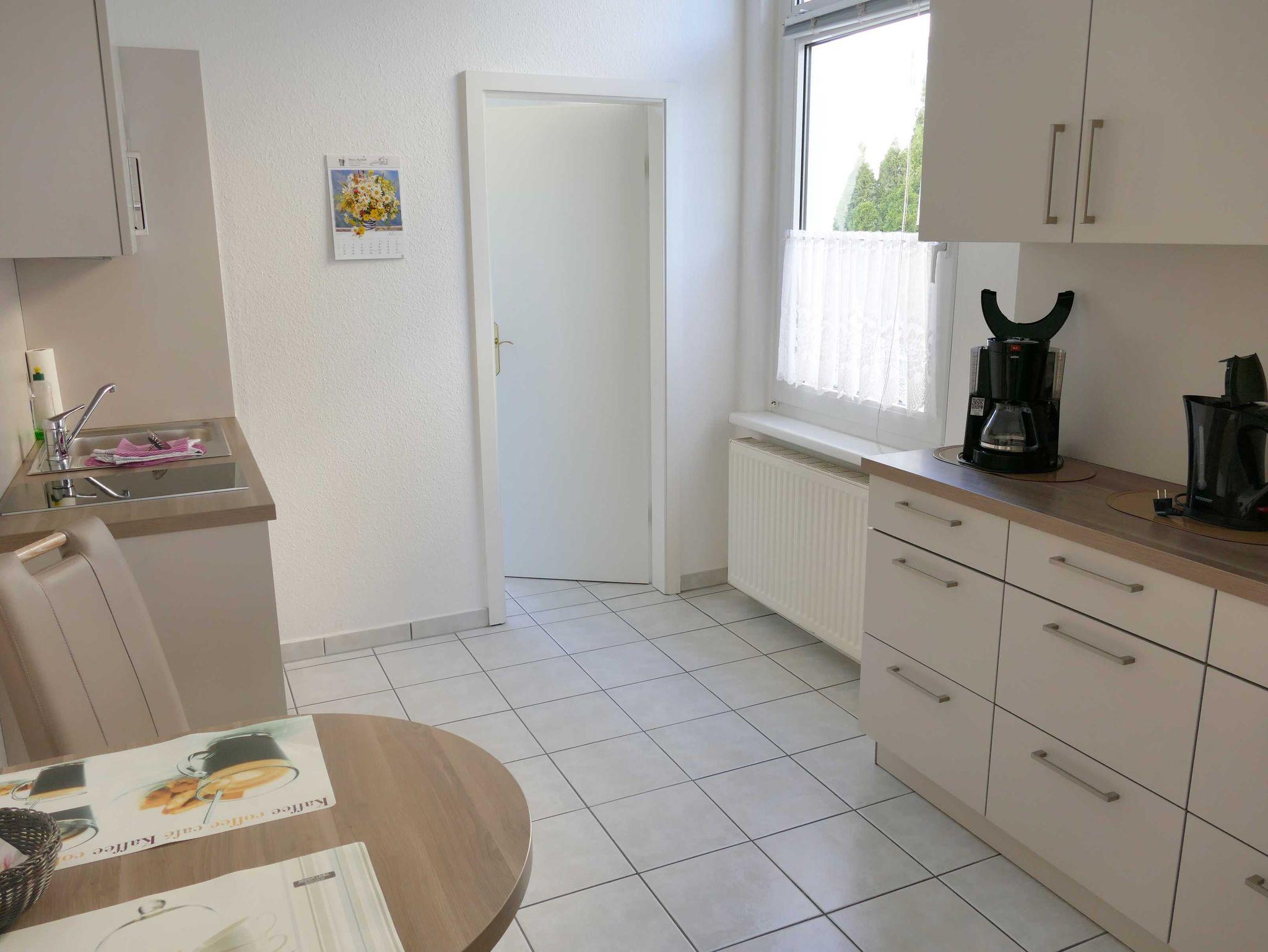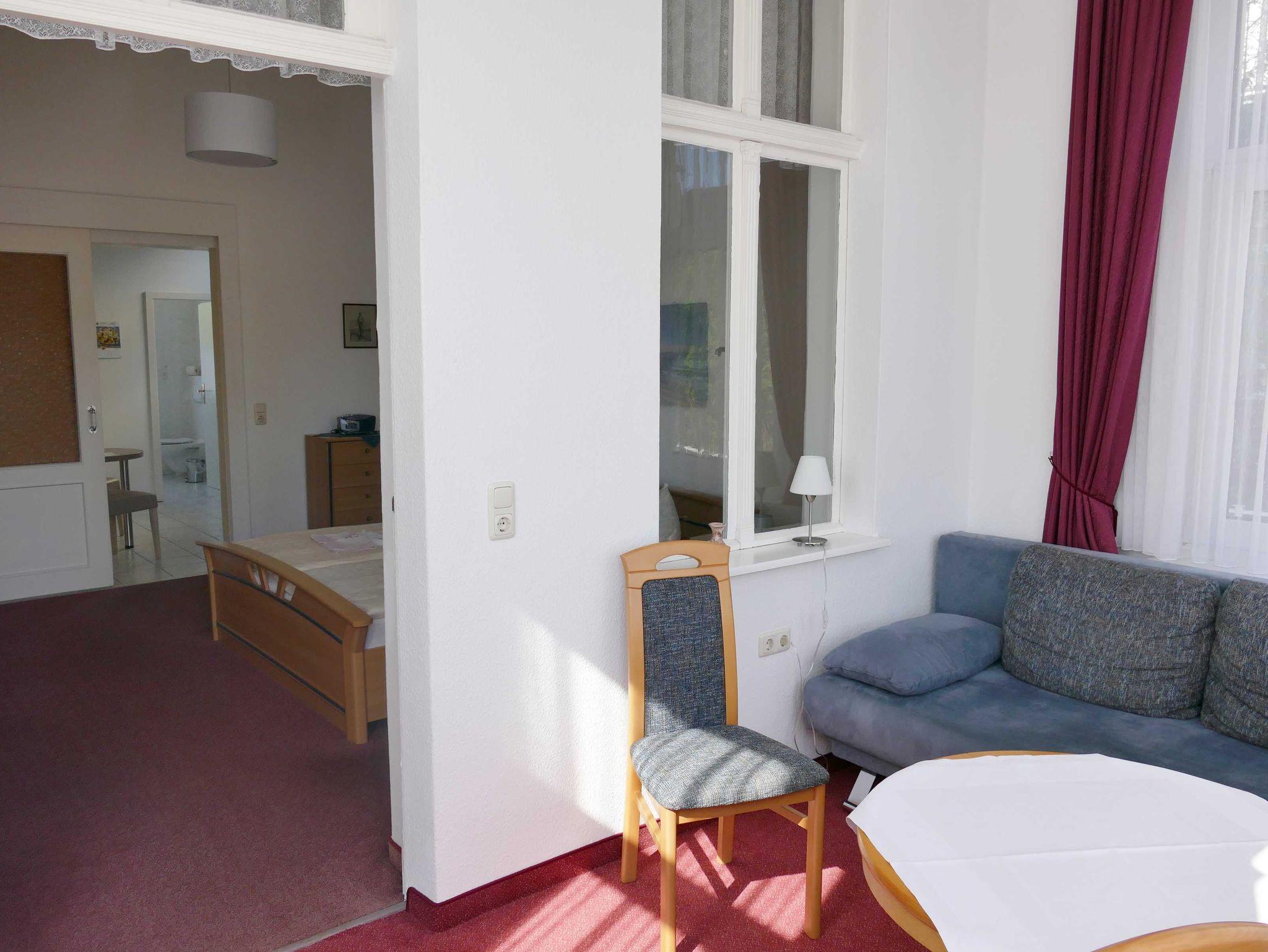 Die großzügige 60 qm große Wohnung im Hochparterre ist ideal für bis zu zwei Personen und bietet Ihnen durch den separaten Eingang auf der Gartenseite der Pension ein angenehmes Maß an Ruhe und Unabhängigkeit. In der hellen Veranda befindet sich der gemütliche Wohnbereich mit Sitzecke und Kabel-TV - ein schöner Ort, um den Tag ausklingen zu lassen. Das Schlafzimmer ist mit einem komfortablen Doppelbett ausgestattet und lädt zum Entspannen ein. Die komplett ausgestattete Küche mit Backofen, Herd, Mikrowelle, Kühlschrank mit Gefrierfach und weiteren Annehmlichkeiten ermöglicht Ihnen eine bequeme Selbstversorgung. Abgerundet wird das Angebot durch ein Badezimmer mit Dusche und WC, das Ihnen zusätzlichen Komfort bietet.