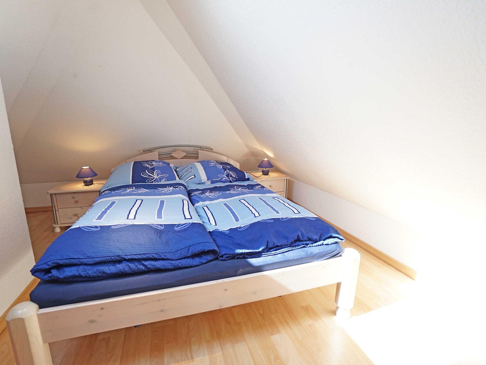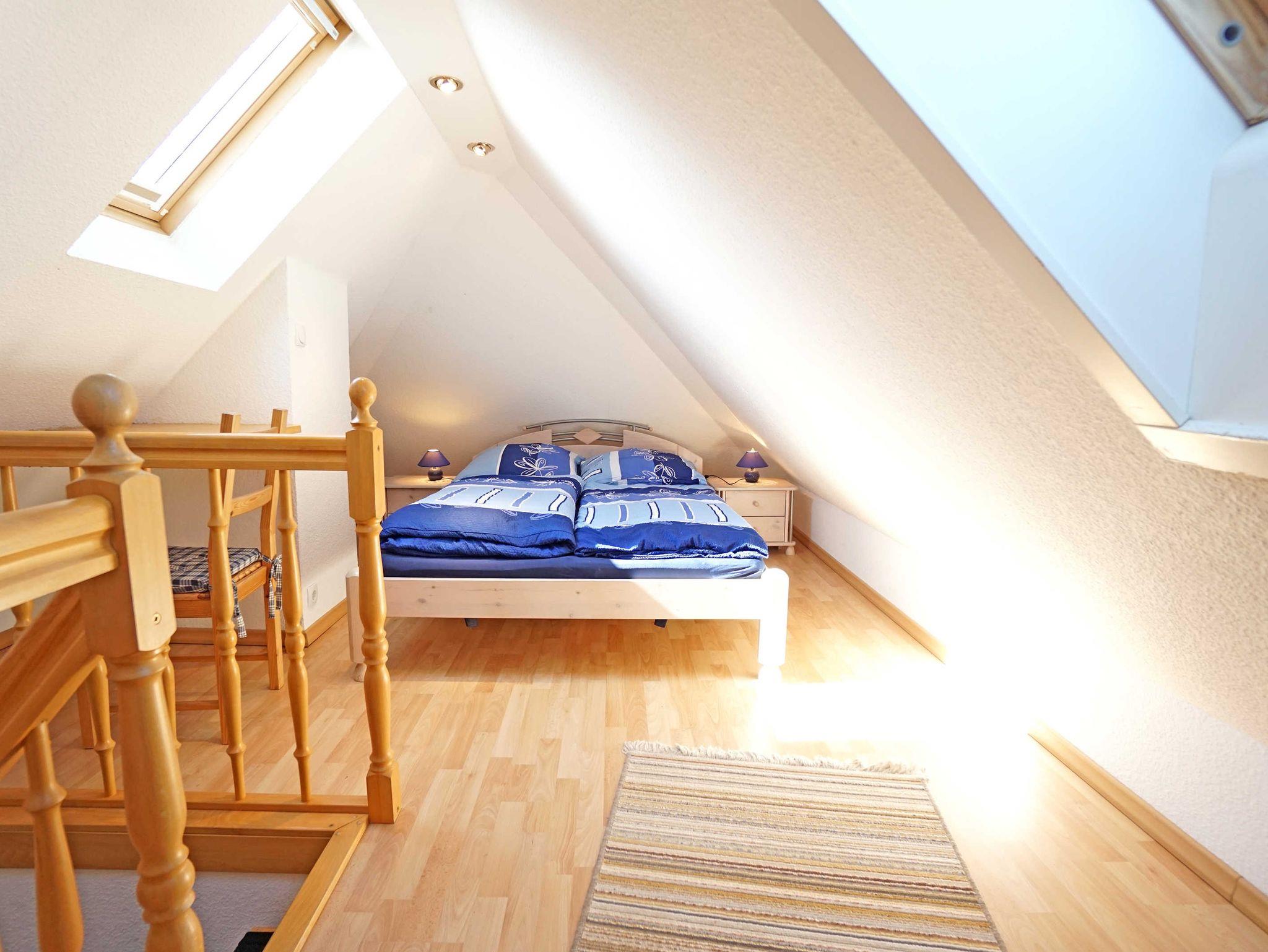 Die gemütlich eingerichtete, helle 2-Zimmer-Maisonettewohnung (62m²) befindet sich im zweiten Obergeschoss des Hauses. Die Nichtraucherwohnung verfügt über ein Wohn- und Esszimmer mit großem Esstisch, Schlafcouch, Flachbildfernseher und offener Küchenzeile (Kochmodul, Kühlschrank mit Gefrierfach). Über eine kleine, relativ steile Treppe erreichen Sie das Schlafzimmer, welches mit einem Doppelbett (140x200cm) und einem Einzelbett ausgestattet ist. Ein geräumiger, sonniger Südbalkon rundet dieses schöne Appartement ab. Ein Duschbad ist vorhanden.