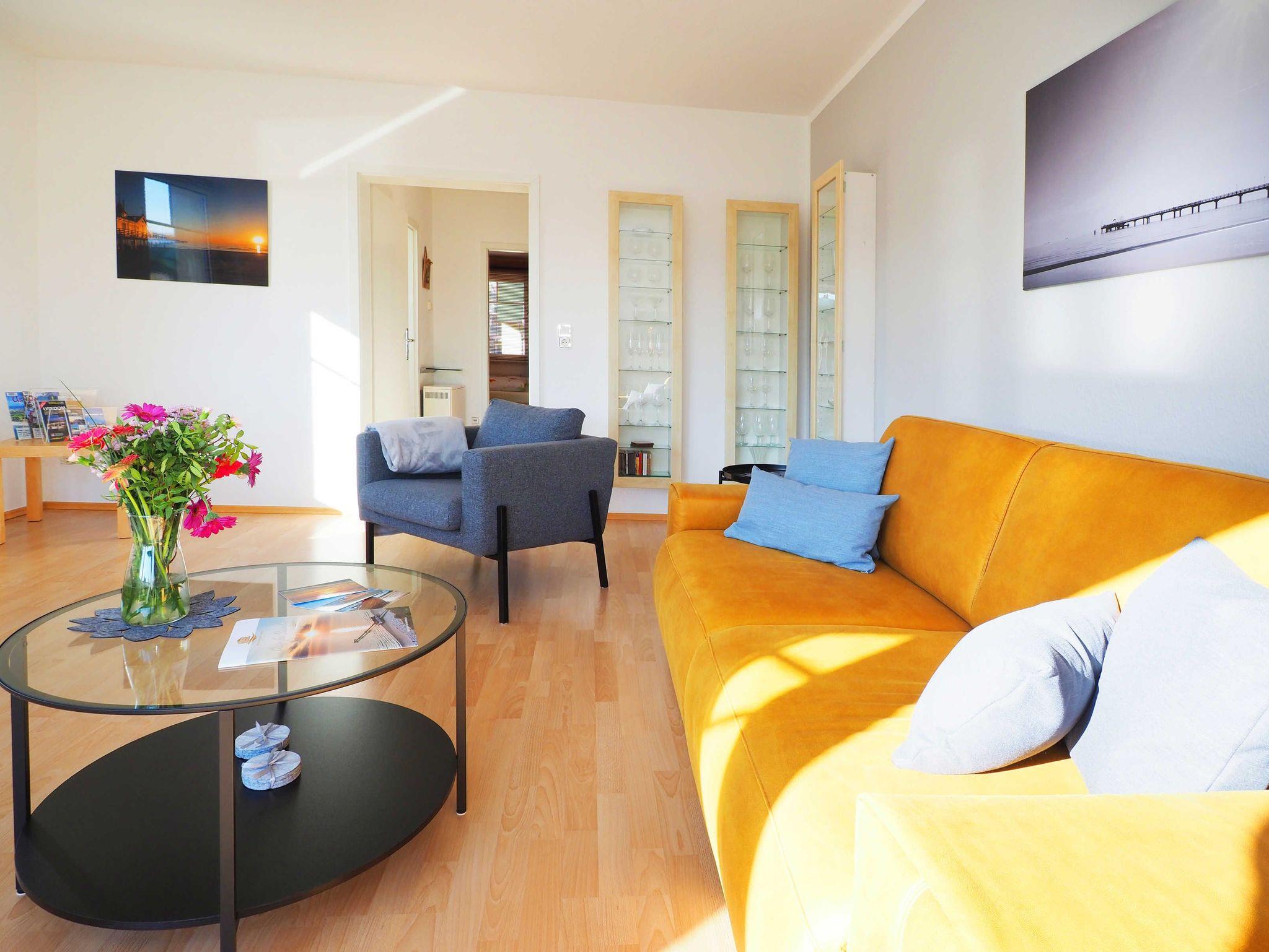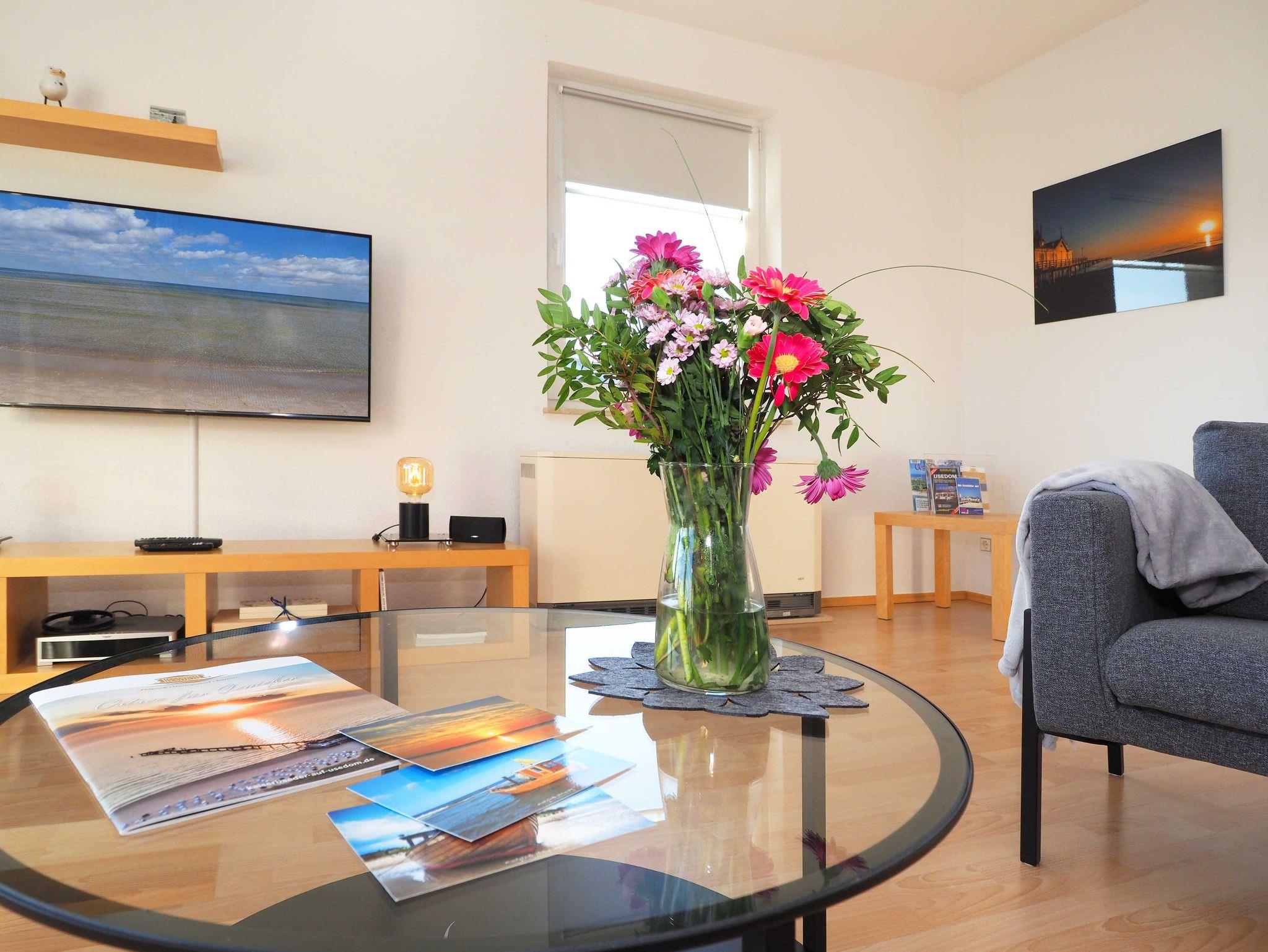 Diese helle und freundliche 58 qm große Nichtraucher-Wohnung befindet sich im 1. OG mit einer Treppe (ohne Fahrstuhl) und verfügt über ein gemütliches Wohnzimmer mit Couch, Sessel, Musikanlage und Flachbild-TV. Von hier aus gelangen Sie auf den Balkon (Südseite) auf dem Sie den Tag am Meer gemütlich ausklingen lassen können. In der großen, separaten voll ausgestatteten Küche mit einer schönen Sitzecke können Sie morgens Ihr Frühstück genießen. Das Schlafzimmer hat ein Doppelbett und Verdunklungsvorhänge sorgen für einen ruhigen Schlaf. Das Tageslicht-Bad mit Dusche komplettiert die moderne Ausstattung dieser Wohnung. Gratis W-LAN steht Ihnen während des Aufenthaltes zur Verfügung. Ihren eigenen Pkw können Sie gern hinter dem Haus parken. Ihre Fahrräder finden in dem abgeschlossenen Fahrradabstellraum Platz.