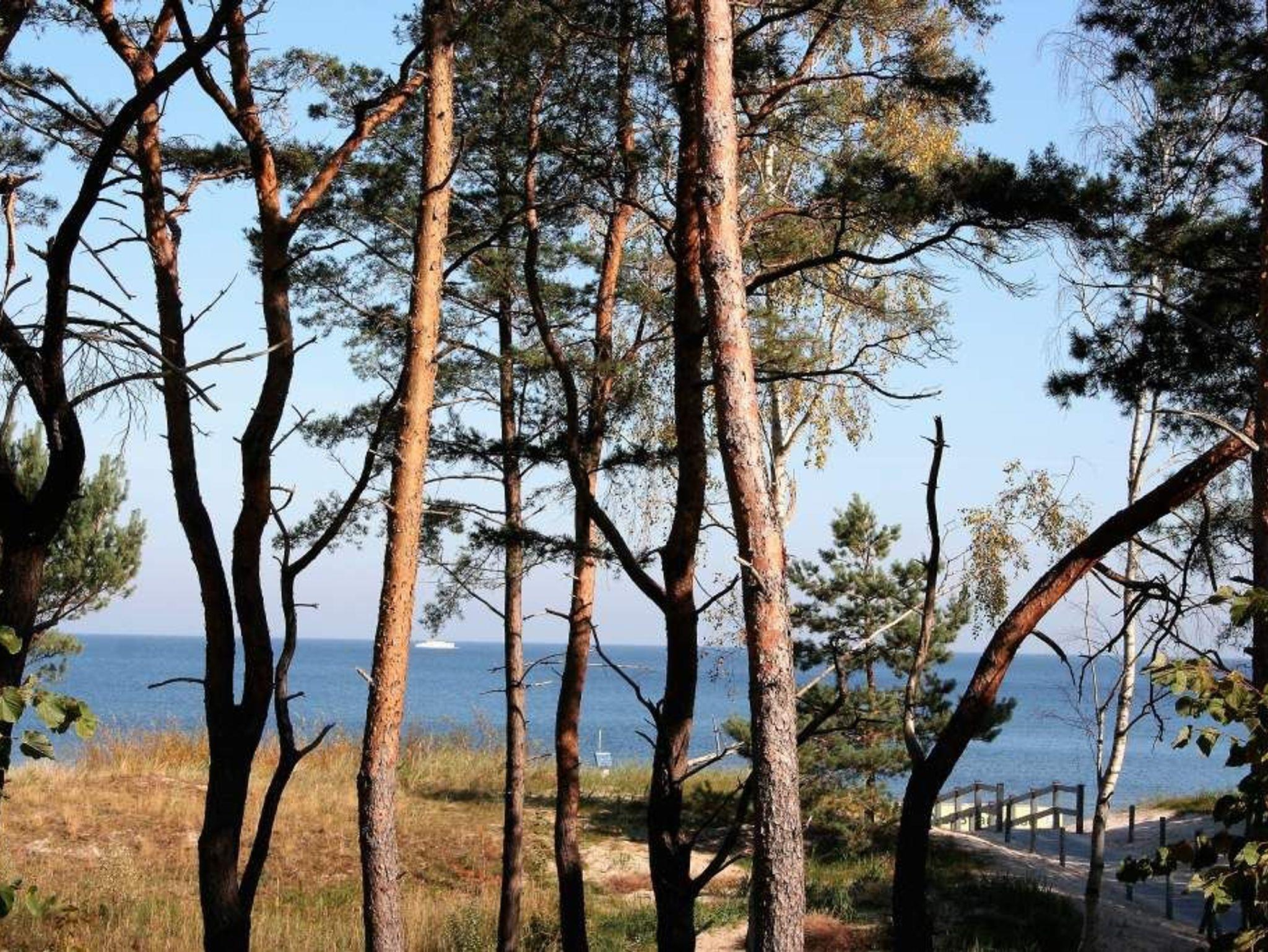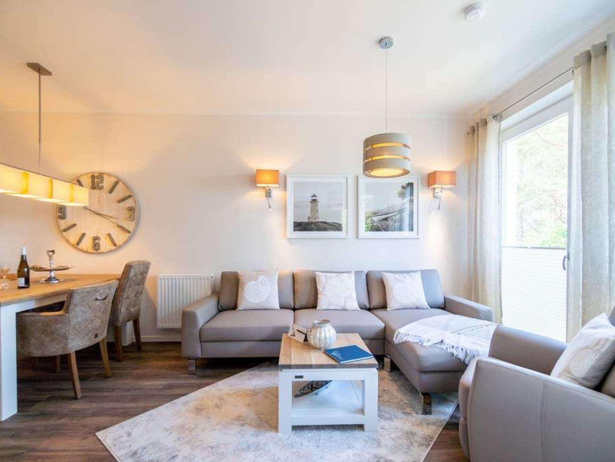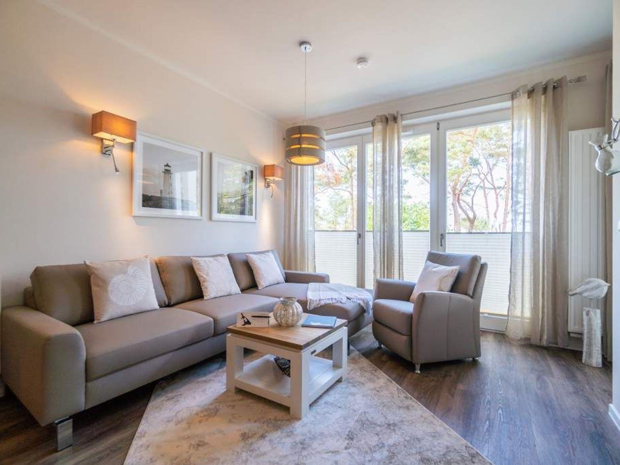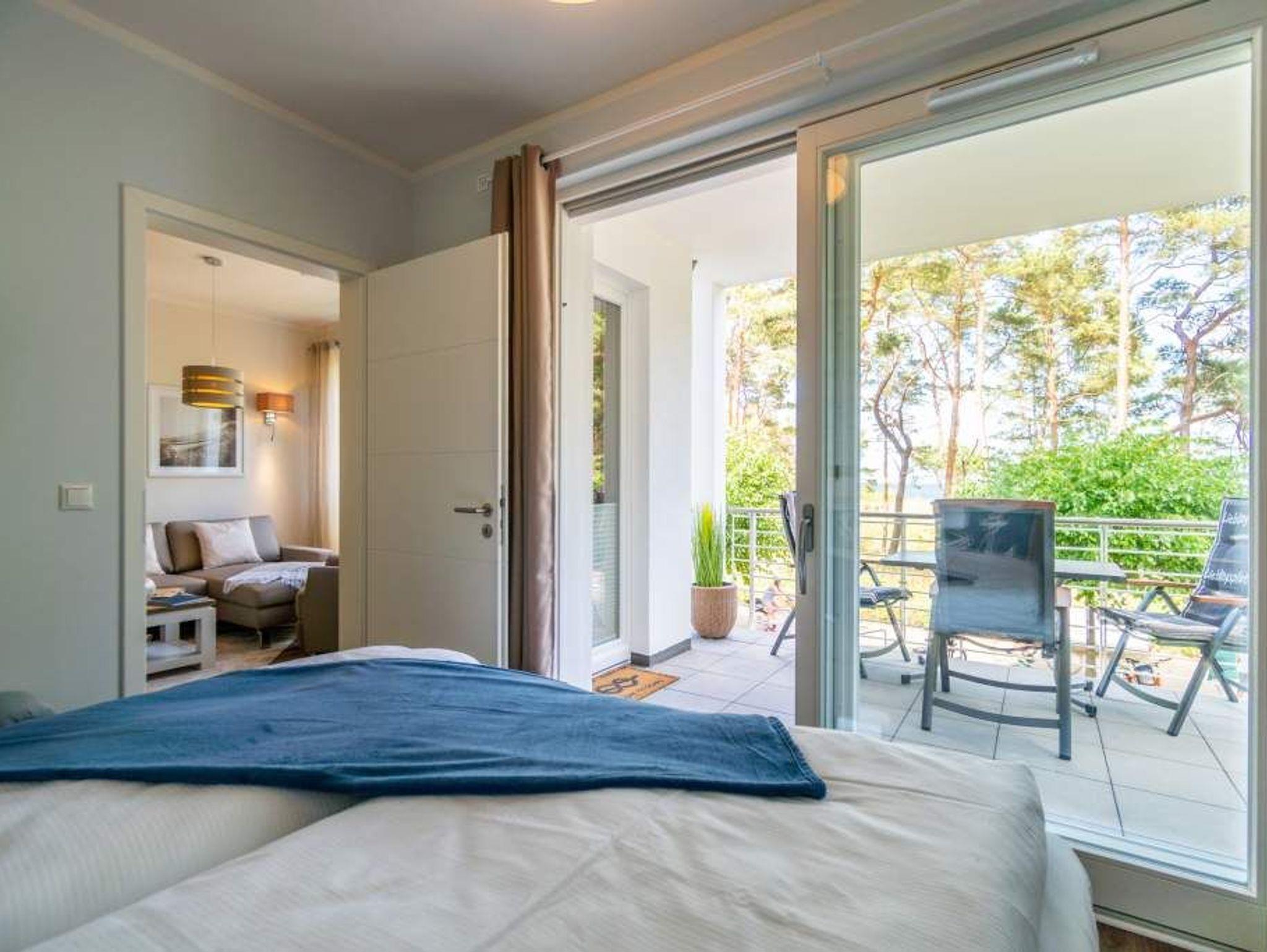 Strandresidenz ? der Name des Hauses ist Programm. Der feine, weiße Ostseestrand ist so dicht, dass Sie das Meer in Ihrem Urlaubsdomizil riechen, hören und sehen können. Und das fast aus der gesamten Wohnung. Es gibt nichts Entspannenderes als vom sanften Rauschen der Wellen in den Schlaf getragen zu werden und des Morgens davon wieder geweckt zu werden. Vor allem, wenn man direkt nach dem Aufstehen auf den Balkon hinaustritt und die Nähe der Ostsee unmittelbar spüren kann. Das 65 Quadratmeter große Appartement in der ersten Etage, das bis zu drei Erwachsenen (keine Kleinkinder) Platz bietet, ist hell und modern eingerichtet. Stilvolle Möbel sorgen für eine Wohlfühlatmosphäre. Das offene Wohn-Esszimmer mit Echtleder-Sofa lädt zum Relaxen vor dem Flat-TV ein. Die Küchenzeile ist mit hochwertigen Geräten wie Herd, Backofen, Kühlschrank mit Gefriermöglichkeit, Spülmaschine und Mikrowelle ausgestattet. Geschirr finden Sie in den Schränken. Am schönen Essplatz mit Tisch und Stühlen lässt es sich nicht nur wunderbar dinieren. Plaudern, spielen, diskutieren ? er ist ein Garant für gemütliche Stunden. Die Wohnung verfügt über zwei Schlafzimmer. Eines besitzt ein komfortables Boxspringdoppelbett (1,80 m x 2,00 m), einen Flat-TV und einen großen Kleiderschrank. Im zweiten Zimmer stehen ein Einzelbett (1,00 m x 2,00 m) und ebenfalls ein Flat-TV. Außerdem bietet auch hier ein Schrank genügend Ablagefläche. Für kleine Schreibtätigkeiten steht in diesem Schlafzimmer auch ein Schreibtisch zur Verfügung. Das Badezimmer ist modern gestaltet und mit Regen-Dusche, Waschtisch und WC ausgestattet. Für den rundum sorglosen Urlaubskomfort sind die Betten bezogen und Handtücher liegen für Sie bereit. Zum Appartement gehört ein Tiefgaragenstellplatz. Tiefgarage mit Doppelparker, Fahrzeughöhe max. 1,90 m