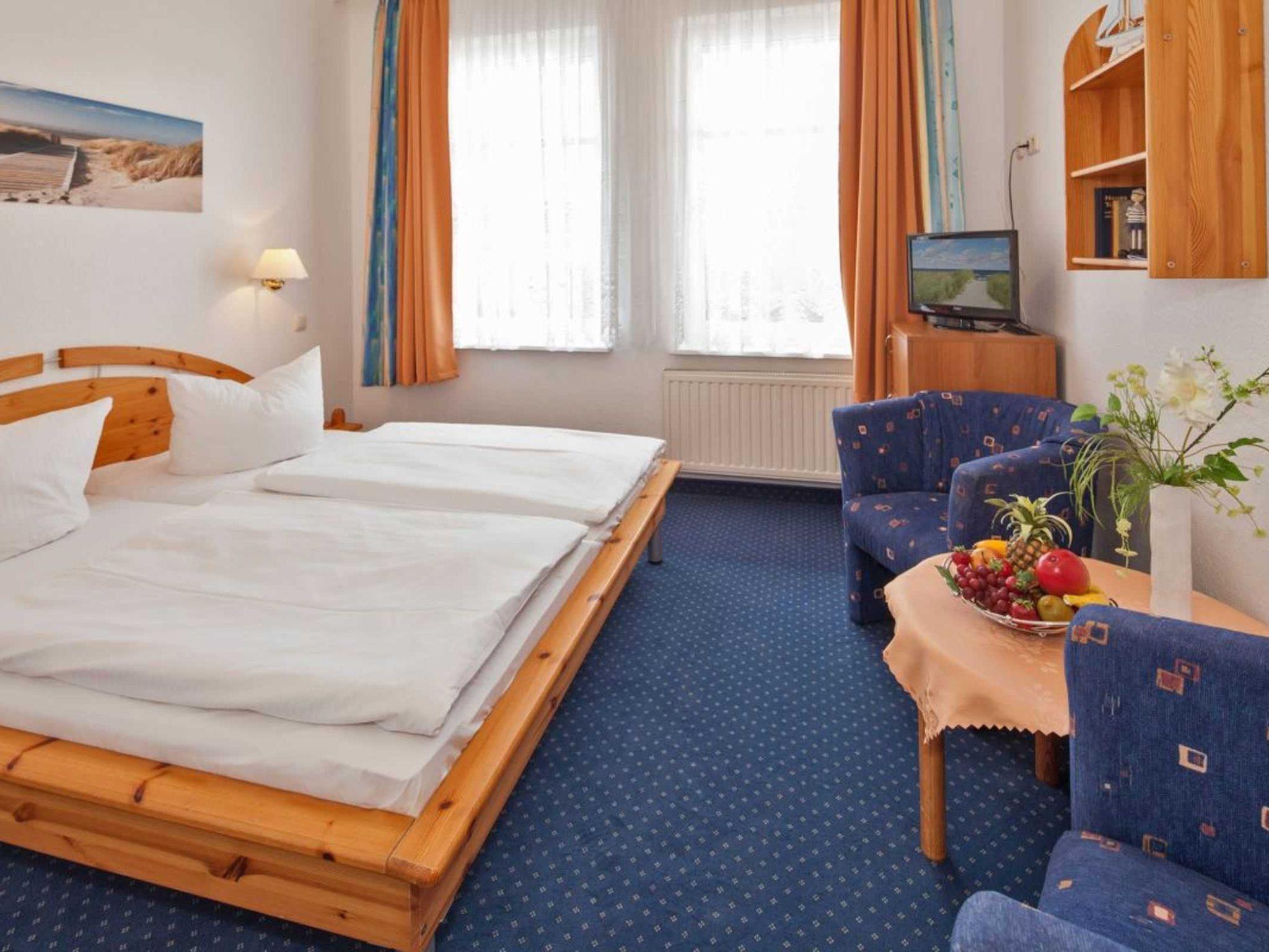 Das modern und komfortabel eingerichtete Ferienzimmer befindet sich im Erdgeschoss im Haus Antje. Ausgestattet ist es mit einem Doppelbett und einer kleinen SItzmöglichkeit mit Fernseher. Bad mit Dusche, Waschtisch und WC. Ein reichhaltiges Frühstücksbuffet ist bereits im Preis enthalten.