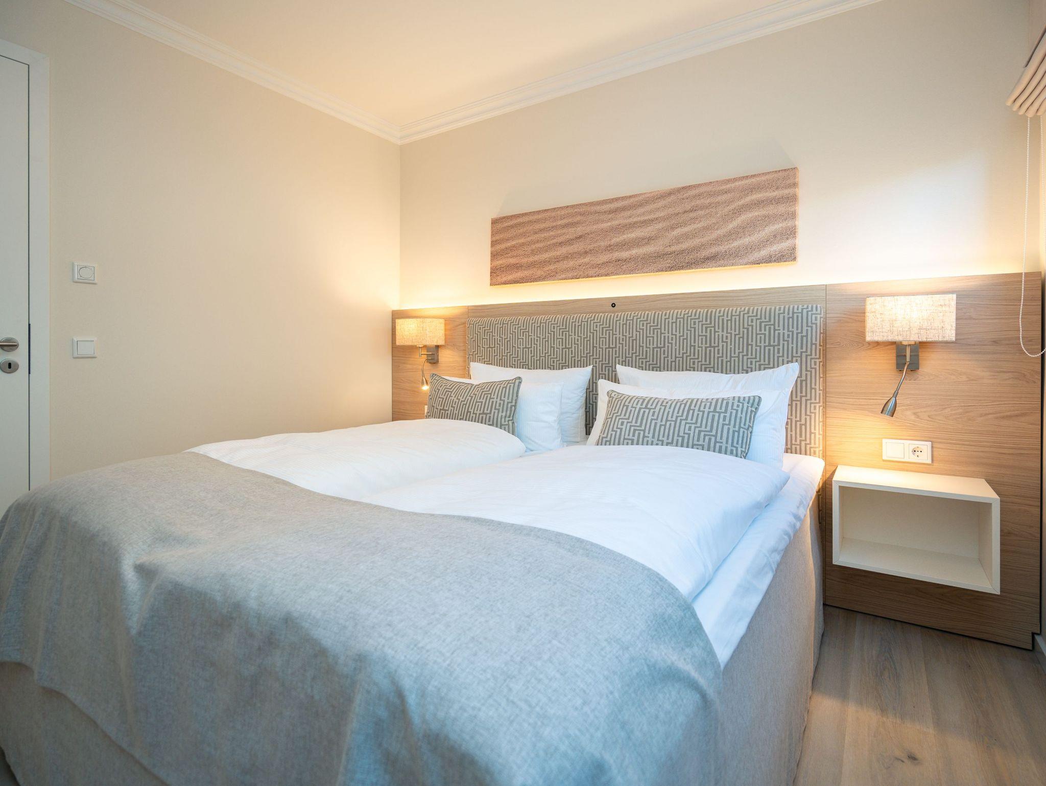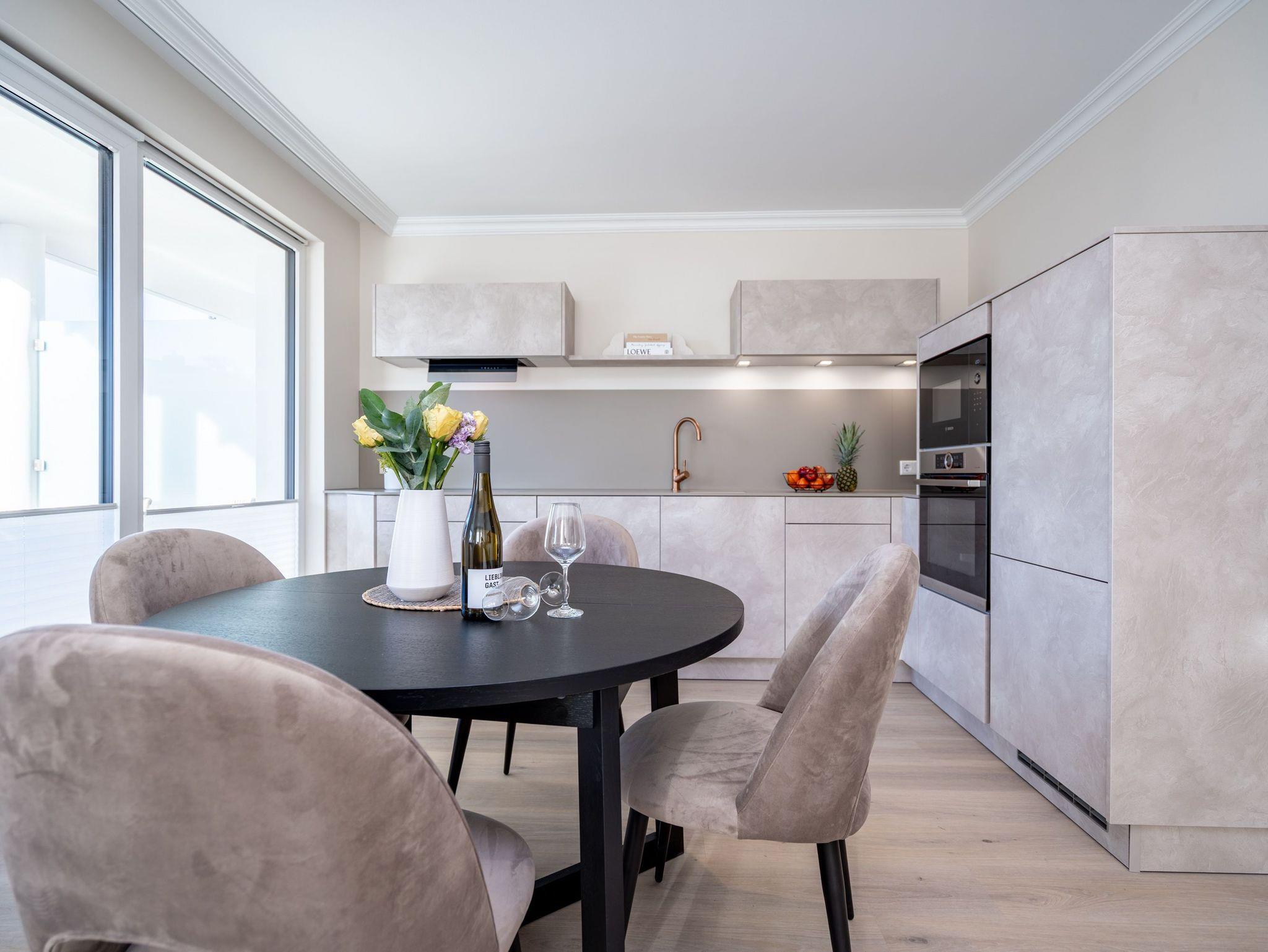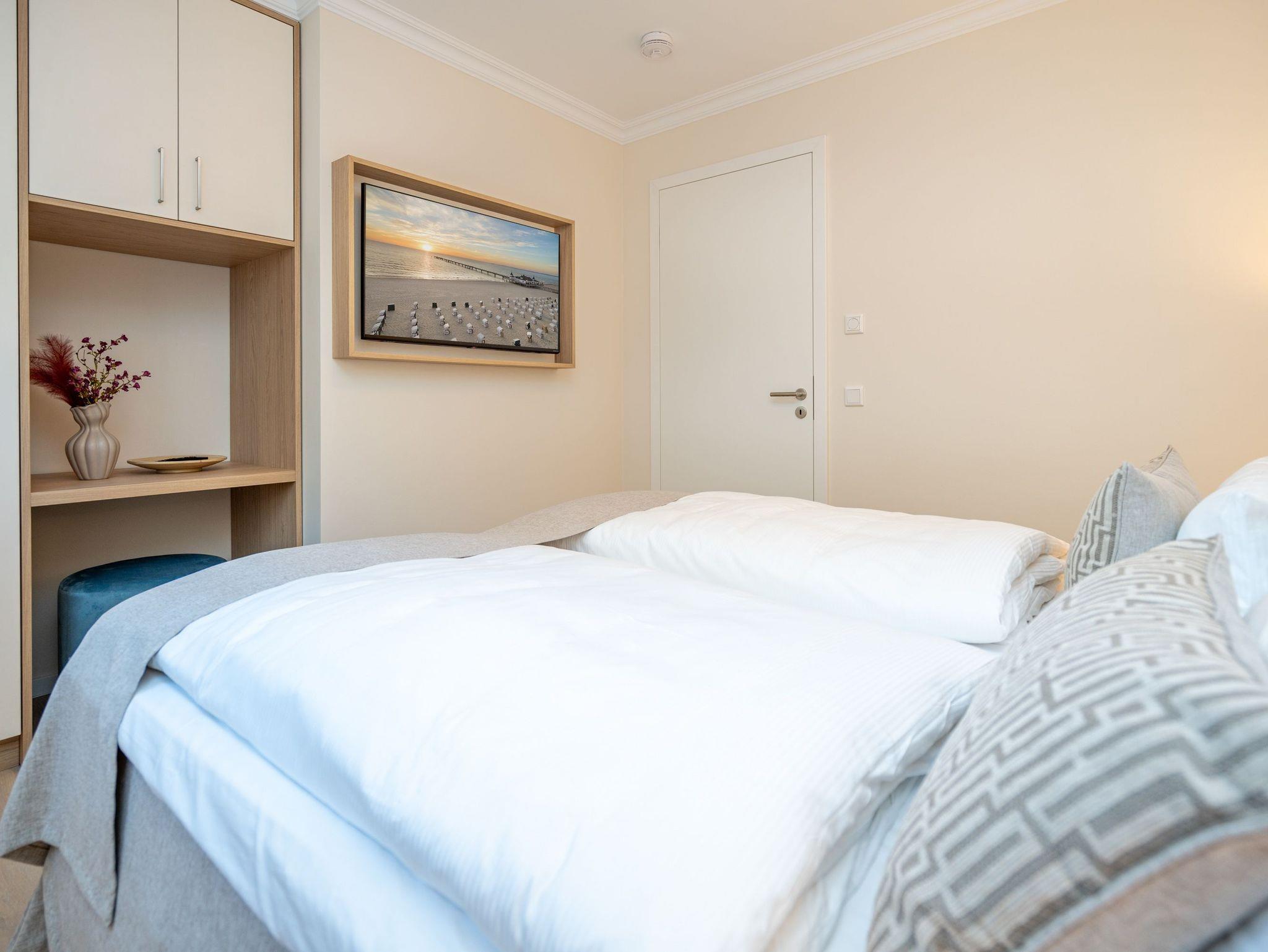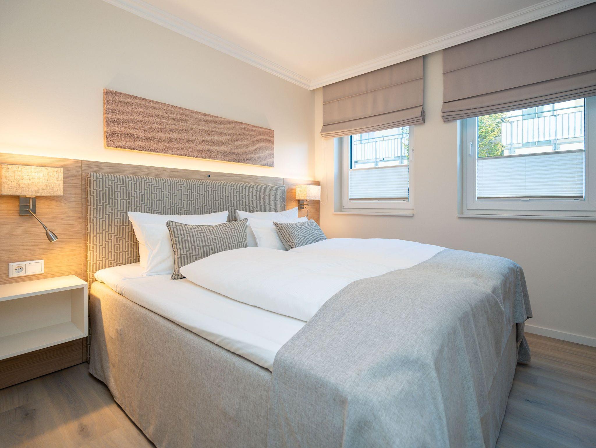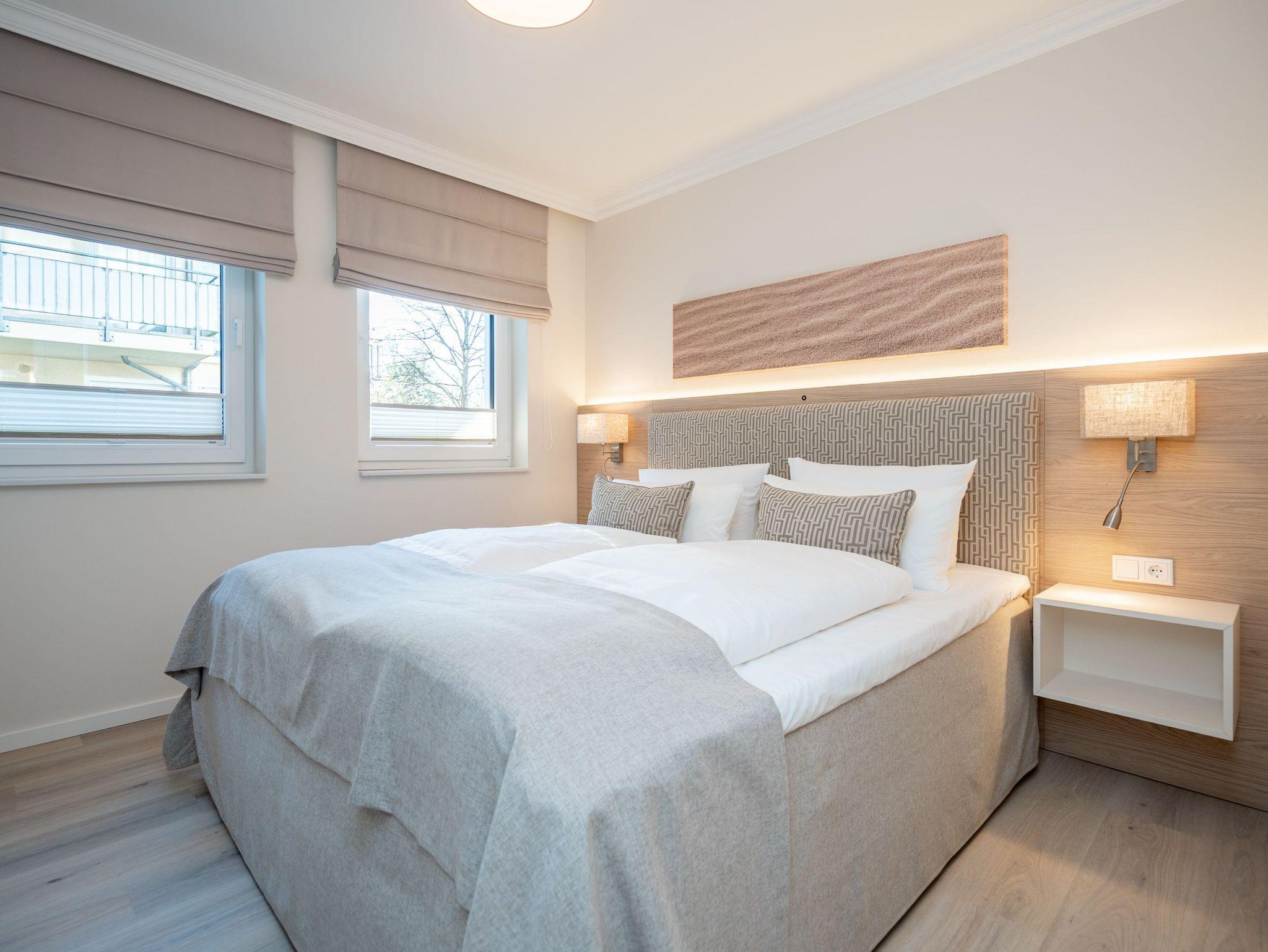 Ein stilvolles 3-Raum-Appartement mit 68 m² Wohnfläche im Hochparterre, das durch Helligkeit, klare Linien und eine wohnliche Atmosphäre überzeugt. Ideal für bis zu vier Personen, die Komfort und eine hochwertige Ausstattung zu schätzen wissen. Der offene Wohnbereich ist großzügig gestaltet und mit einer gemütlichen Sitzgruppe, Gas-Kamin (per Fernbedienung steuerbar) und Flat-TV ausgestattet ? ein Platz zum Entspannen und Wohlfühlen. Die moderne Küchenzeile bietet alles, was man für den Urlaub braucht: Backofen, Cerankochfeld, Mikrowelle, Spülmaschine und Kühlschrank mit Gefrierfach. Am angrenzenden Essplatz lässt sich gemeinsam genießen und verweilen. Besonderes Highlight ist die großzügige Süd-Ost-Terrasse mit etwa 50 m² Fläche. Sie ist möbliert und bietet viel Raum für entspannte Stunden im Freien ? ob beim Frühstück in der Sonne oder beim Abendessen an der frischen Luft. Beide Schlafzimmer verfügen über komfortable Boxspringbetten (180 × 200 cm), geräumige Kleiderschränke und je einen Flat-TV. Das innenliegende Bad ist mit Dusche, Waschtisch und WC ausgestattet, ein separates Gäste-WC sorgt für zusätzlichen Komfort. Zur Wohnung gehört ein Stellplatz in der Tiefgarage (Durchfahrthöhe 1,85m), WLAN steht kostenfrei zur Verfügung. Ein modernes Appartement mit großzügiger Terrasse ? ideal für Gäste, die Wert auf Stil, Licht und Wohnqualität legen.