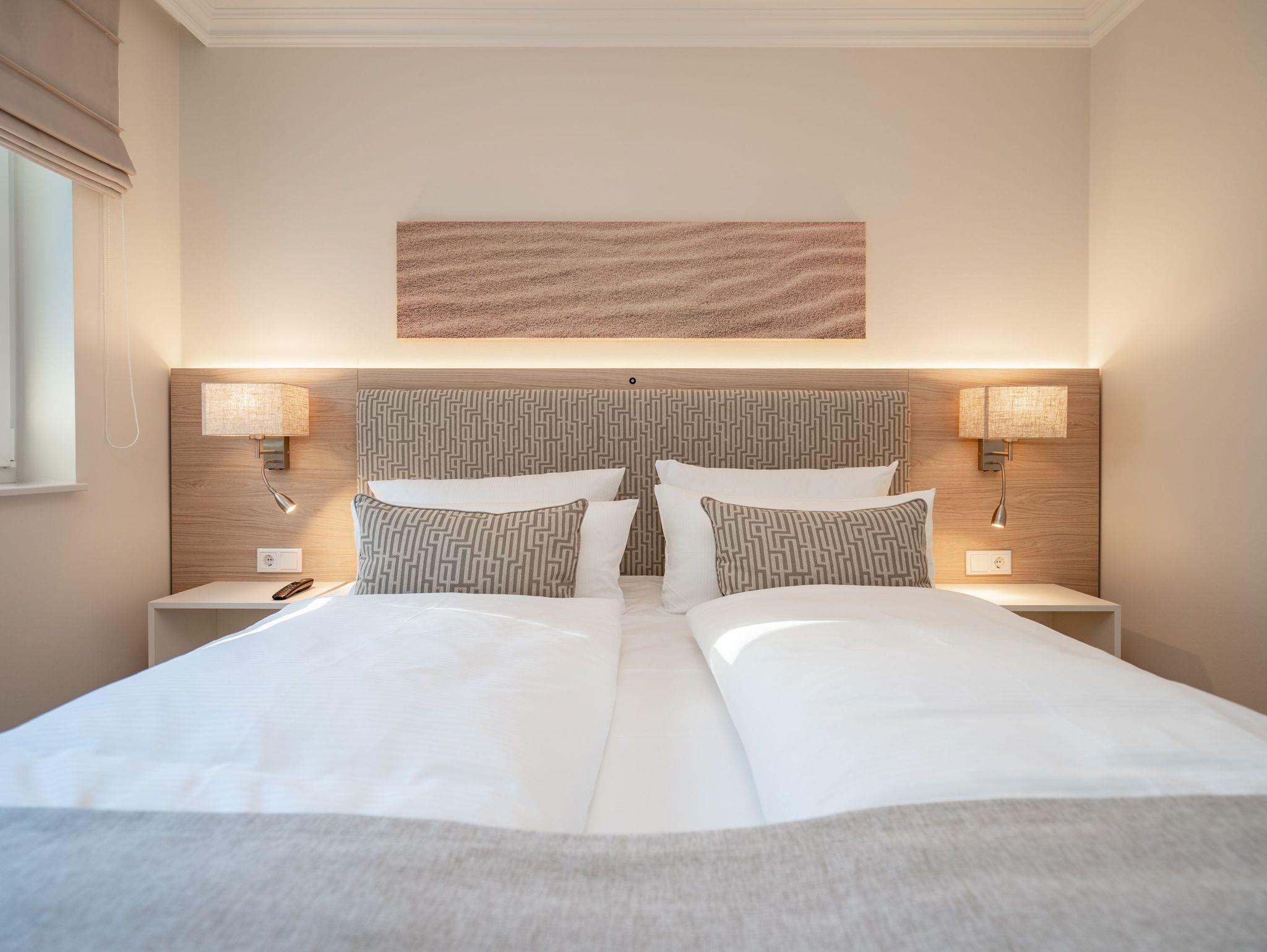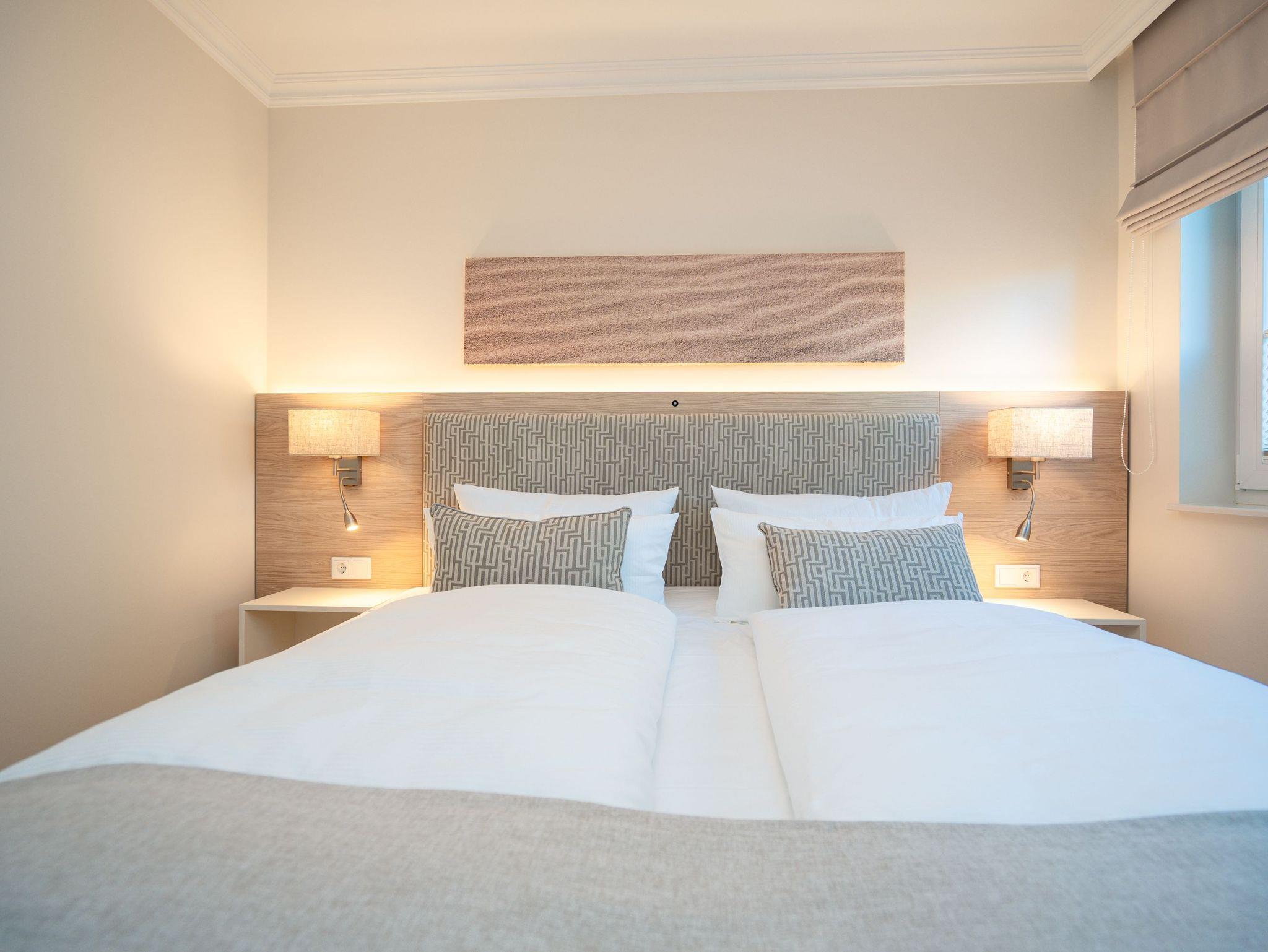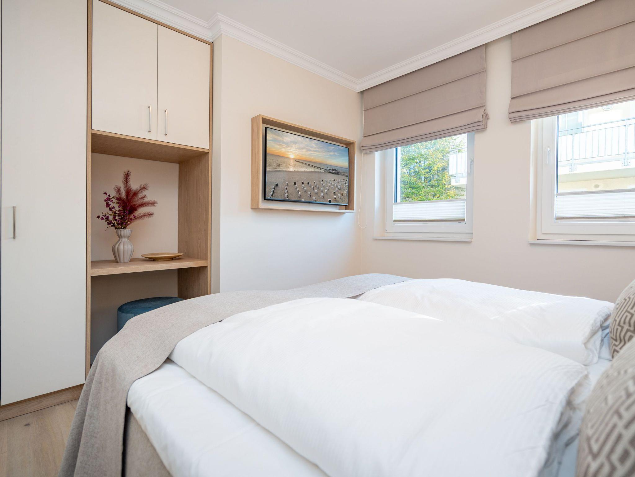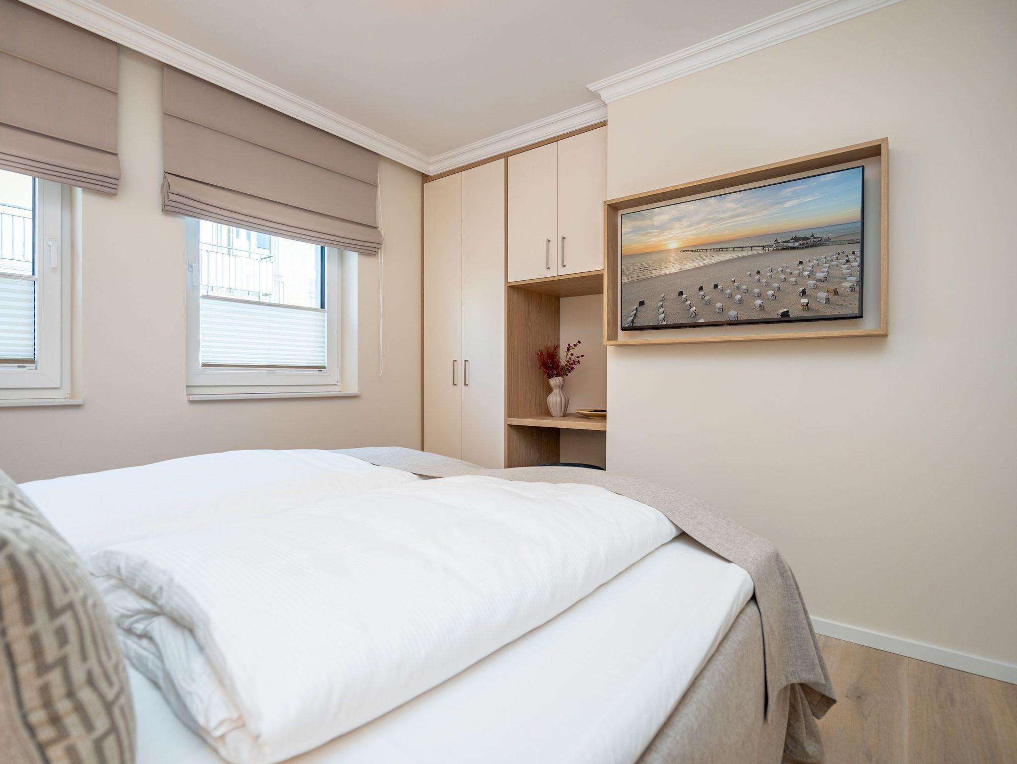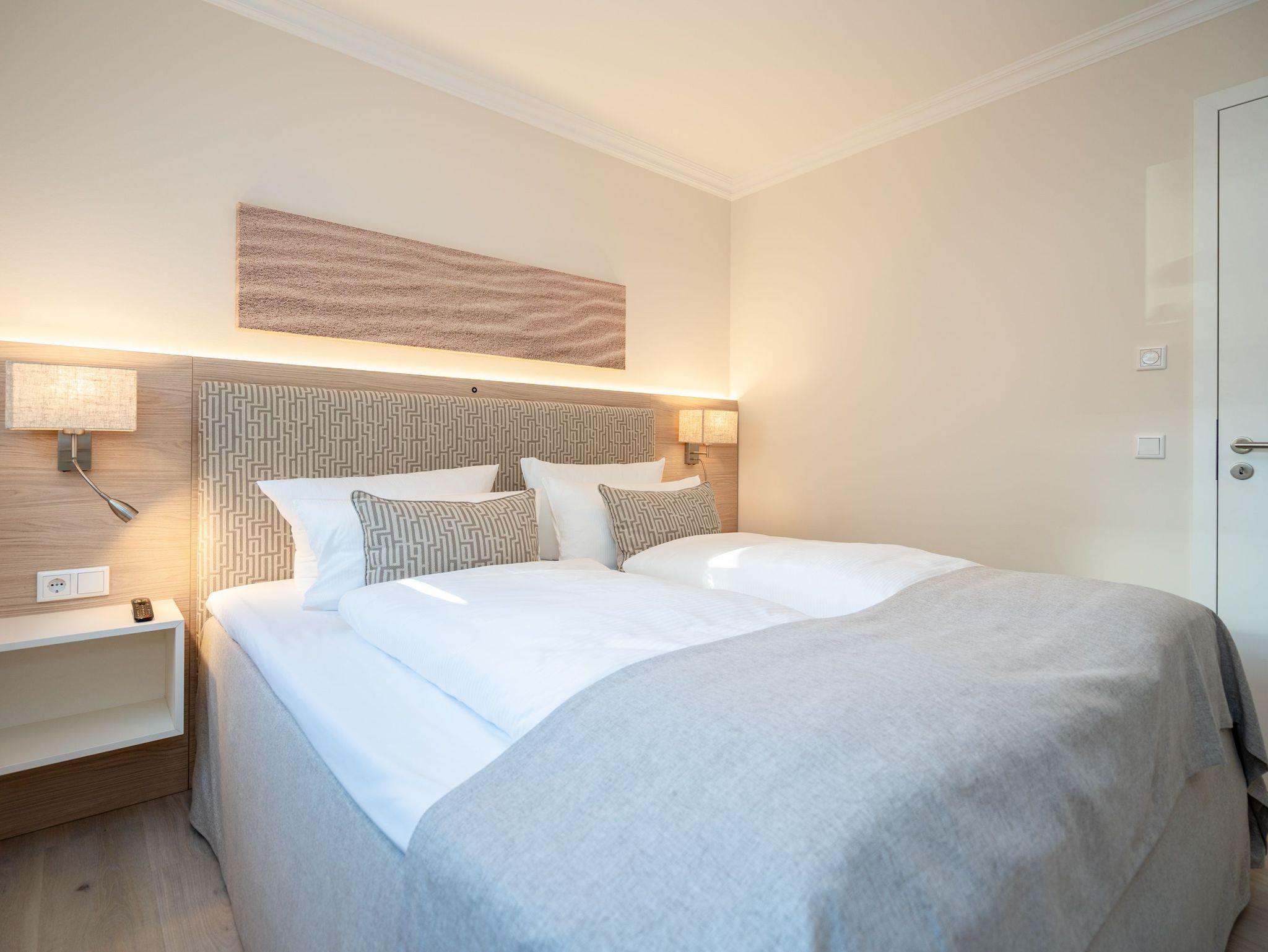 Ein stilvolles 3-Raum-Appartement mit 68 m² Wohnfläche im Hochparterre, das durch Helligkeit, klare Linien und eine wohnliche Atmosphäre überzeugt. Ideal für bis zu vier Personen, die Komfort und eine hochwertige Ausstattung zu schätzen wissen. Der offene Wohnbereich ist großzügig gestaltet und mit einer gemütlichen Sitzgruppe, Gas-Kamin (per Fernbedienung steuerbar) und Flat-TV ausgestattet ? ein Platz zum Entspannen und Wohlfühlen. Die moderne Küchenzeile bietet alles, was man für den Urlaub braucht: Backofen, Cerankochfeld, Mikrowelle, Spülmaschine und Kühlschrank mit Gefrierfach. Am angrenzenden Essplatz lässt sich gemeinsam genießen und verweilen. Besonderes Highlight ist die großzügige Süd-Ost-Terrasse mit etwa 50 m² Fläche. Sie ist möbliert und bietet viel Raum für entspannte Stunden im Freien ? ob beim Frühstück in der Sonne oder beim Abendessen an der frischen Luft. Beide Schlafzimmer verfügen über komfortable Boxspringbetten (180 × 200 cm), geräumige Kleiderschränke und je einen Flat-TV. Das innenliegende Bad ist mit Dusche, Waschtisch und WC ausgestattet, ein separates Gäste-WC sorgt für zusätzlichen Komfort. Zur Wohnung gehört ein Stellplatz in der Tiefgarage (Durchfahrthöhe 1,85m), WLAN steht kostenfrei zur Verfügung. Ein modernes Appartement mit großzügiger Terrasse ? ideal für Gäste, die Wert auf Stil, Licht und Wohnqualität legen.