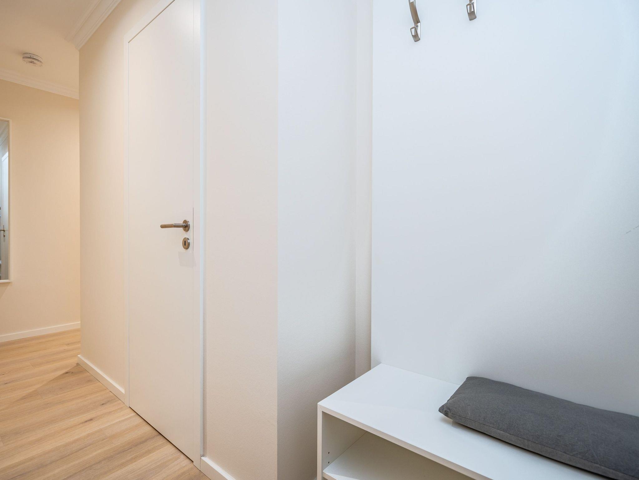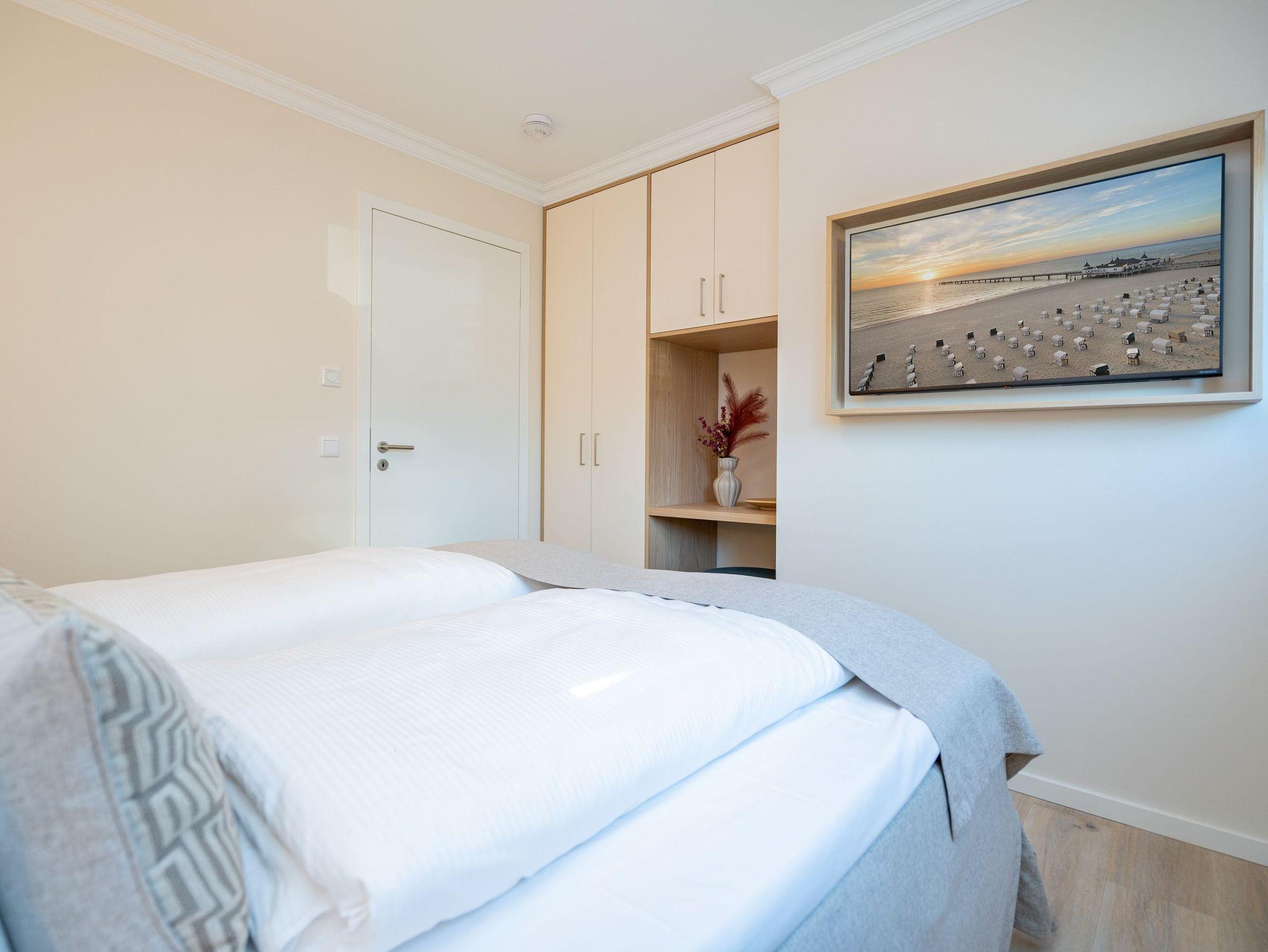 Ein stilvolles 3-Raum-Appartement mit 68 m² Wohnfläche im Hochparterre, das durch Helligkeit, klare Linien und eine wohnliche Atmosphäre überzeugt. Ideal für bis zu vier Personen, die Komfort und eine hochwertige Ausstattung zu schätzen wissen. Der offene Wohnbereich ist großzügig gestaltet und mit einer gemütlichen Sitzgruppe, Gas-Kamin (per Fernbedienung steuerbar) und Flat-TV ausgestattet ein Platz zum Entspannen und Wohlfühlen. Die moderne Küchenzeile bietet alles, was man für den Urlaub braucht: Backofen, Cerankochfeld, Mikrowelle, Spülmaschine und Kühlschrank mit Gefrierfach. Am angrenzenden Essplatz lässt sich gemeinsam genießen und verweilen. Besonderes Highlight ist die großzügige Süd-Ost-Terrasse mit etwa 50 m² Fläche. Sie ist möbliert und bietet viel Raum für entspannte Stunden im Freien ob beim Frühstück in der Sonne oder beim Abendessen an der frischen Luft. Beide Schlafzimmer verfügen über komfortable Boxspringbetten (180 × 200 cm), geräumige Kleiderschränke und je einen Flat-TV. Das innenliegende Bad ist mit Dusche, Waschtisch und WC ausgestattet, ein separates Gäste-WC sorgt für zusätzlichen Komfort. Zur Wohnung gehört ein Stellplatz in der Tiefgarage (Durchfahrthöhe 1,85m), WLAN steht kostenfrei zur Verfügung. Ein modernes Appartement mit großzügiger Terrasse ideal für Gäste, die Wert auf Stil, Licht und Wohnqualität legen.