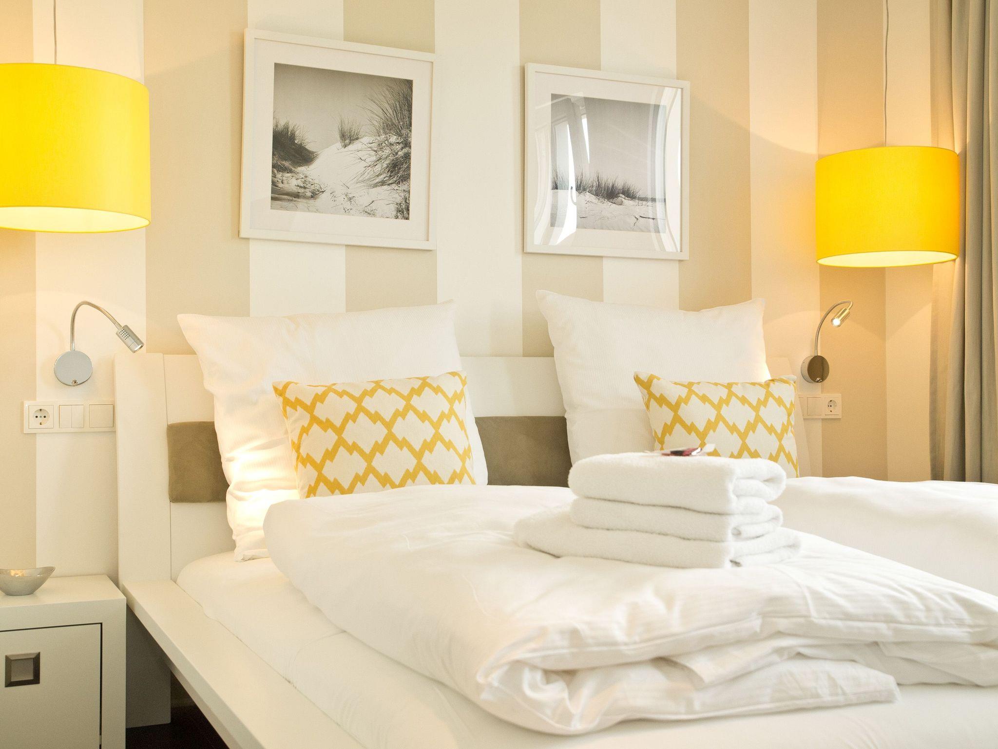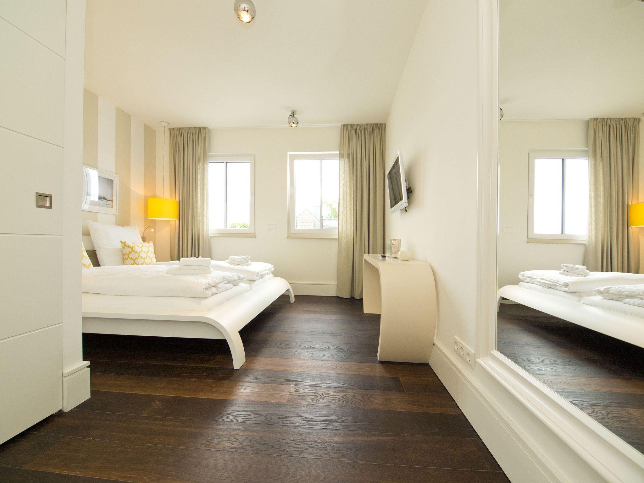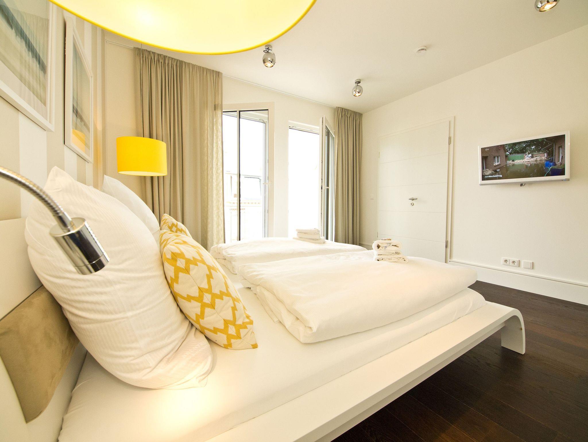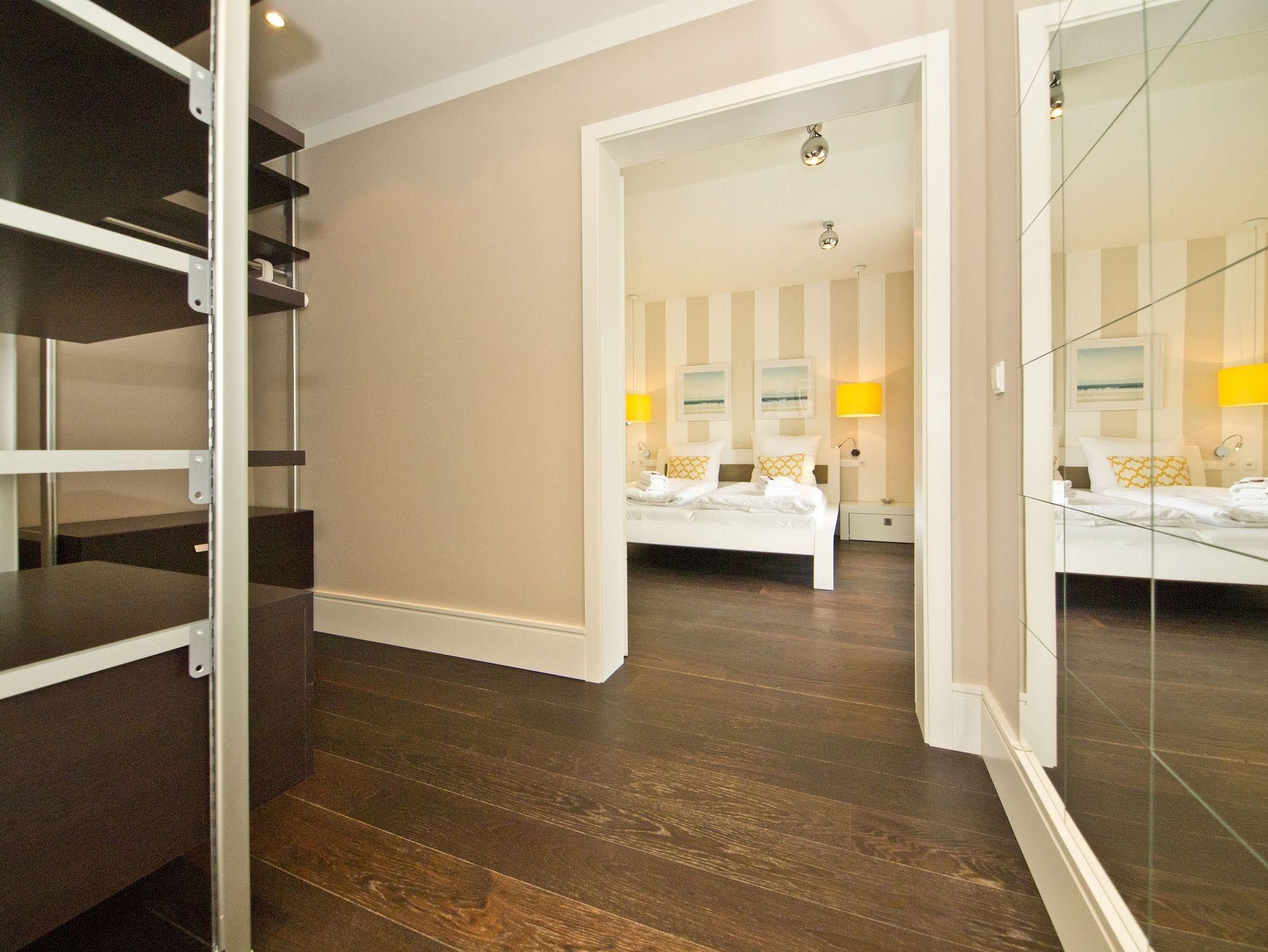 Im 2. Obergeschoss des Dünenpalais trifft modernes Design exklusive Ausstattung! Auf 100 qm wurden hochwertige Einbauten, ein edler dunkler Dielenboden und geschmackvolle Dekorationen von versierter Innenarchitektenhand zusammengestellt und schaffen so eine stylische Wohlfühlatmosphäre für bis zu 4 Personen und 1 Kleinkind (bis 3 Jahre im Kinderreisebett). Der großzügige Wohnbereich mit bequemer Sitzgruppe und Flat-TV schließt sich an die offene Küche mit Essplatz an. Ein besonderes Highlight ist der Gaskamin, der per Fernbedienung ein tolles Ambiente zaubert. Der Masterbedroom (mit Doppelbett 1,80m und Flat-TV) mit Balkon (Nordseite) verfügt über ein eigenes Ankleidezimmer, an das sich das große Bad mit Echtglasdusche [&] WC anschließt. Hier wurde ebenfalls die wohnungseigene Sauna (gegen Gebühr 1,00 € pro Stunde) integriert, nicht nur in der kalten Jahreszeit ein Ort zum Relaxen. Das zweite Schlafzimmer ist ebenfalls mit Doppelbett und eigenem Flat-TV ausgestattet, ihm gegenüber liegt das zweite Duschbad. Im Abstellraum kann eine Waschmaschine ( gegen Gebühr) genutzt werden. Ein sonniger Südbalkon mit Strandkorb und Gartenmöbeln rundet das Appartement ab. Für Ihren Komfort steht die Erstausstattung Wäsche für Sie bereit. Auf Wunsch stellen wir ein Kinderreisebett (ohne Matratze [&] Bettzeug) und einen Kinderhochstuhl gegen einen Aufpreis zur Verfügung. Ein PKW-Stellplatz steht Ihnen in der Tiefgarage zur Verfügung.