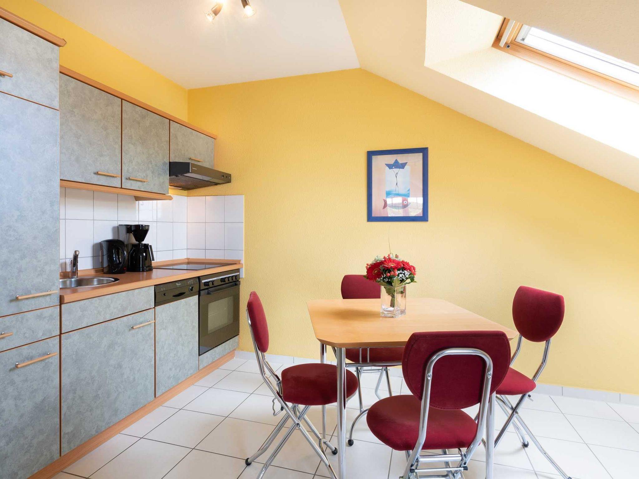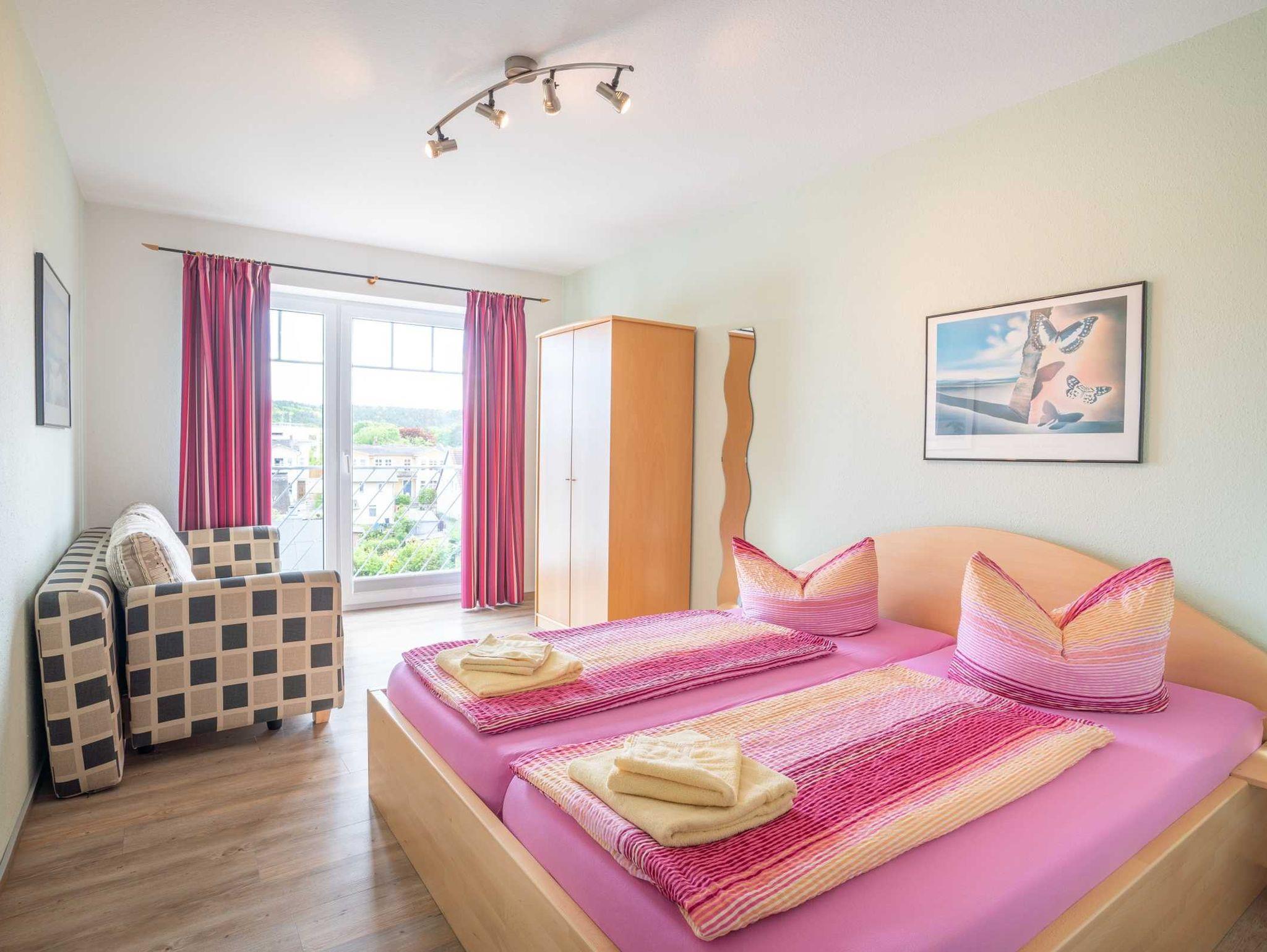 Die Wohnung ist für 2 Erwachsene und 1 x Aufbettung für ein Kind ausgelegt. In der offenen Küche finden Sie eine kleine vollwertige Küchenzeile (4 Platten Cerankochfeld, Backofen, Kühlschrank mit Gefrierfach, Spülmaschine, Wasserkocher, Toaster, Kaffeemaschine) Der Balkon zur sonnigen Süd-Ost Seite lädt zum verweilen ein. Im Schlafzimmer gibt es ein Doppelbett mit Einzelmatratzen 90x200 und ein Schlafsofa für ein Kind. Ein Babyreisebett und Hochstuhl können auf Wunsch dazu gebucht werden. Im Wohnzimmer können Sie auf einem 3 und 2 Sitzer/Ledersofa Platz nehmen. Das fensterlose Bad verfügt über eine Dusche. Ein kostenloser Parkplatz direkt am Haus gehört zu der Wohnung. Fahrräder können in der Gemeinschafts-Tiefgarage abgestellt werden. Ein WLAN Zugang steht kostenfrei zur Verfügung und rundet den Urlaub ab.