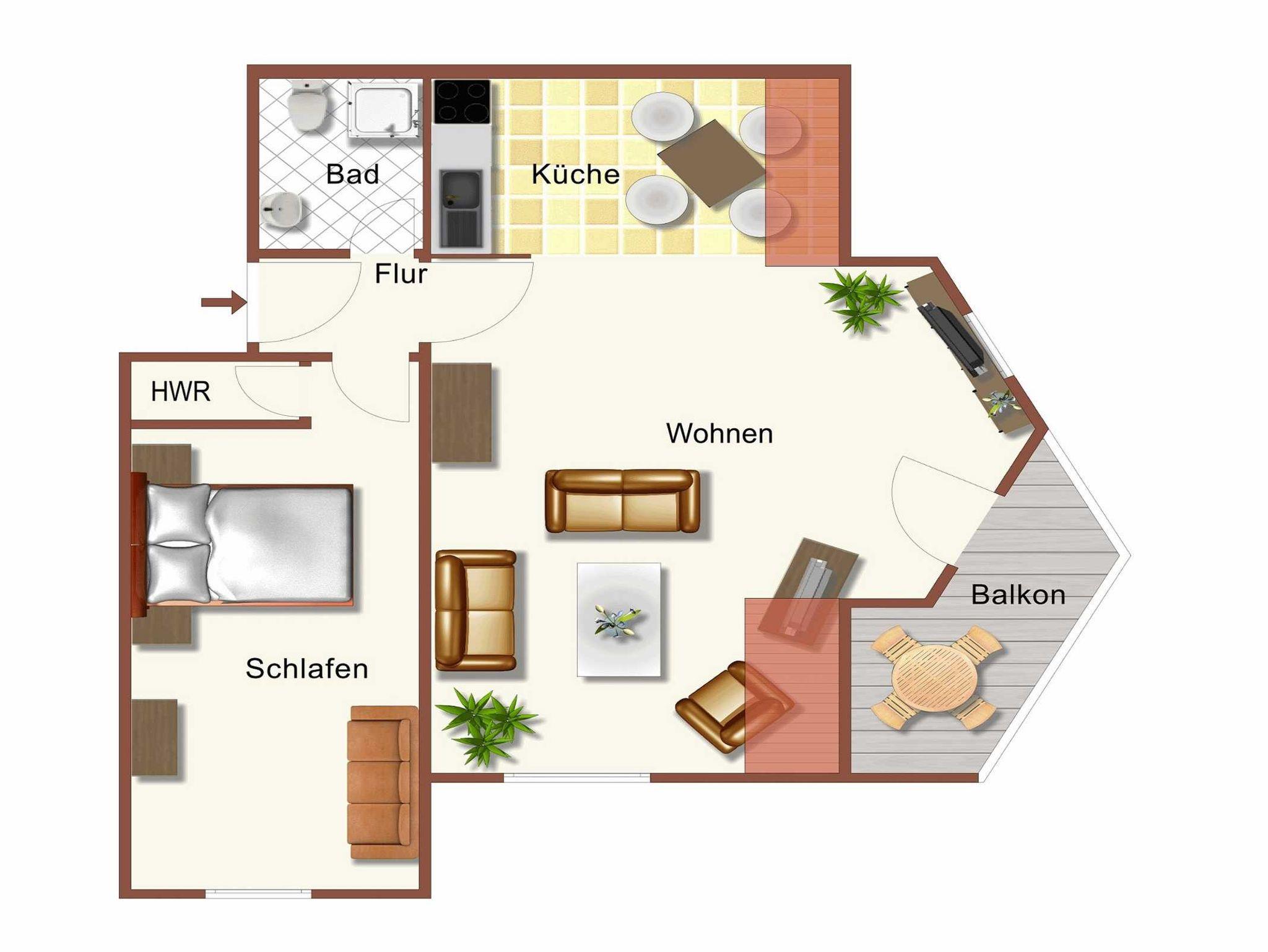 Die 2 Zimmer Dachgeschoss-Wohnung verfügt über 1 Schlafzimmer mit Doppelbett und Schlafsofa, 1 Wohnzimmer mit Balkon und offener Küche, sowie Bad mit Dusche.