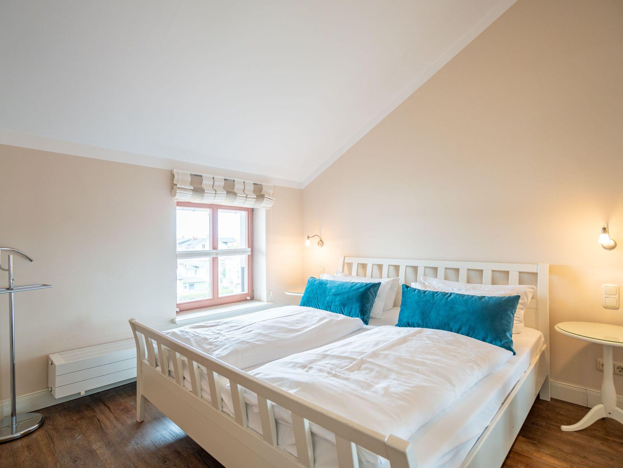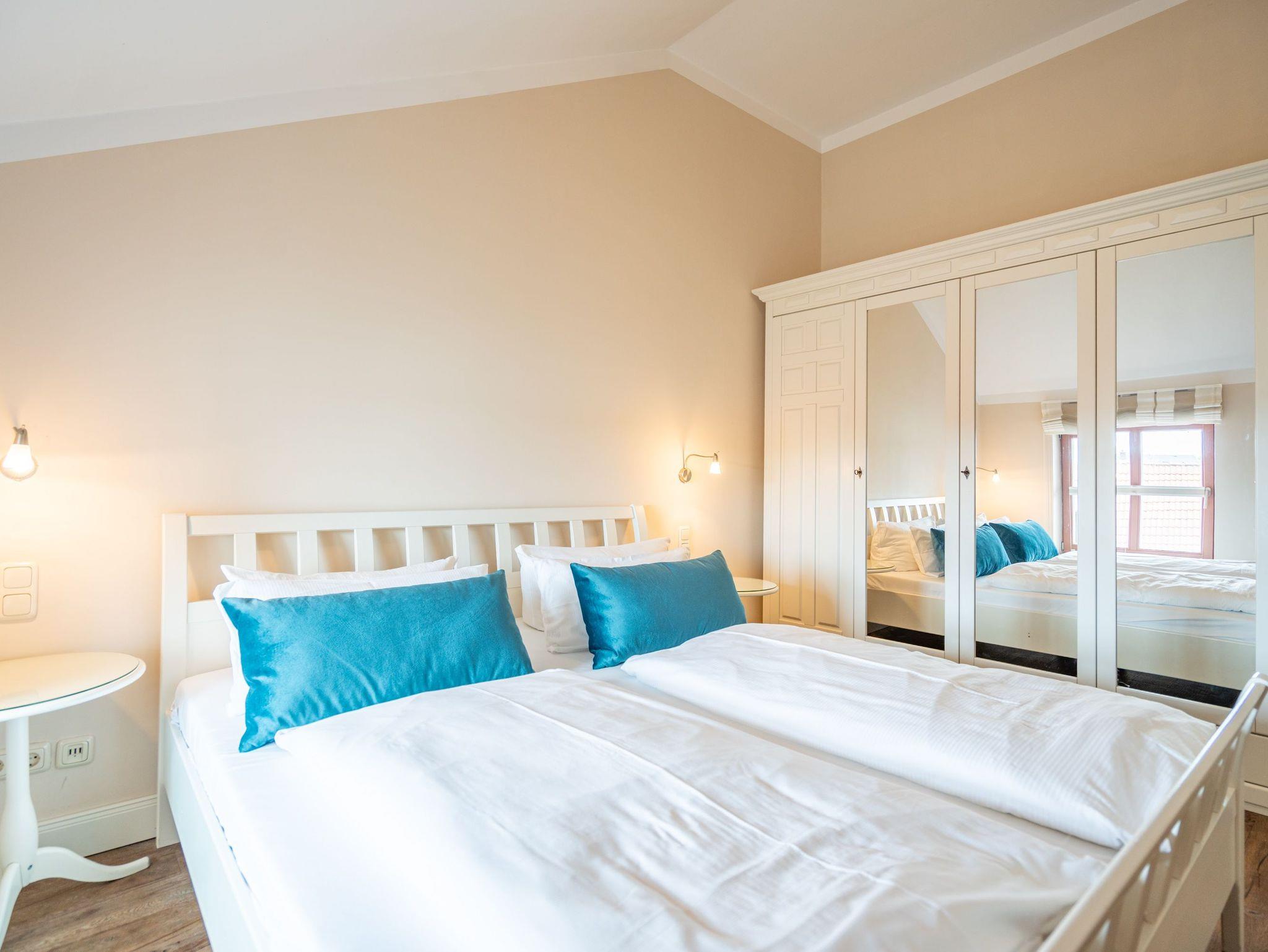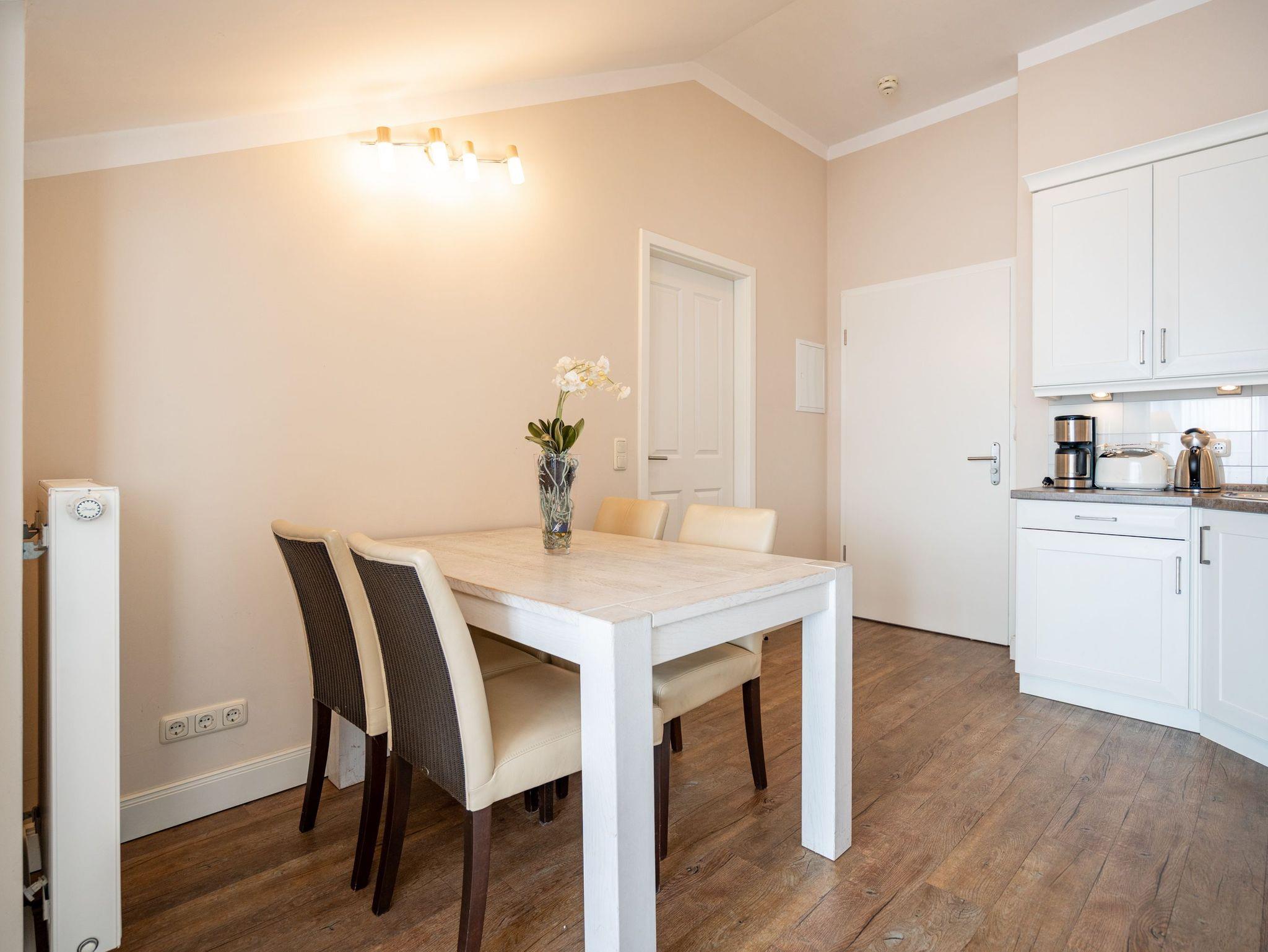 Moderner Landhausstil, stilvolle Dekorationen und ein lichtdurchfluteter Wohnbereich - herzlich Willkommen in der Ferienwohnung 13 des Autorenhauses. Hier werden Sie sich von Beginn an, wie zu Hause fühlen. Im Wohnbereich relaxt man vor dem Kamin, von hier hat man Zugang zum umlaufenden, großzügigen Balkon, der ab mittags Sonne verspricht. Das Schlafzimmer ist mit einem Doppelbett (1,80m x 2m) eingerichtet und bietet Platz für 2 Erwachsene und 1 Kleinkind (bis 3 Jahre) im Reisebett. Und die integrierte Küche ist komplett ausgestattet. Ergänzt wird die Wohnung durch ein modernes Bad mit Dusche. Auf Wunsch stellen wir für unsere kleinen Gäste ein Kinderreisebett (ohne zusätzliche Matratze [&] Bettzeug) und einen Kinderhochstuhl ( gegen einen Aufpreis) zur Verfügung. Für Ihren Komfort sind die Betten bei der Anreise bezogen und Handtücher liegen bereit. Im Keller des Hauses stehen eine Waschmaschine und ein Trockner gegen Gebühr zur Verfügung. Bei diesem Appartement besteht die Möglichkeit es mit dem Nachbarappartement 14 zu kombinieren. Durch einen gemeinsam nutzbaren Vorflur entsteht auf Wunsch aus beiden Wohnungen ein großes Urlaubsdomizil mit 2 Schlafzimmern.