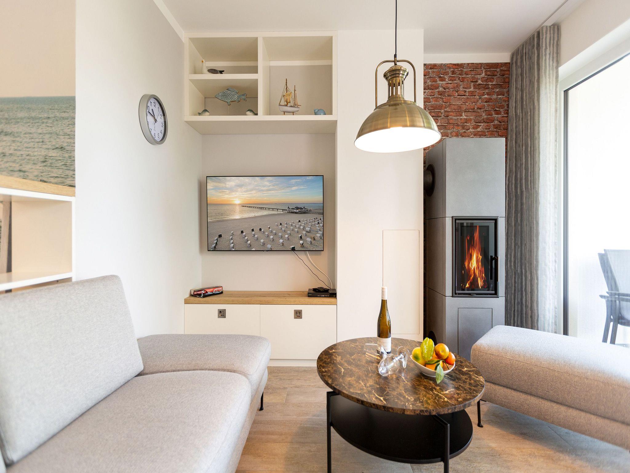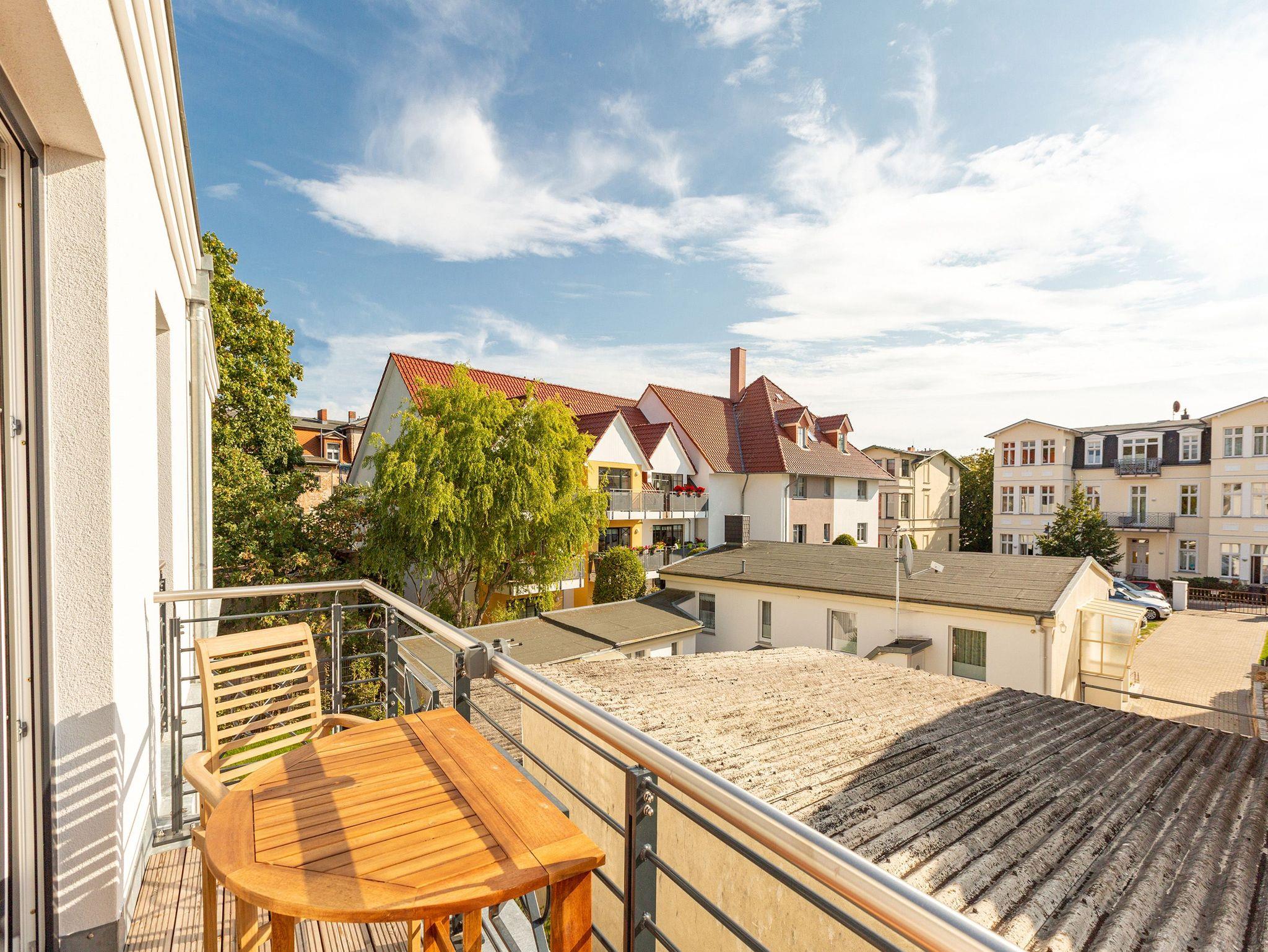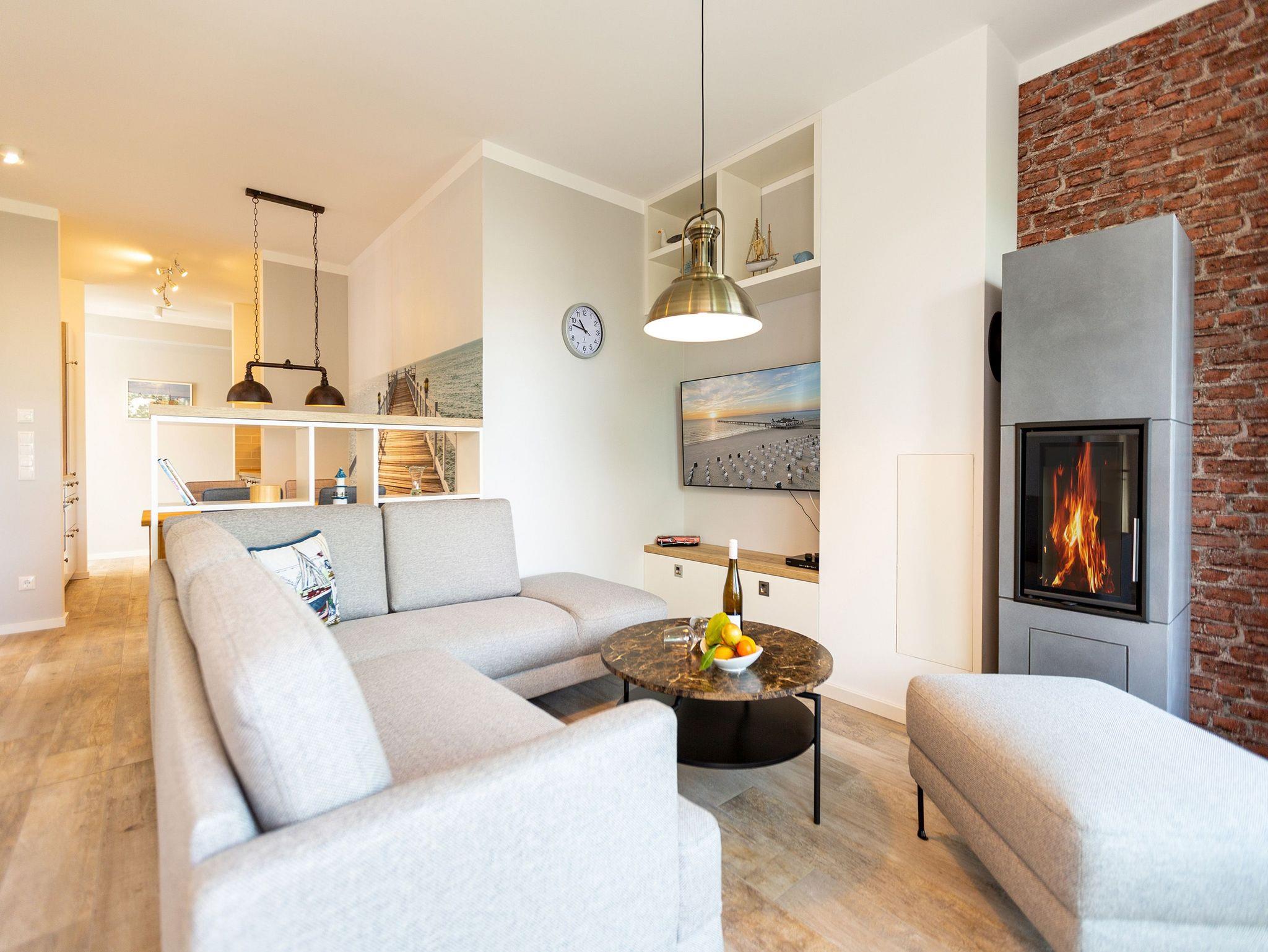 Maritimes Drei-Zimmer-Apartment in Ahlbeck mit Sauna, Kamin und zwei Balkonen, nur 300 Meter vom Ostseestrand entfernt.