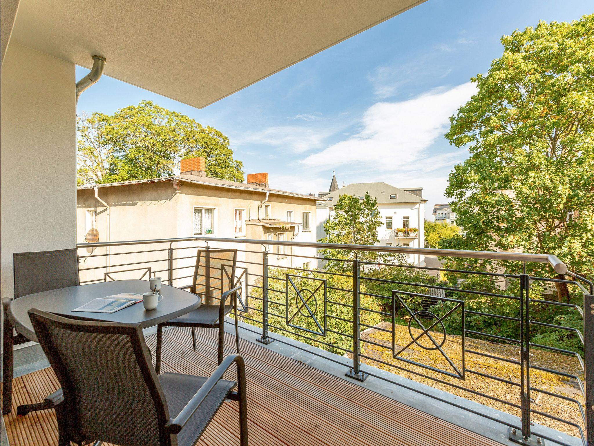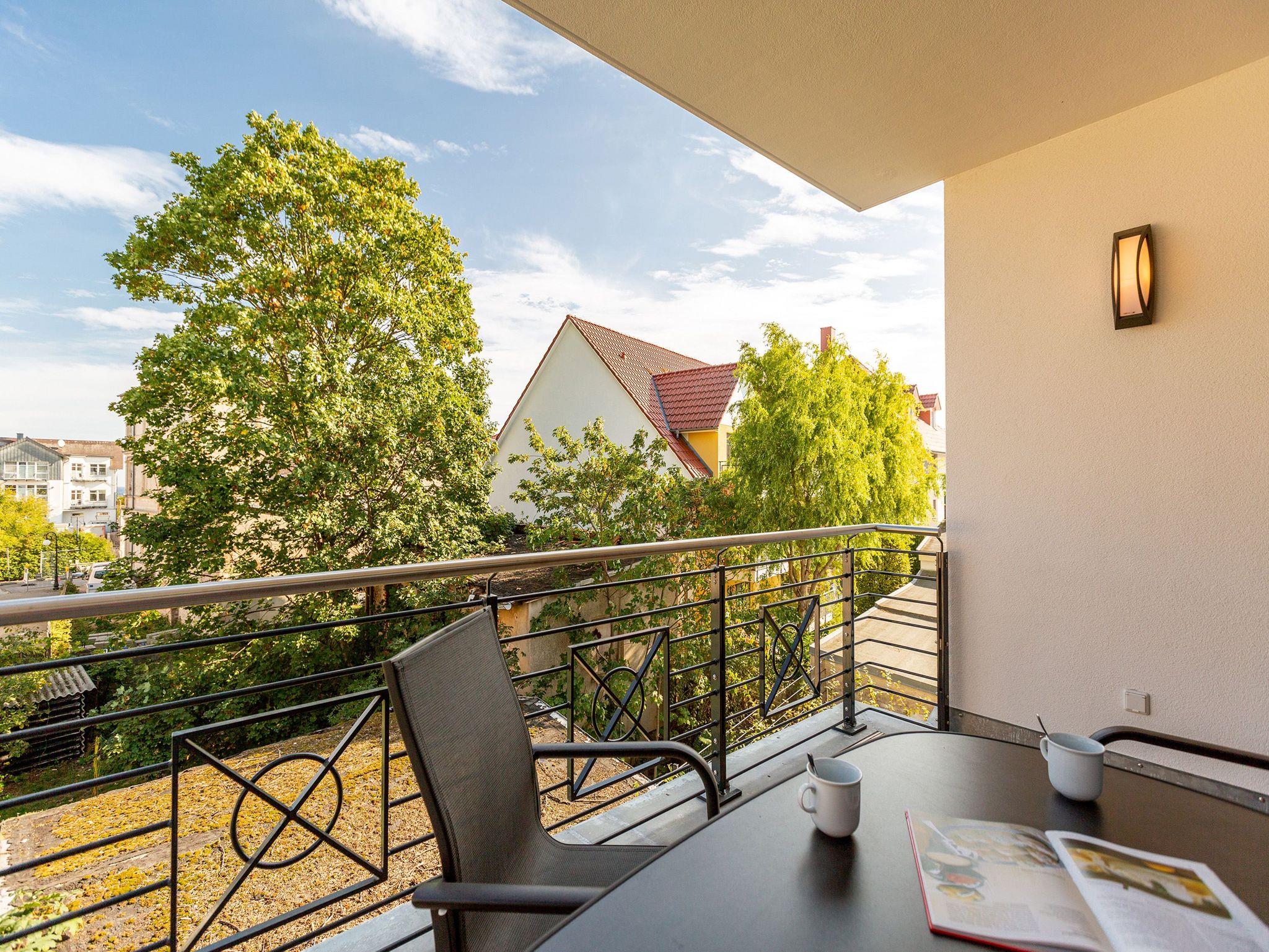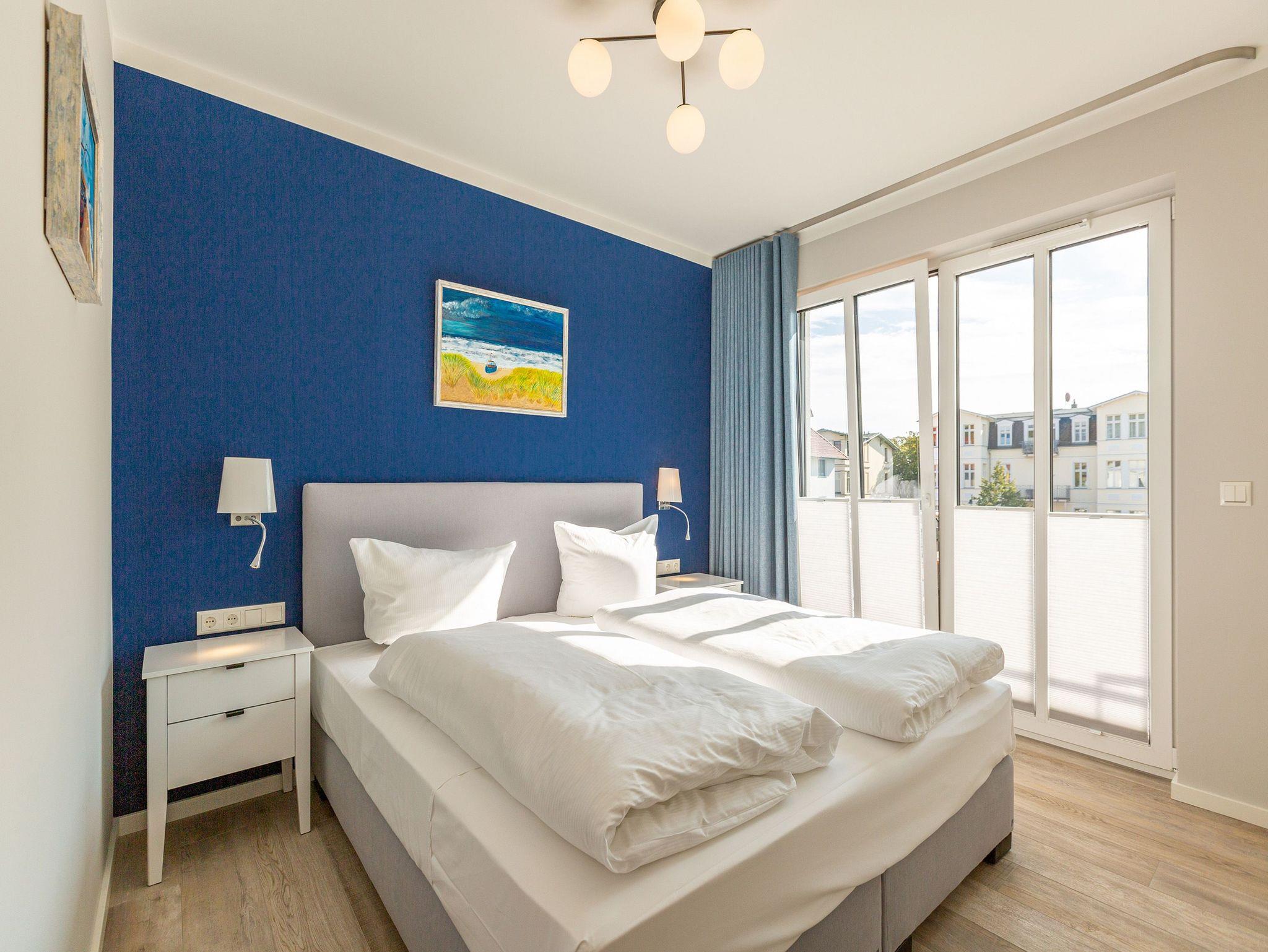 Maritimes Drei-Zimmer-Apartment in Ahlbeck mit Sauna, Kamin und zwei Balkonen, nur 300 Meter vom Ostseestrand entfernt.