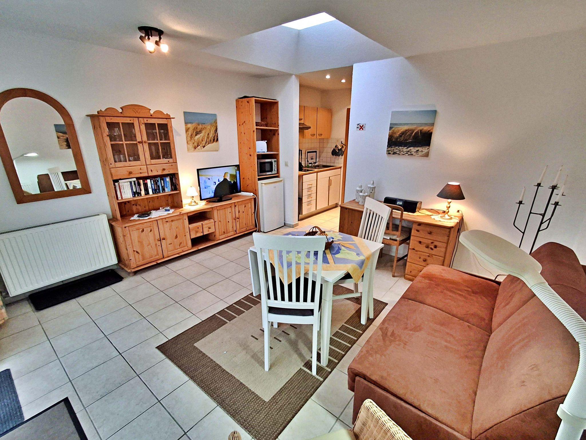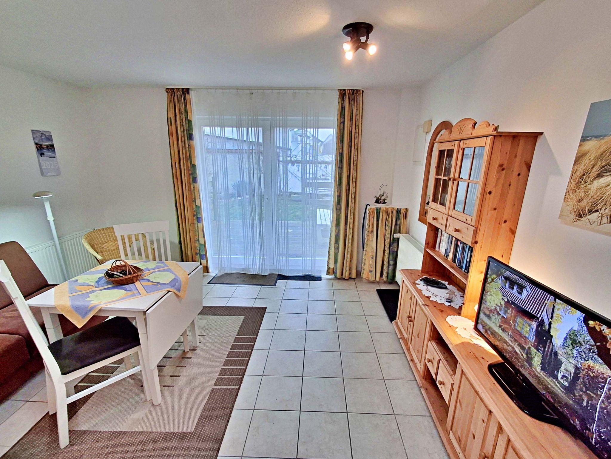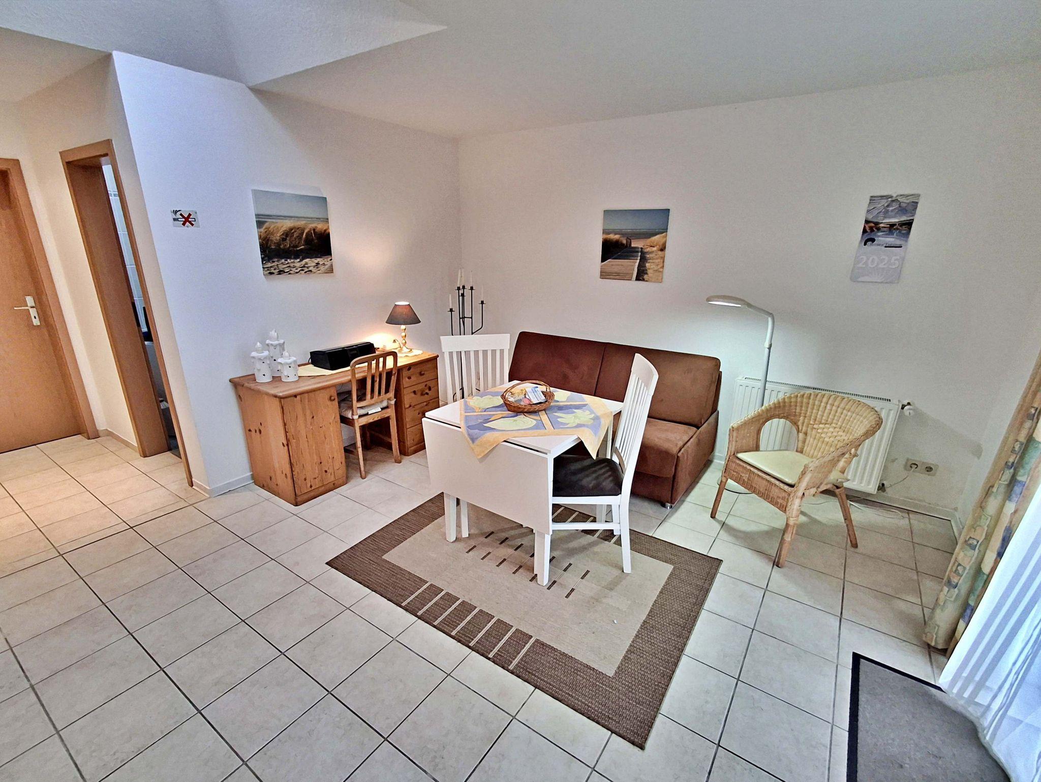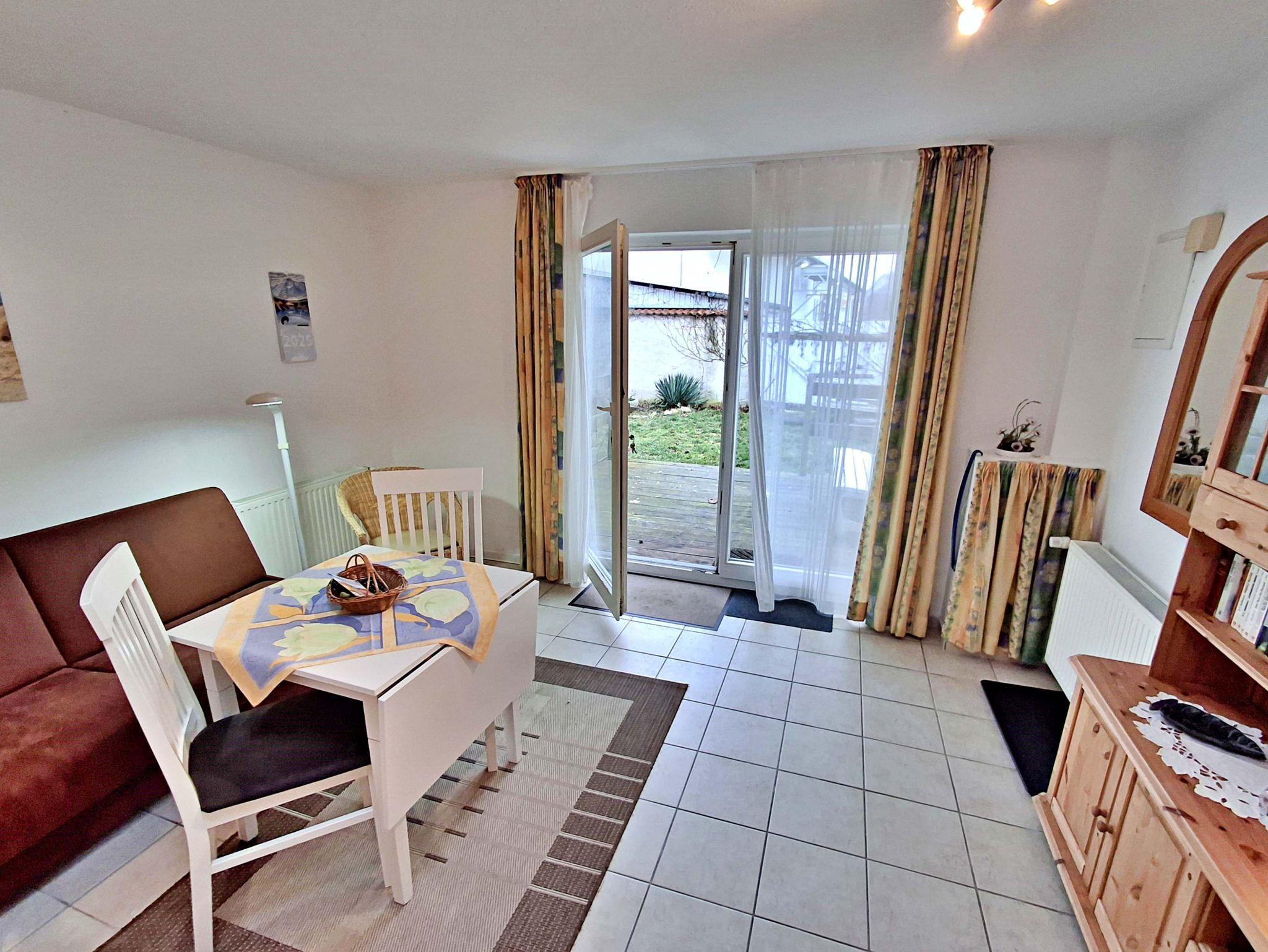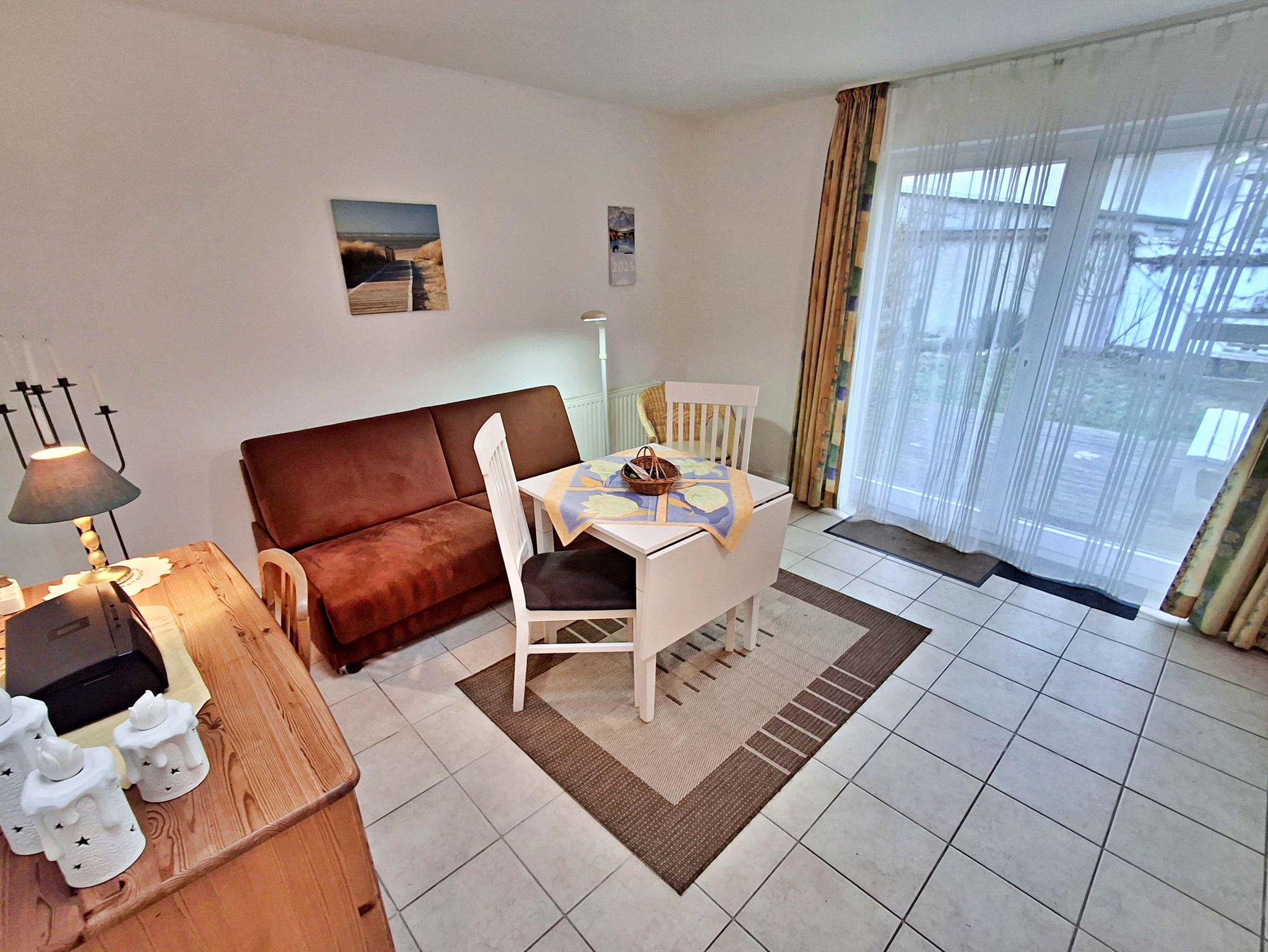 Diese helle und freundliche 40qm große 2-Raum-Ferienwohnung im Erdgeschoss verfügt über einen kombinierten Wohn- und Schlafraum (Schlafcouch für max. 1 Kind bis acht Jahre) mit Kabel-TV und Radio sowie ein Schlafzimmer mit einem Doppelbett. Die Küchenzeile ist mit 2-Felder-Ceran-Herd, Kühlschrank, Mikrowelle, Kaffeemaschine, Toaster und Geschirr ausgestattet. Das Badezimmer hat Dusche und WC. Die Terrasse mit Sitzmöbeln lädt zum Verweilen ein und vervollständigt die Ausstattung der Wohnung. Ihren Pkw können Sie gern an der Ferienwohnung parken (nicht für Kleinbusse und Anhänger geeignet).