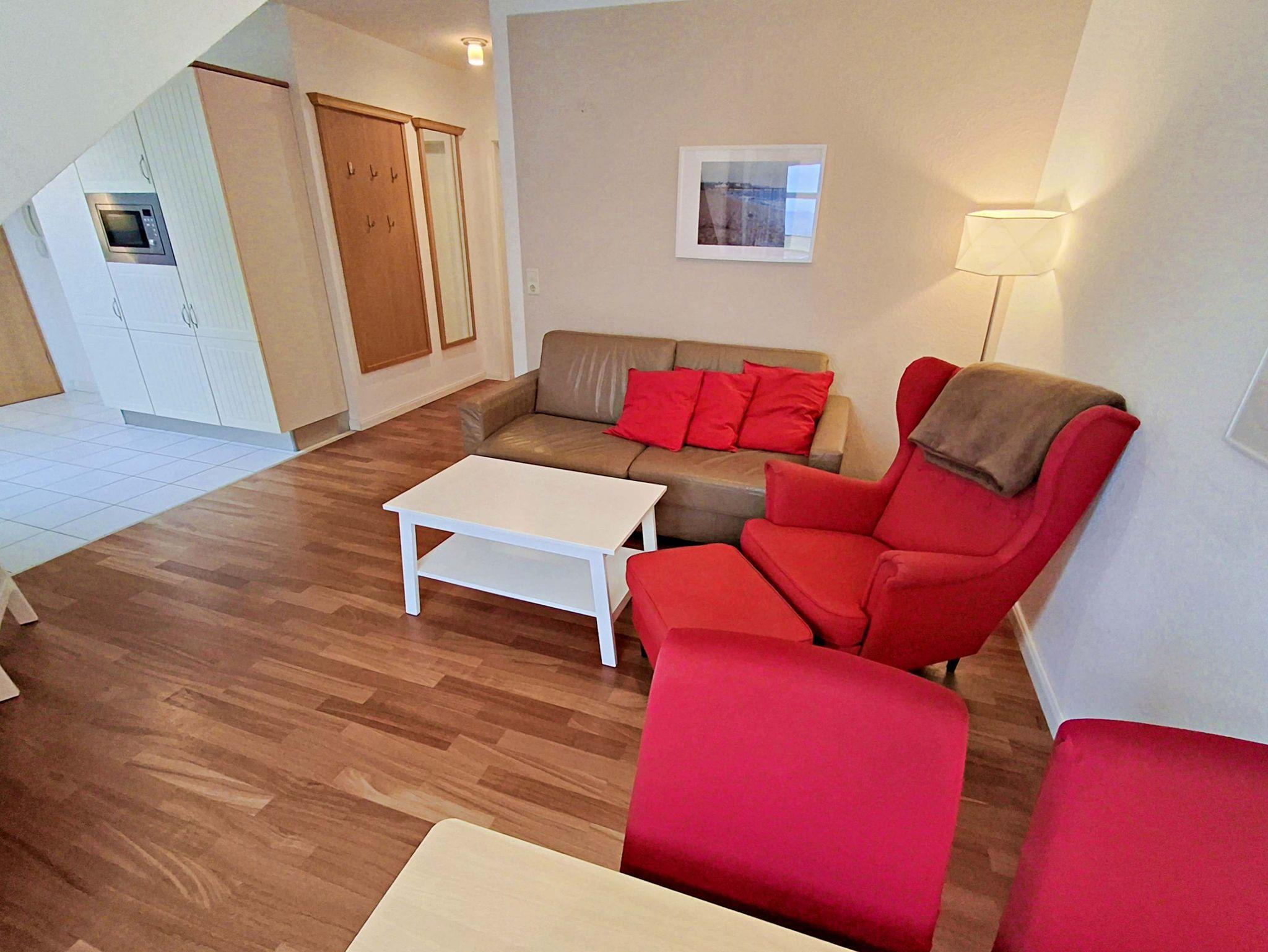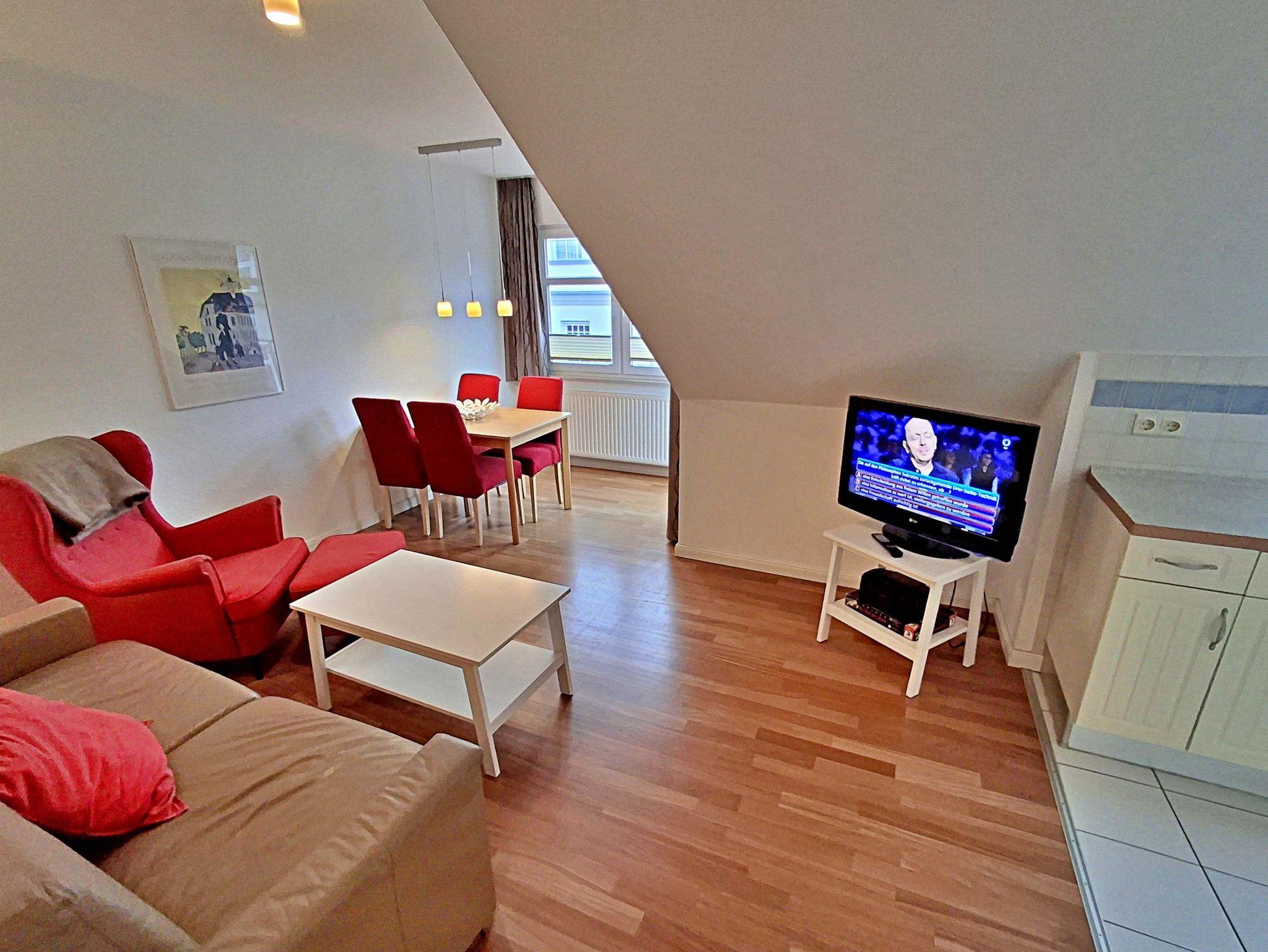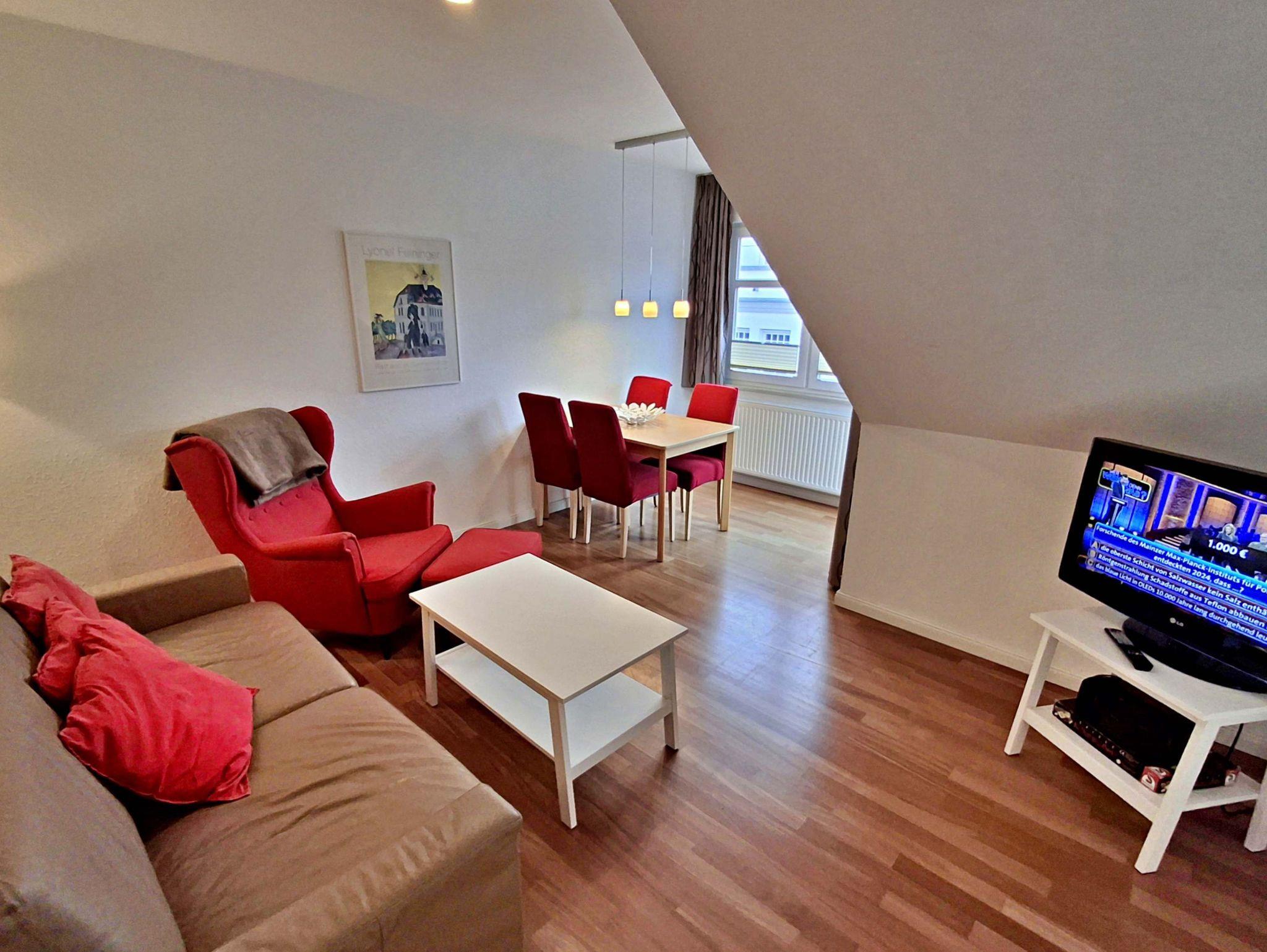 Die charmante 2-Zimmer-Wohnung Perlmuschel mit Balkon in der 3. Etage für max. 3 Erwachsene und 1 Kind bis 14 Jahre befindet im Nebengebäude der stilvoll restaurierten Villa Ahlbeck - nur wenige Schritte von der Promenade und dem Strand entfernt. Im Wohnbereich befinden sich neben der Couch auch ein Sessel mit passendem Fußhocker sowie ein Esstisch mit 4 Stühlen, der genügend Platz für 4 Personen bietet. Das Highlight der Wohnung ist der Balkon in Nord-Ost-Ausrichtung, wo Sie bei schönem Wetter bereits morgens Ihren Kaffee genießen können, während Sie einen Blick auf die Ostsee erhaschen. Die moderne Küchenzeile mit Ceranherd, Backofen, Geschirrspüler, Mikrowelle, Kaffeemaschine, Wasserkocher und Toaster lässt keine Wünsche offen. Für die Unterhaltung sorgen ein Flachbild-TV, Radio-CD-Player und kostenfreies W-LAN. Das Schlafzimmer verfügt über ein Doppelbett und das Badezimmer hat DU/WC.