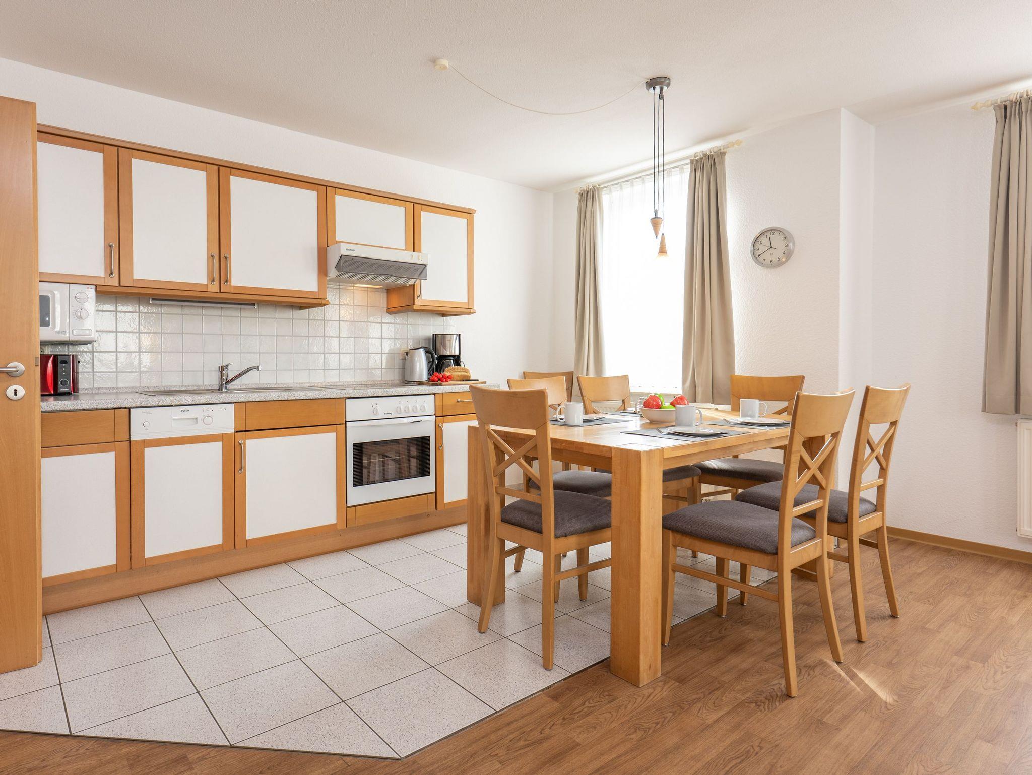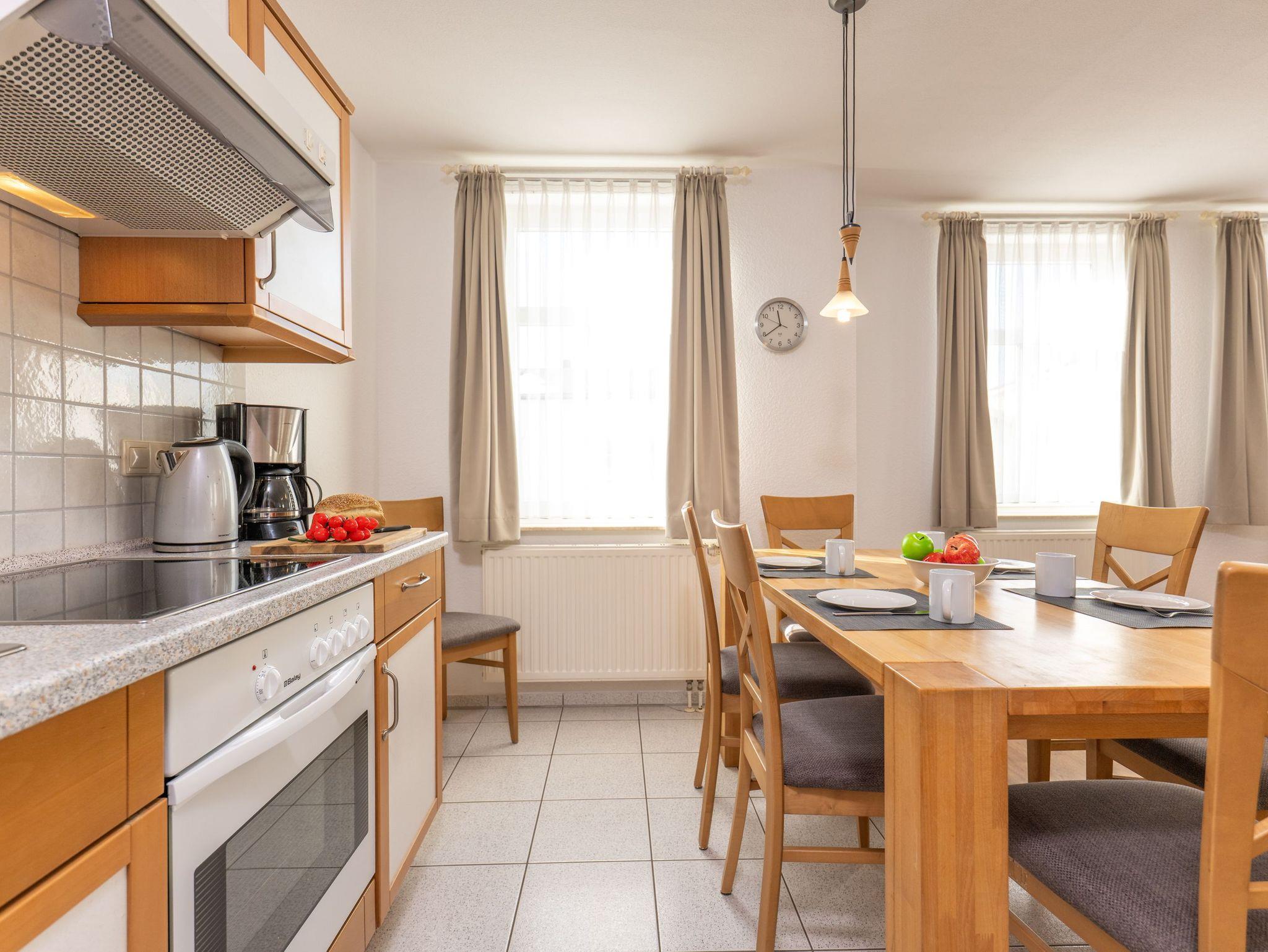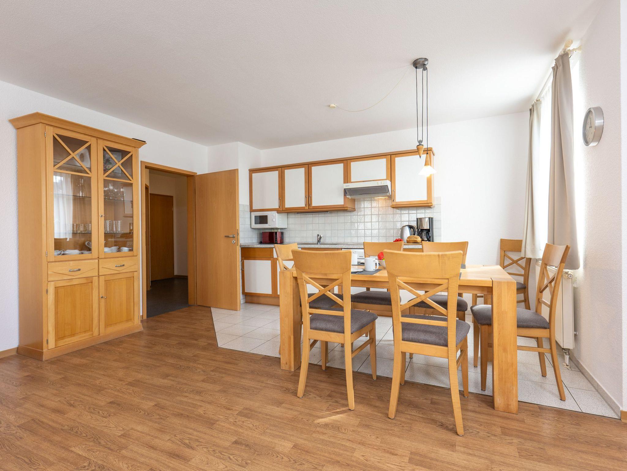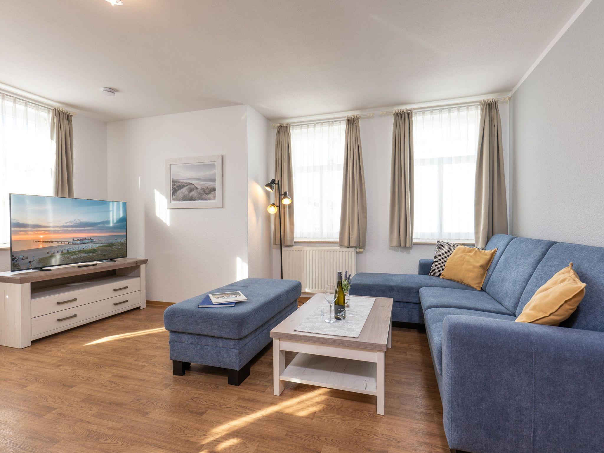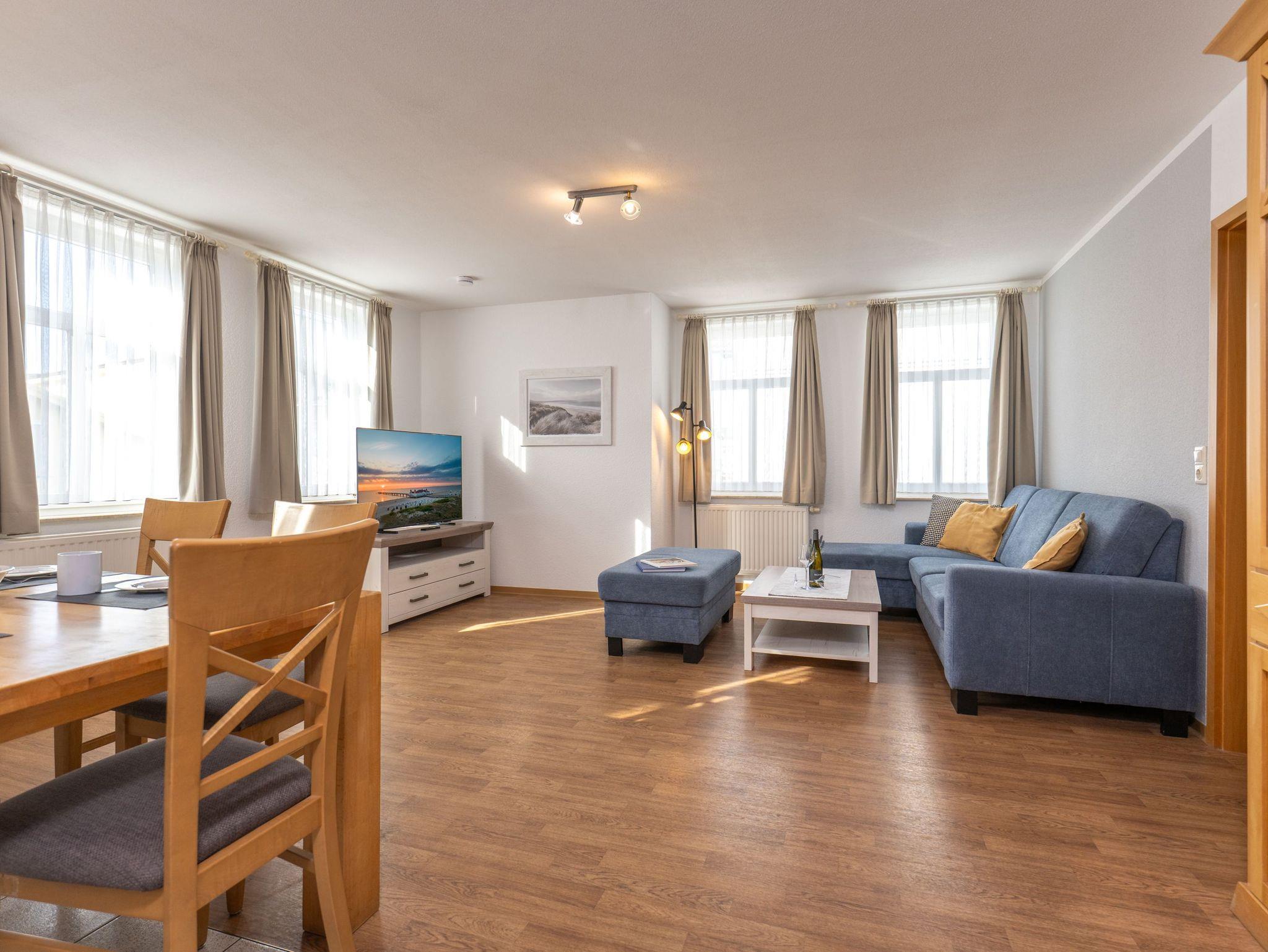 Wohnbereich: gemütliches, helles Wohnzimmer mit großem TV und angrenzendem Essbereich sowie voll ausgestatteter Küchenzeile