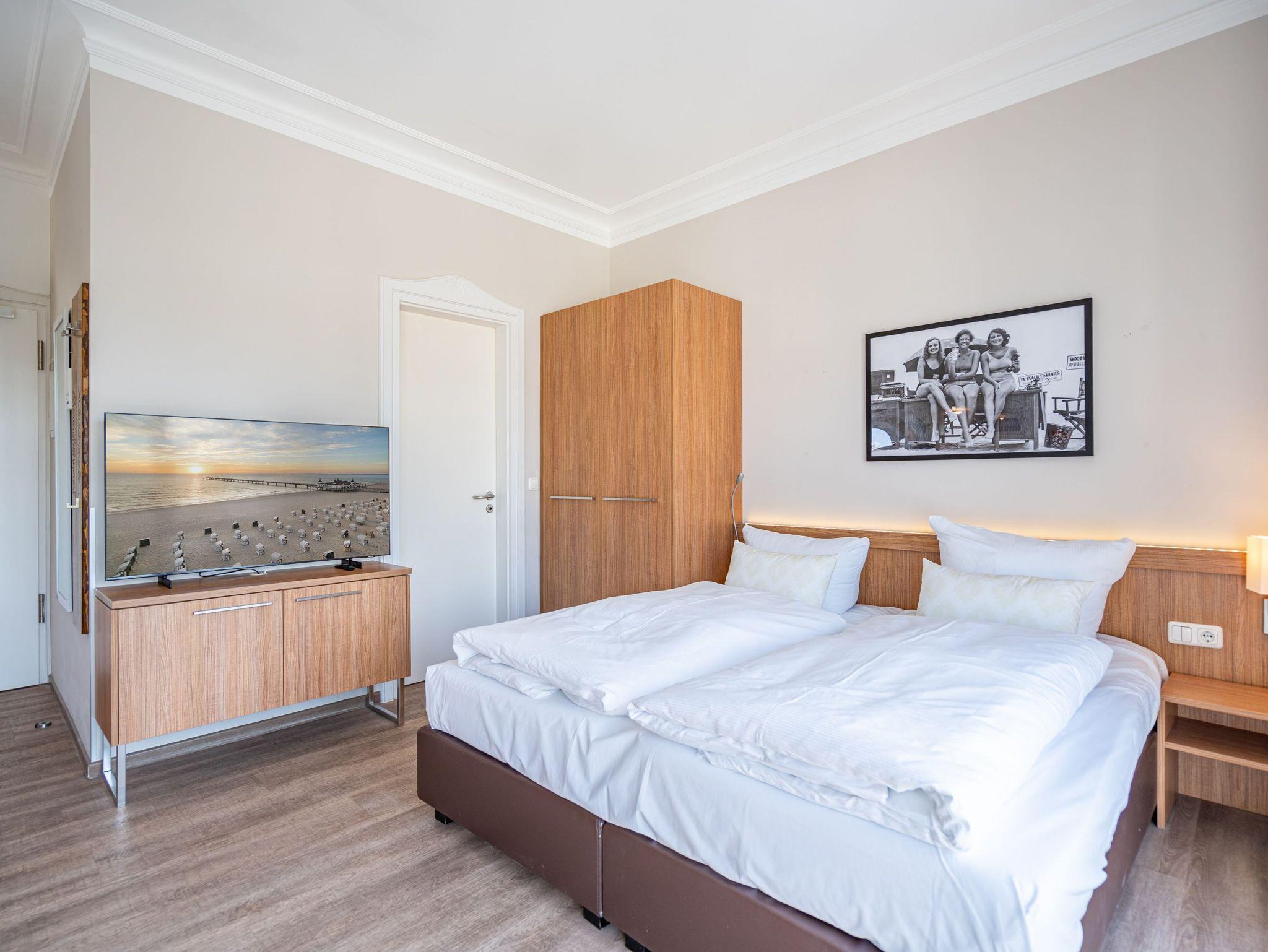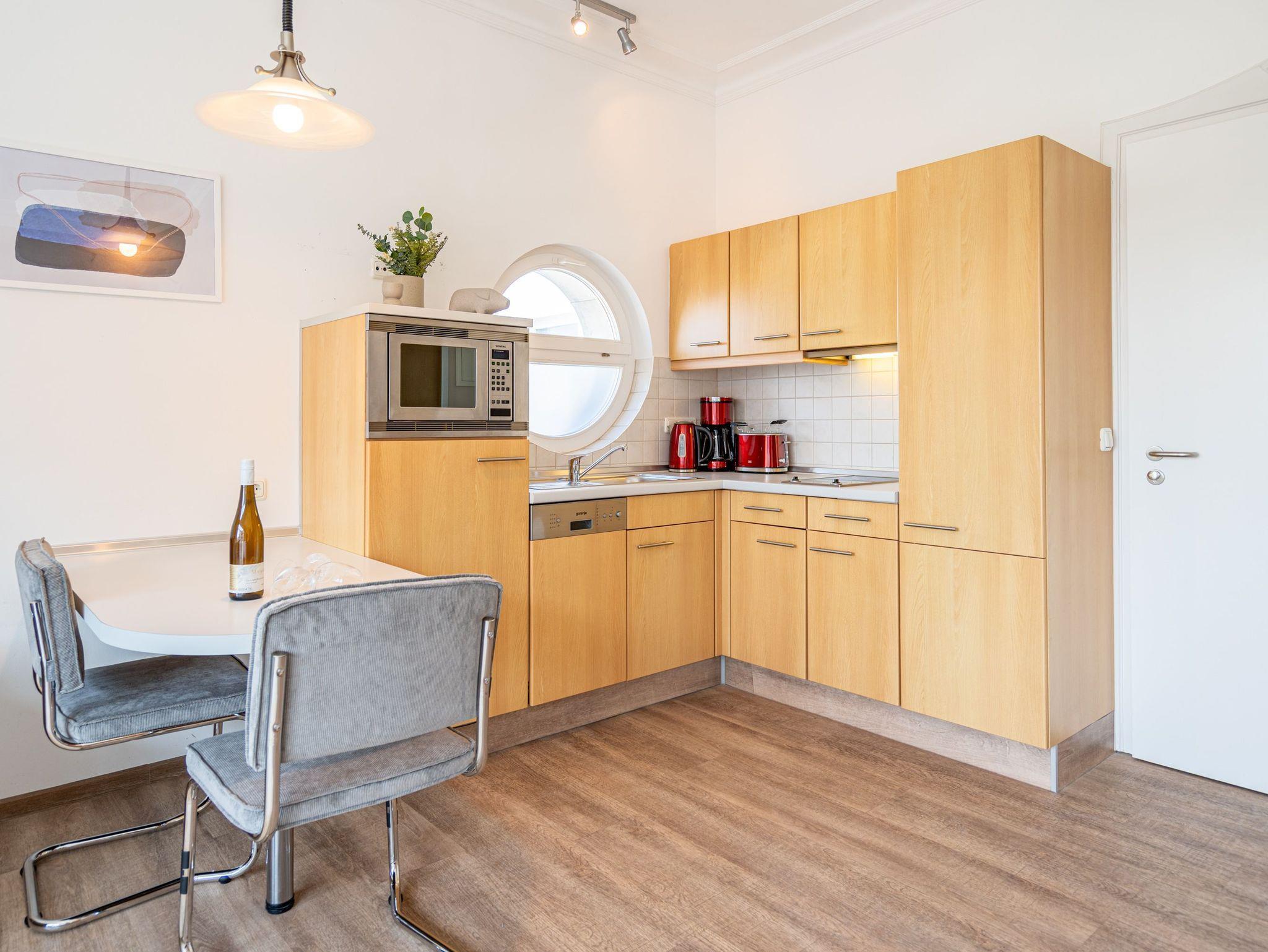 Die 1-Raum-Ferienwohnung Nr. C09 in der Villa Seedüwel bietet auf 35 qm komfortablen Platz für zwei Personen und befindet sich im Dachgeschoss. Der offene Wohnbereich ist mit einer Küchenzeile ausgestattet, die ein 2-Platten-Cerankochfeld, eine Mikrowelle und einen Kühlschrank mit Gefrierfach umfasst. Ein Essplatz für zwei Personen, eine gemütliche Sitzgruppe und ein Flat-TV sorgen für Komfort. Das Doppelbett (1,80 m x 2,00 m) befindet sich ebenfalls im Wohnbereich und wird durch eine Kommode sowie einen Kleiderschrank ergänzt. Von hier aus gelangen Sie auf den sonnigen Süd-West-Balkon. Das Tageslicht-Bad verfügt über eine Dusche, ein Waschbecken und ein WC. Ein Stellplatz in der Tiefgarage ( Einfahrthöhe 2,03m) des benachbarten Hauses „Strandterrasse“ ist für Sie reserviert. WLAN steht Ihnen kostenfrei zur Verfügung.