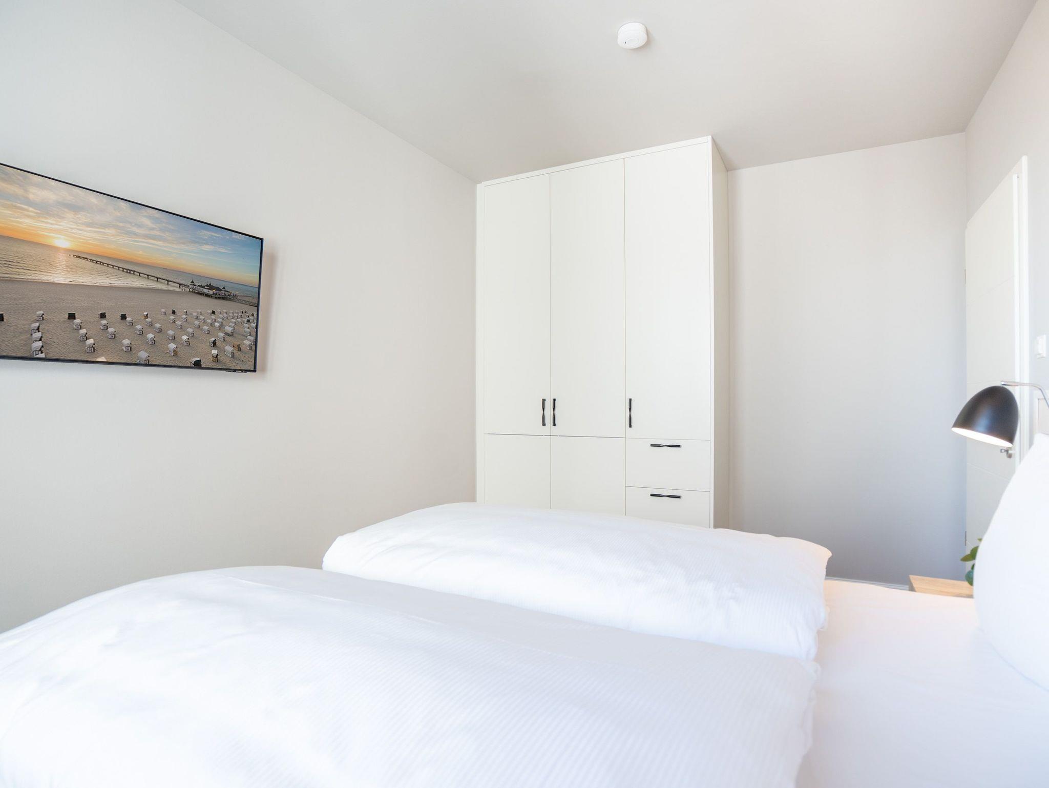 Drei helle, komfortable Räume warten im Appartement B 3.2 (Haus B) in der 3. Etage der Strandterrasse nur auf Ostseesehnsüchtige mit einer Vorliebe für ein schönes Zuhause und für Meerblicke. Auch wenn es nur auf Zeit ist. Die 76 Quadratmeter große Wohnung ist für 4 Personen das ideale Urlaubsdomizil mit Meerblick. Und was für einer! Von den zwei Balkonen, über die das Appartement verfügt, können Sie morgens, mittags und abends auf das unendliche Blau schauen. Ob beim Essen unter freiem Himmel oder beim Relaxen auf der Sonnenliege: Das Rauschen der Wellen ist hier ganz nah. Dazu bietet das Innere der Wohnung allen Komfort und eine stylische Einrichtung. Die gemütliche Sitzgruppe aus Sofa und Sessel verspricht Entspannung beim Lesen, Chillen mit Blick auf den Elektrokamin (ohne Wärmeabgabe) oder bei spannenden Filmabenden vor dem großen Flat-TV (50 Zoll). Eine Working-Station ist ein funktionales Gimmick. Die zum Wohnzimmer hin offene Küche ist voll ausgestattet und mit hochwertigen Elektrogeräten wie einem Backofen, einem 4-Platten-Induktionsherd, einem Geschirrspüler und einer Nespresso-Kapselmaschine bestückt. An dem schönen Esstisch werden die Mahlzeiten zum kulinarisch vergnüglichen Erlebnis. Die Wohnung verfügt über zwei Schlafzimmer, in denen ein komfortables Boxspringdoppelbett (1,80m x 2,00m) süße Träume verspricht. In den Kleiderschränken ist viel Platz und jedes der Zimmer besitzt zusätzlich einen Flat-TV (43 Zoll). Eines der Schlafzimmer hat einen Zugang zum 2. Balkon. Der andere Balkon ist über das Wohnzimmer betretbar. Zwei moderne Badezimmer mit geräumiger Dusche, Waschtisch und WC komplettieren das Wohlfühlreich. Für Entspannung sorgt zudem in einem der beiden Bäder eine Infrarotsaunakabine. Mehr Behaglichkeit geht nicht. Parken Sie bequem auf dem zur Wohnung gehörenden PKW-Stellplatz in der Tiefgarage und genießen Sie die Auszeit in einer stilvollen Ferienwohnung mit hochwertiger Ausstattung und einem traumhaften Blick auf die Ostsee.