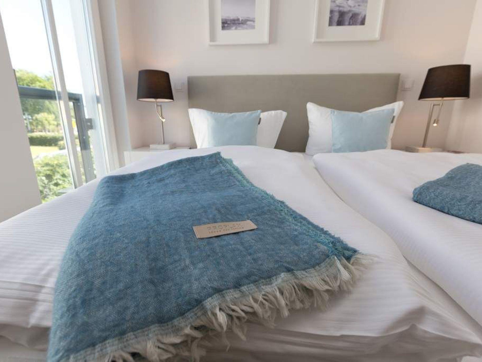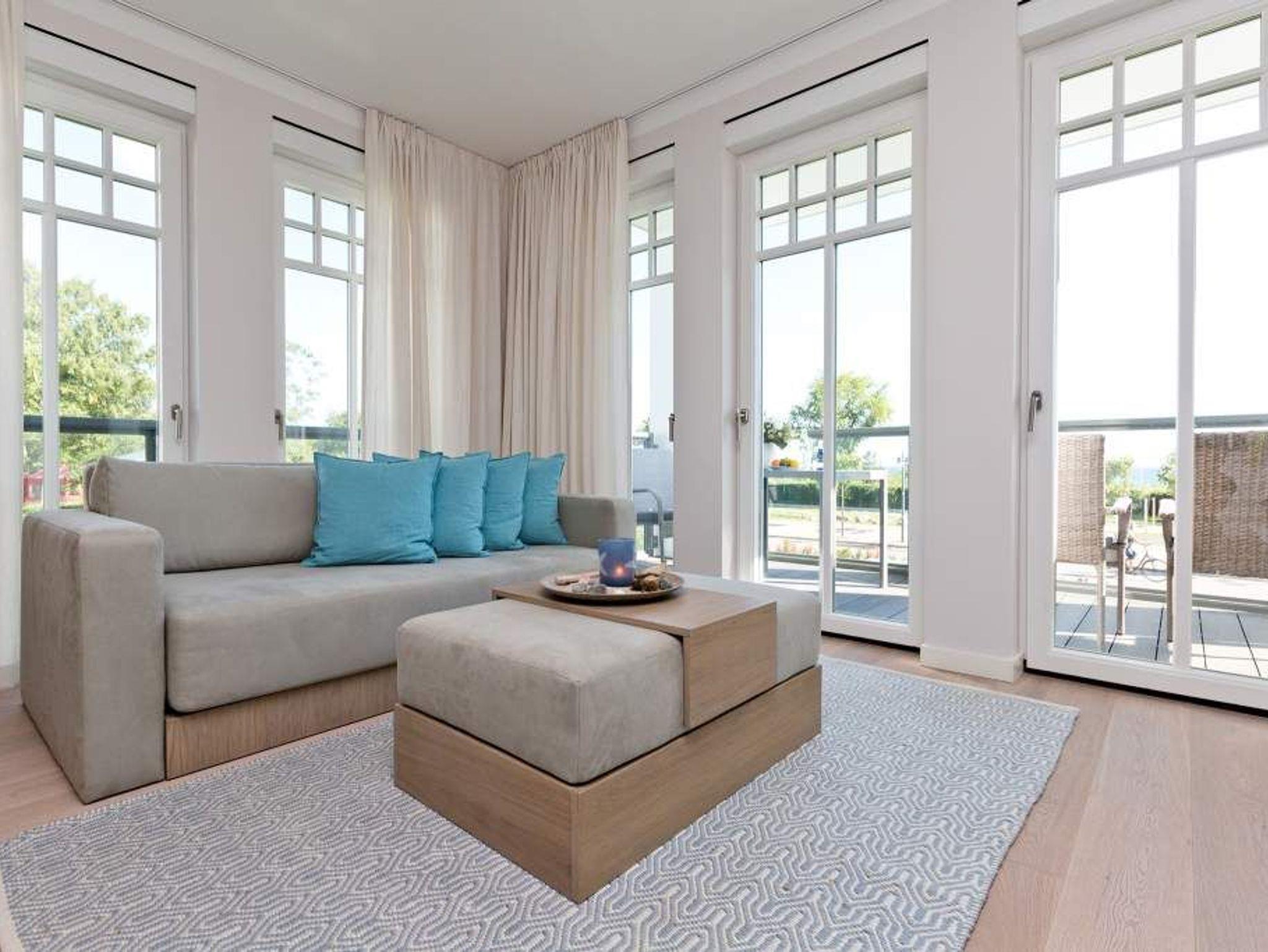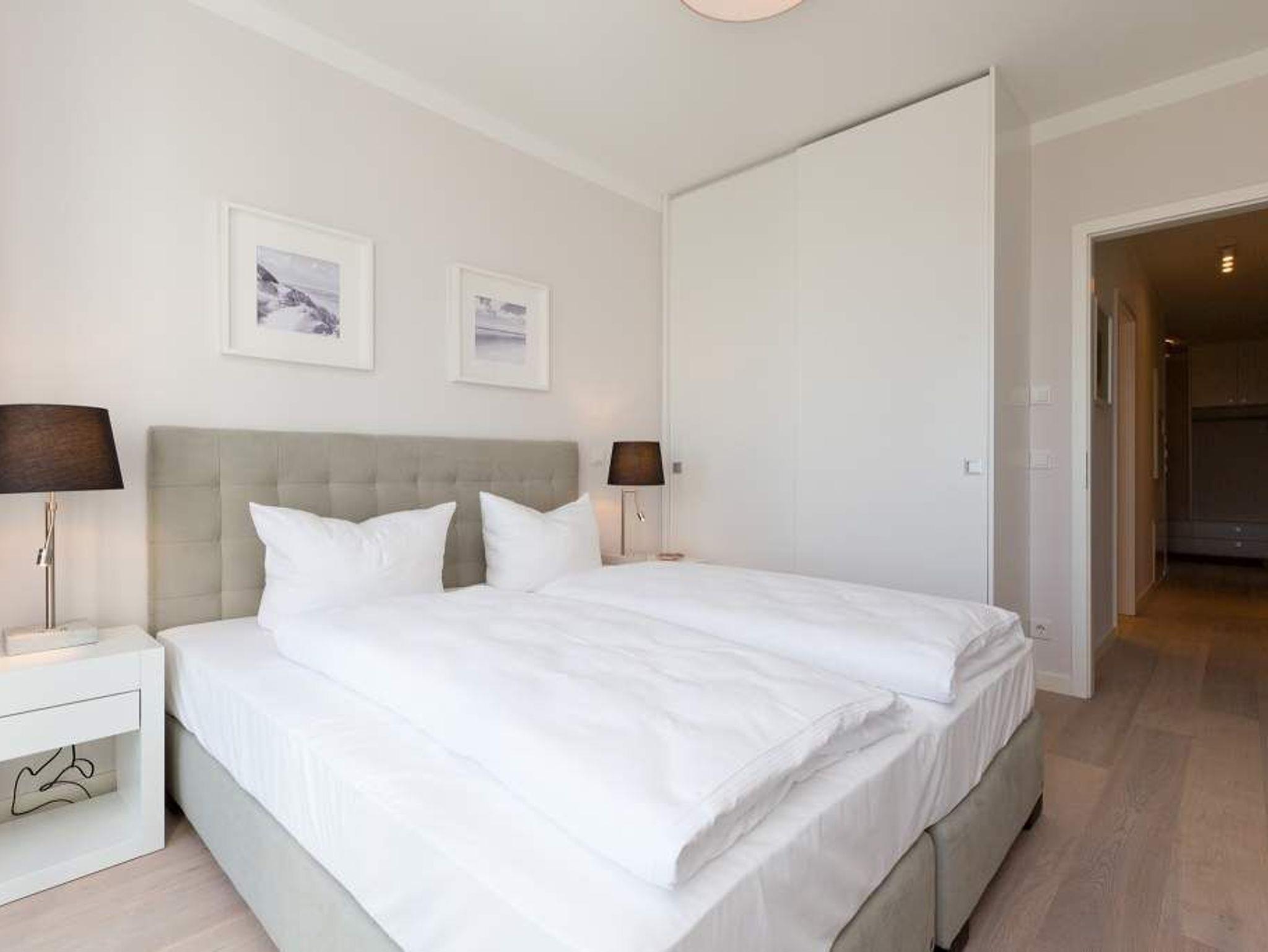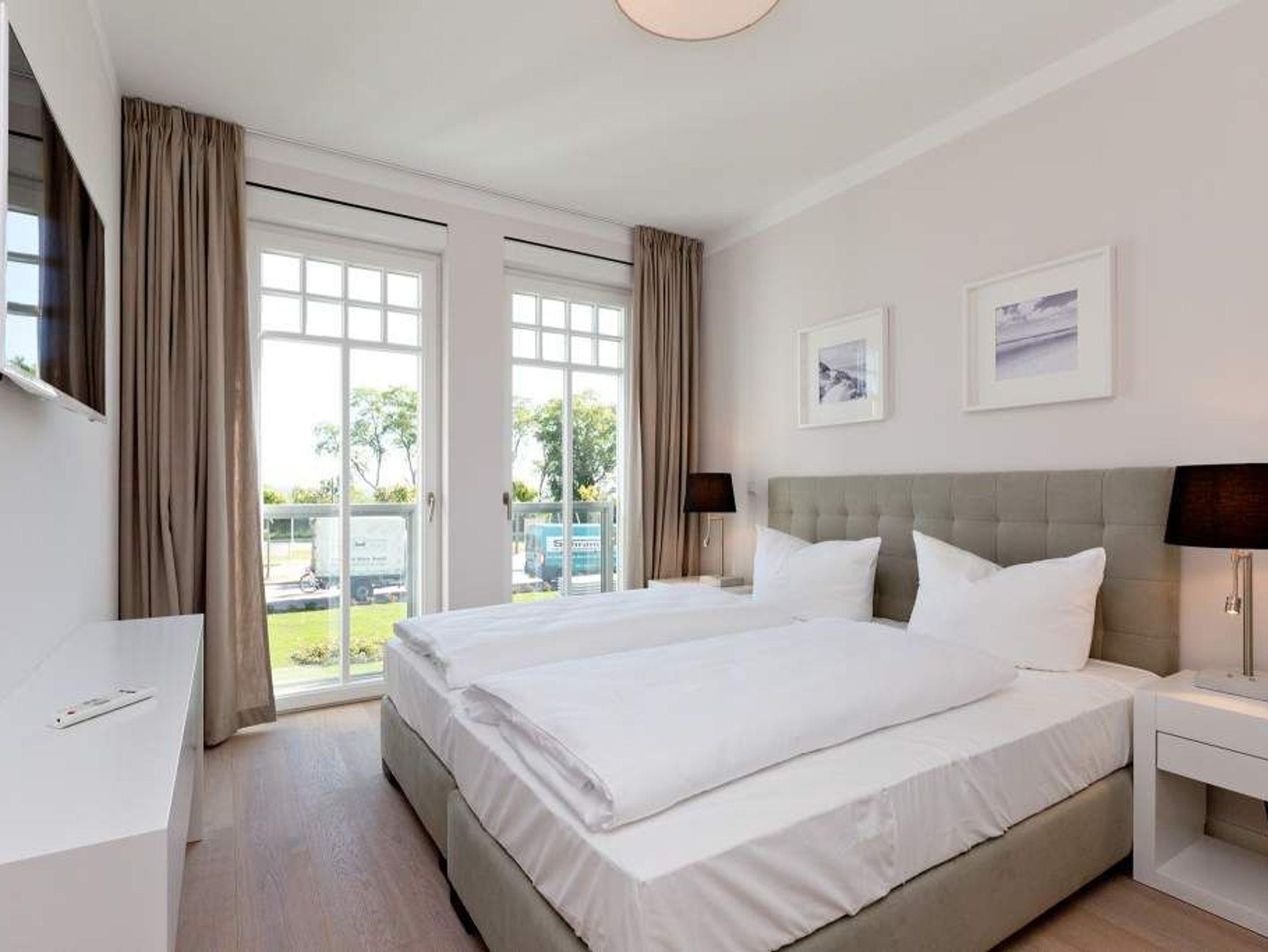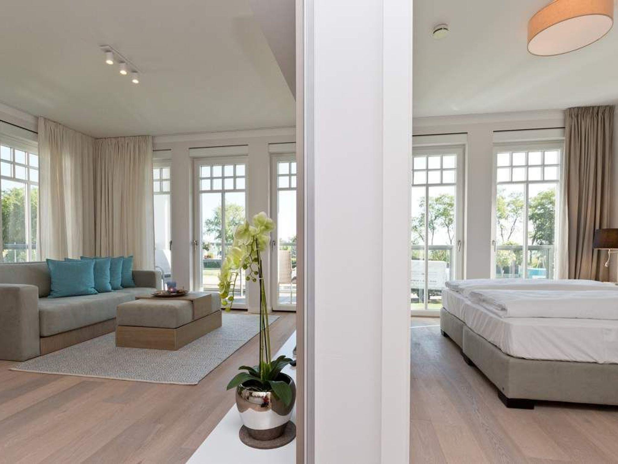 Die Freiheit ist Blau. Schon beim Aufwachen legt sich Ostseeweite in den Blick. 78 Quadratmeter Wohlfühlwelt bieten die 3 Räume der Wohnung Nummer 6 im ersten Obergeschoss der Villa Westend. Meerblick gibt es hier jedoch nicht nur aus einem der beiden Schlafzimmer. Auch der großzügige Wohnbereich mit offener Küche und angrenzendem Balkon wartet mit Weite bis an den Horizont auf. Eingerichtet vom Innenarchitekten mit eleganten Möbeln und stylischen Wohn-Accessoires sorgt das Appartement für Urlaubsgefühl pur. Highlight nicht nur im Winter ist der Elektro-Kamin. Kühle Abende werden damit zu wohligen Augenblicken. Zwei Schlafzimmer bieten in hochwertigen Boxspringdoppelbetten (1,80 m x 2,00 m) Platz für 4 Personen. Zum Verdunkeln können Außenjalousien heruntergelassen werden: hierbei handelt es sich lediglich um einen Sonnenschutz, der automatisch bei schlechtem Wetter einfährt und nicht um Außenjalousien. Alle drei Zimmer verfügen über Flat-TVs. Wie wäre es mit einem eigenen kleinen Spa-Bereich? Zwei Bäder mit exklusivem Baddesign, Tropendusche und einer Panorama-Sauna im Masterbad lassen den Urlaub zur Wellness-Auszeit werden. Und damit Sie sich wirklich um nichts kümmern müssen, liegen bereits Handtücher für Sie bereit und auch die Betten sind bezogen. Zu dieser Wohnung gehören 2 Stellplätze ( Nr. 26 [&] 27) in der Tiefgarage.