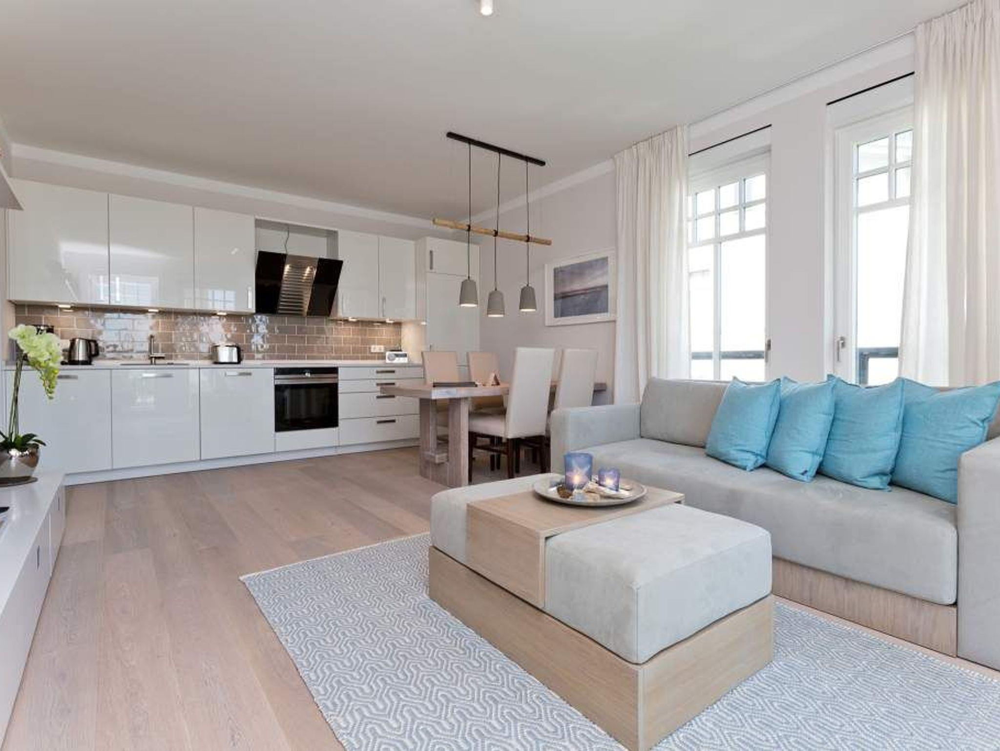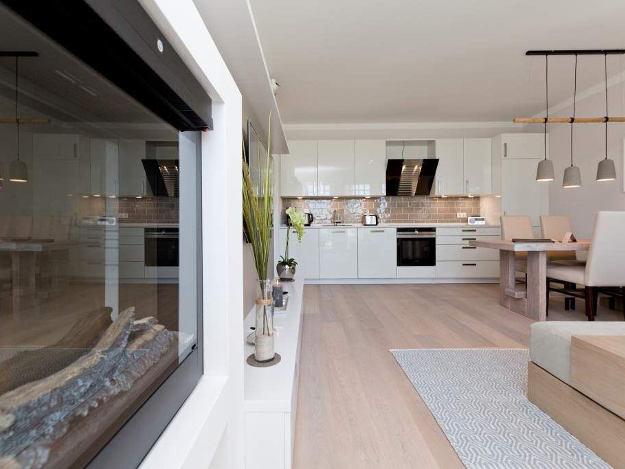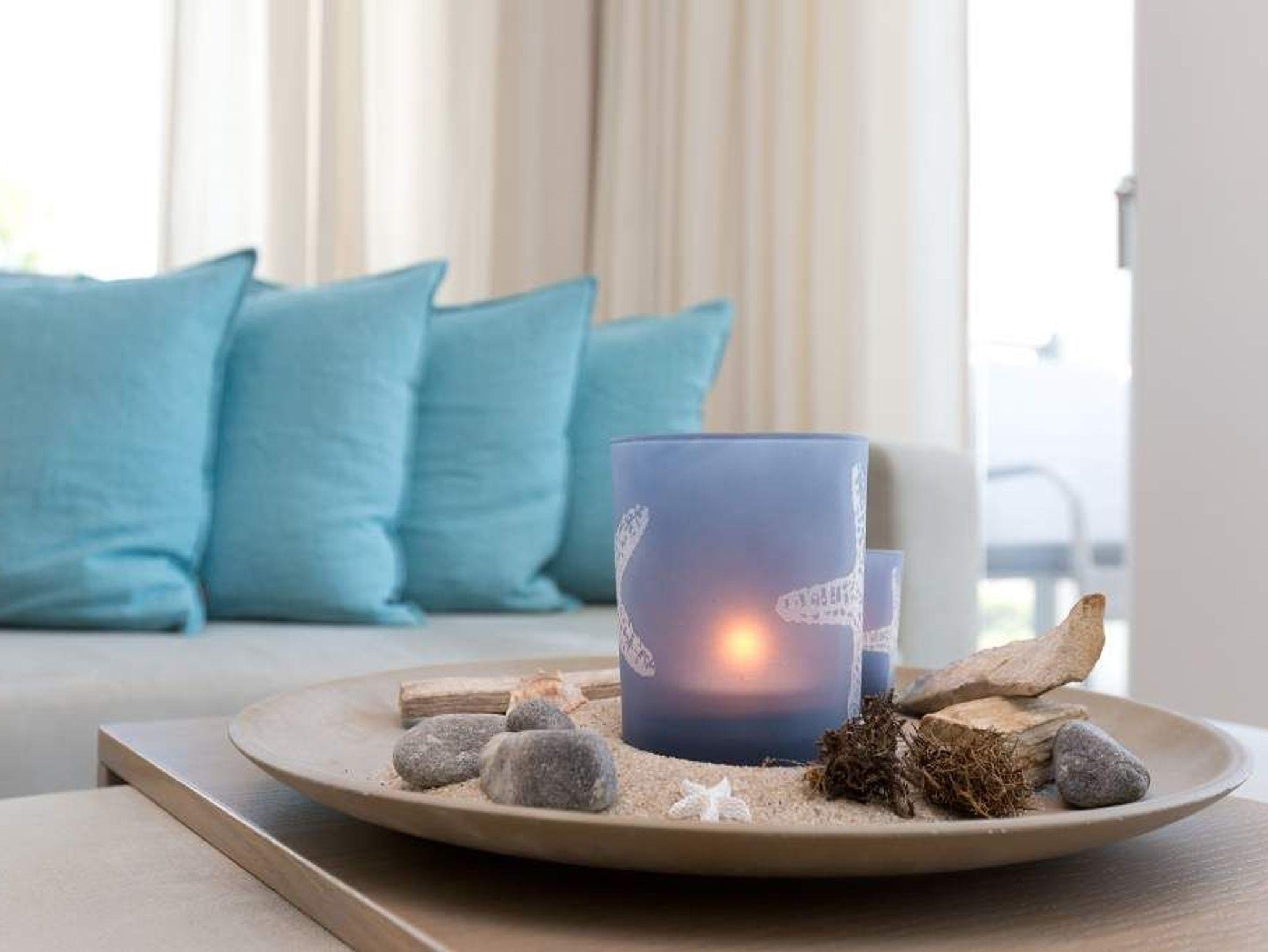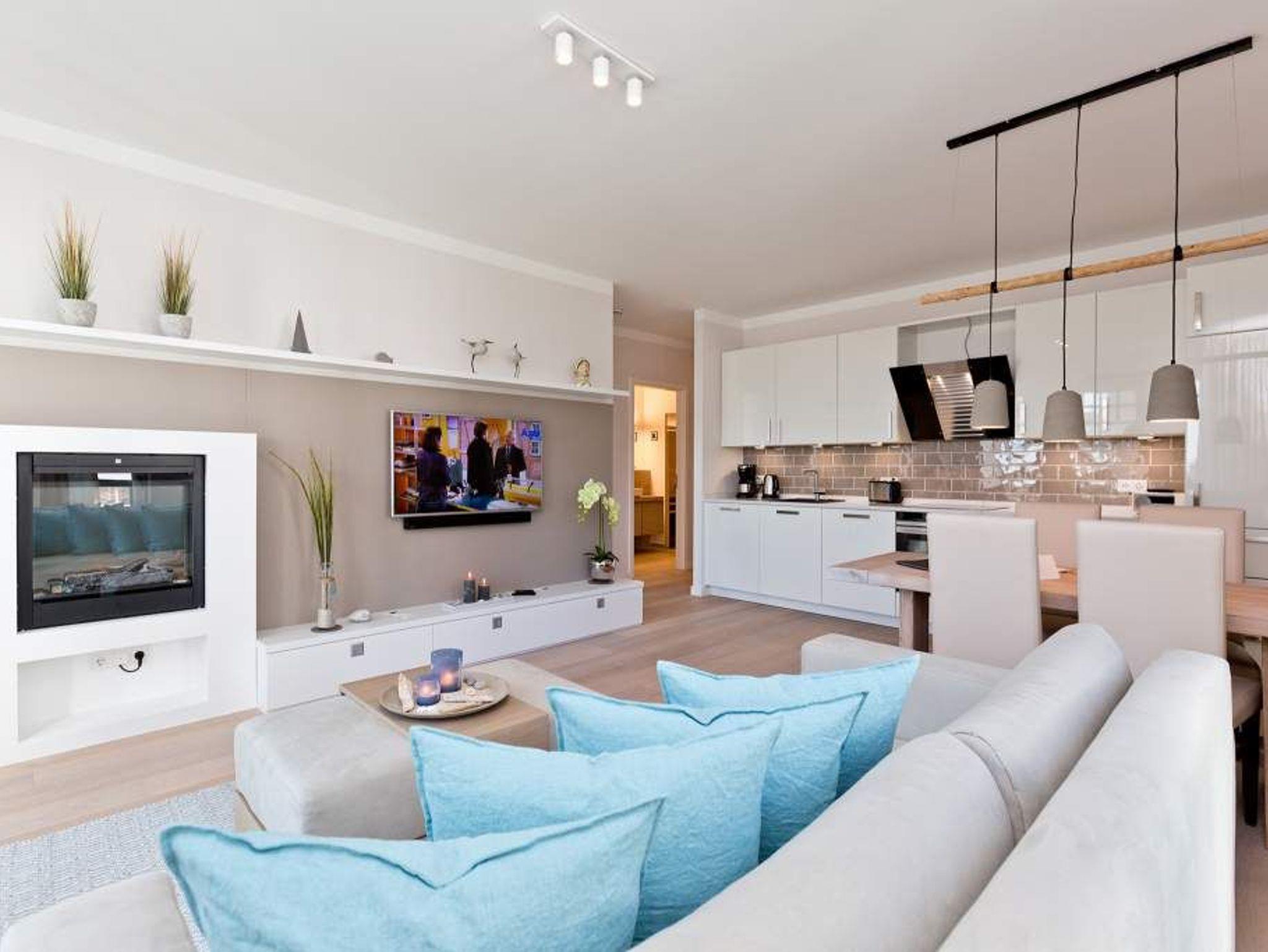 Die Freiheit ist Blau. Schon beim Aufwachen legt sich Ostseeweite in den Blick. 78 Quadratmeter Wohlfühlwelt bieten die 3 Räume der Wohnung Nummer 6 im ersten Obergeschoss der Villa Westend. Meerblick gibt es hier jedoch nicht nur aus einem der beiden Schlafzimmer. Auch der großzügige Wohnbereich mit offener Küche und angrenzendem Balkon wartet mit Weite bis an den Horizont auf. Eingerichtet vom Innenarchitekten mit eleganten Möbeln und stylischen Wohn-Accessoires sorgt das Appartement für Urlaubsgefühl pur. Highlight nicht nur im Winter ist der Elektro-Kamin. Kühle Abende werden damit zu wohligen Augenblicken. Zwei Schlafzimmer bieten in hochwertigen Boxspringdoppelbetten (1,80 m x 2,00 m) Platz für 4 Personen. Zum Verdunkeln können Außenjalousien heruntergelassen werden: hierbei handelt es sich lediglich um einen Sonnenschutz, der automatisch bei schlechtem Wetter einfährt und nicht um Außenjalousien. Alle drei Zimmer verfügen über Flat-TVs. Wie wäre es mit einem eigenen kleinen Spa-Bereich? Zwei Bäder mit exklusivem Baddesign, Tropendusche und einer Panorama-Sauna im Masterbad lassen den Urlaub zur Wellness-Auszeit werden. Und damit Sie sich wirklich um nichts kümmern müssen, liegen bereits Handtücher für Sie bereit und auch die Betten sind bezogen. Zu dieser Wohnung gehören 2 Stellplätze ( Nr. 26 [&] 27) in der Tiefgarage.