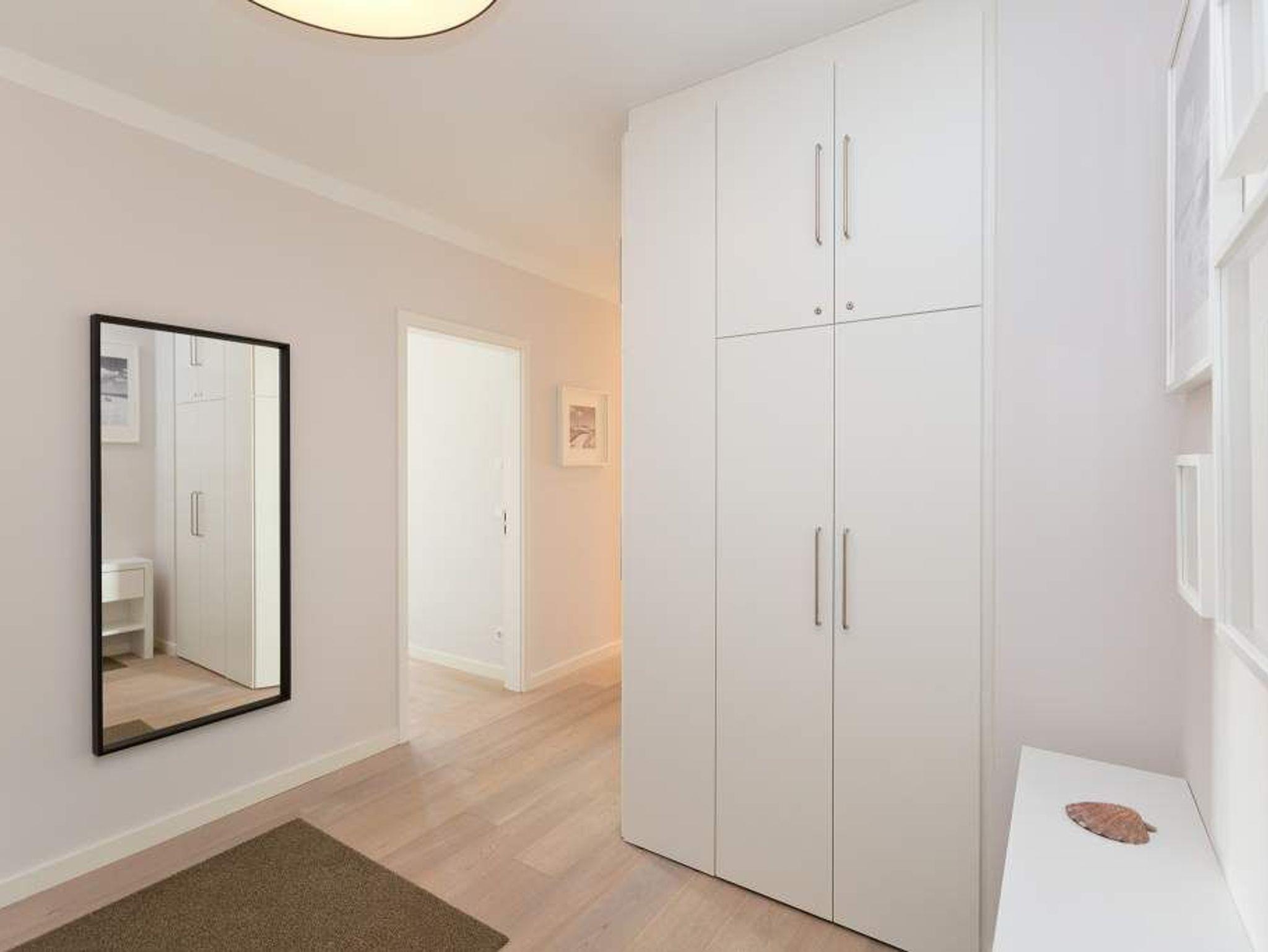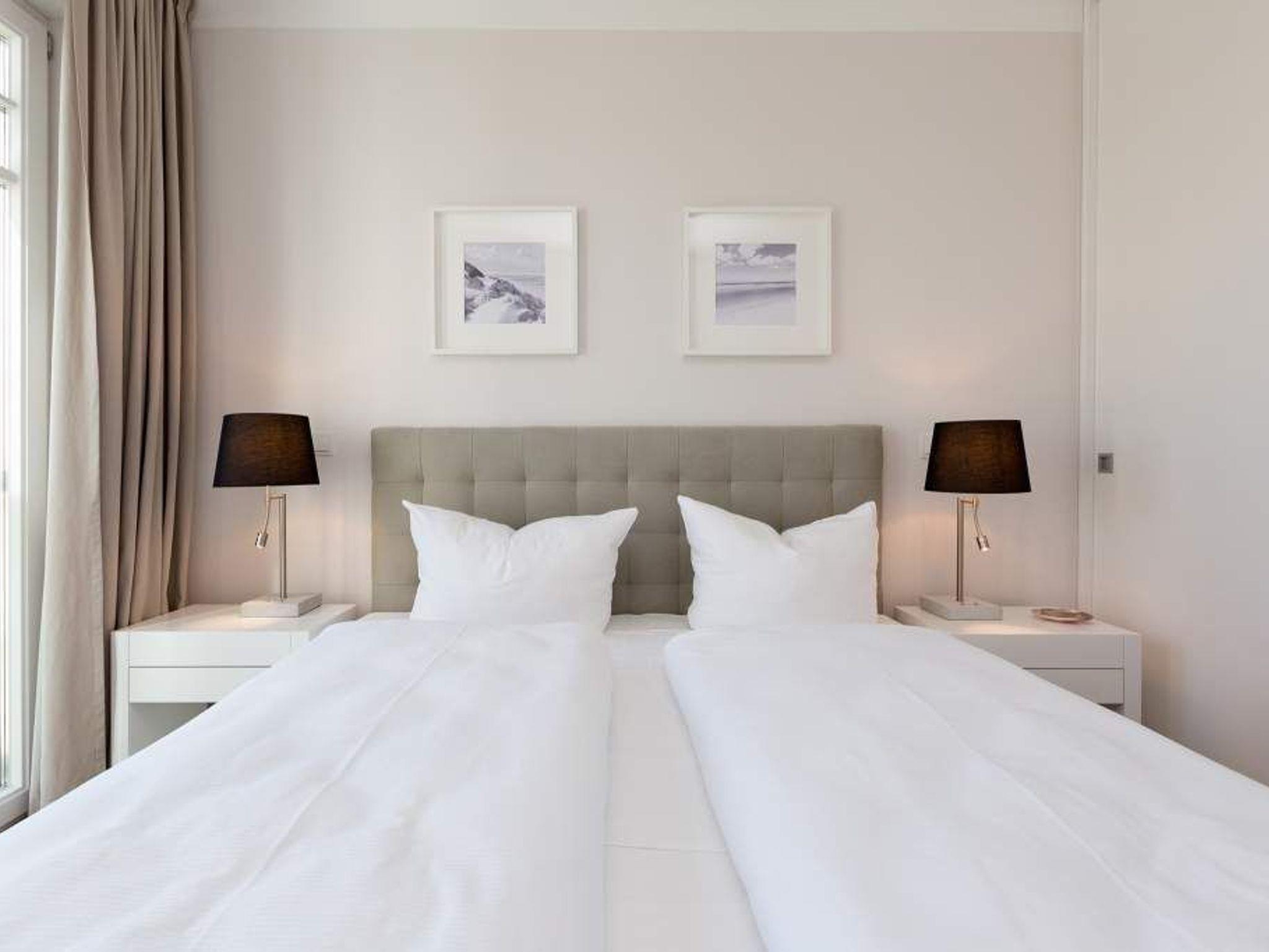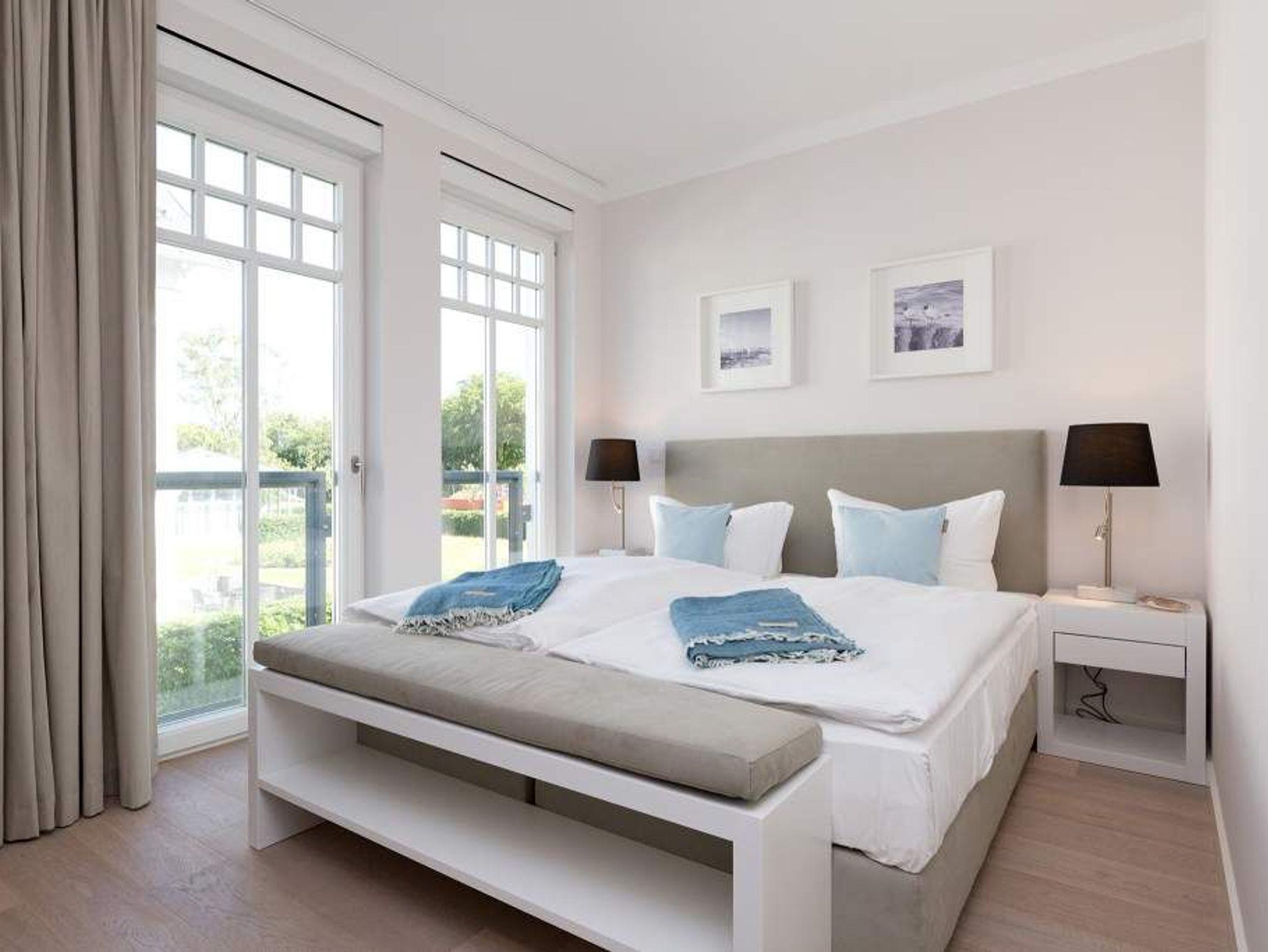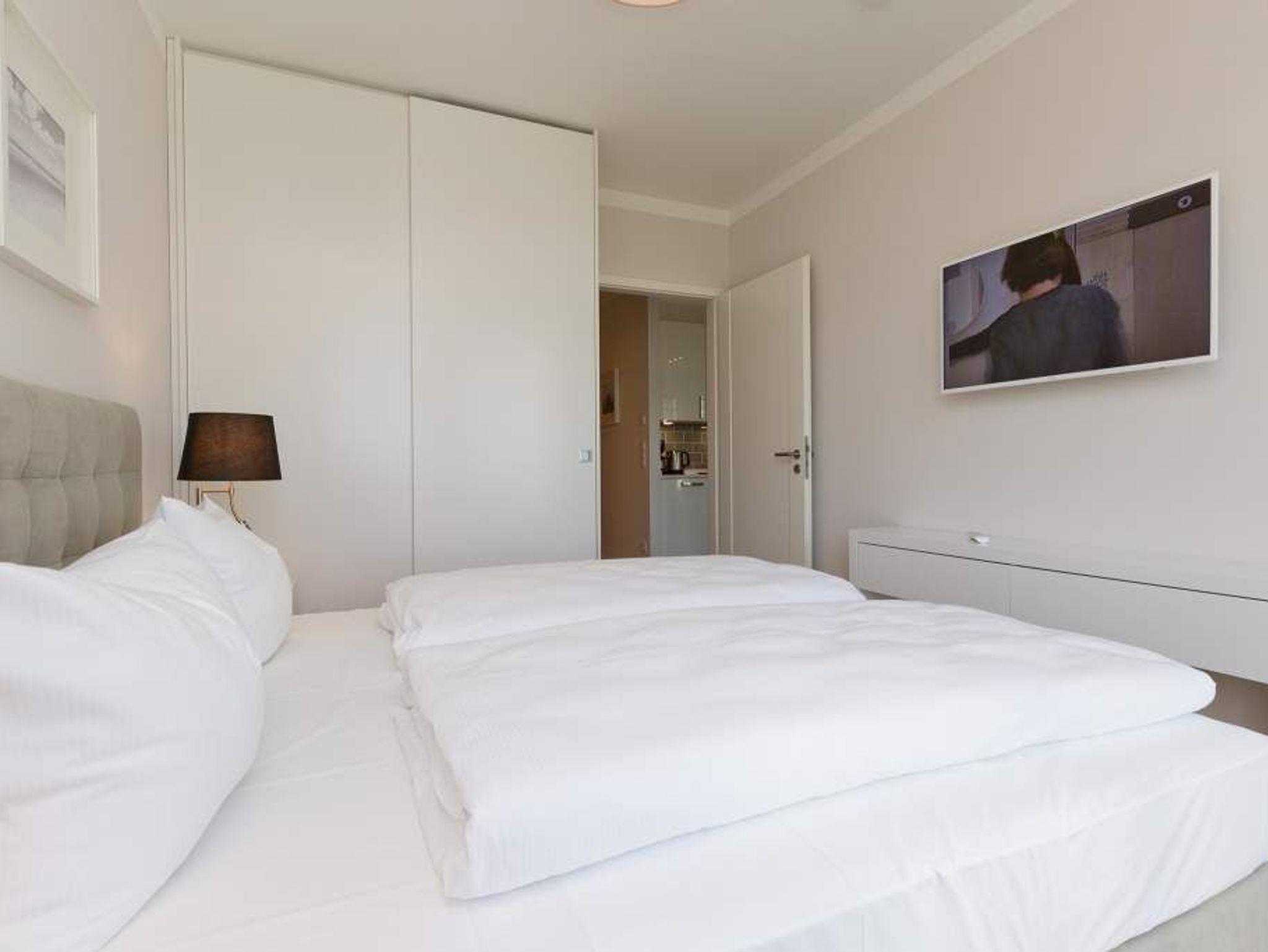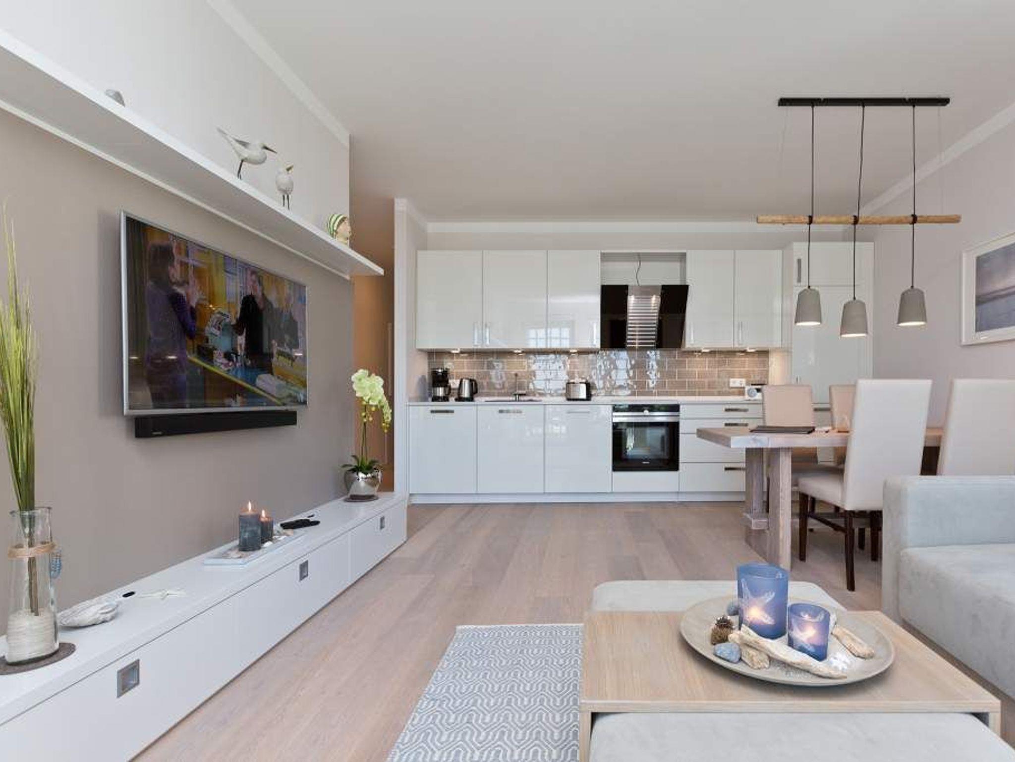 Die Freiheit ist Blau. Schon beim Aufwachen legt sich Ostseeweite in den Blick. 78 Quadratmeter Wohlfühlwelt bieten die 3 Räume der Wohnung Nummer 6 im ersten Obergeschoss der Villa Westend. Meerblick gibt es hier jedoch nicht nur aus einem der beiden Schlafzimmer. Auch der großzügige Wohnbereich mit offener Küche und angrenzendem Balkon wartet mit Weite bis an den Horizont auf. Eingerichtet vom Innenarchitekten mit eleganten Möbeln und stylischen Wohn-Accessoires sorgt das Appartement für Urlaubsgefühl pur. Highlight nicht nur im Winter ist der Elektro-Kamin. Kühle Abende werden damit zu wohligen Augenblicken. Zwei Schlafzimmer bieten in hochwertigen Boxspringdoppelbetten (1,80 m x 2,00 m) Platz für 4 Personen. Zum Verdunkeln können Außenjalousien heruntergelassen werden: hierbei handelt es sich lediglich um einen Sonnenschutz, der automatisch bei schlechtem Wetter einfährt und nicht um Außenjalousien. Alle drei Zimmer verfügen über Flat-TVs. Wie wäre es mit einem eigenen kleinen Spa-Bereich? Zwei Bäder mit exklusivem Baddesign, Tropendusche und einer Panorama-Sauna im Masterbad lassen den Urlaub zur Wellness-Auszeit werden. Und damit Sie sich wirklich um nichts kümmern müssen, liegen bereits Handtücher für Sie bereit und auch die Betten sind bezogen. Zu dieser Wohnung gehören 2 Stellplätze ( Nr. 26 [&] 27) in der Tiefgarage.