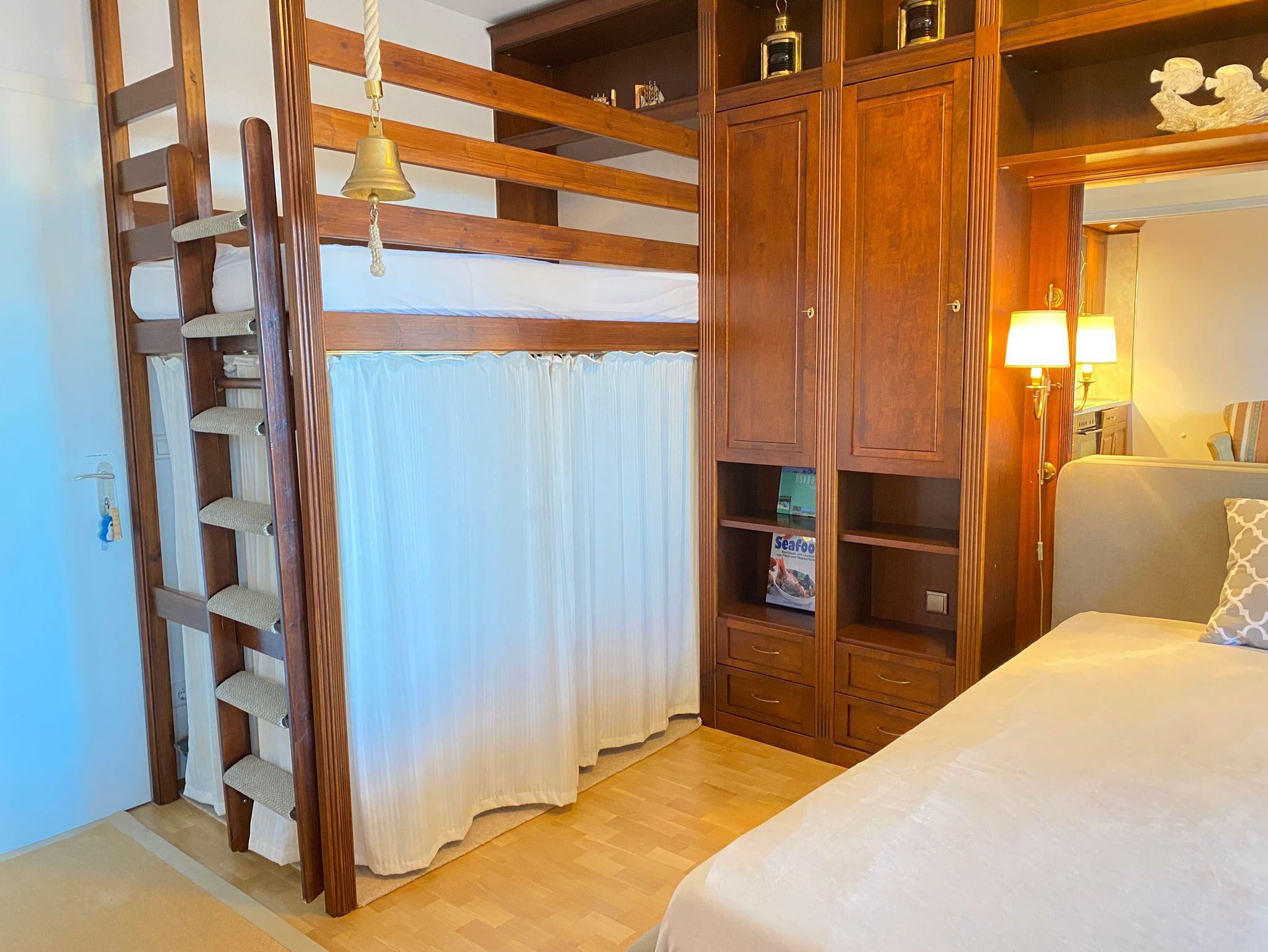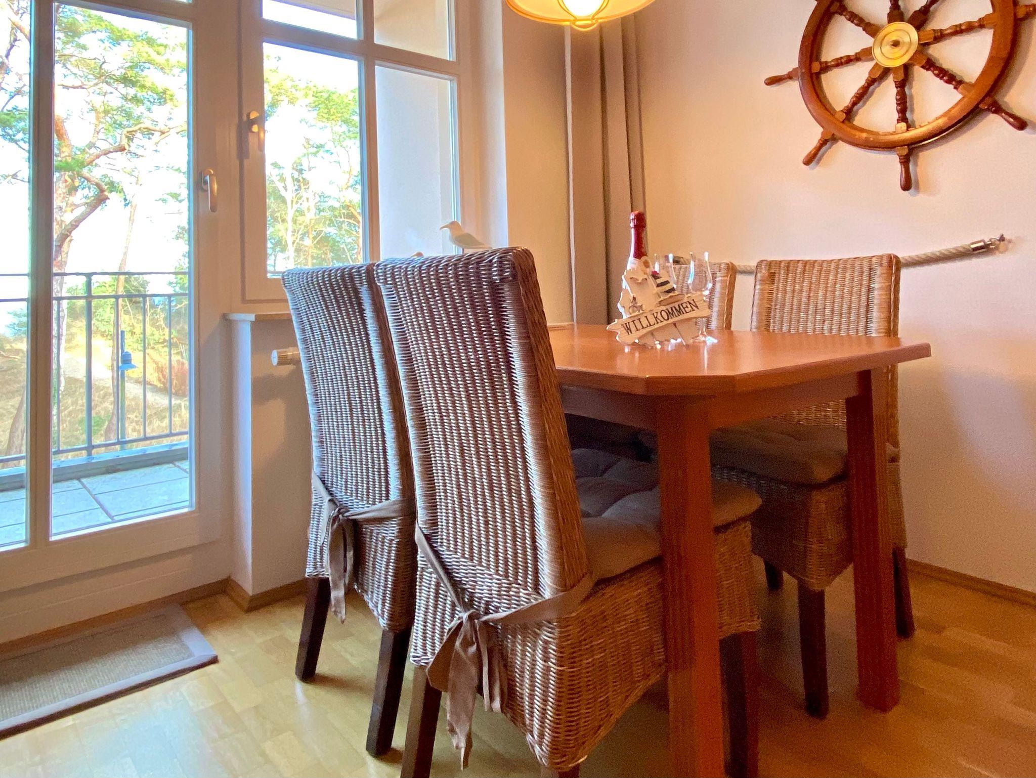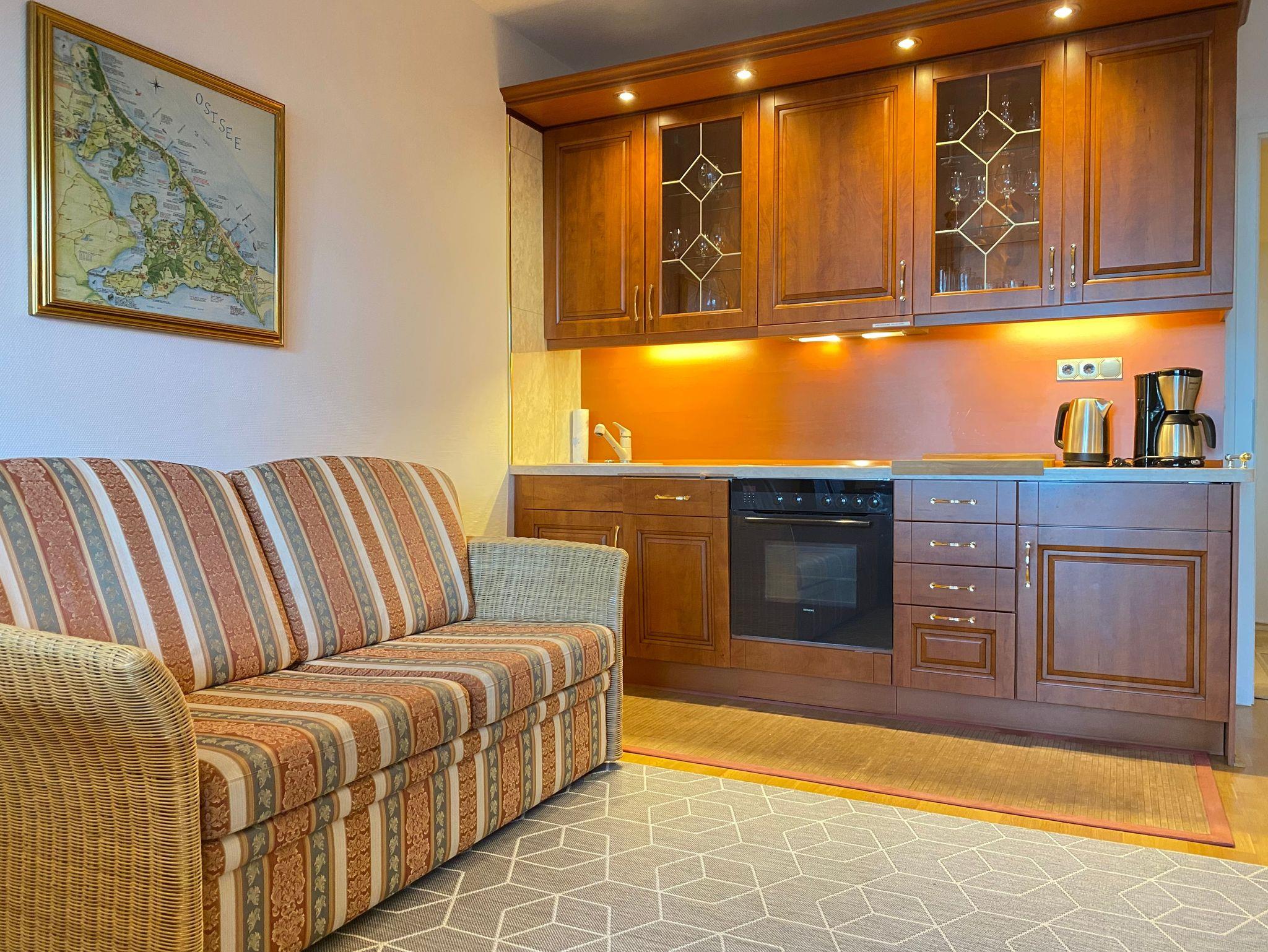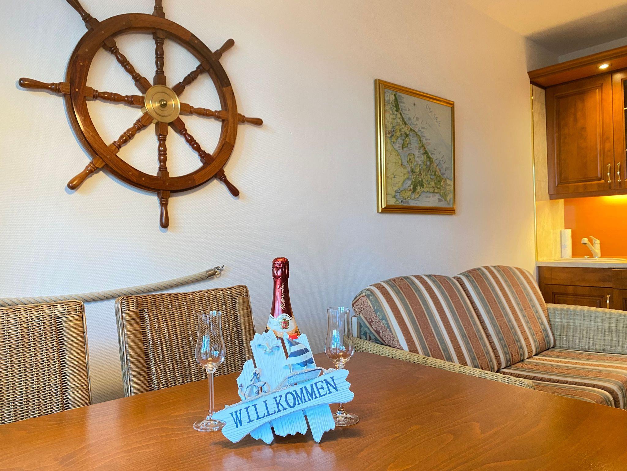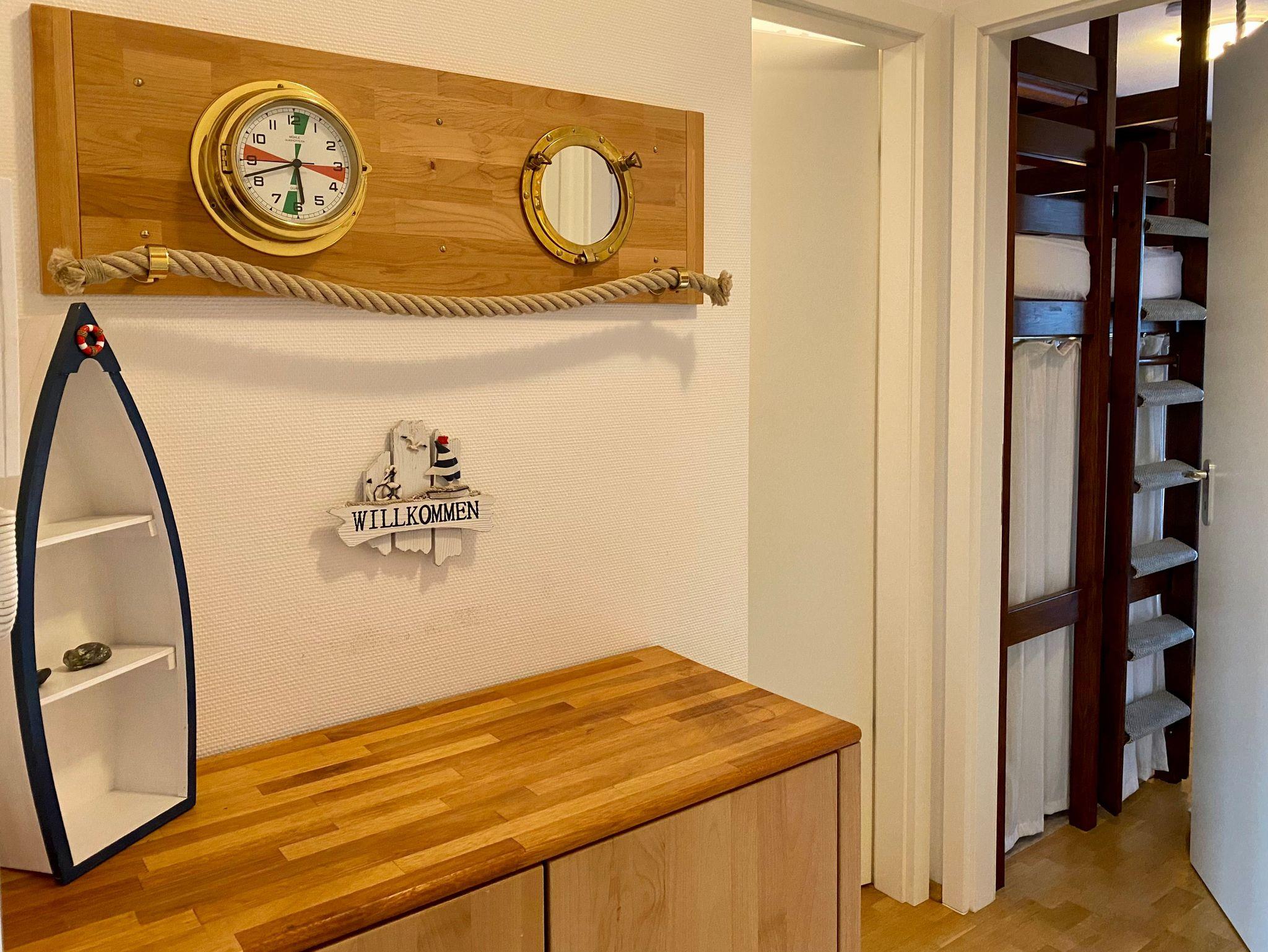 Über das Treppenhaus gelangen Sie in das erste Obergeschoss zum Eingang der Ferienwohnung Kati. Sie ist hochwertig mit Echtholzmöbeln und Parkettfußboden ausgestattet und maritim dekoriert. Die Ferienwohnung Kati ist eine Zweiraumwohnung, wobei der Wohnraum vom Schlafraum durch eine Schiebetür getrennt ist, die auch geöffnet bleiben kann. Das verschafft der Ferienwohnung eine freie Ansicht. Der Wohnbereich bietet neben dem Esstisch, eine Couch und den Küchenbereich. Im Schlafzimmer erwartet die Gäste ein kuscheliges Polsterbett in Komforthöhe und ein Hochbett für ein Kind. Das Badezimmer verfügt über eine Dusche und zusätzlich eine Waschmaschine zum freien Gebrauch für die Gäste. Der Lieblingsplatz in diesem Apartment ist und bleibt der überdachte Balkon zur Seeseite. Von hier können die Gäste jederzeit das Meer und das Treiben auf der Promenade beobachten. Stellplatz am Haus und WLAN inklusive