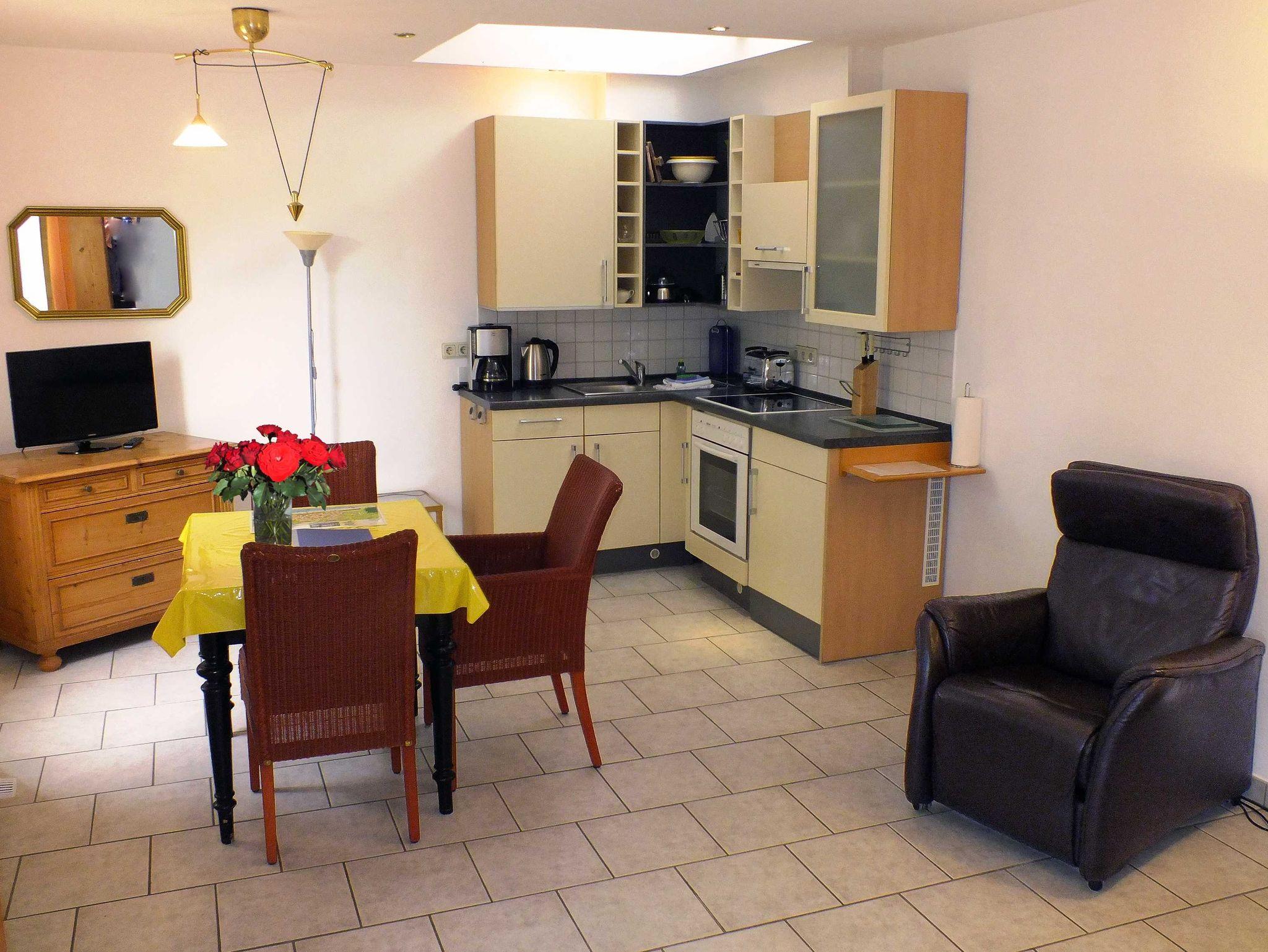 Die kombinierte Wohnküche verfügt über eine Schlafcouch mit einer Liegefläche von 1,60 x 2,00 m (Aufbettung für die 3&4 Pers.), Liegesessel, einem Kleiderschrank, Kommode mit Flachbild TV, Esstisch mit Stühlen und einer Küchenzeile. Die moderne Küchenzeile ist ausgestattet mit einen 3 Platten Cerankochfeld, Backofen, Spüle und Kühlschrank mit Gefriermöglichkeit, Geschirr, Wasserkocher und Toaster. Im Schlafzimmer befindet sich ein Doppelbett.