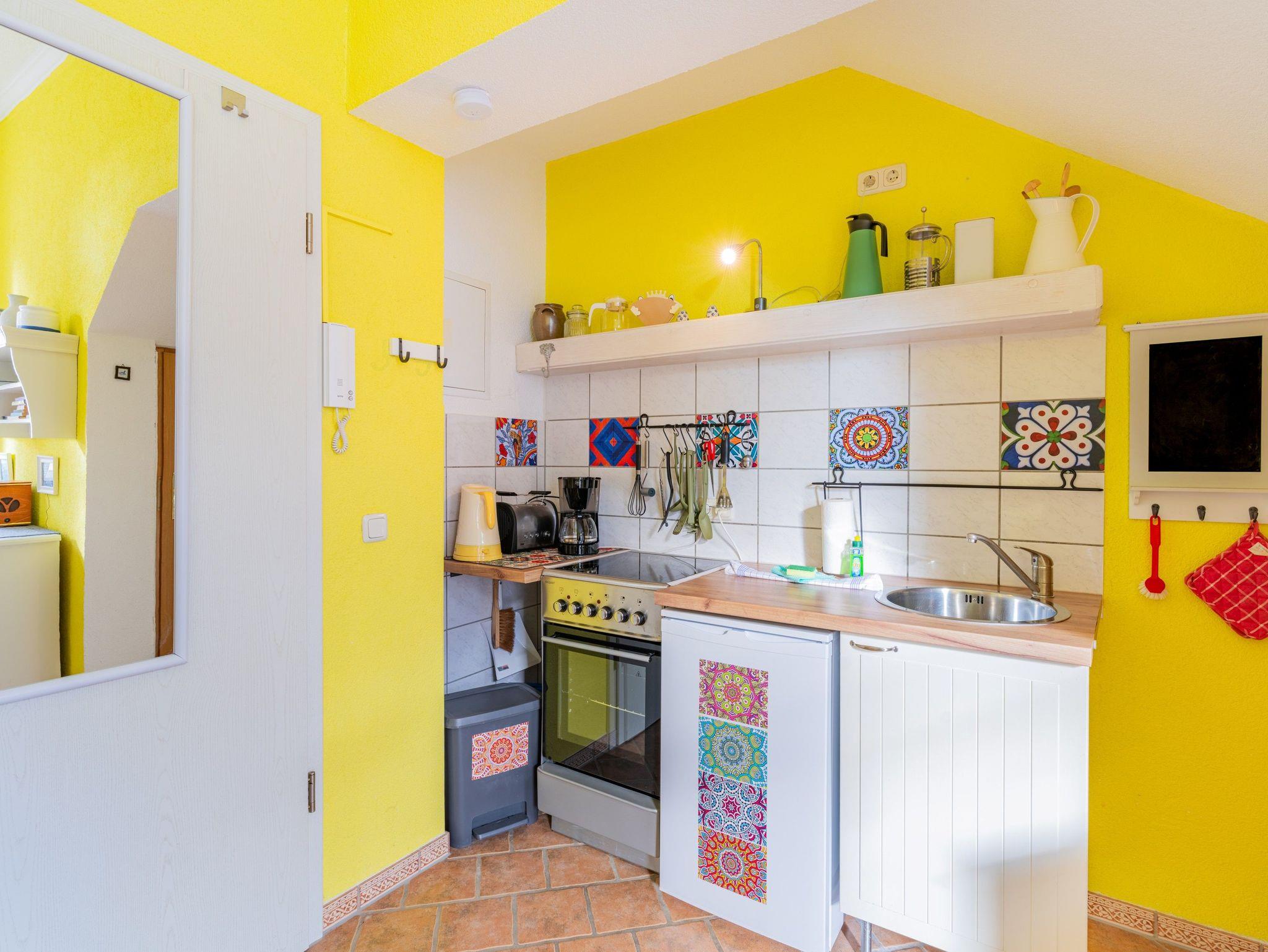 Das 27 qm große Appartment ist für bis zu zwei Personen ausgestattet. Es verfügt über einen Wohnbereich mit Essplatz für zwei Personen und eine gemütliche Couch. Vom Wohnzimmer aus erreichen Sie die Terrasse. Die Küche ist mit Herd, Kühlschrank, Kaffeemaschine und Toasrter ausgestattert.