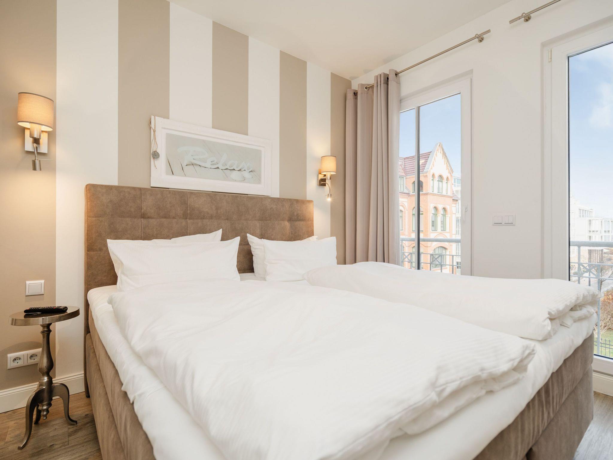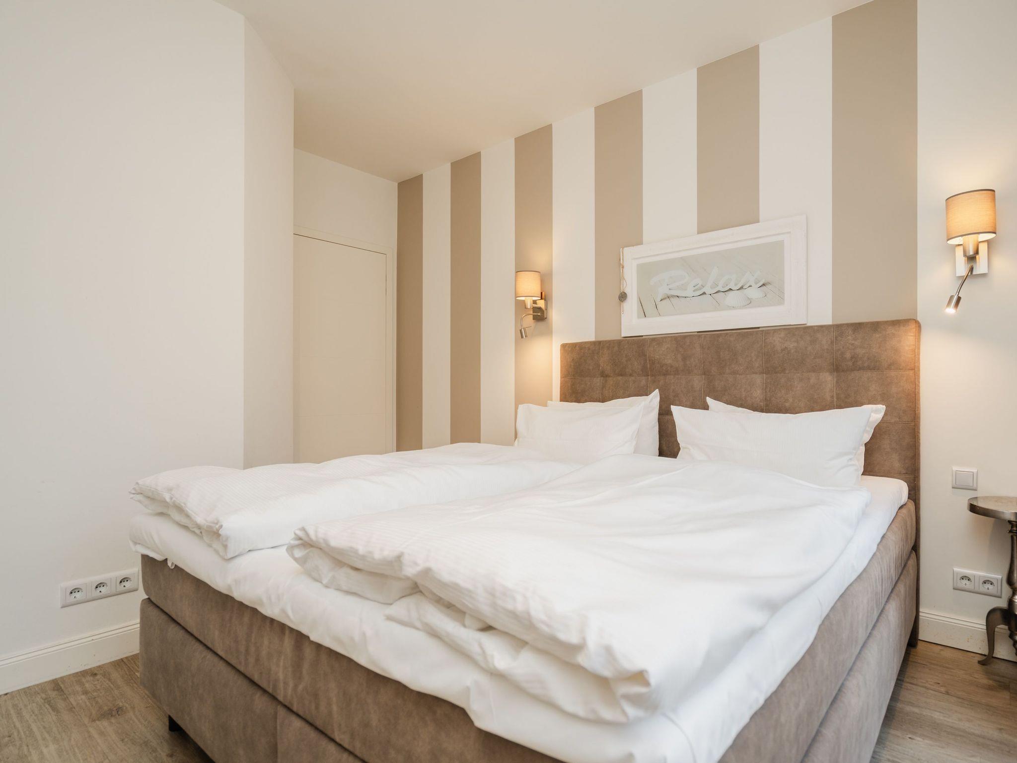 Wunderschön Urlauben! Die neue 3-Raum-Ferienwohnung ( 90 qm) im 1. Obergeschoss des Vorderhauses bietet Platz für 4 Personen und 1 Kleinkind ( bis 3 Jahre im Kinderreisebett). Die zeitlos elegante Möblierung und die klaren Linien und Farben wirken modern und stylisch und dennoch gemütlich und kuschlig - Urlaubsfeeling pur! Der helle Wohnbereich mit gemütlicher Sitzgruppe, Flat-TV und modernem Design-Gaskamin (per Fernbedienung zu nutzen) wird ergänzt durch die offene, komplett ausgestattete Küche mit Essplatz. Zwei Schlafzimmer mit komfortablen Boxspringbetten und Flat-TV (1x mit großzügigem begehbaren Kleiderschrank) sorgen für erholsame Nächte. Ein besonderes Highlight ist die wohnungseigene Sauna, die im schönen Bad mit Echtglasdusche integriert ist. Ein Balkon zur Westseite, Pkw-Stellplatz in der Tiefgarage Nr. 8 , WLAN-Netz kostenfrei nutzbar. Für Ihren Komfort steht die Erstausstattung Wäsche für Sie bereit. Für Kleinkinder können ein Babyreisebett (ohne Matratze und Kinderbettzeug) und ein Kinderhochstuhl gegen einen Aufpreis bestellt werden.