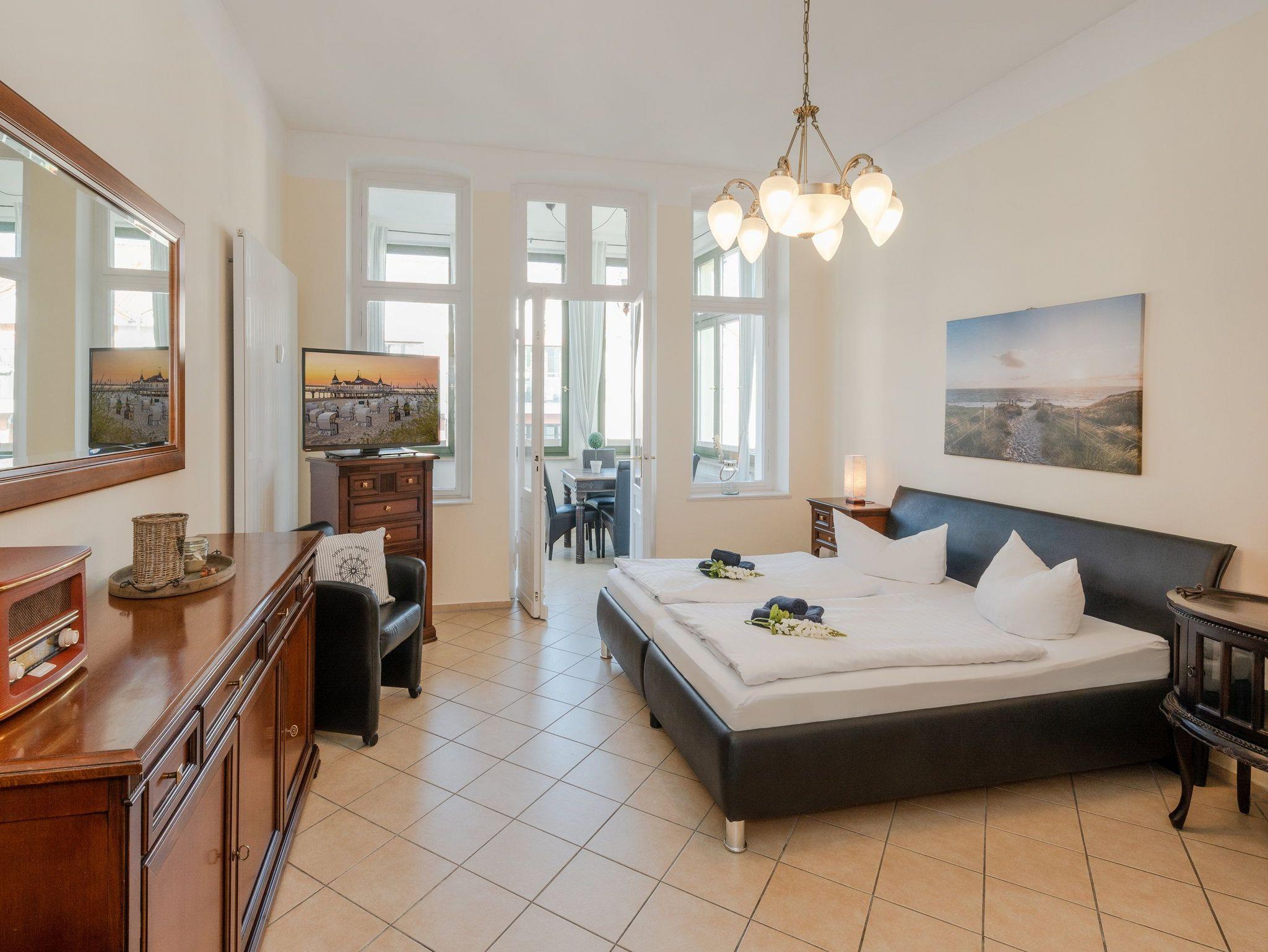 Das helle Ein-Zimmer-Appartement hat eine Wohnfläche von 38 Quadratmetern und befindet sich im 1. Obergeschoss der Villa Goodewind. Der kombinierte Wohn- und Schlafbereich ist in warmen Farben gehalten. Die angrenzende Küchenzeile ist mit allem bestückt, was Sie für die Zubereitung Ihrer Lieblingsspeisen benötigen. Neben zwei Cerankochfeldern und einem Kühlschrank mit Gefrierfach finden sich Geschirrspüler, Mikrowelle, Wasserkocher, Toaster und Kaffeemaschine. Das bequeme Doppelbett (200 x 200cm / zwei getrennte Matratzen) lädt nach einem erlebnisreichen Urlaubstag zu erholsamen Stunden ein.