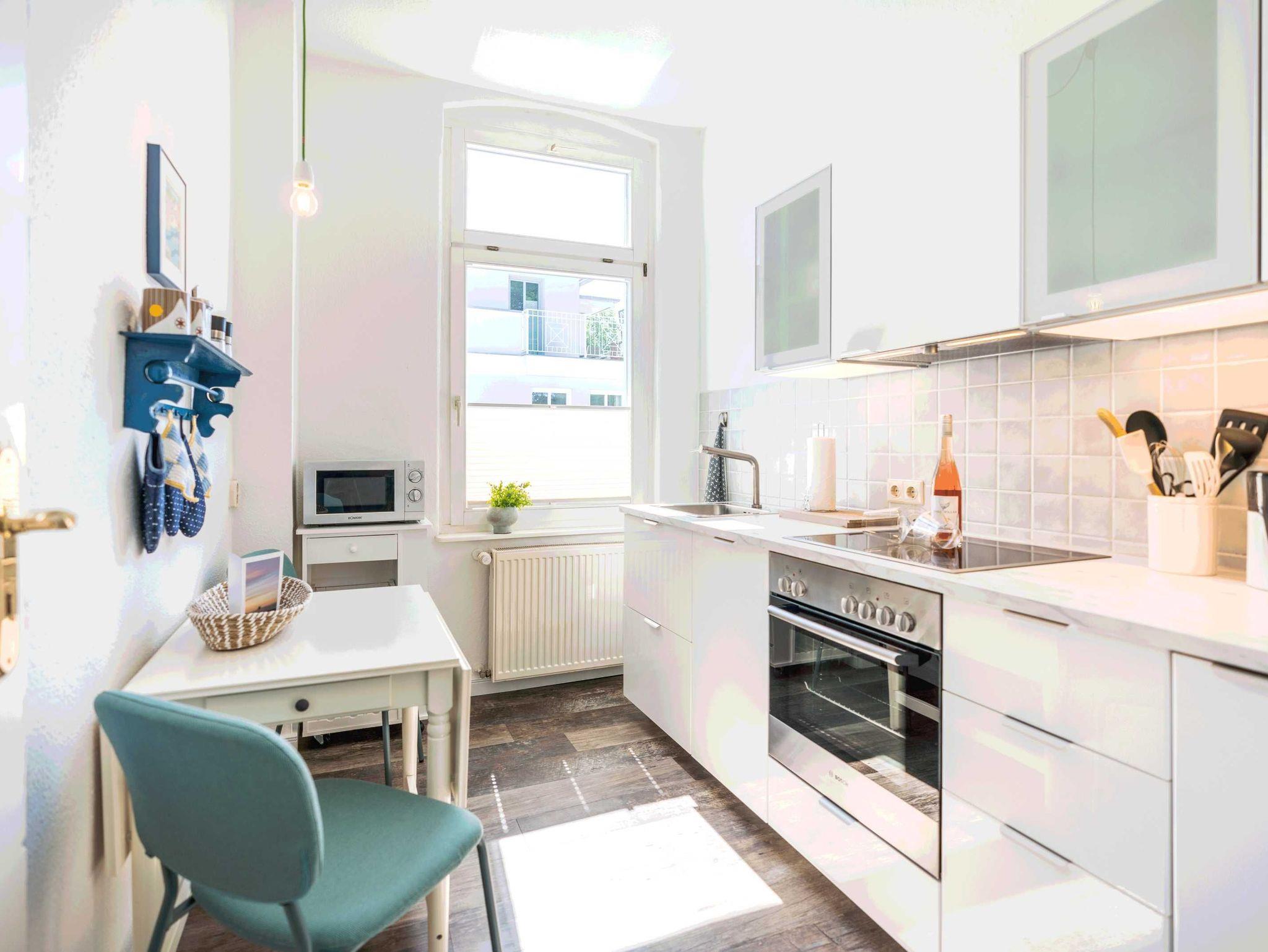 Die 46 qm große Ferienwohnung 4 für maximal 4 Personen befindet sich im 1. Stockwerk und bietet überhohe Decken im Altbaustil kombiniert mit einem individuellen Mix aus echten Antiquitäten und modernen Designmöbeln. Die großen Fenster im Wohnzimmer blicken auf die Seestraße; die Küche mit moderner Küchenzeile sowie das Schlafzimmer liegen zum Innenhof. Aufgrund des historischen Zuschnitts befindet sich im Schlafzimmer ein französisches Doppelbett (140 cm) und ein kleiner Wäscheschrank mit Spiegel. Vervollständigt wird die Ausstattung im Wohnzimmer um das ausziehbare Eckschlafsofa (140 cm) nebst gemütlichem Lesesessel und Full-HD-TV.