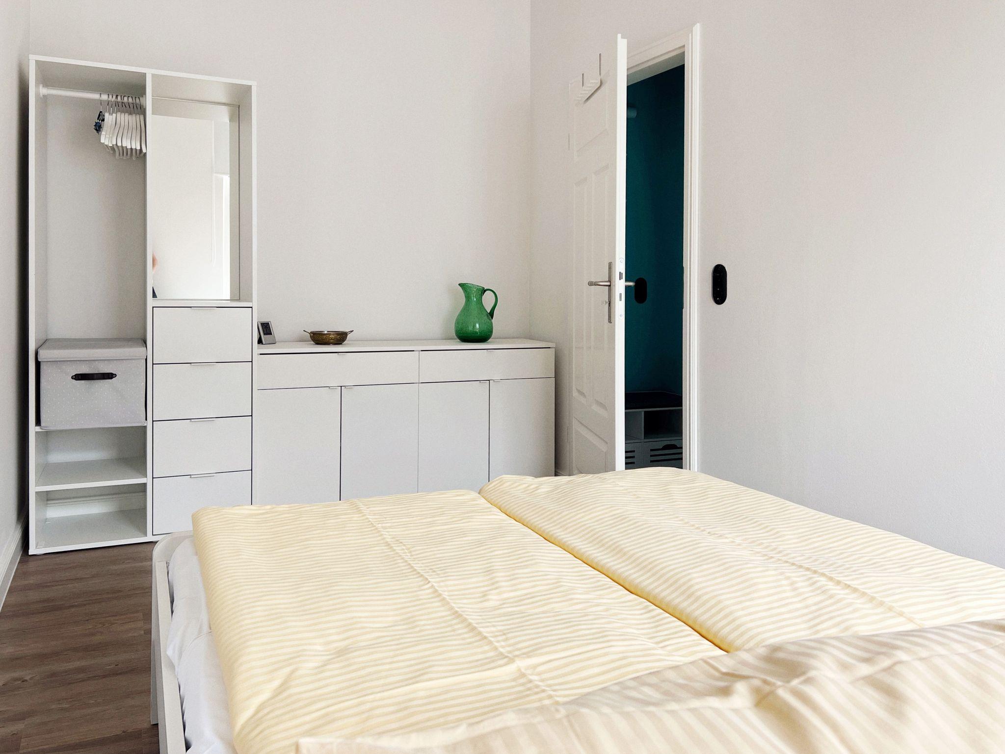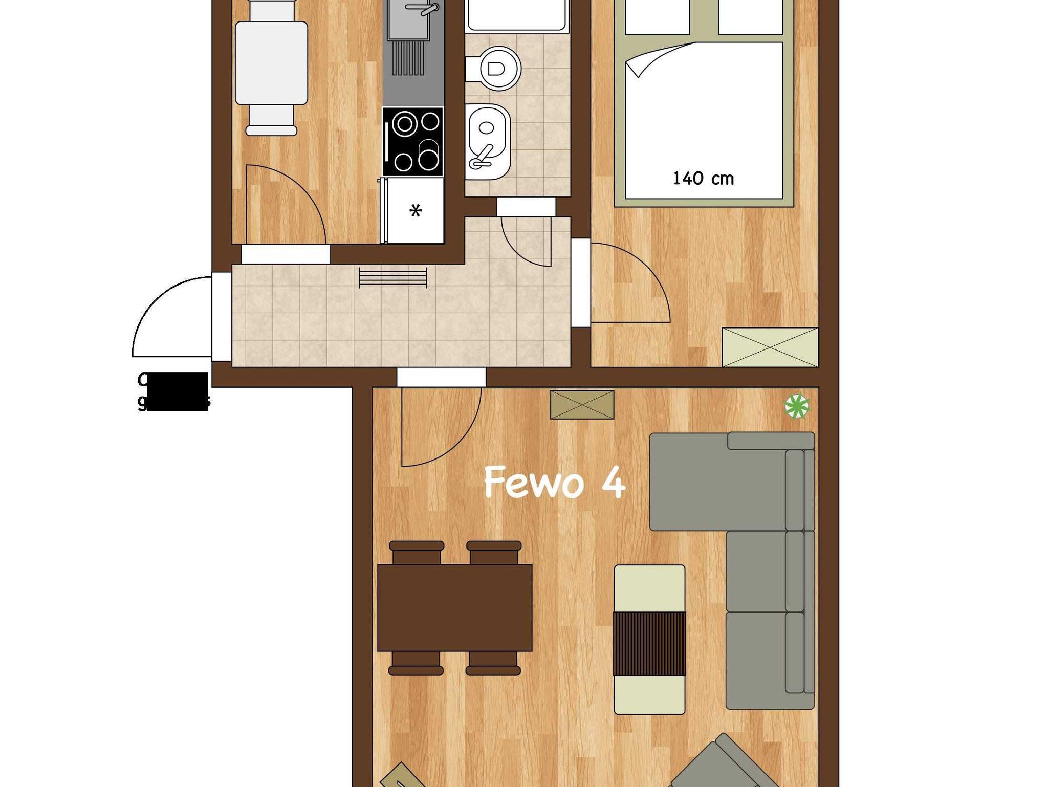 Die 46 qm große Ferienwohnung 4 für maximal 4 Personen befindet sich im 1. Stockwerk und bietet überhohe Decken im Altbaustil kombiniert mit einem individuellen Mix aus echten Antiquitäten und modernen Designmöbeln. Die großen Fenster im Wohnzimmer blicken auf die Seestraße; die Küche mit moderner Küchenzeile sowie das Schlafzimmer liegen zum Innenhof. Aufgrund des historischen Zuschnitts befindet sich im Schlafzimmer ein französisches Doppelbett (140 cm). Vervollständigt wird die Ausstattung im Wohnzimmer um das ausziehbare Eckschlafsofa (140 cm) nebst gemütlichem Lesesessel und Full-HD-TV.