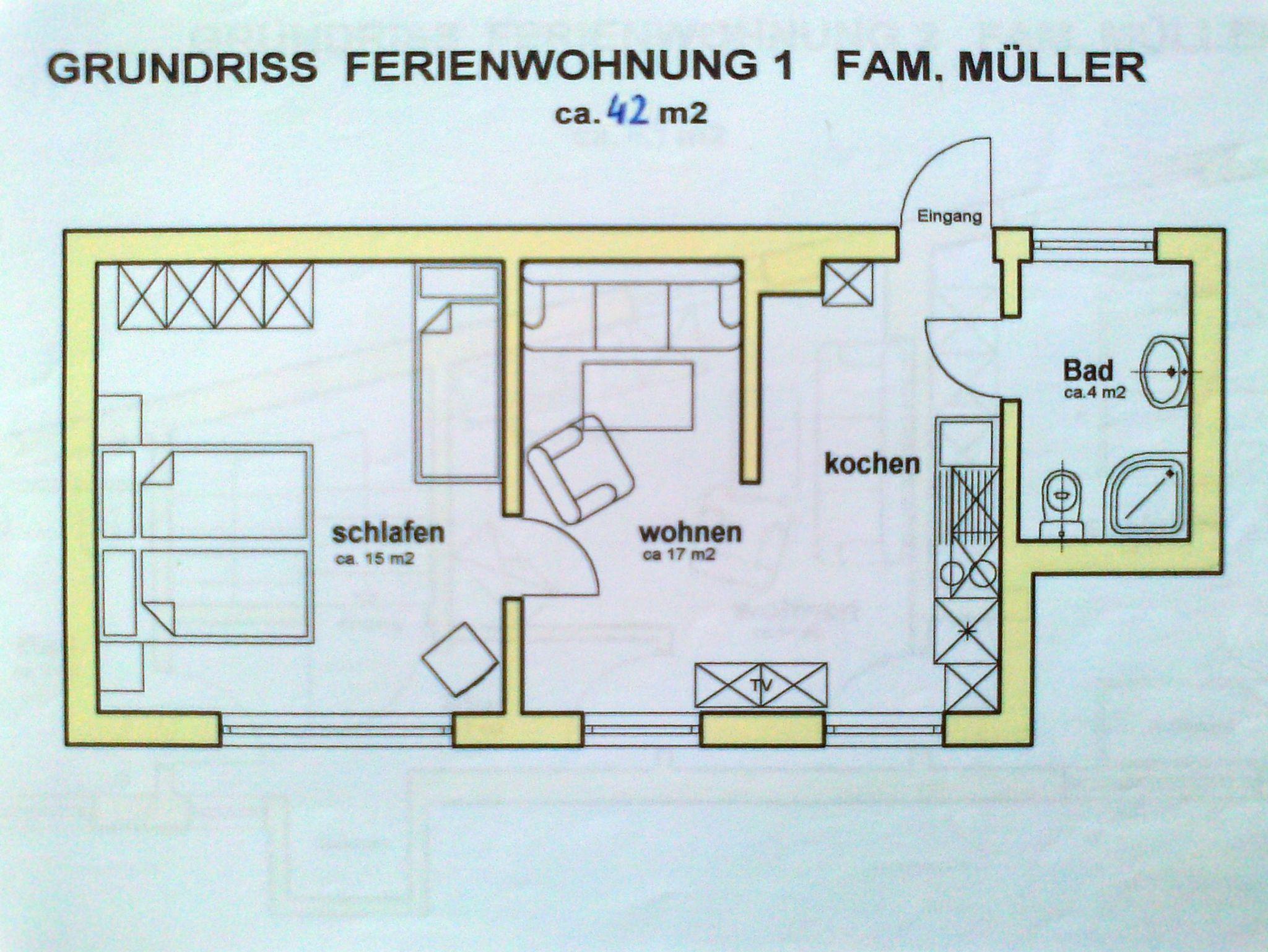 * Kaffeemaschine, Wasserkocher, Geschirr, Besteck, 2 E-Platten, TV, Flachbildschirm, Radio, CD uvm.