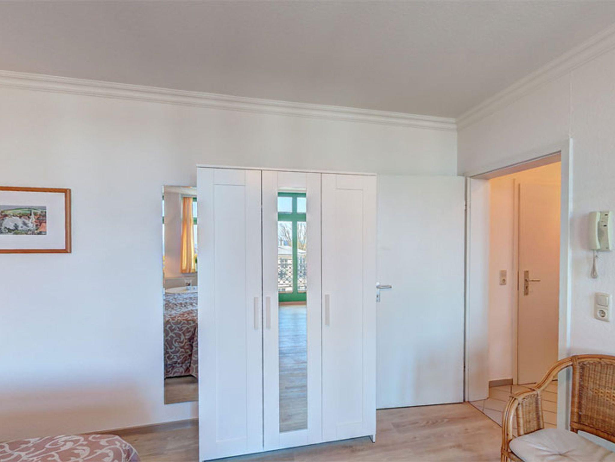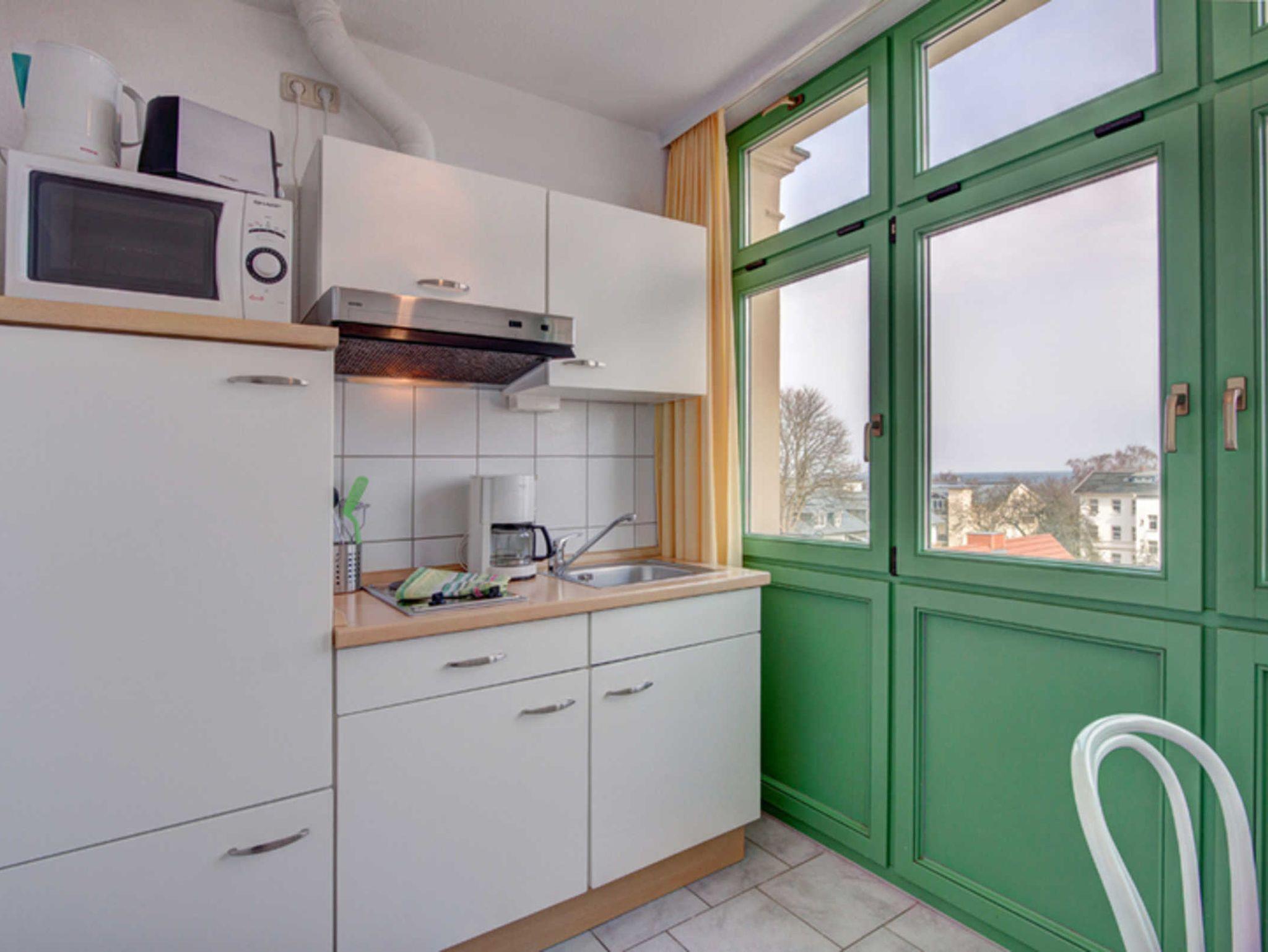 Das gemütliche 1-Zimmer-Appartement Nr. 16 befindet sich im zweiten Obergeschoss der Villa Ostseewarte. Es verfügt über einen kleinen Vorflur, einen geräumigen Wohn- und Schlafraum mit einem Doppelbett, einer gemütlichen Sitzgruppe sowie einem Essplatz. Die separate Küche ist voll ausgestattetet mit Kaffeemaschine, Wasserkocher, Toaster und Mikrowelle. Das Bad verfügt über Dusche und WC. Zum Appartement gehört darüber hinaus ein Balkon zur Seeseite mit Seeblick über die davor stehenden Häuser hinweg. Ein Pkw-Stellplatz steht Ihnen auf dem Grundstück kostenfrei zur Verfügung und Ihre Fahrräder können Sie ebenfalls auf dem Grundstück in einem separaten Abstellraum unterbringen. Alle Wohnungen in der Villa Ostseewarte haben passwortgeschütztem DSL-WLAN Internetzugang (gerätegebunden, Euro 1,50 pro Tag und Gerät). Ein FAHRSTUHL wurde nachträglich eingebaut. Eine Waschmaschine kann gegen Gebühr gern genutzt werdem (Münzgerät).
