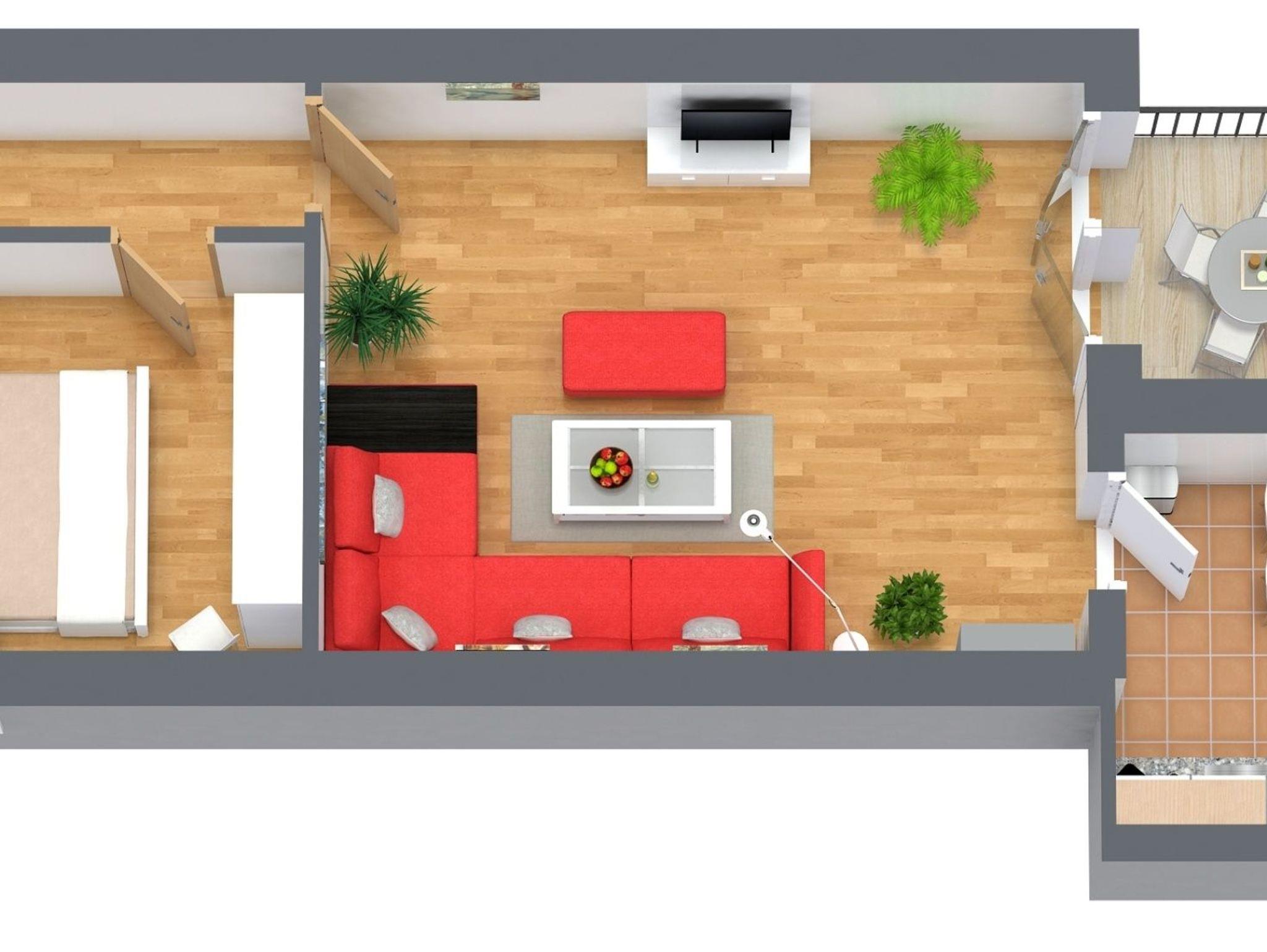 Das 60 qm große Appartement in ersten Obergeschoss verfügt über ein Wohnzimmer mit moderner Couchecke (Schlafsofa) und einen kleinen Sitzbereich. Die separate Küche ist mit Backofen, Ceranherd, Kühlschrank und vielen weiteren Küchenutensilien sowie einem kleinen Essplatz ausgestattet. Eine gemütliche Veranda mit Essplatz schließt sich an. Vom Wohnzimmer haben Sie Zugang zum kleinen Balkon (Südseite). Das Schlafzimmer ist mit Doppelbett ausgestattet, Bad mit Dusche und WC.
