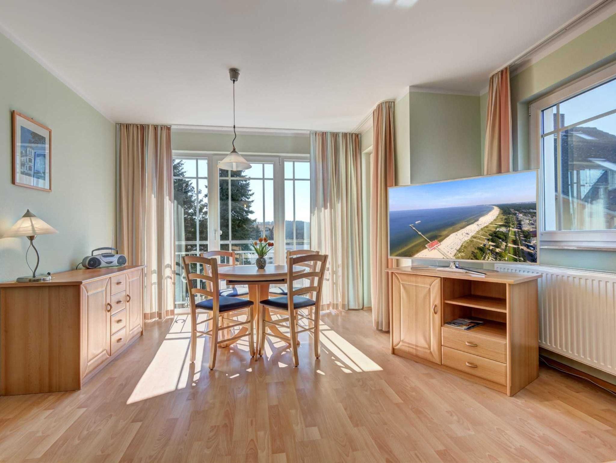 Die moderne 2-Raum NICHTRAUCHER-Ferienwohnung ist ca. 52 qm groß und befindet sich im Erdgeschoss eines Appartementhauses. Sie Wohnung verfügt über einen Schlafraum mit Doppelbett, Kleiderschrank und 2 Stühlen), einen kombinierten Wohn-u. Schlafraum mit einer Schlafcouch (1,60 x 2,00 m), Flachbild-TV, Radio mit CD-Player, Couchtisch & ein Sessel, Esstisch + 4 Stühle sowie einer Terrasse zur Südseite (morgens bis nachmittags Sonne). Die separate Küche ist ausgestattet mit einem Geschirrspüler, 4-Platten-Ceranherd, Backofen, Kühl-/Gefrierkombination, Kaffeemaschine, Toaster, Wasserkocher, Mikrowelle und Geschirr. Das Badezimmer verfügt über DU/WC sowie eine Fußbodenheizung und einen beleuchteten Kosmetikspiegel. Die gesamte Wohnung ist mit Fliesen und Laminat ausgestattet. Die Erstausstattung Bettwäsche und Handtücher ist inklusive. Auf Anfrage kann eine weitere Person auf dem Schlafsofa für 15 Euro pro Übernachtung zugebucht werden.