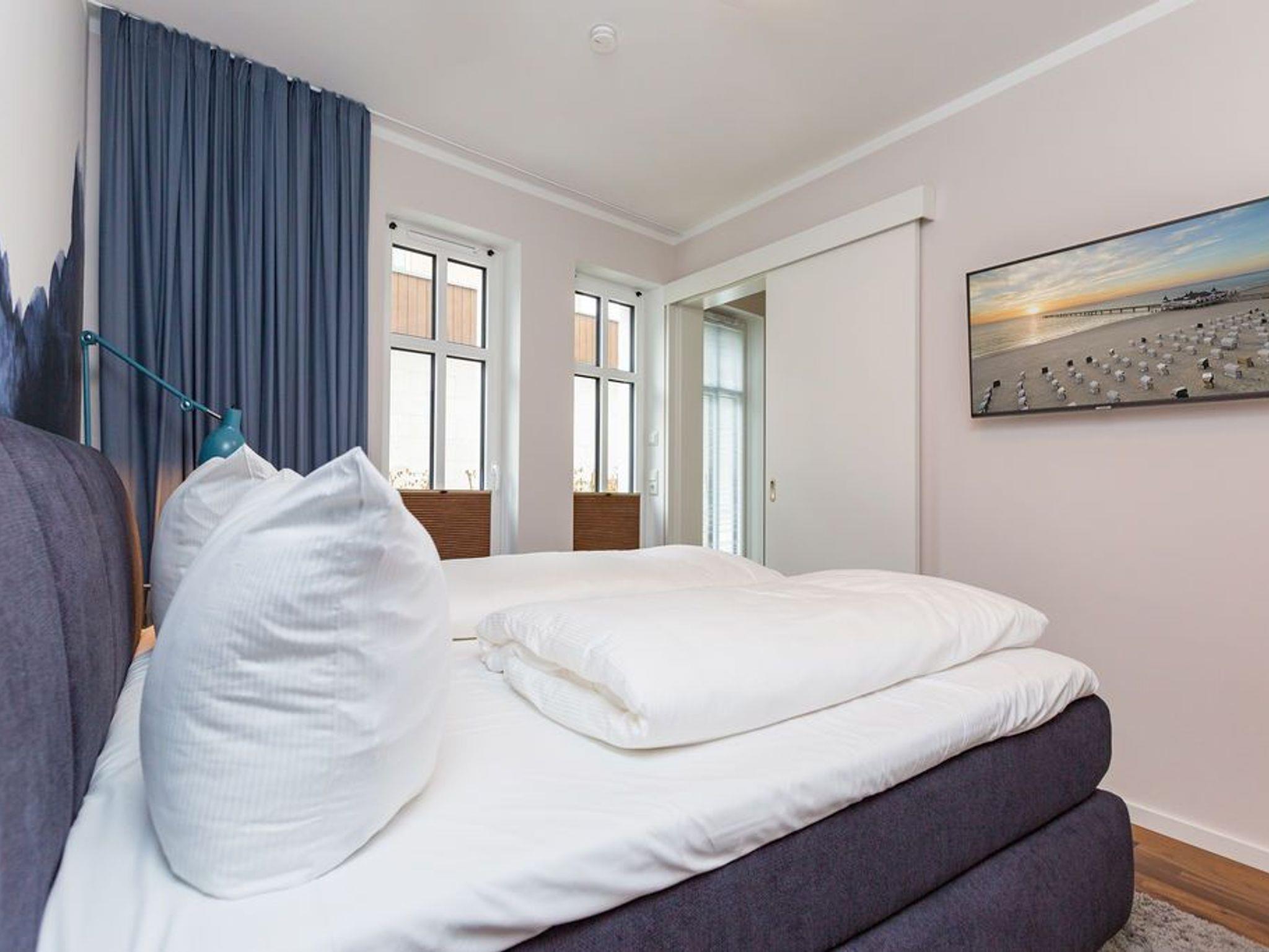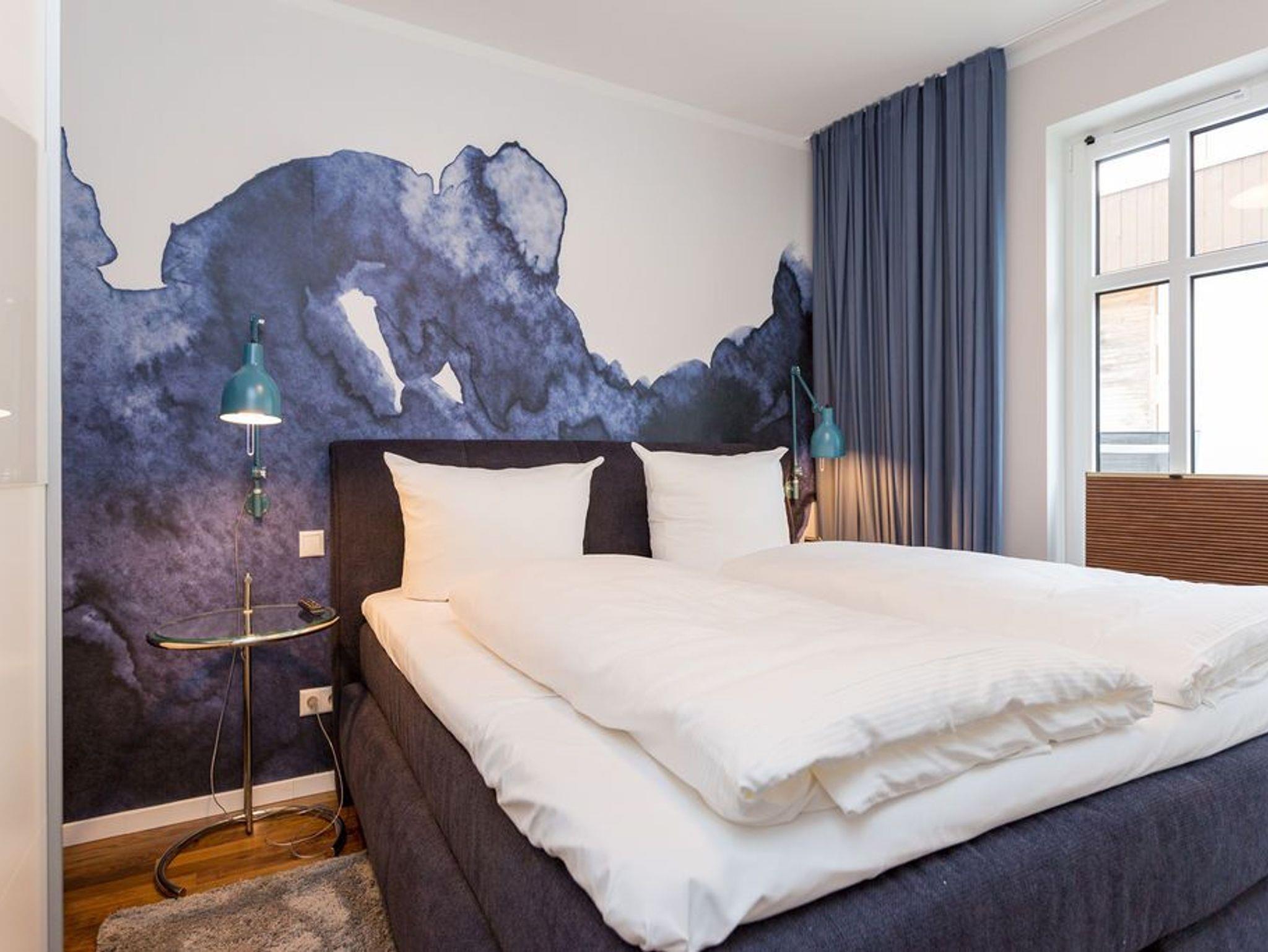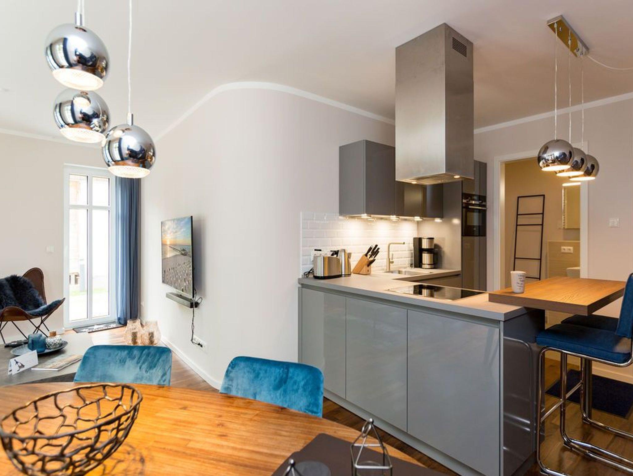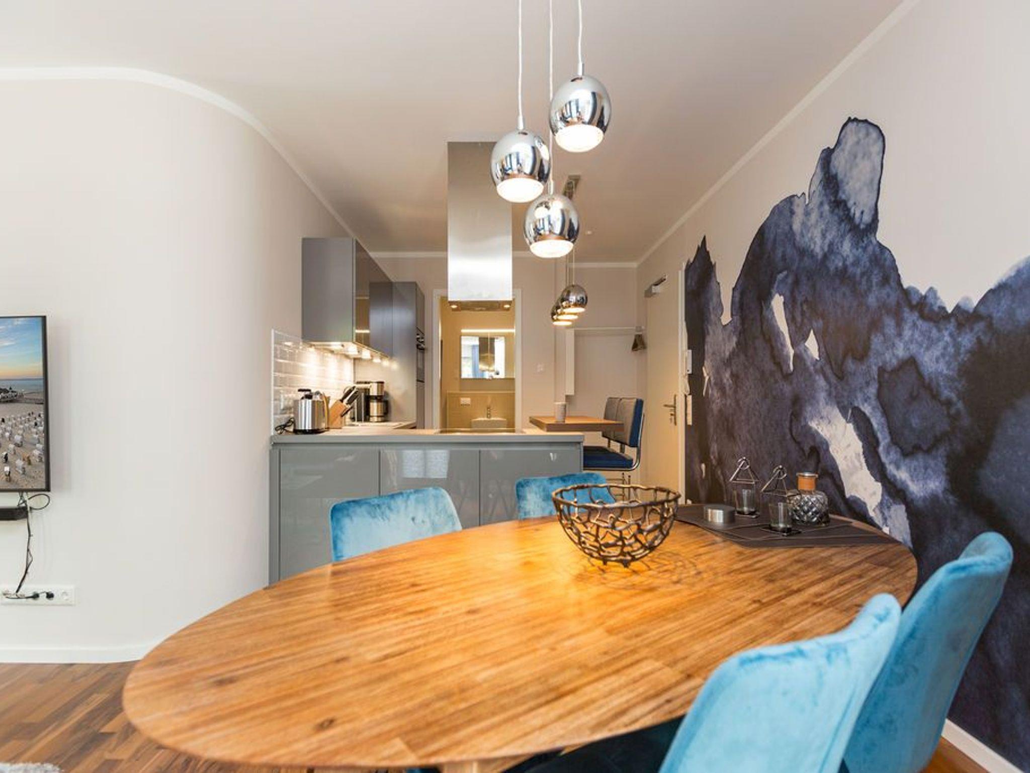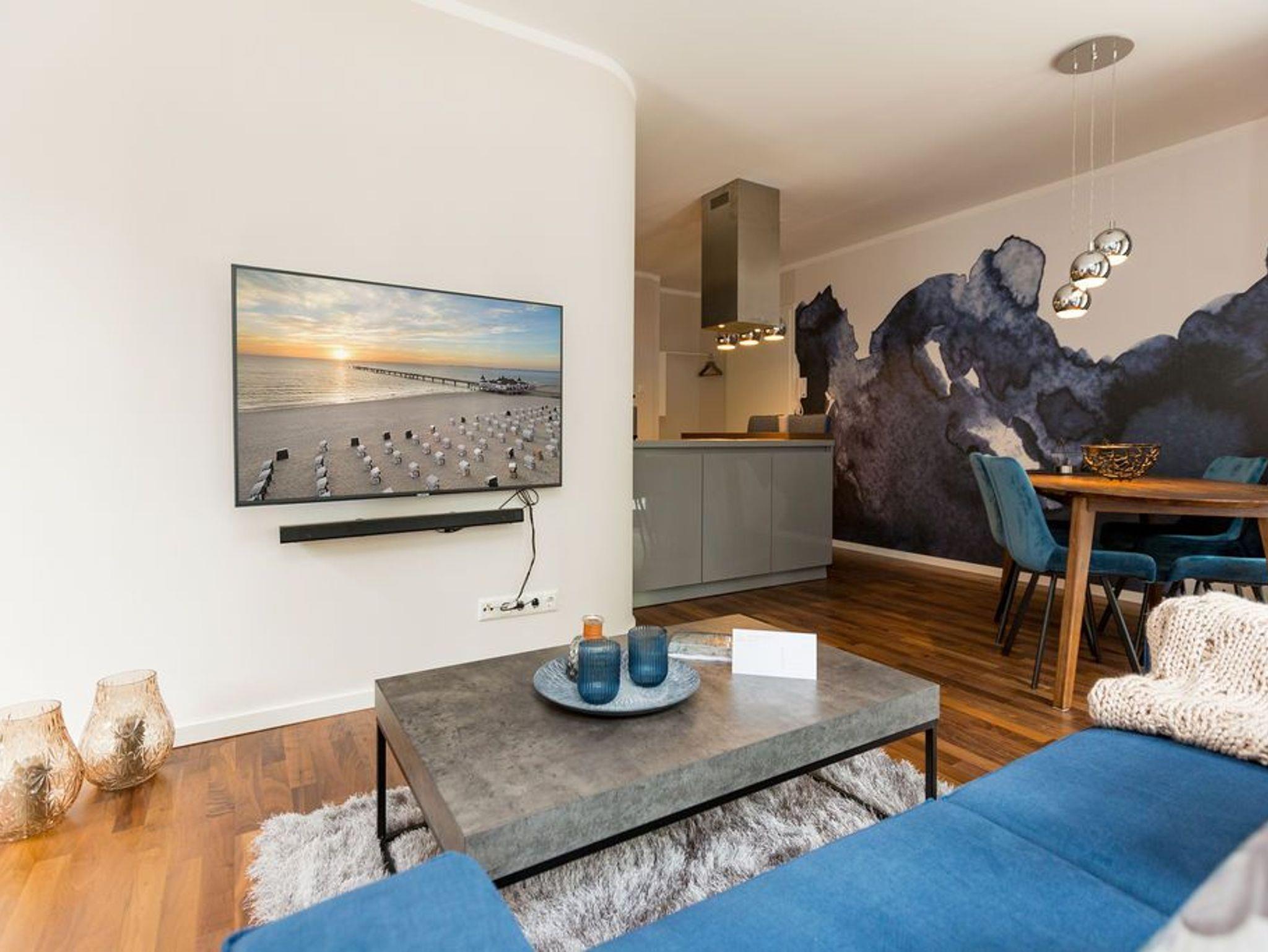 Extravagant, stilvoll, nordisch ? all das trifft auf das 65 Quadratmeter große Appartement im Erdgeschoss gleichermaßen zu. Platz ist hier für zwei Personen plus ein Kleinkind bis zwei Jahre (im Kinderreisebett) und einem geliebten Vierbeiner. Wer sich gern mit modernem Design umgibt und exklusive Wohntrends liebt, wird sich in diesem Ferienparadies rundum wohl fühlen. Ob außergewöhnliche Wandgestaltung oder Wohn-Accessoires, die dem Auge gefällig, harmonisch aufeinander abgestimmt sind; ob modernes Lichtdesign oder Hightech-Ausstattung vom Feinsten ? in dieser Zwei-Raum-Wohnung stimmt einfach alles. Behaglichkeit und Gemütlichkeit empfängt Sie im großen Wohn-Esszimmer mit Sitzgruppe und offener Küche. Ein Gas-Kamin sorgt für kuschelige Wärme und jede Menge Romantik. Doch keine Angst, auch wenn der Kamin einmal nicht an ist, bekommen Sie keine kalten Füße. Die Wohnung ist mit einer Fußbodenheizung ausgestattet. Ein großer Flat-TV mit Blue-Ray-Player sorgt für Unterhaltung. Zwei wunderbar große Terrassen (Richtung Süd-West und Richtung Süd-Ost, je 11 Quadratmeter groß) eignen sich ideal zum Sonnenbaden oder gemütlichen Zusammensitzen. Doch auch im Wohnzimmer gibt es zum Essen und Sitzen einen schönen Holzesstisch. Die offene Wohnküche ist mit hochwertigen Markengeräten wie einem Induktionsherd, Geschirrspüler, Kühlschrank mit Gefrierfach sowie edlem Geschirr voll ausgestattet. Im Schlafzimmer wartet ein bequemes Boxspringdoppelbett (1,80 m x 2,00 m) nur darauf, Ihnen wohliges Schlafvergnügen zu bereiten. Ein geräumiger Schrank bietet reichlich Platz zur Ablage. Im Schlafzimmer befindet sich ebenfalls ein Flat-TV (40 Zoll). Das Bad ist eine kleine Wellness-Oase. Denn in der dort integrierten Sauna können Sie nicht nur gehörig ins Schwitzen kommen, sondern auch herrlich entspannen. Dusche, Waschtisch und ein separates WC sind auf dem neuesten Stand. Handtücher liegen bei der Anreise bereit und auch die Betten sind bereits bezogen. Zu der Wohnung gehört in der Tiefgarage ein Stellplatz.