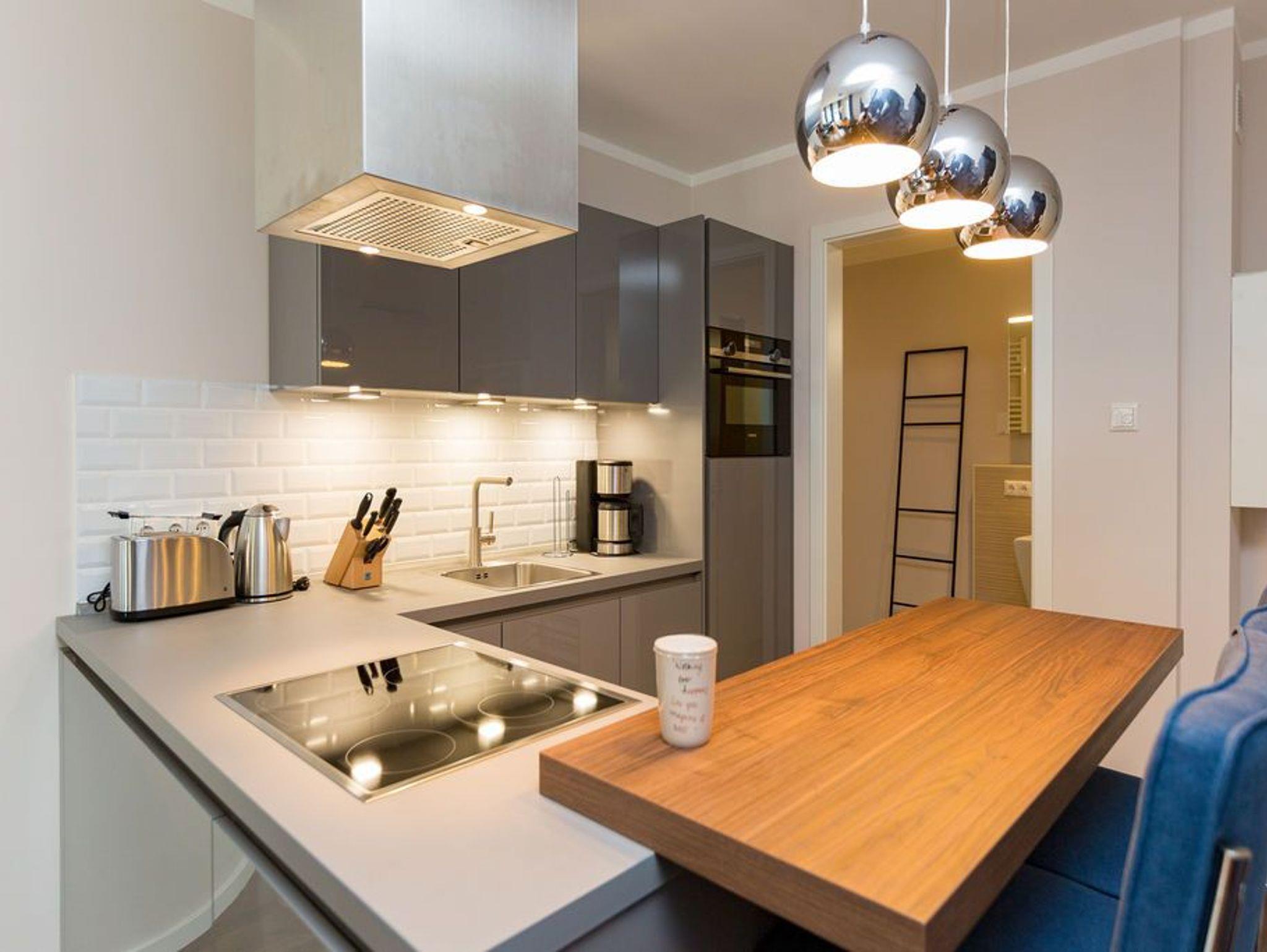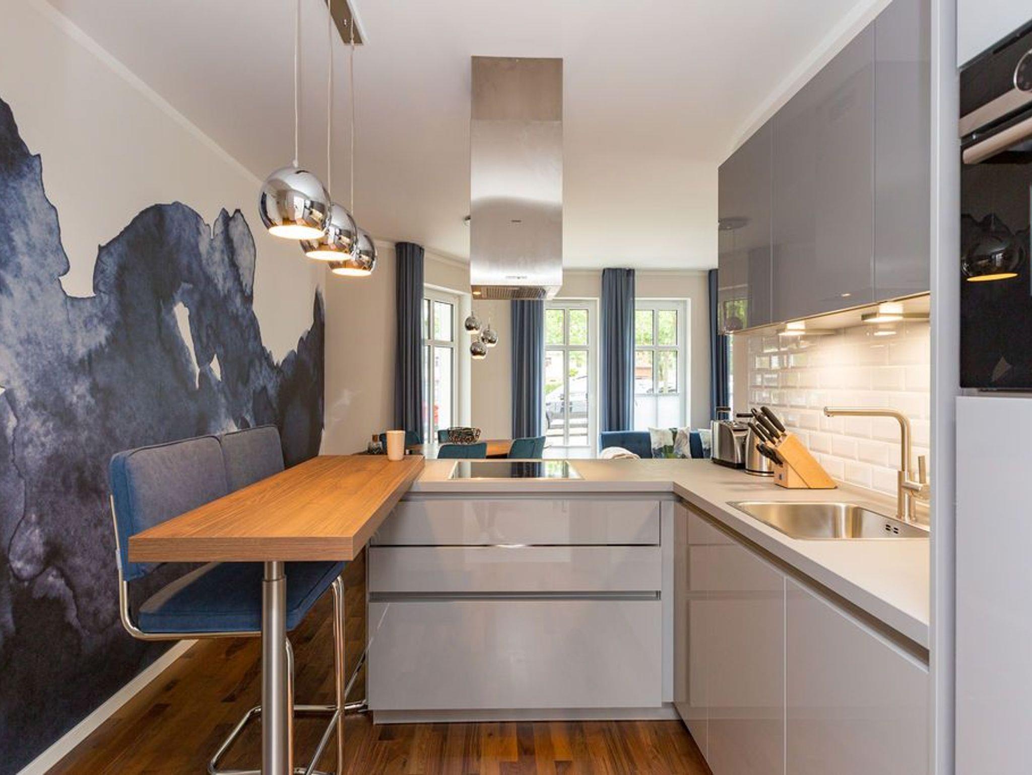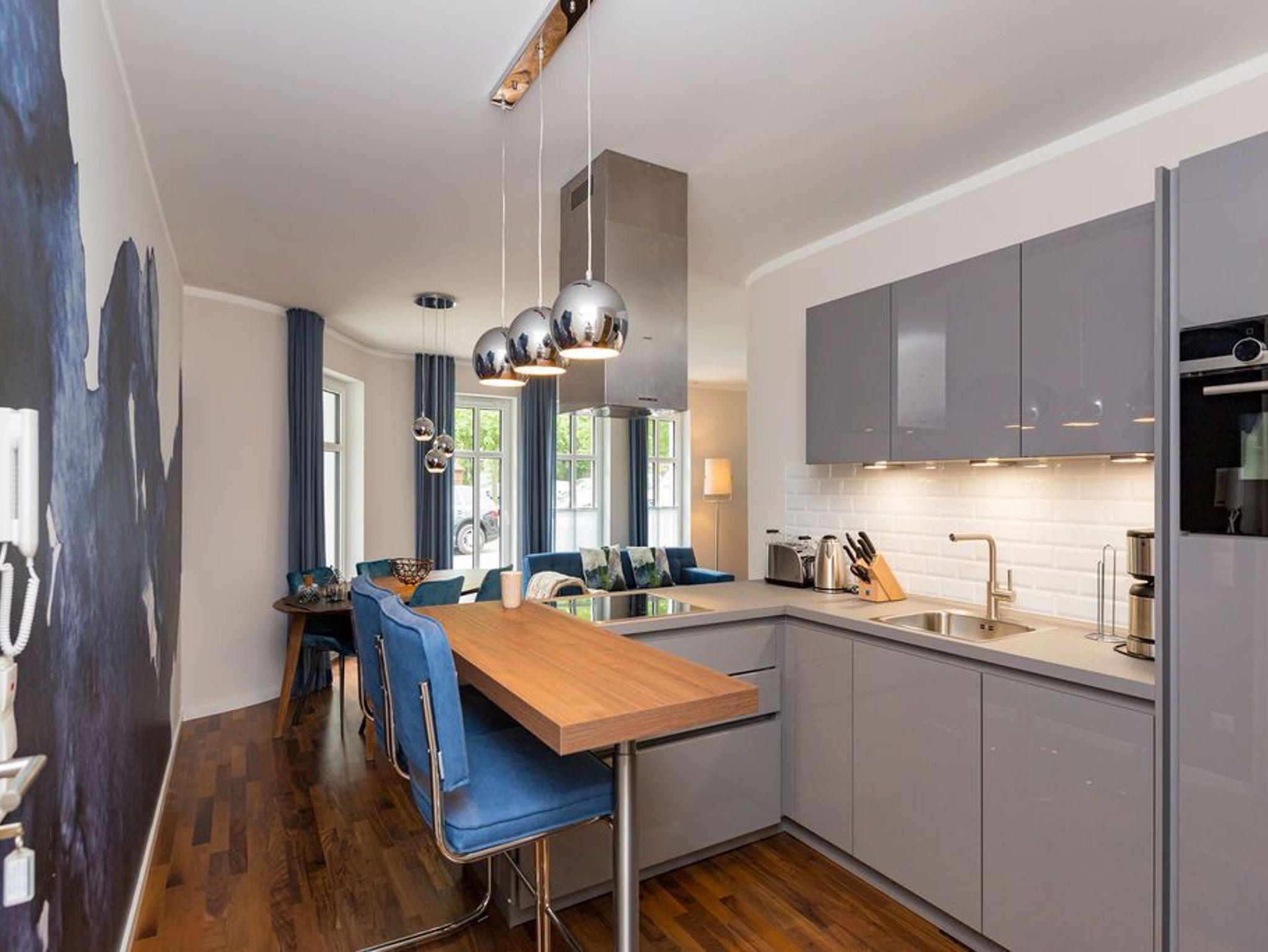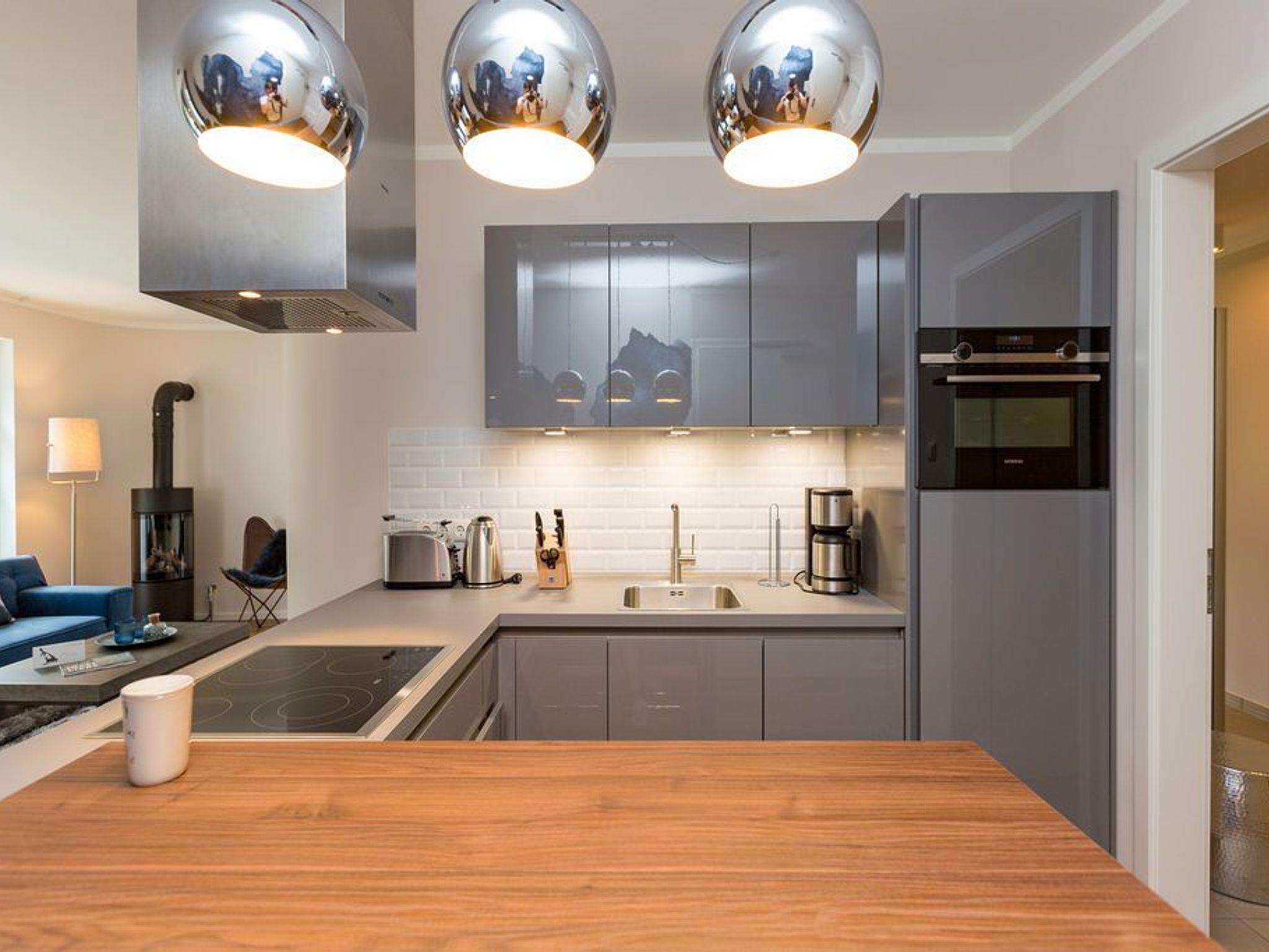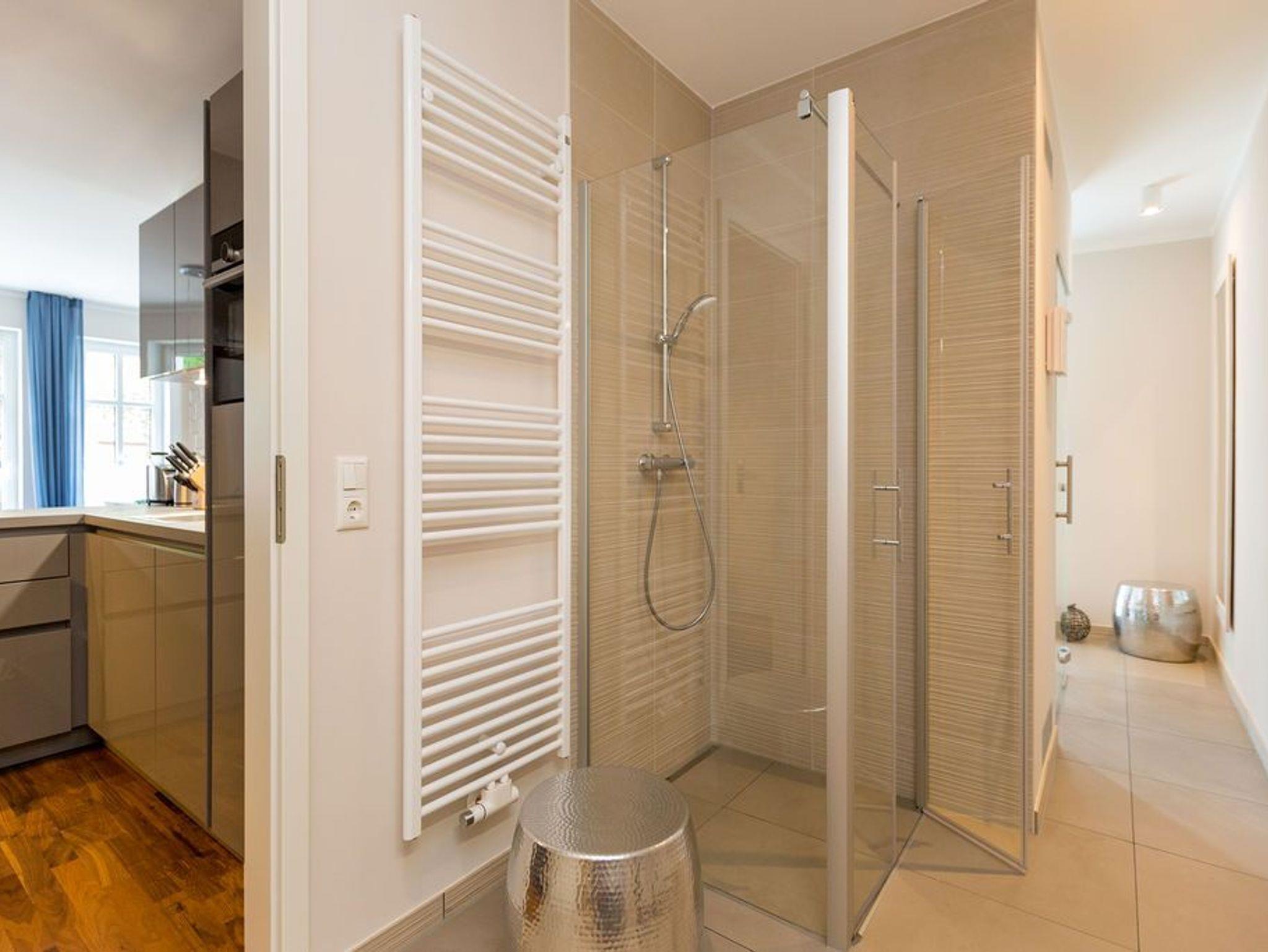Extravagant, stilvoll, nordisch ? all das trifft auf das 65 Quadratmeter große Appartement im Erdgeschoss gleichermaßen zu. Platz ist hier für zwei Personen plus ein Kleinkind bis zwei Jahre (im Kinderreisebett) und einem geliebten Vierbeiner. Wer sich gern mit modernem Design umgibt und exklusive Wohntrends liebt, wird sich in diesem Ferienparadies rundum wohl fühlen. Ob außergewöhnliche Wandgestaltung oder Wohn-Accessoires, die dem Auge gefällig, harmonisch aufeinander abgestimmt sind; ob modernes Lichtdesign oder Hightech-Ausstattung vom Feinsten ? in dieser Zwei-Raum-Wohnung stimmt einfach alles. Behaglichkeit und Gemütlichkeit empfängt Sie im großen Wohn-Esszimmer mit Sitzgruppe und offener Küche. Ein Gas-Kamin sorgt für kuschelige Wärme und jede Menge Romantik. Doch keine Angst, auch wenn der Kamin einmal nicht an ist, bekommen Sie keine kalten Füße. Die Wohnung ist mit einer Fußbodenheizung ausgestattet. Ein großer Flat-TV mit Blue-Ray-Player sorgt für Unterhaltung. Zwei wunderbar große Terrassen (Richtung Süd-West und Richtung Süd-Ost, je 11 Quadratmeter groß) eignen sich ideal zum Sonnenbaden oder gemütlichen Zusammensitzen. Doch auch im Wohnzimmer gibt es zum Essen und Sitzen einen schönen Holzesstisch. Die offene Wohnküche ist mit hochwertigen Markengeräten wie einem Induktionsherd, Geschirrspüler, Kühlschrank mit Gefrierfach sowie edlem Geschirr voll ausgestattet. Im Schlafzimmer wartet ein bequemes Boxspringdoppelbett (1,80 m x 2,00 m) nur darauf, Ihnen wohliges Schlafvergnügen zu bereiten. Ein geräumiger Schrank bietet reichlich Platz zur Ablage. Im Schlafzimmer befindet sich ebenfalls ein Flat-TV (40 Zoll). Das Bad ist eine kleine Wellness-Oase. Denn in der dort integrierten Sauna können Sie nicht nur gehörig ins Schwitzen kommen, sondern auch herrlich entspannen. Dusche, Waschtisch und ein separates WC sind auf dem neuesten Stand. Handtücher liegen bei der Anreise bereit und auch die Betten sind bereits bezogen. Zu der Wohnung gehört in der Tiefgarage ein Stellplatz.
