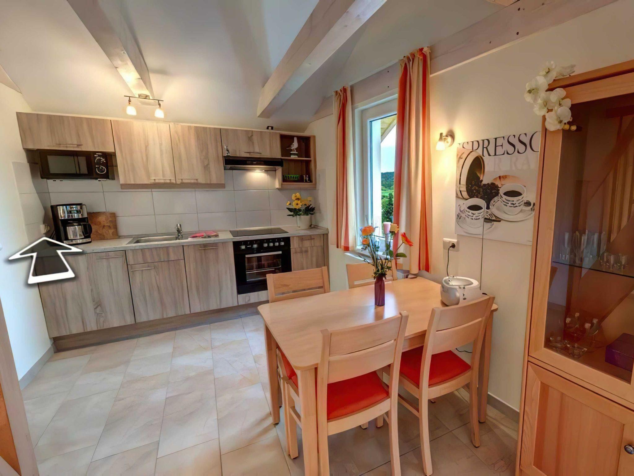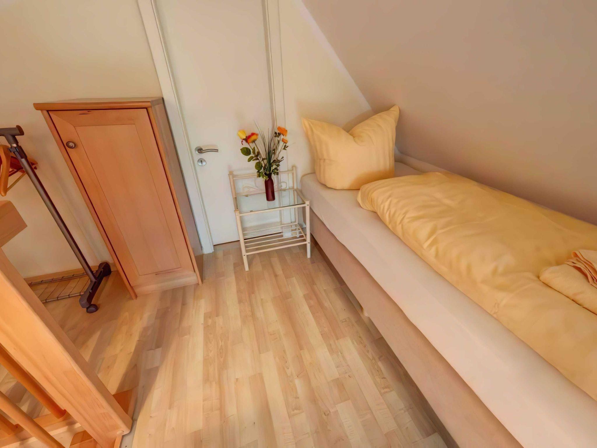 Obergeschoss 54 m² (4 Personen) Zur Ausstattung im Obergeschoss gehören 1 Schlafzimmer mit Doppeltbetten und ein Schlafzimmer mit 2 Einzelbetten. Das Schlafzimmer mit den beiden Einzelbetten befindet sich im Dachboden der Ferienwohnung und ist über eine Holztreppe erreichbar. Zur weiteren Ausstattung gehören ein Wohnzimmer mit integrierter vollausgestatteter Küche (Geschirrspüler, Ceranherd mit Backofen, Mikrowelle, Kaffeemaschine) einem Bad mit Dusche/WC und einen Balkon.