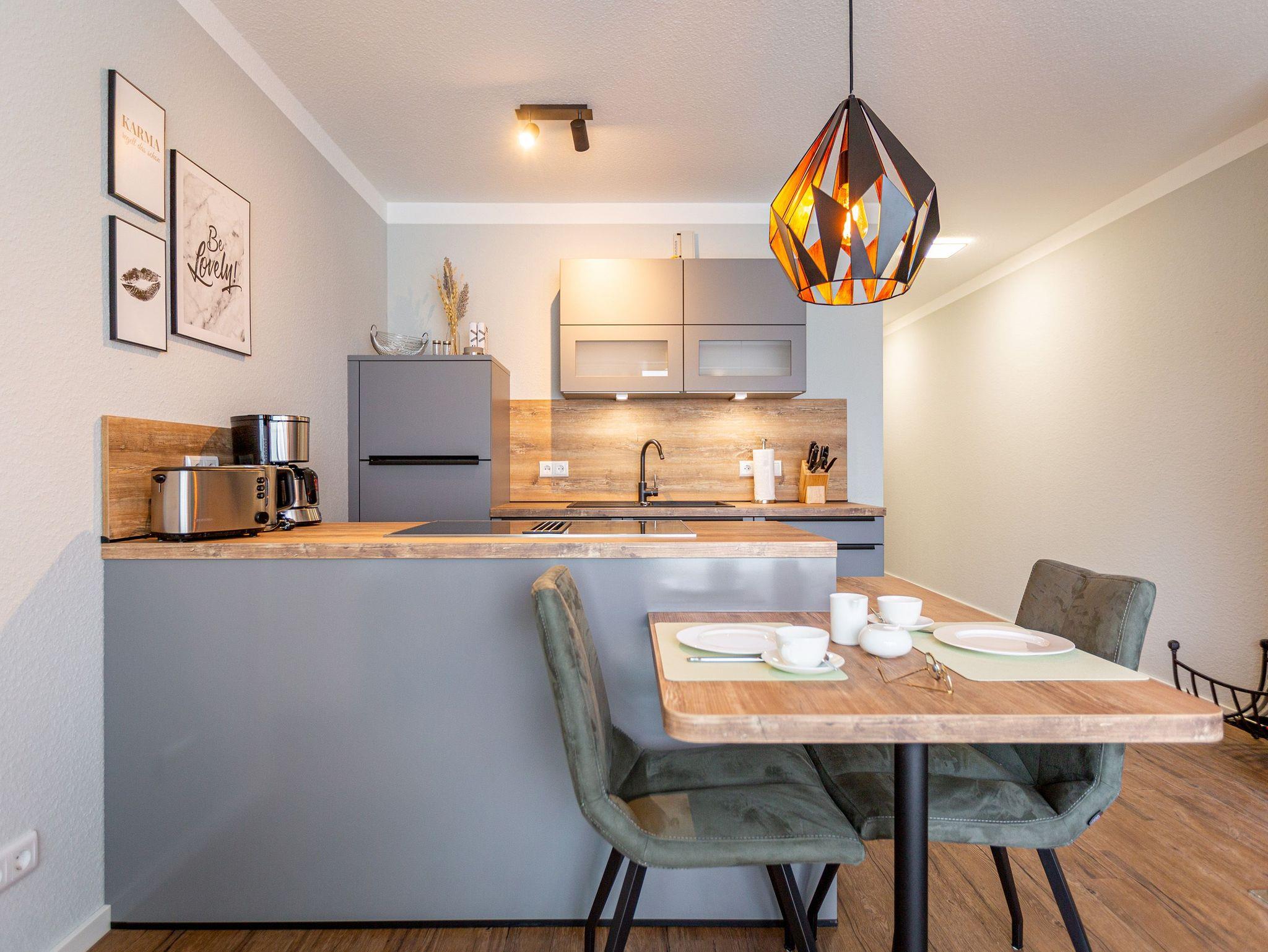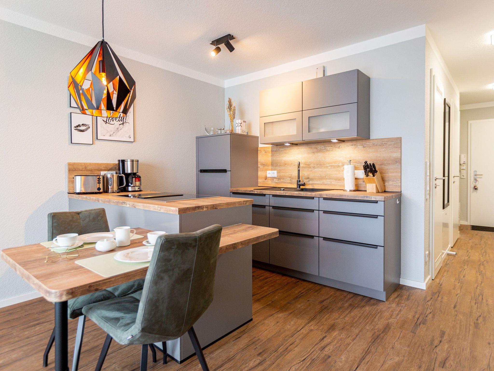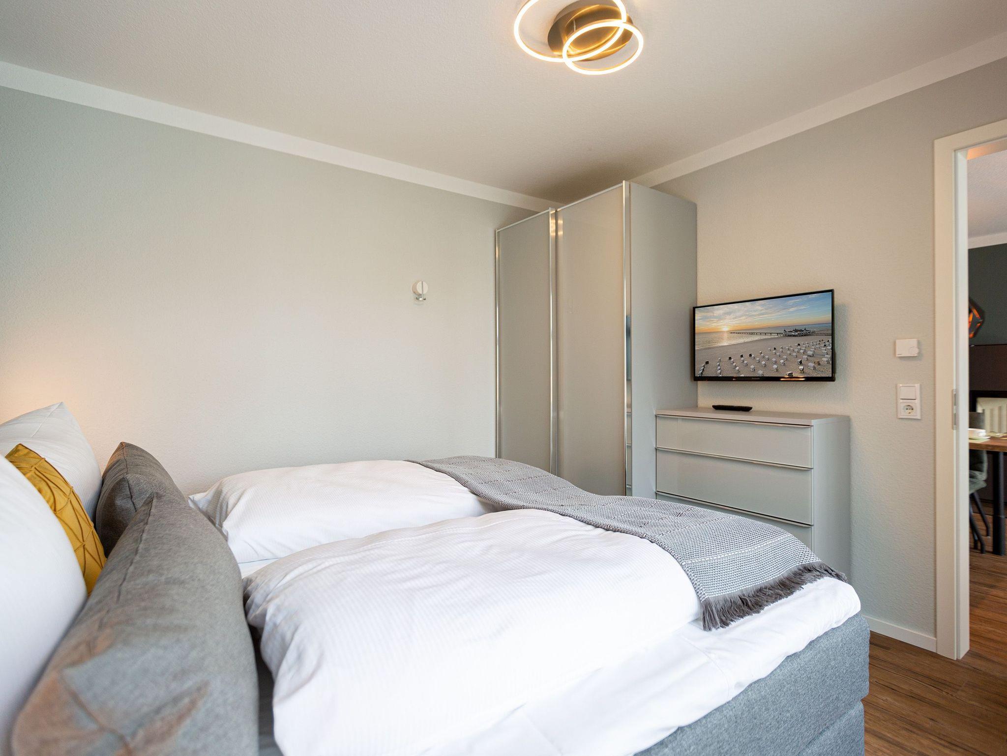 Mit viel Geschmack und einer Vorliebe für nordisches Design wurde dieses 54 Quadratmeter große Ferienparadies im Erdgeschoss des Quartiers Frohsinn eingerichtet. Die zwei Zimmer des Appartements sind eine kuschelige und zugleich stylische Wohlfühloase für zwei Personen. Das moderne Interieur besticht durch viel Eleganz. Ob Smart-TV oder schnelles und kostenfreies WLAN - Die Technik ist auf dem neuesten Stand. Das Wohnzimmer besitzt sogar einen Kamin. Freuen Sie sich auf entspannte Stunden zu zweit auf dem bequemen Sofa oder im Lesesessel. In das geräumige Wohnzimmer ist eine offene Küche mit einem Esstisch und zwei Stühlen intergiert. Voll ausgestattet mit hochwertigen Küchengeräten und edlem Geschirr bietet Sie allen Komfort. Vor dem Wohnzimmer befindet sich eine kleine Nord-Terrasse. Lassen Sie es sich auf den Gartenmöbeln oder den beiden Sonnenliegen gut gehen. Für erholsame Träume sorgt das behagliche Schlafzimmer. Auf dem komfortablen Boxspringdoppelbett (1,80 m x 2,00 m) schlafen Sie wie auf Wolken. Auch hier gibt es einen Smart-TV. Ein geräumiger Schrank bietet viel Platz. Das Badezimmer ist nicht einfach nur mit einer Dusche und einem WC ausgestattet. Hier wartet zudem eine kleine Finnische Sauna nur darauf, Sie an kühlen Inseltagen muschelig aufzuwärmen. Handtücher liegen für Sie bereit. Und auch die Betten sind bei Anreise schon bezogen. Zur Wohnung gehört ein Stellplatz in der Tiefgarage. Für ihre Fahrräder gibt es einen separaten Kellerraum.