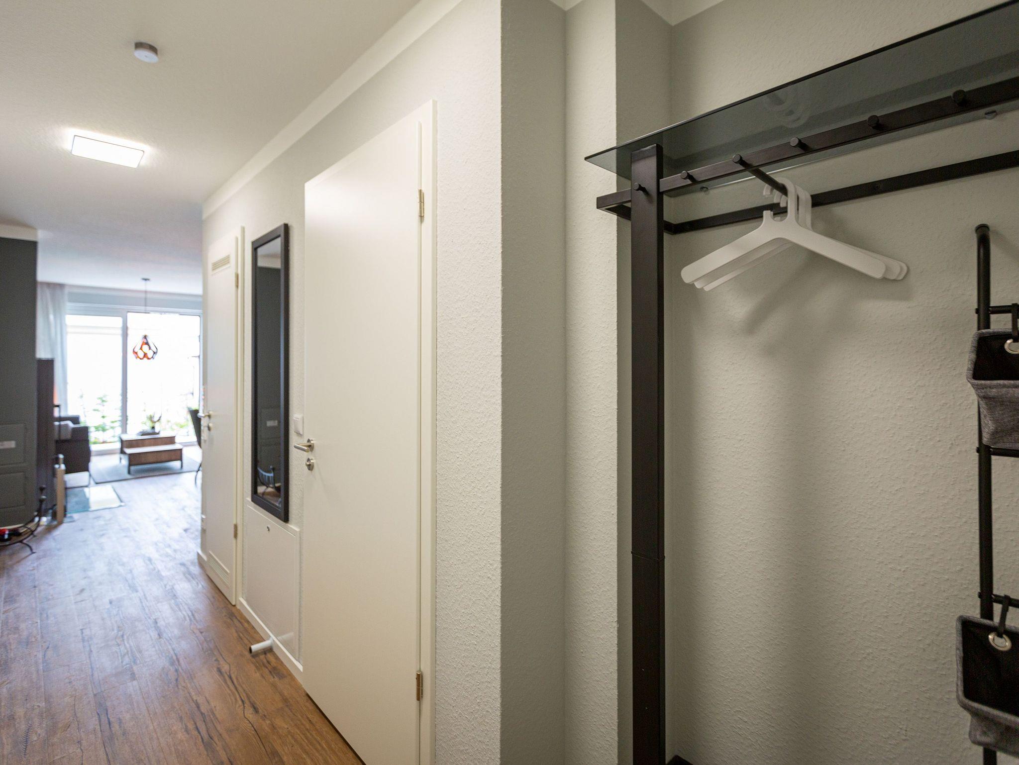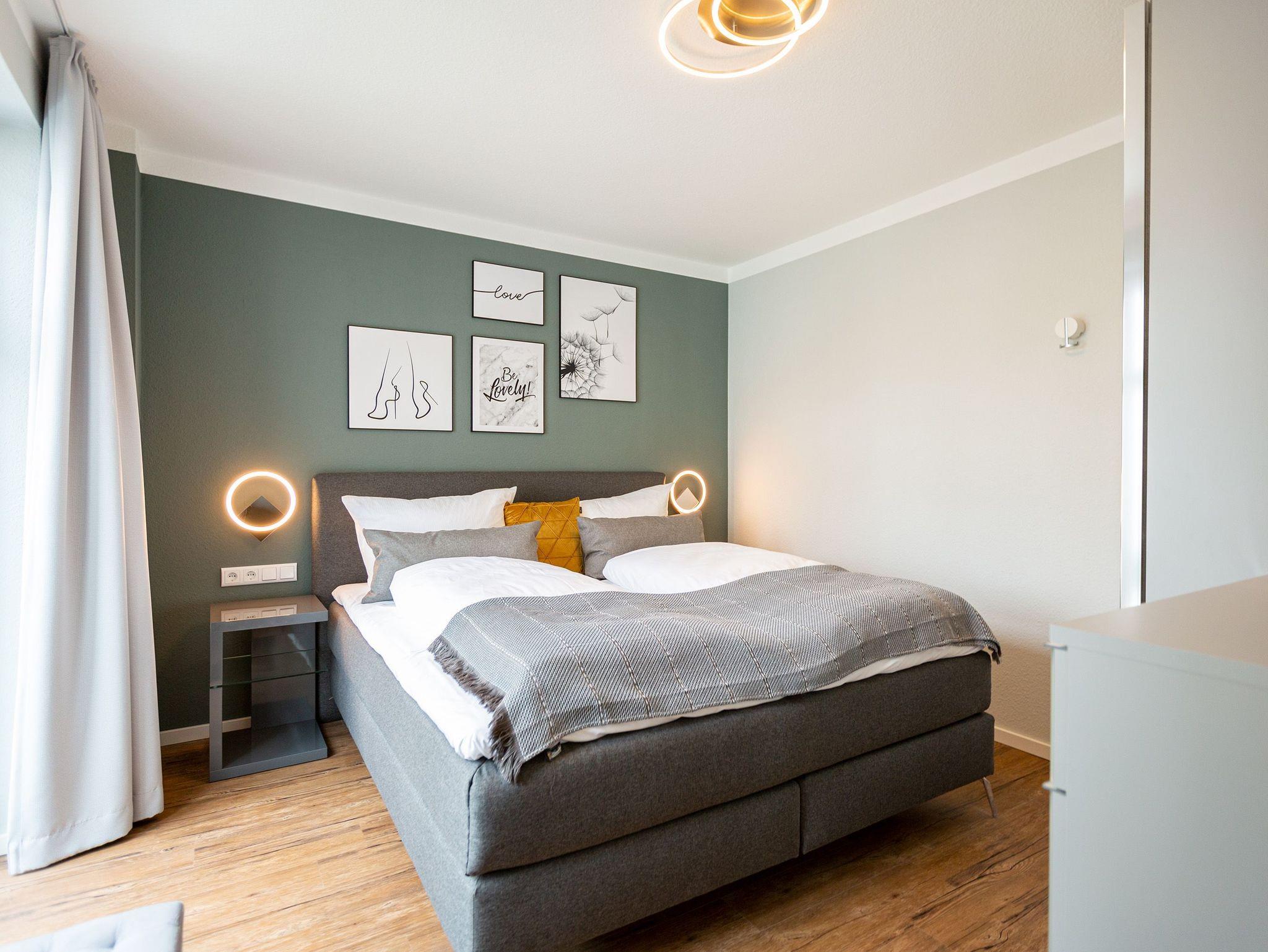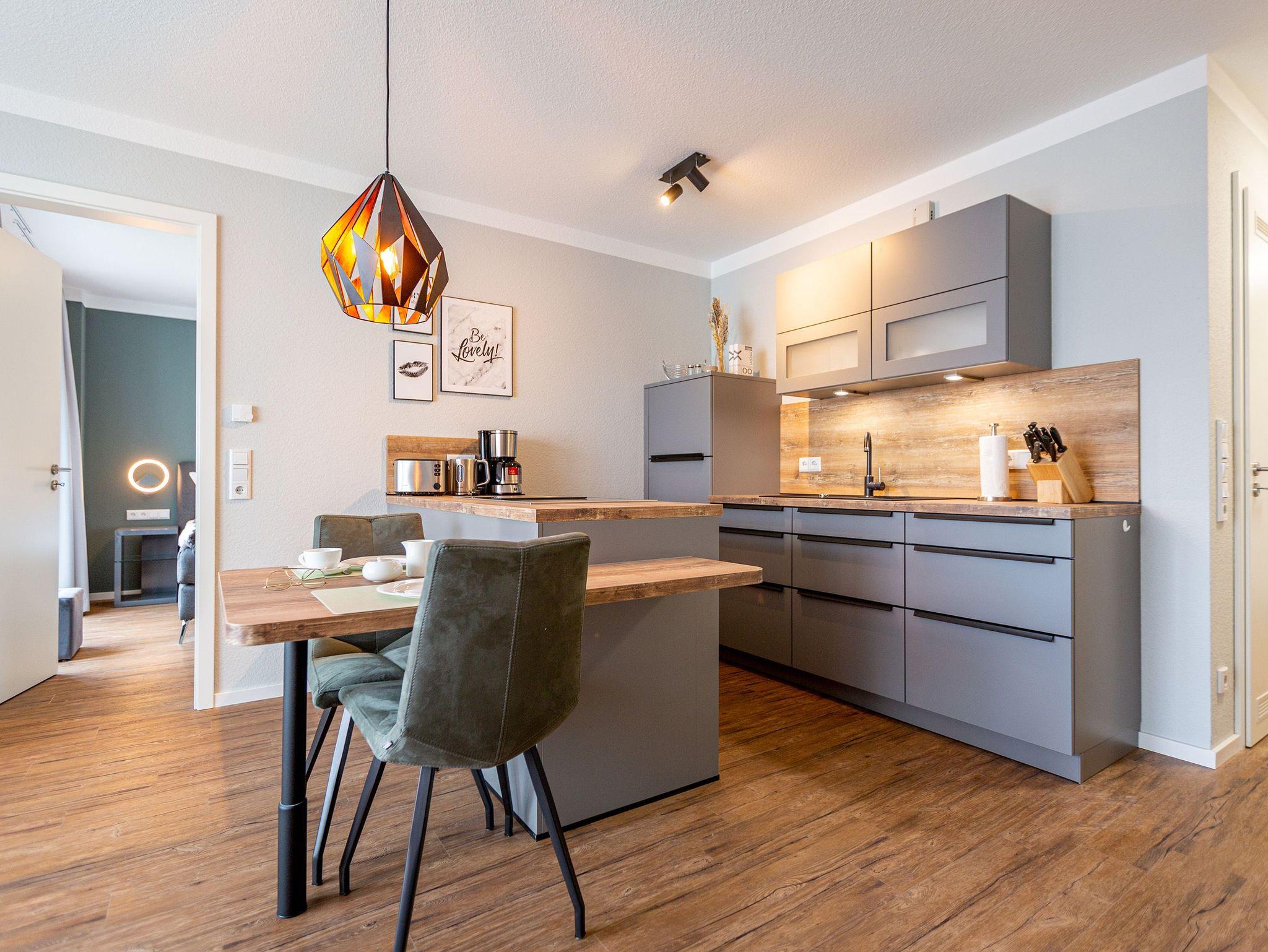 Mit viel Geschmack und einer Vorliebe für nordisches Design wurde dieses 54 Quadratmeter große Ferienparadies im Erdgeschoss des Quartiers Frohsinn eingerichtet. Die zwei Zimmer des Appartements sind eine kuschelige und zugleich stylische Wohlfühloase für zwei Personen. Das moderne Interieur besticht durch viel Eleganz. Ob Smart-TV oder schnelles und kostenfreies WLAN - Die Technik ist auf dem neuesten Stand. Das Wohnzimmer besitzt sogar einen Kamin. Freuen Sie sich auf entspannte Stunden zu zweit auf dem bequemen Sofa oder im Lesesessel. In das geräumige Wohnzimmer ist eine offene Küche mit einem Esstisch und zwei Stühlen intergiert. Voll ausgestattet mit hochwertigen Küchengeräten und edlem Geschirr bietet Sie allen Komfort. Vor dem Wohnzimmer befindet sich eine kleine Nord-Terrasse. Lassen Sie es sich auf den Gartenmöbeln oder den beiden Sonnenliegen gut gehen. Für erholsame Träume sorgt das behagliche Schlafzimmer. Auf dem komfortablen Boxspringdoppelbett (1,80 m x 2,00 m) schlafen Sie wie auf Wolken. Auch hier gibt es einen Smart-TV. Ein geräumiger Schrank bietet viel Platz. Das Badezimmer ist nicht einfach nur mit einer Dusche und einem WC ausgestattet. Hier wartet zudem eine kleine Finnische Sauna nur darauf, Sie an kühlen Inseltagen muschelig aufzuwärmen. Handtücher liegen für Sie bereit. Und auch die Betten sind bei Anreise schon bezogen. Zur Wohnung gehört ein Stellplatz in der Tiefgarage. Für ihre Fahrräder gibt es einen separaten Kellerraum.