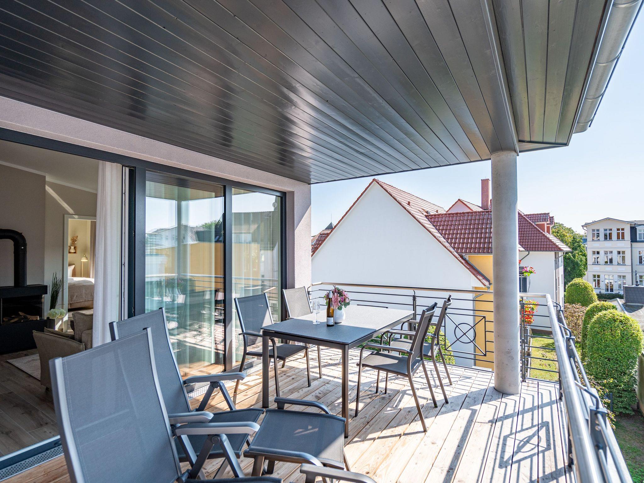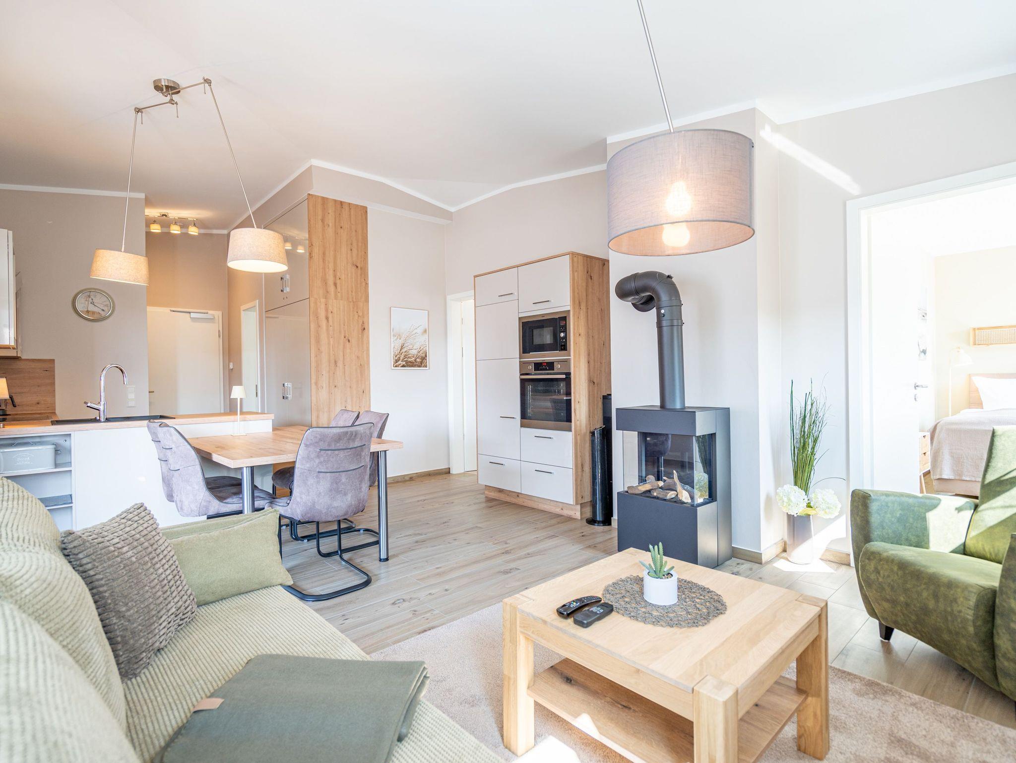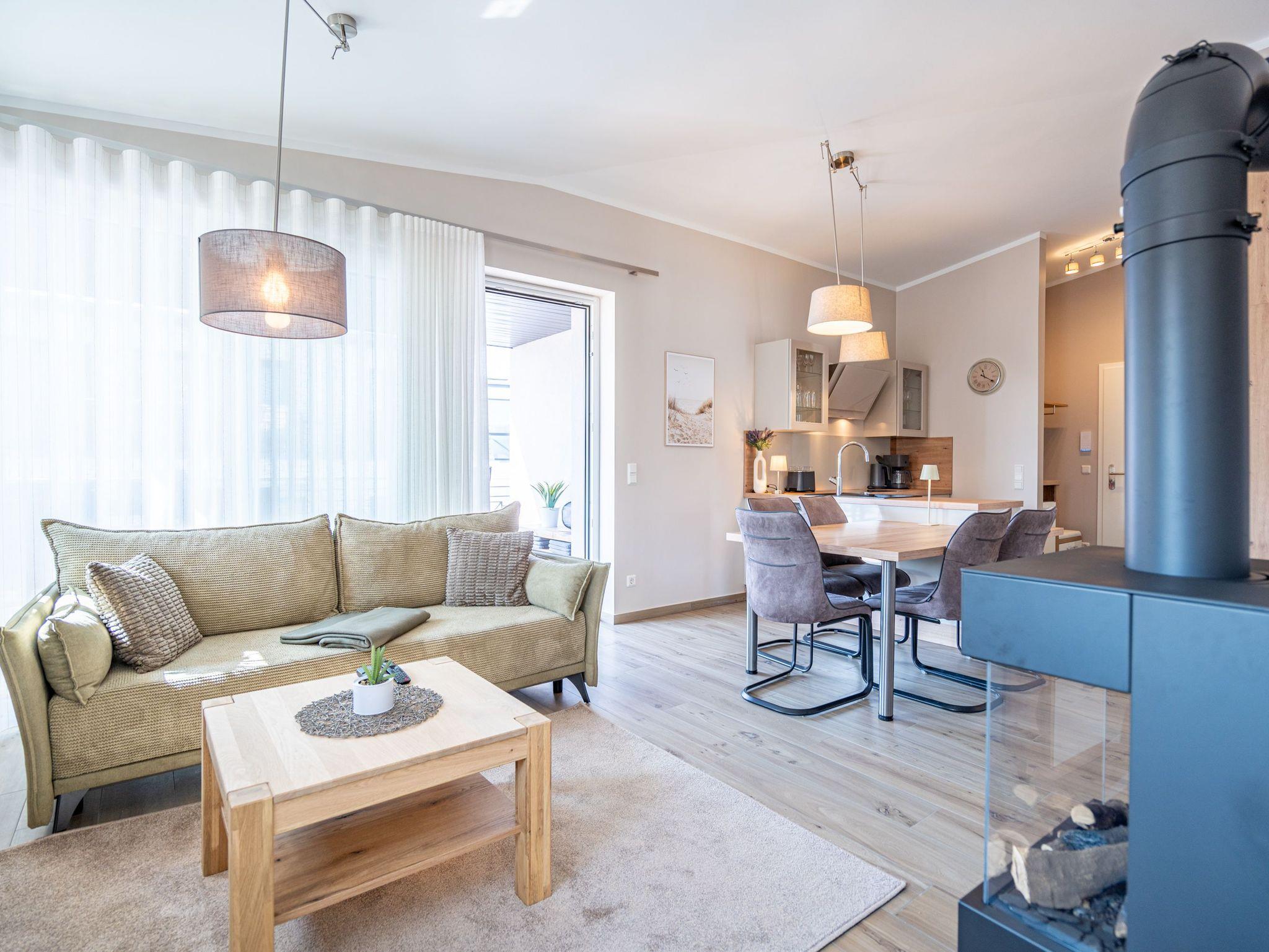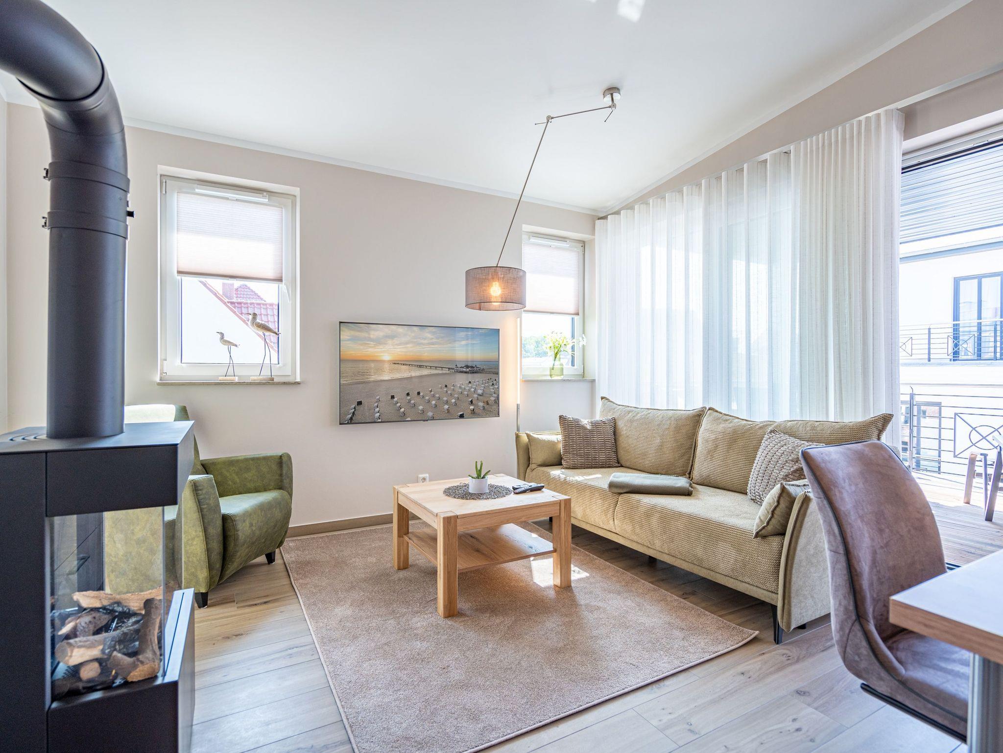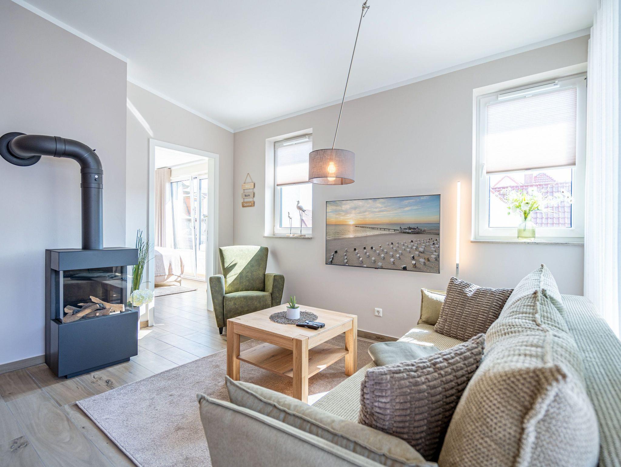 Moderne 3-Raum-Ferienwohnung mit Sauna, Kamin und Balkon in Ahlbeck, nahe Strand und Radwegen.