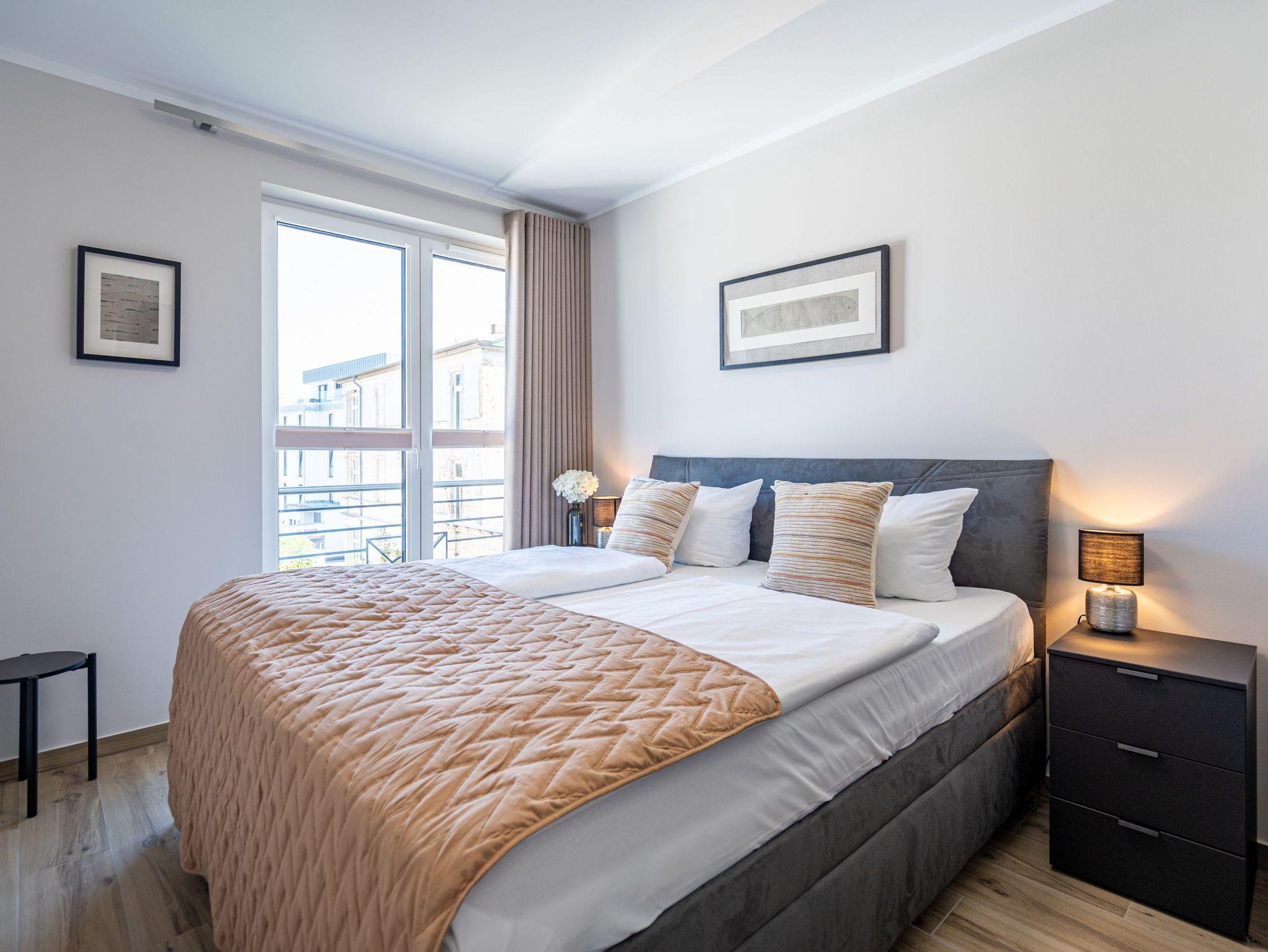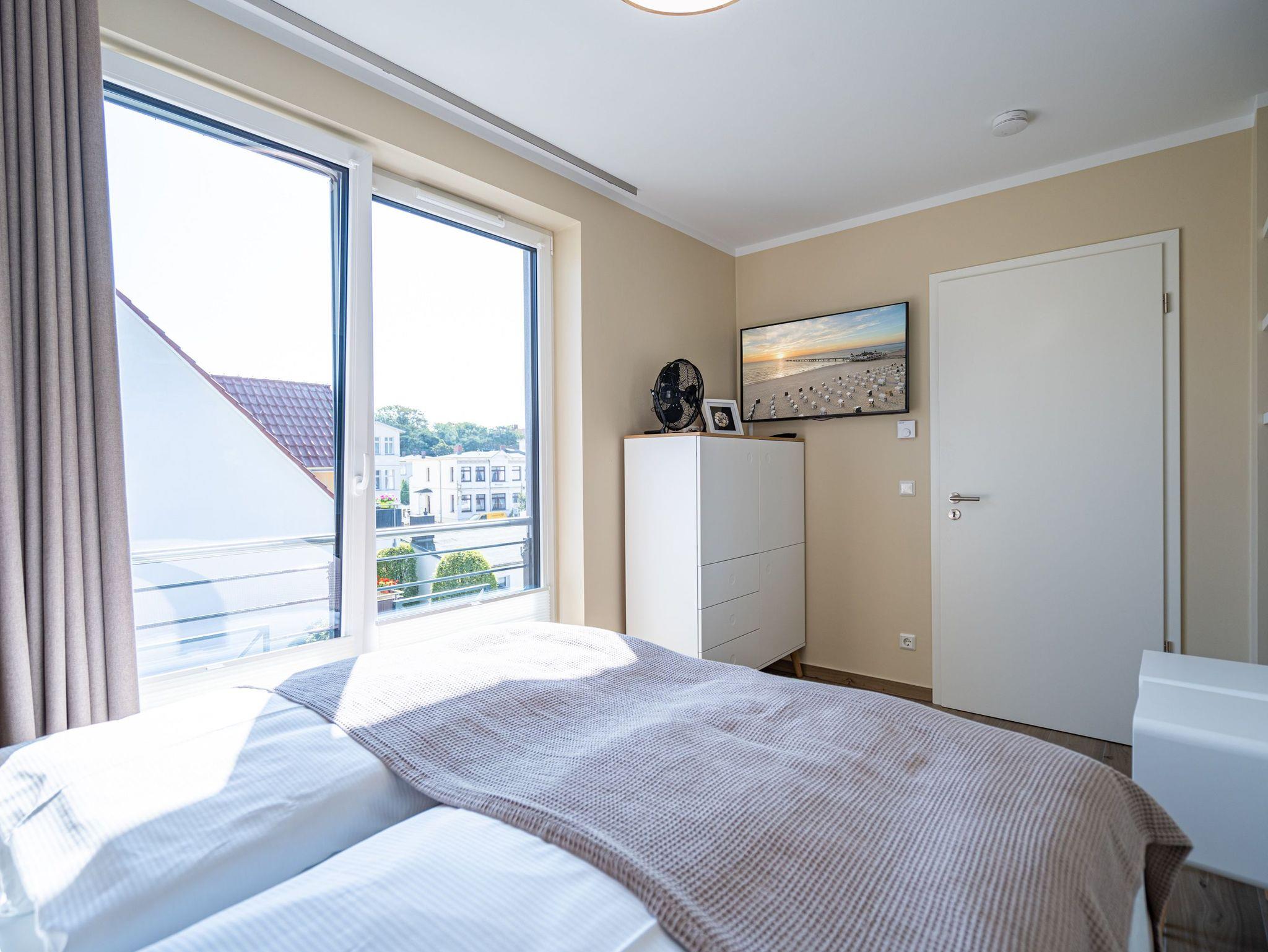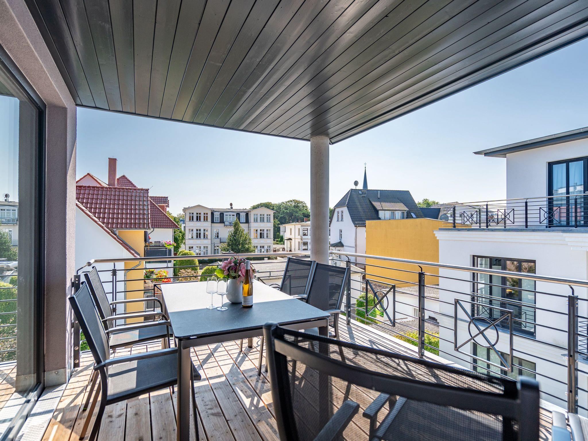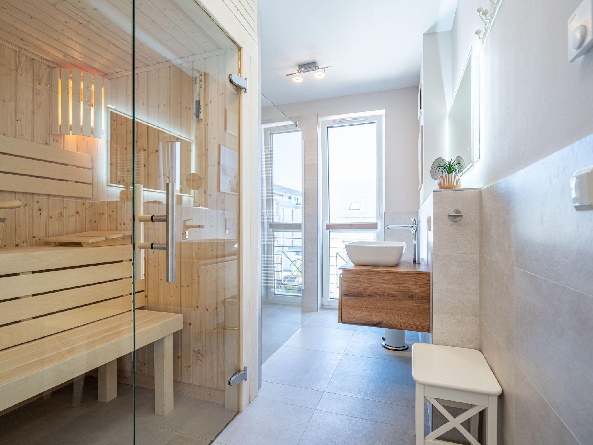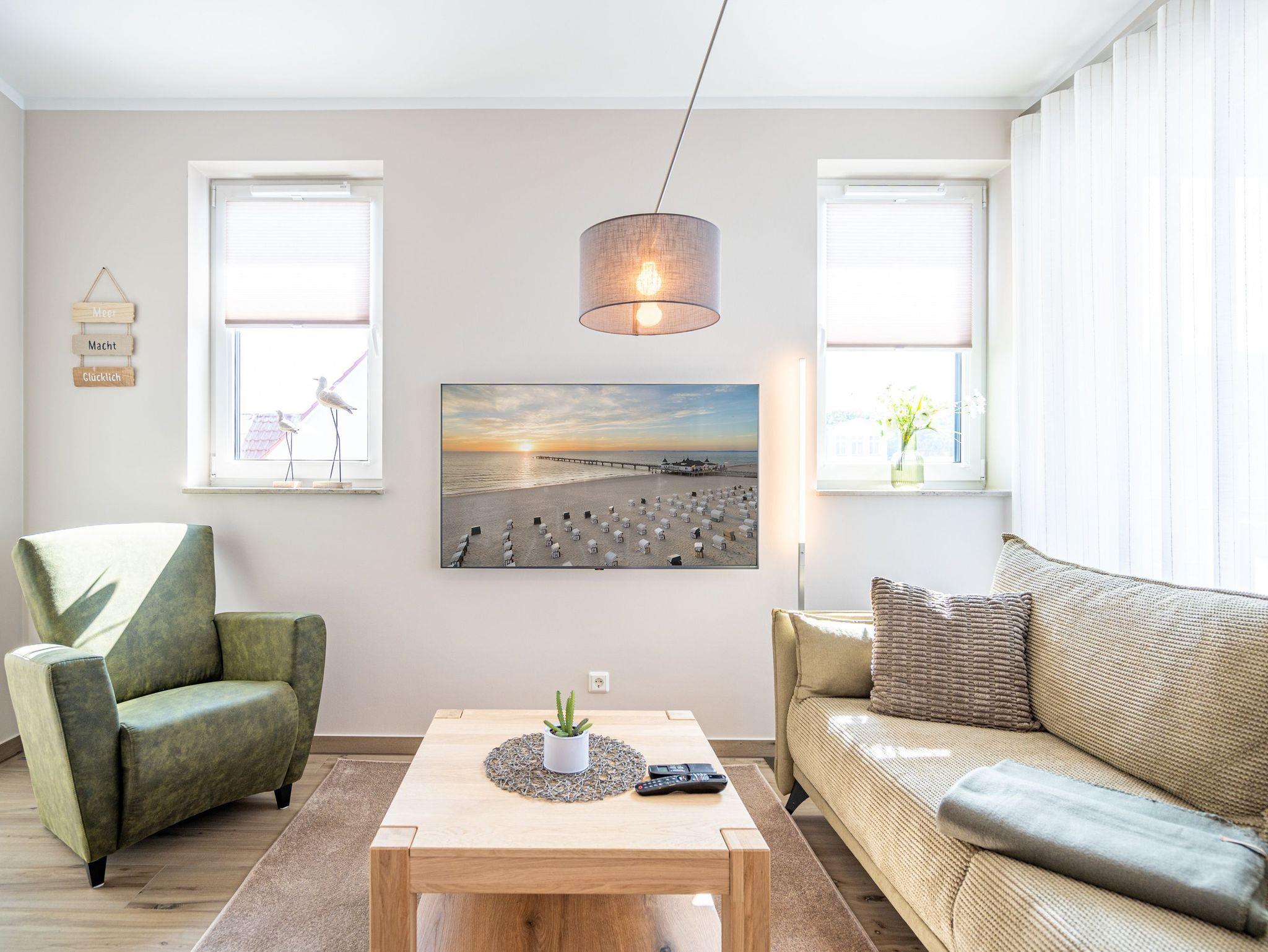 Moderne 3-Raum-Ferienwohnung mit Sauna, Kamin und Balkon in Ahlbeck, nahe Strand und Radwegen.