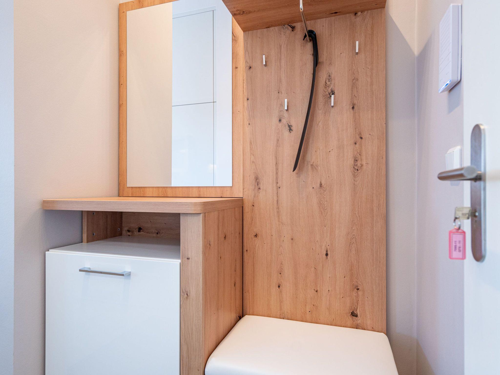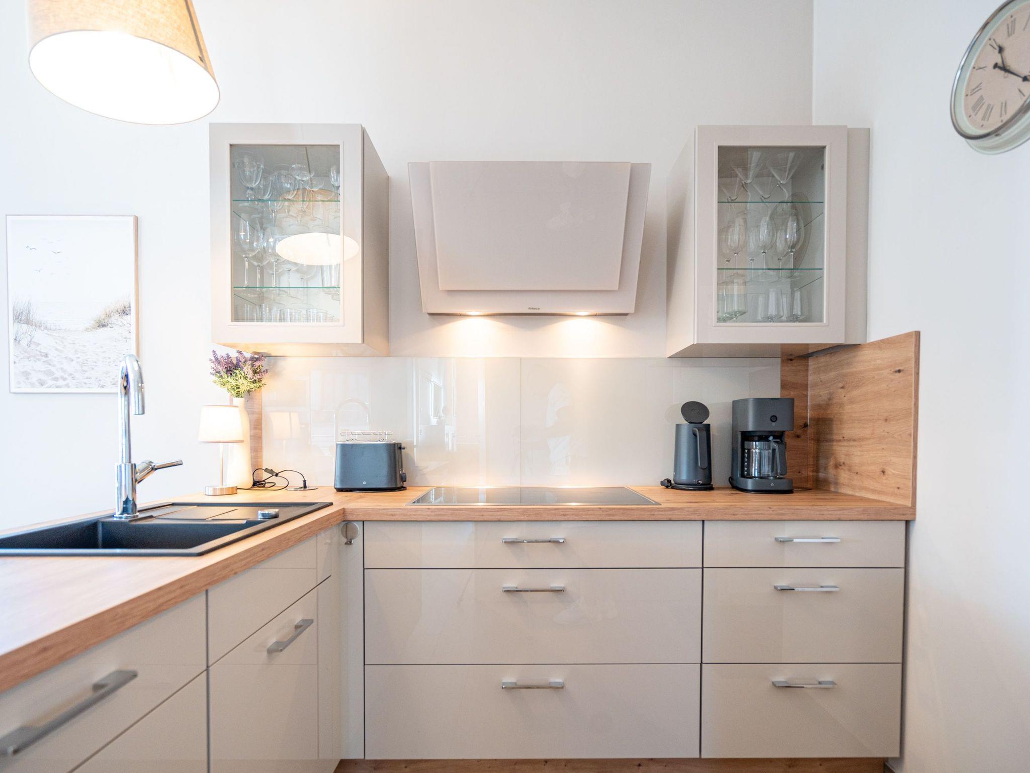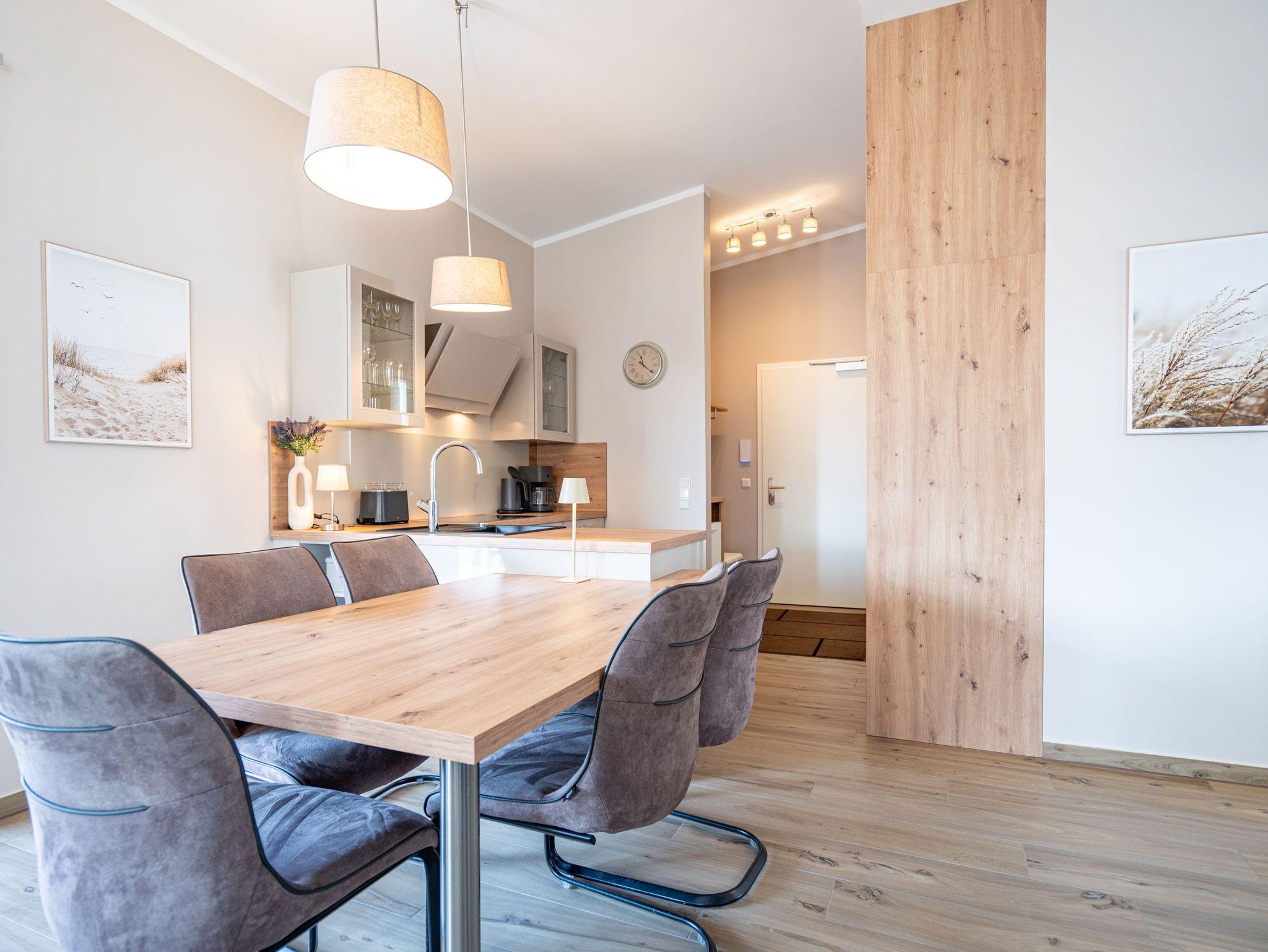 Die 3-Raum-Ferienwohnung Nr. 11 im Dachgeschoss des Quartier 6 bietet auf 70 m² ein gemütliches Urlaubsdomizil für bis zu 4 Personen. Der offene Wohnbereich lädt mit einer voll ausgestatteten Küchenzeile, die über einen Induktionsherd, Mikrowelle und Backofen verfügt, zu geselligen Kochabenden ein. Ein Essplatz für 4 Personen steht bereit, während die gemütliche Sitzgruppe mit Flat-TV, einem Radio mit Bluetooth-Box und einem per Fernbedienung gesteuerten Gas-Kamin für entspannte Stunden sorgt. Von hier aus gelangen Sie auf den sonnigen Süd-Ost-Balkon, der mit etwa 15 m² ausreichend Platz für 4 Personen sowie zwei Sonnenliegen bietet ideal, um die frische Luft und die Aussicht zu genießen.