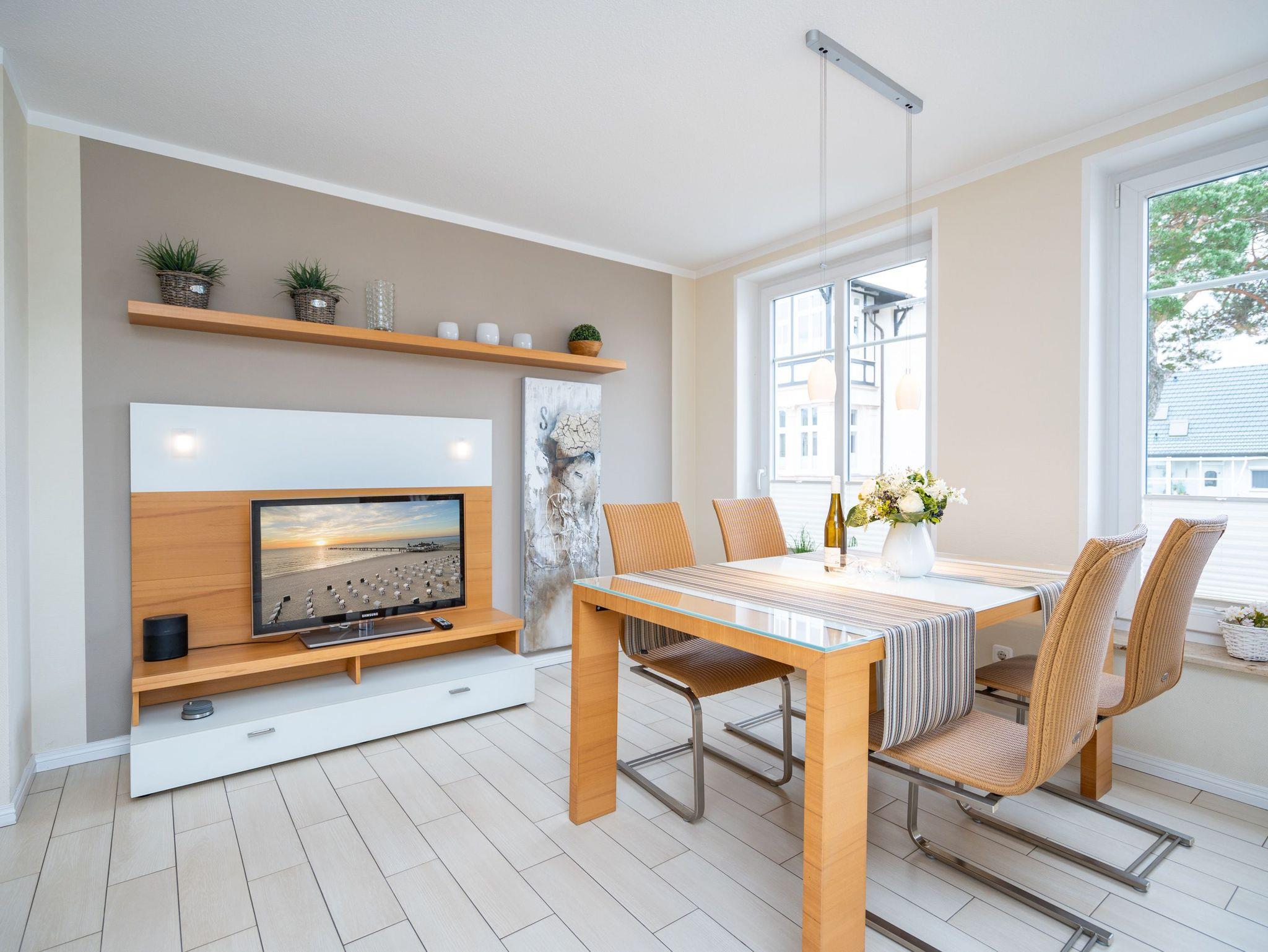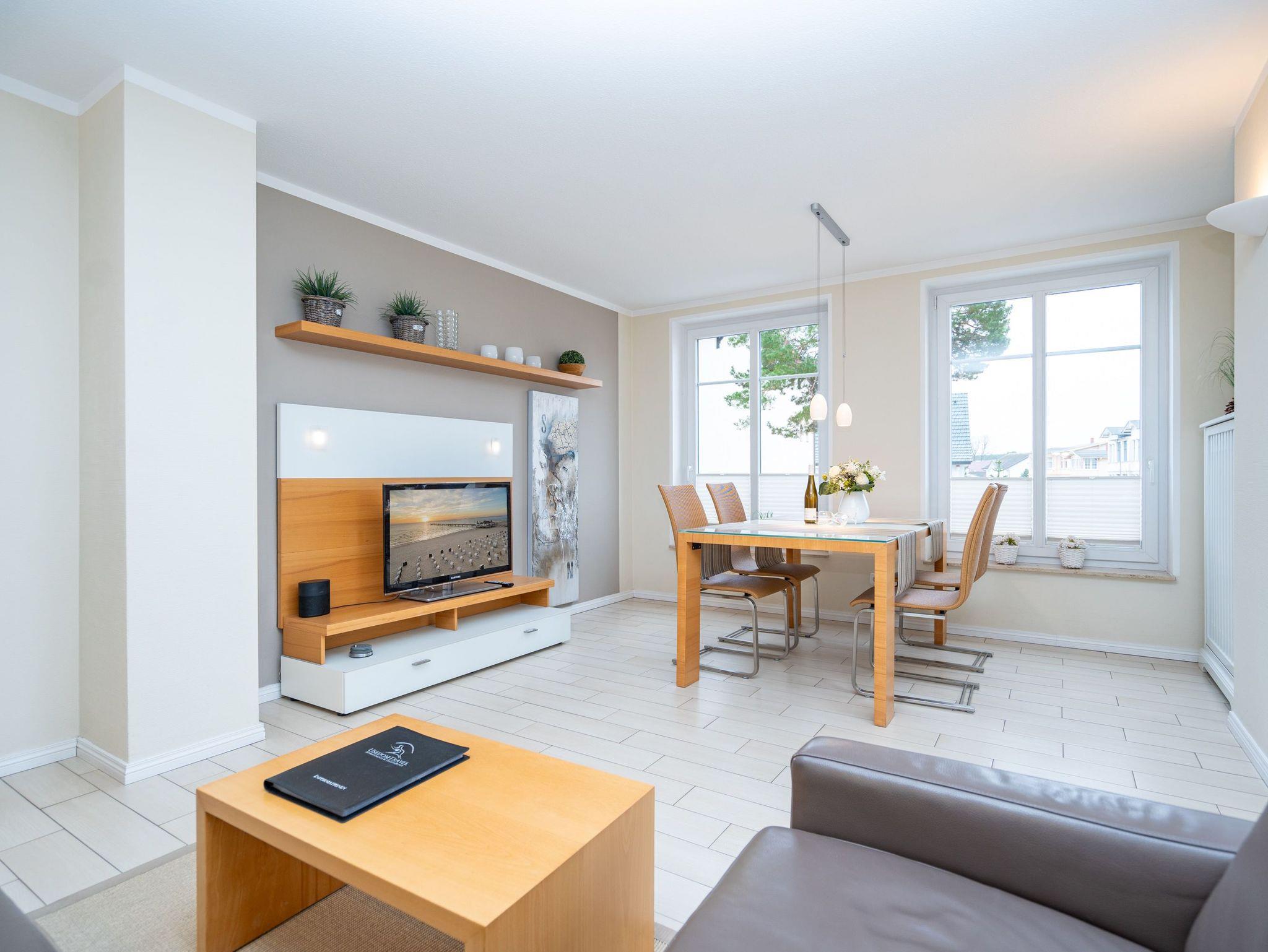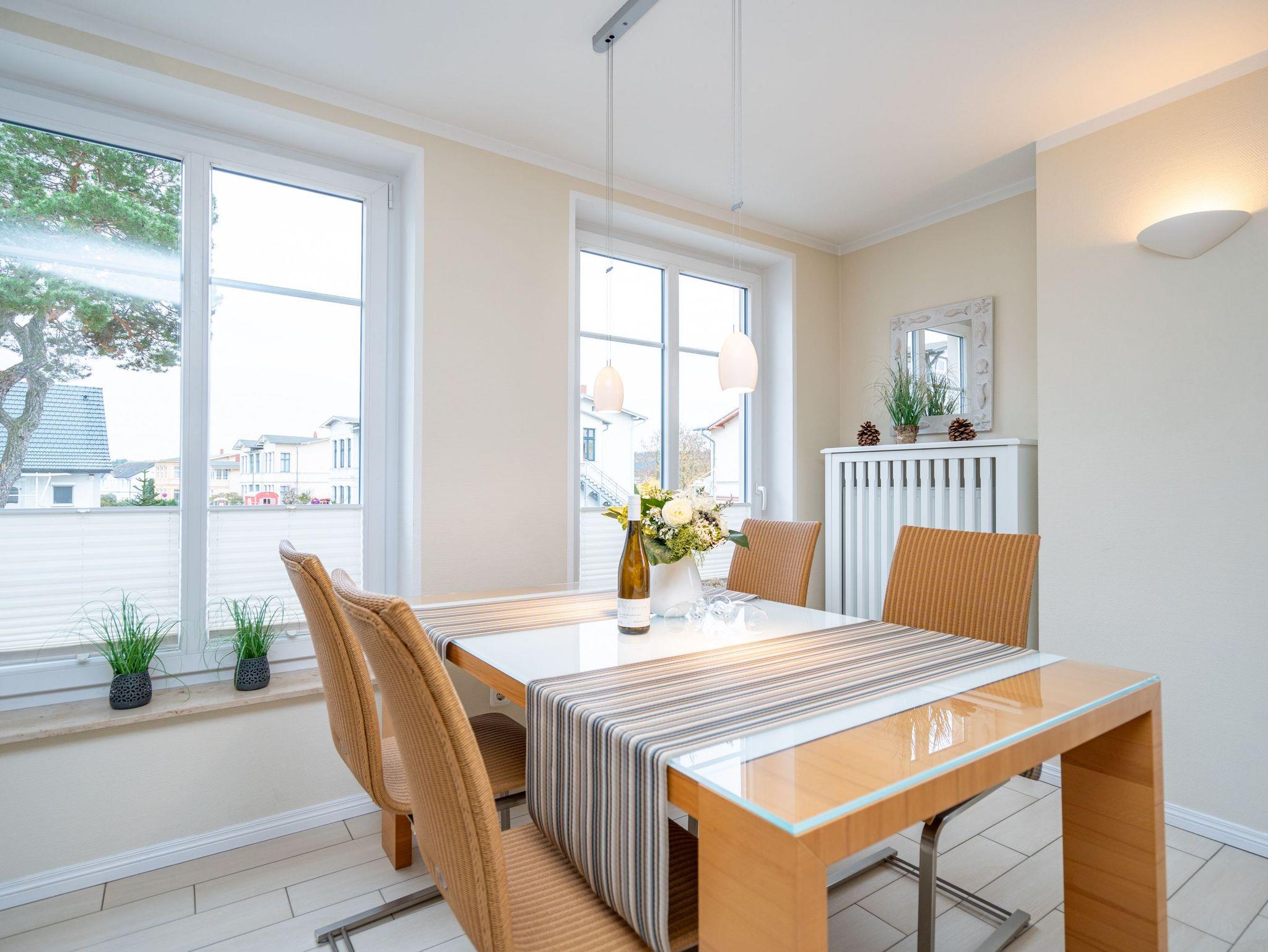 Modern. Lichtdurchflutet. Stilsicher ? so empfängt Sie die Ferienwohnung 5 im 1. Obergeschoss des neuen Hauses. Warme, an Strand und Meer erinnernde Farben, ausgesuchte Materialien und stilvolle Dekorationen verleihen dem komplett mit hellen italienischen Fliesen ausgelegten Appartement Finesse und Leichtigkeit. Der Wohnbereich ist mit einer bequemen Ledercouch und technischen Feinheiten (Flat-TV, Bose Sound Speaker 300 und Küchenradio) ausgestattet, von hier aus haben Sie Zugang zum sonnigen Südbalkon. Vom schönen Essplatz am Fenster genießen Sie den Ausblick auf die renovierten Villen in der Vinetastraße. Eine offene, komplett ausgestattete Küche mit Granitarbeitsplatte, ein gemütliches Schlafzimmer mit Doppelbett (1,80 m x 2 m) und Flat-TV sowie ein großzügiges Duschbad mit Fenster ergänzen die Wohnung und bieten Platz für 2 Personen. Als kleines Sommer-Highlight stellen wir Ihnen in den warmen Monaten (je nach Witterung) einen Strandkorb am Strand zur Verfügung ? genießen Sie die Auszeit! Das WLAN-Netz ist kostenfrei nutzbar. Zur Wohnung gehört außerdem der Tiefgaragenstellplatz Nr. 5 ? bequem, sicher und direkt am Haus. Ankommen, abschalten, Urlaub genießen.