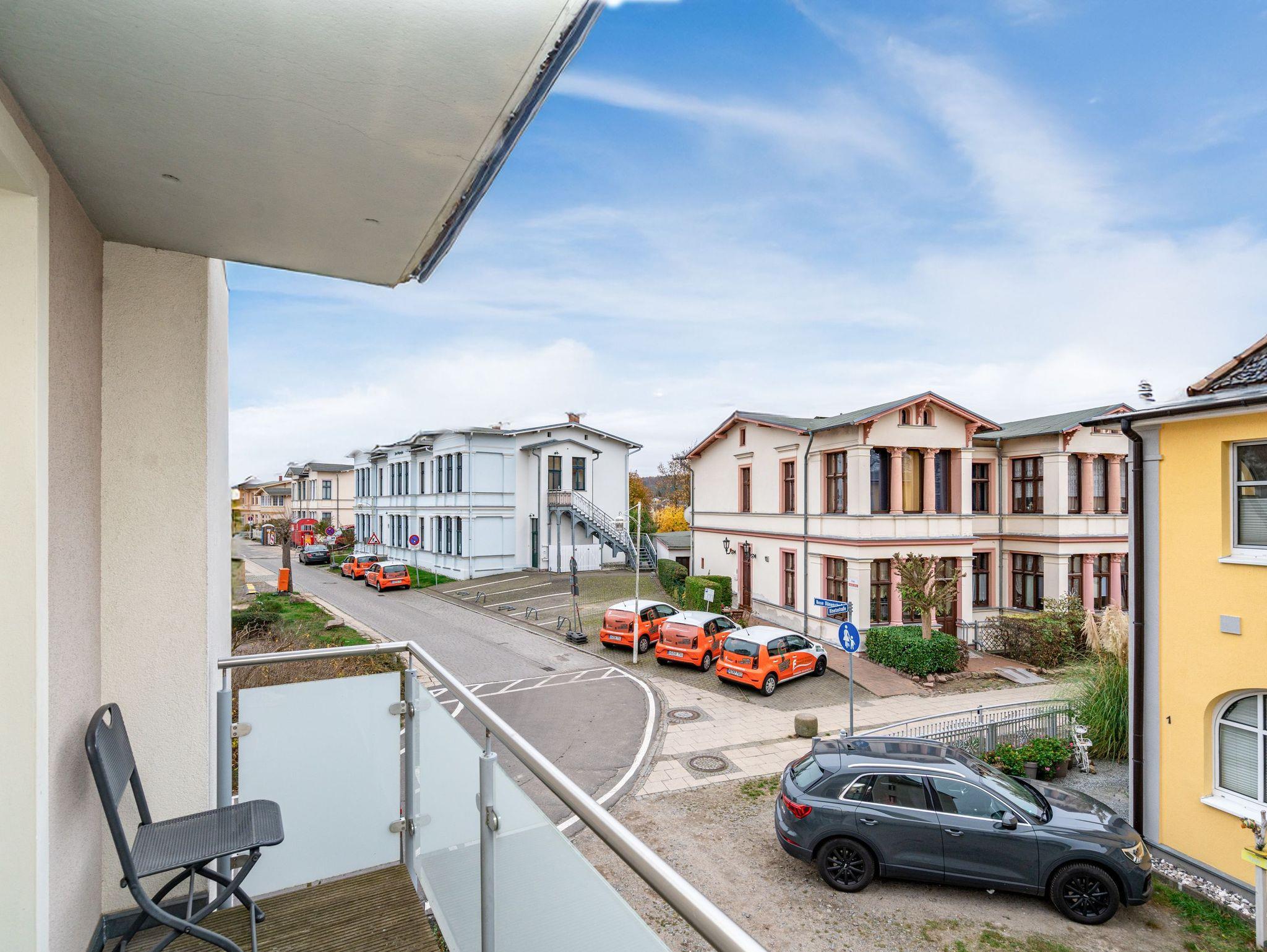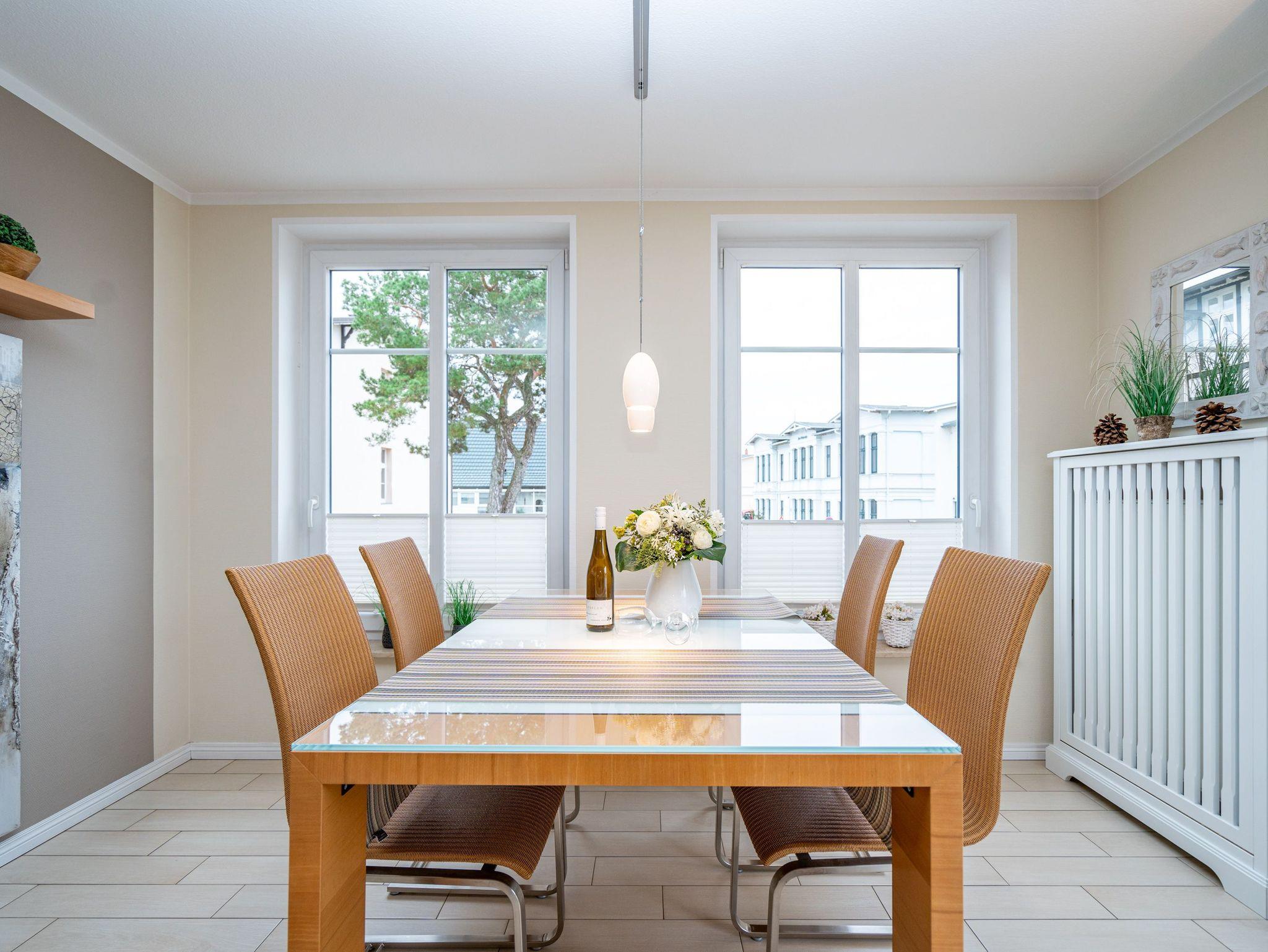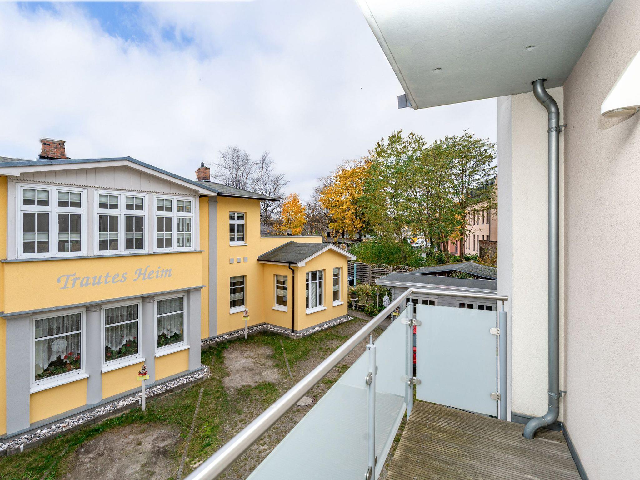 Modern. Lichtdurchflutet. Stilsicher ? so empfängt Sie die Ferienwohnung 5 im 1. Obergeschoss des neuen Hauses. Warme, an Strand und Meer erinnernde Farben, ausgesuchte Materialien und stilvolle Dekorationen verleihen dem komplett mit hellen italienischen Fliesen ausgelegten Appartement Finesse und Leichtigkeit. Der Wohnbereich ist mit einer bequemen Ledercouch und technischen Feinheiten (Flat-TV, Bose Sound Speaker 300 und Küchenradio) ausgestattet, von hier aus haben Sie Zugang zum sonnigen Südbalkon. Vom schönen Essplatz am Fenster genießen Sie den Ausblick auf die renovierten Villen in der Vinetastraße. Eine offene, komplett ausgestattete Küche mit Granitarbeitsplatte, ein gemütliches Schlafzimmer mit Doppelbett (1,80 m x 2 m) und Flat-TV sowie ein großzügiges Duschbad mit Fenster ergänzen die Wohnung und bieten Platz für 2 Personen. Als kleines Sommer-Highlight stellen wir Ihnen in den warmen Monaten (je nach Witterung) einen Strandkorb am Strand zur Verfügung ? genießen Sie die Auszeit! Das WLAN-Netz ist kostenfrei nutzbar. Zur Wohnung gehört außerdem der Tiefgaragenstellplatz Nr. 5 ? bequem, sicher und direkt am Haus. Ankommen, abschalten, Urlaub genießen.