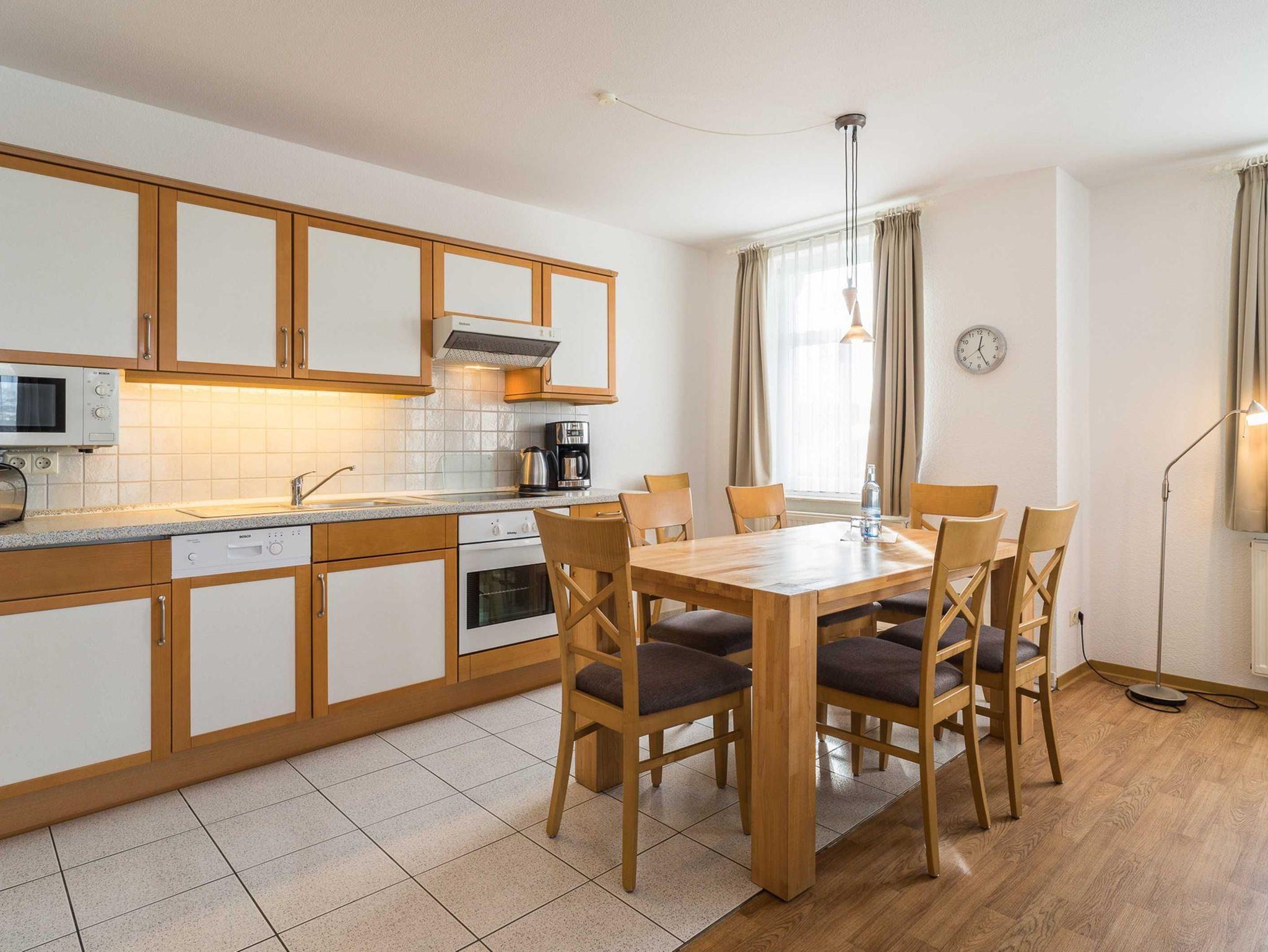 Die moderne, voll ausgestattete Küchenzeile mit Cerankochfeld, Backofen, Geschirrspüler, Mikrowelle, Kaffeemaschine, Wasserkocher und Toaster bietet optimalen Komfort für Selbstversorger. Zur technischen Ausstattung gehören Flachbild-TV, Radio-CD-Player und kostenfreies WLAN.