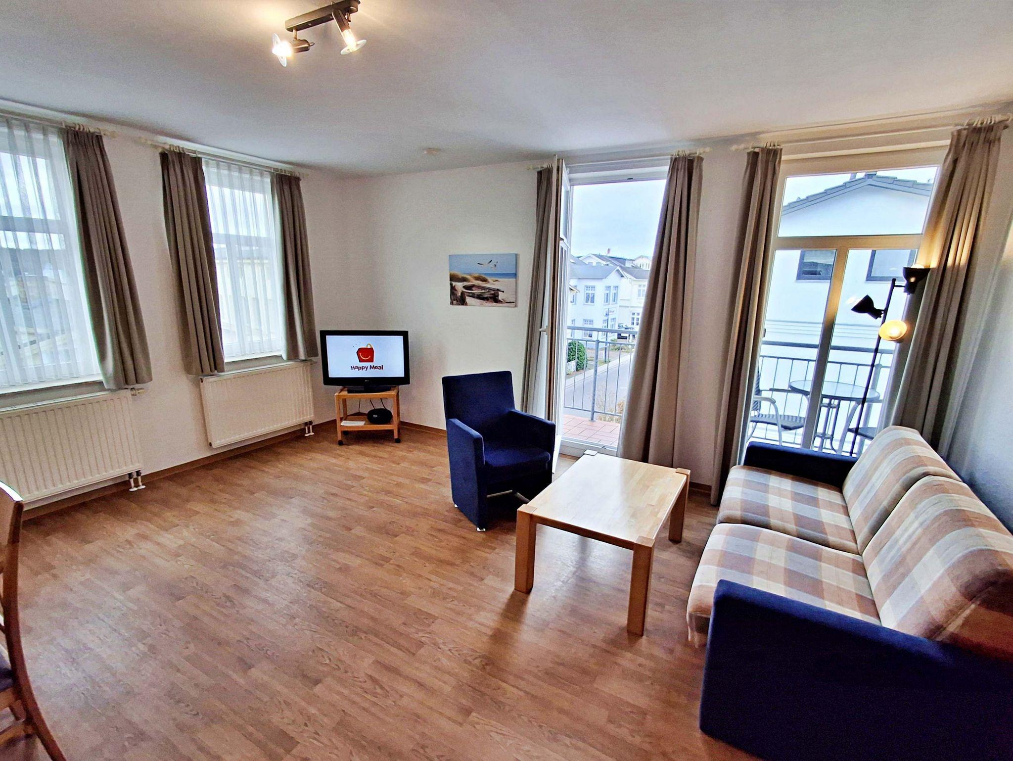 Die Wohnung befindet sich in der 2. Etage und überzeugt durch ihre Süd-West-Ausrichtung mit Balkon. Der Wohnbereich verfügt über eine gemütliche Couch mit Aufbettungsmöglichkeit für 2 Personen, einen Sessel sowie einen Esstisch mit 6 Stühlen. Vom Wohnraum aus gelangen Sie auf den Westbalkon ideal für sonnige Nachmittage und entspannte Abendstunden.